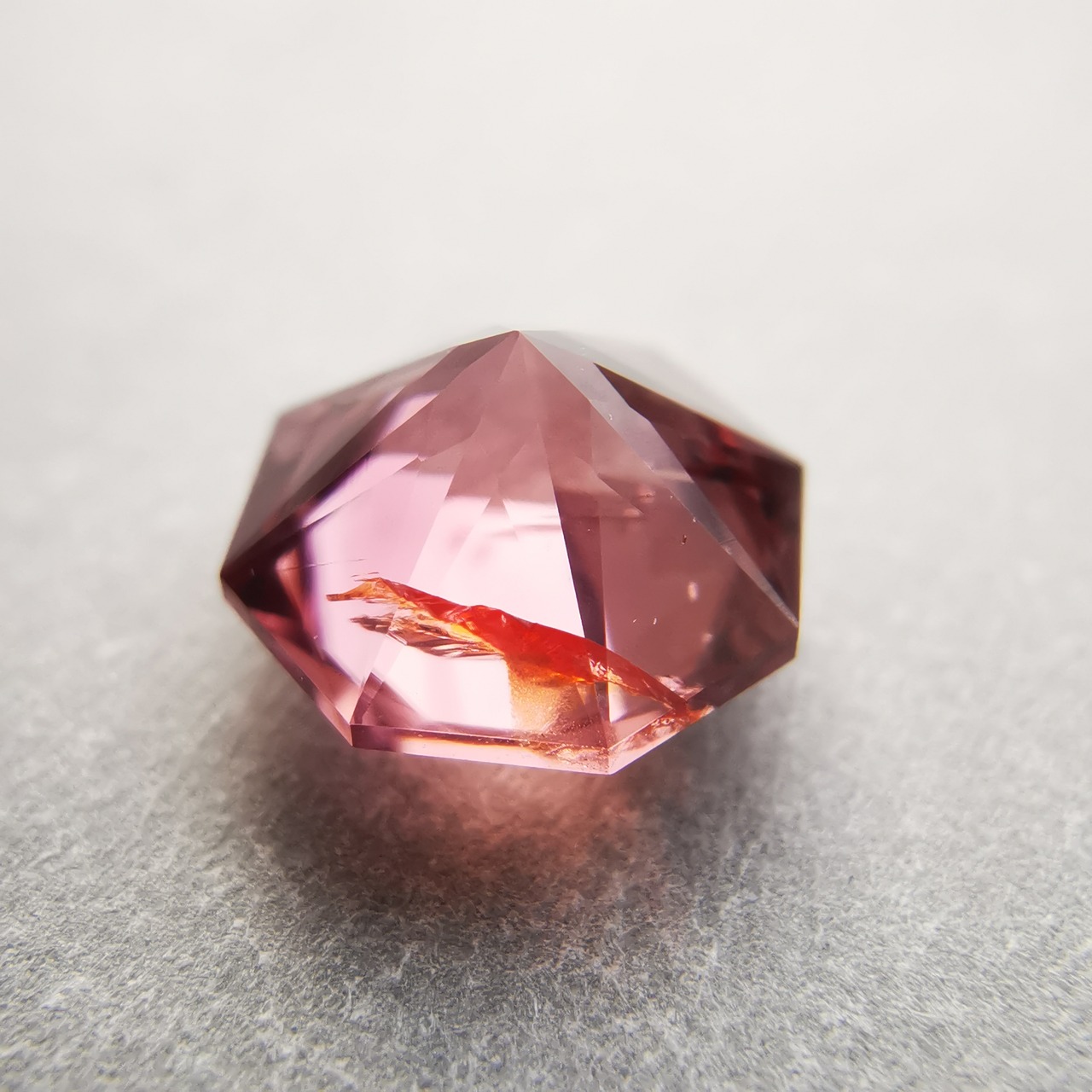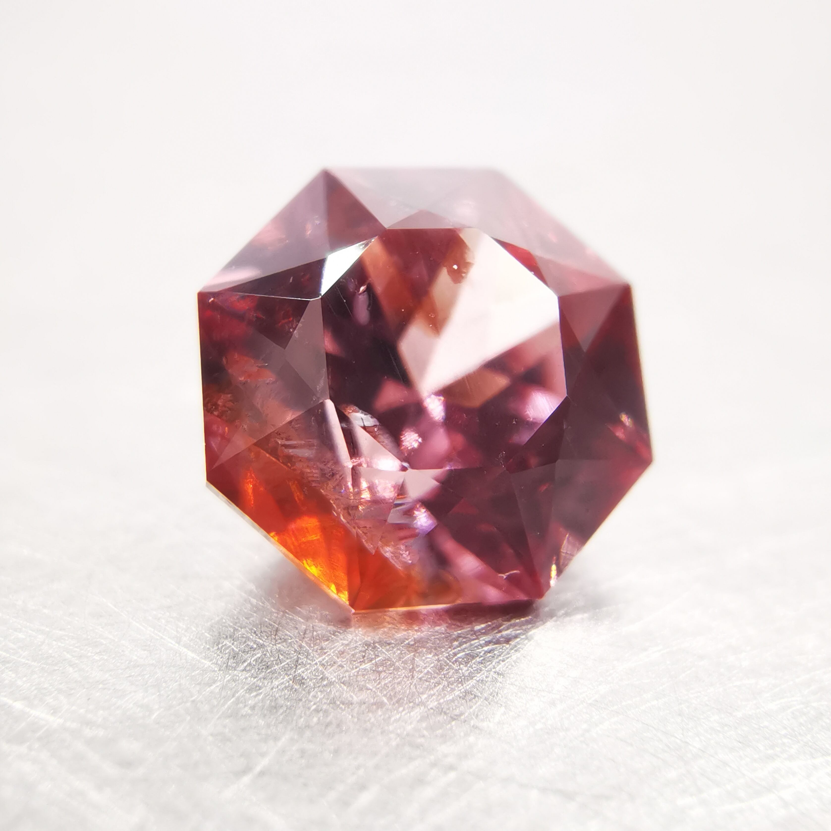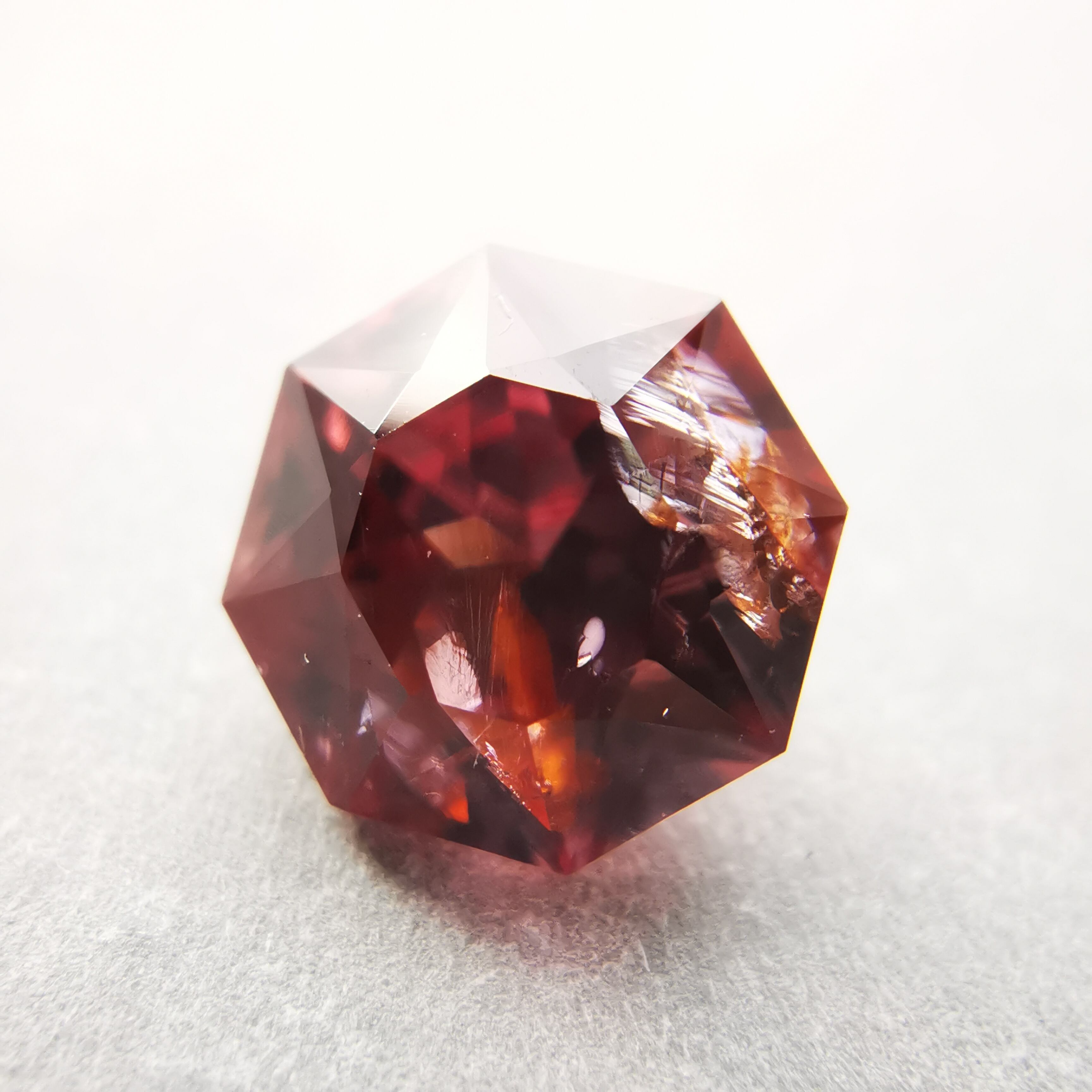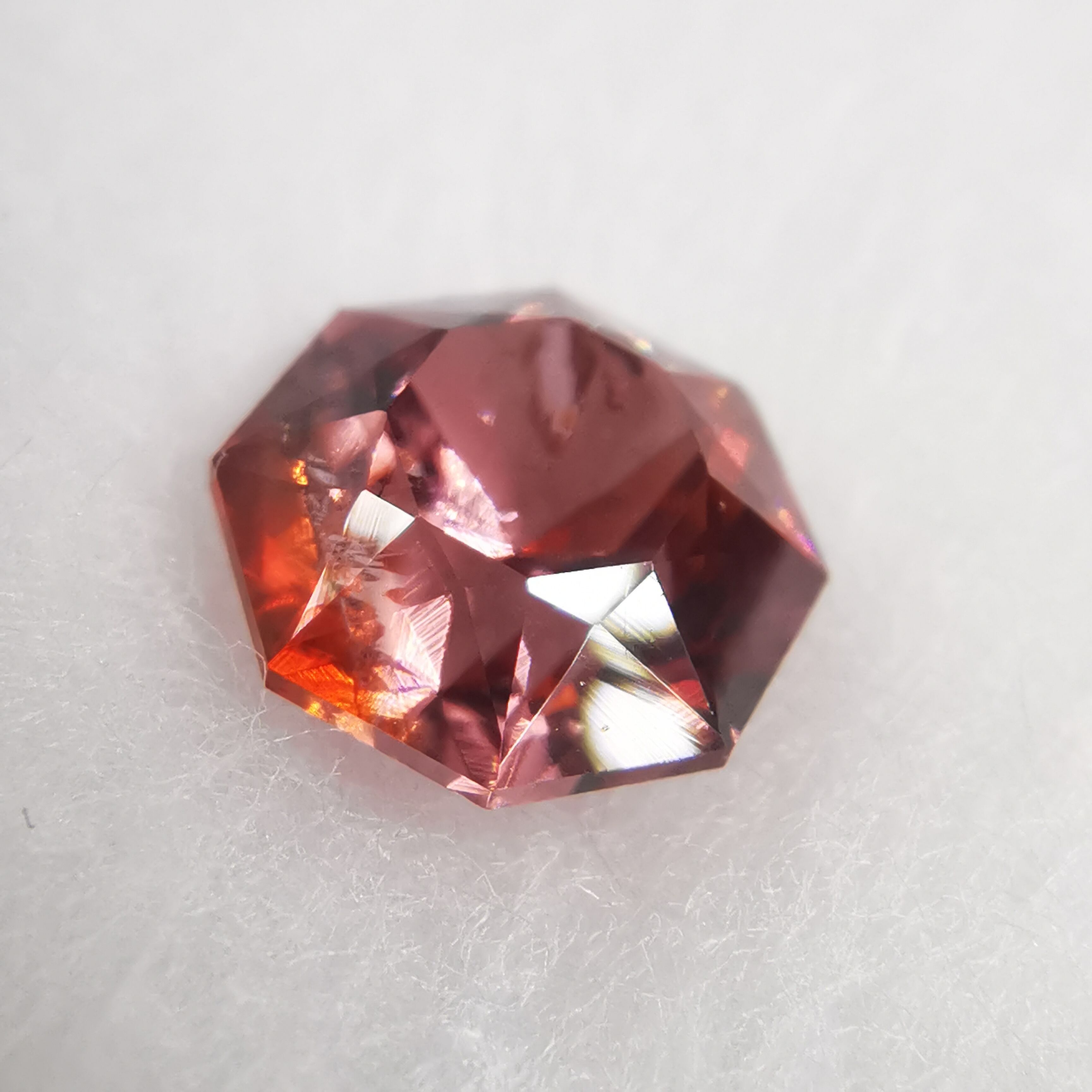 ピックレッドのジルコンの中から、オレンジ色のインクルージョンが鮮やかにきらめく印象的な一石です。