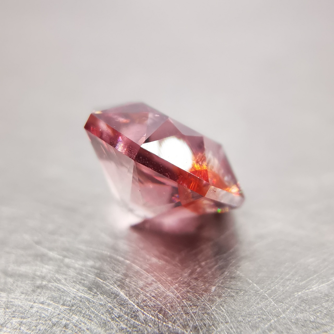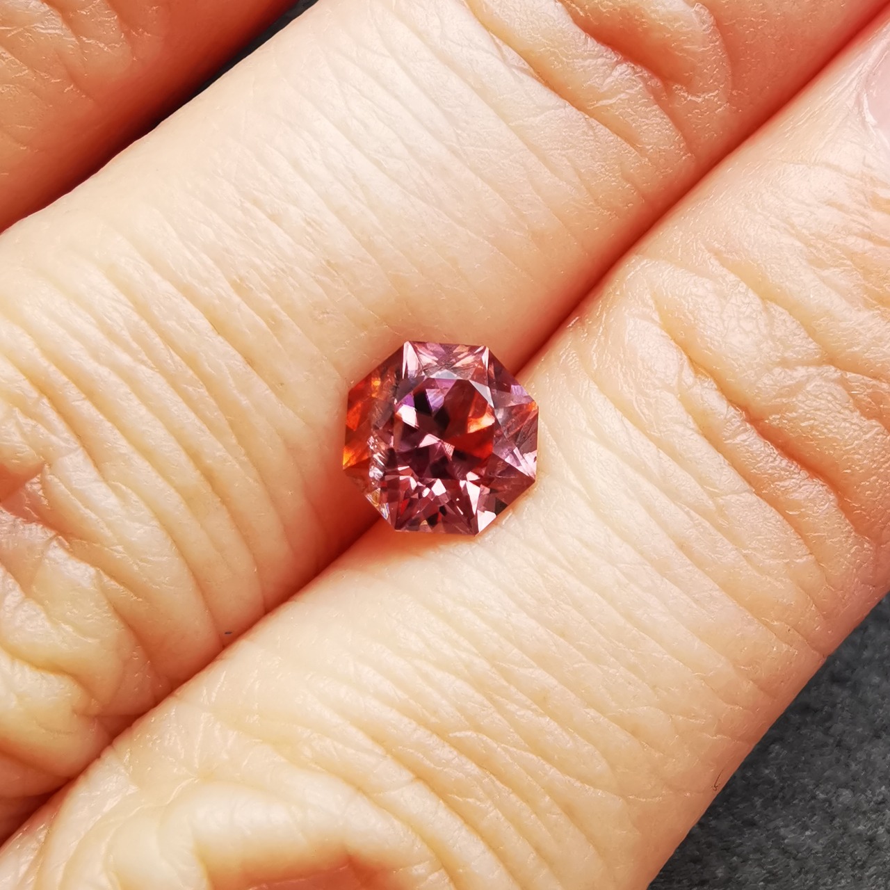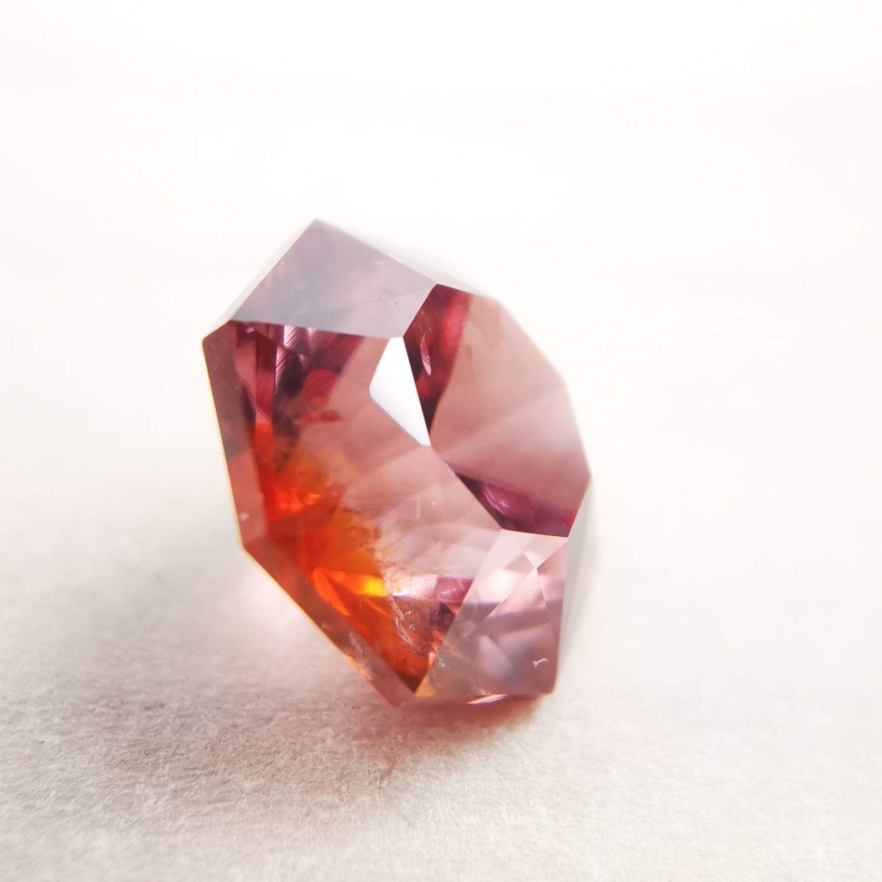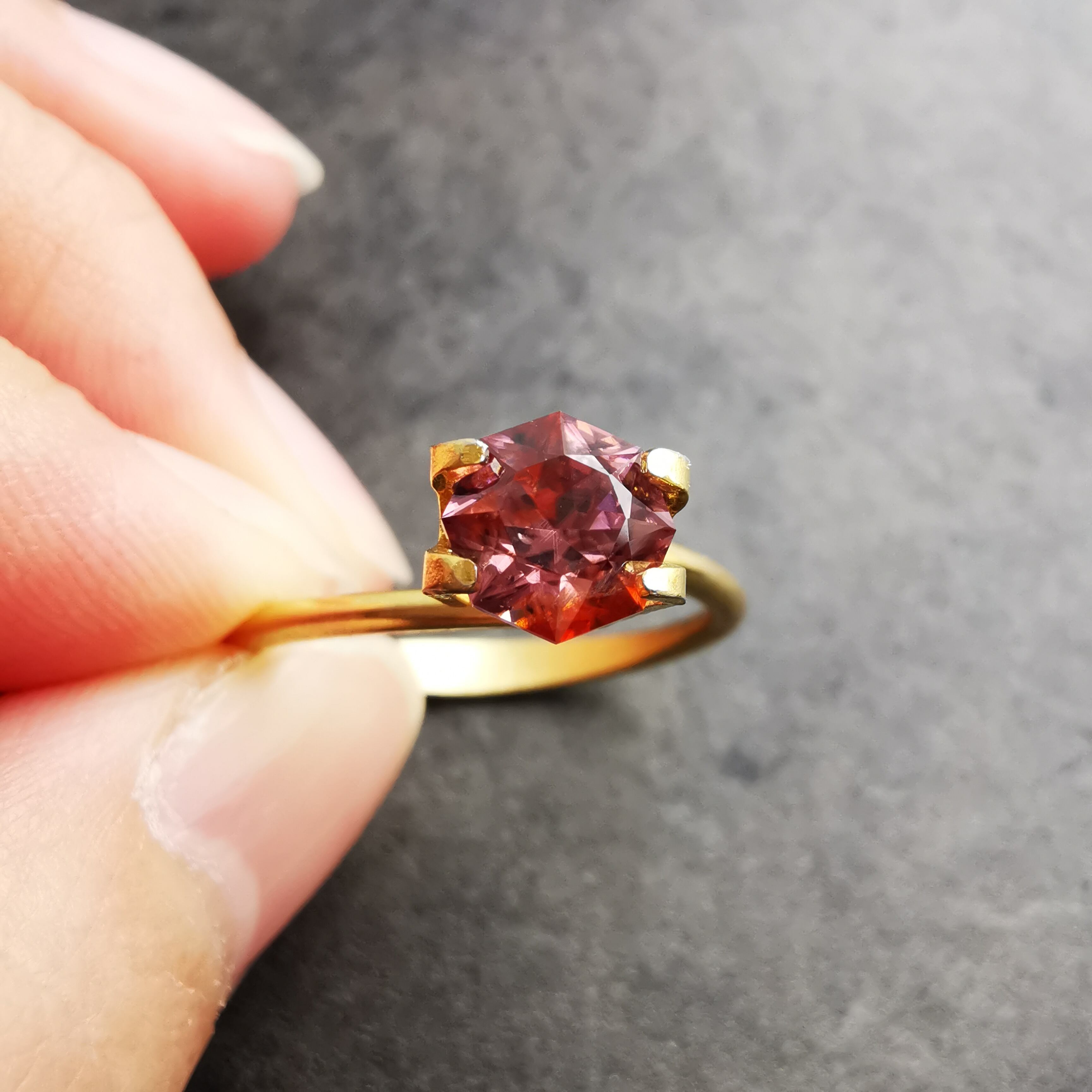 ピックレッドのジルコンの中から、オレンジ色のインクルージョンが鮮やかにきらめく印象的な一石です。