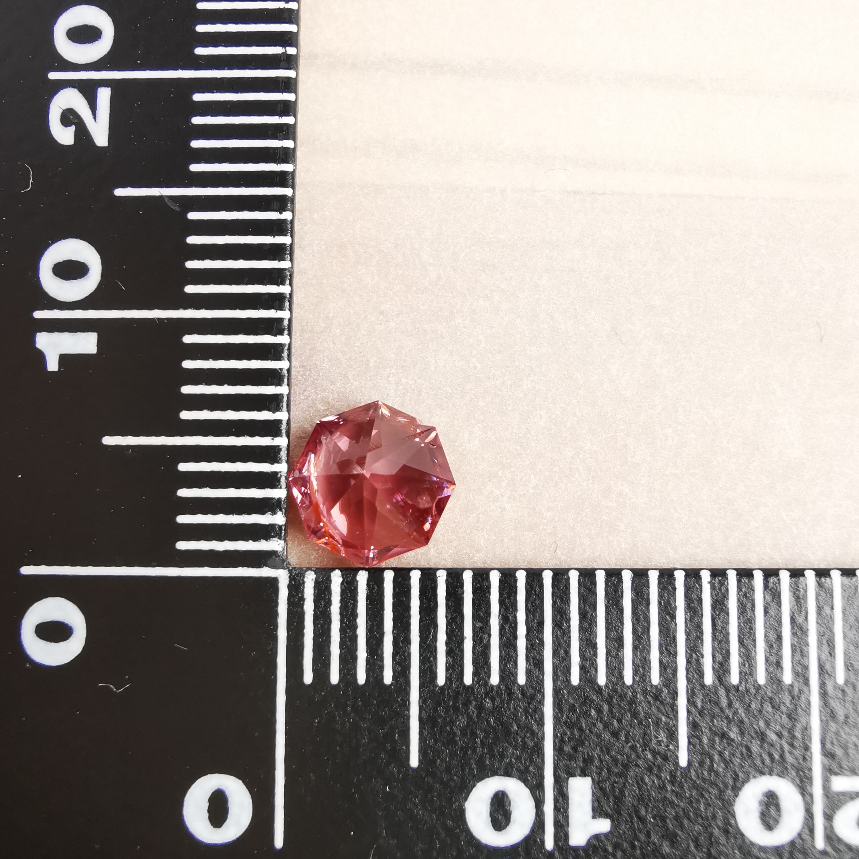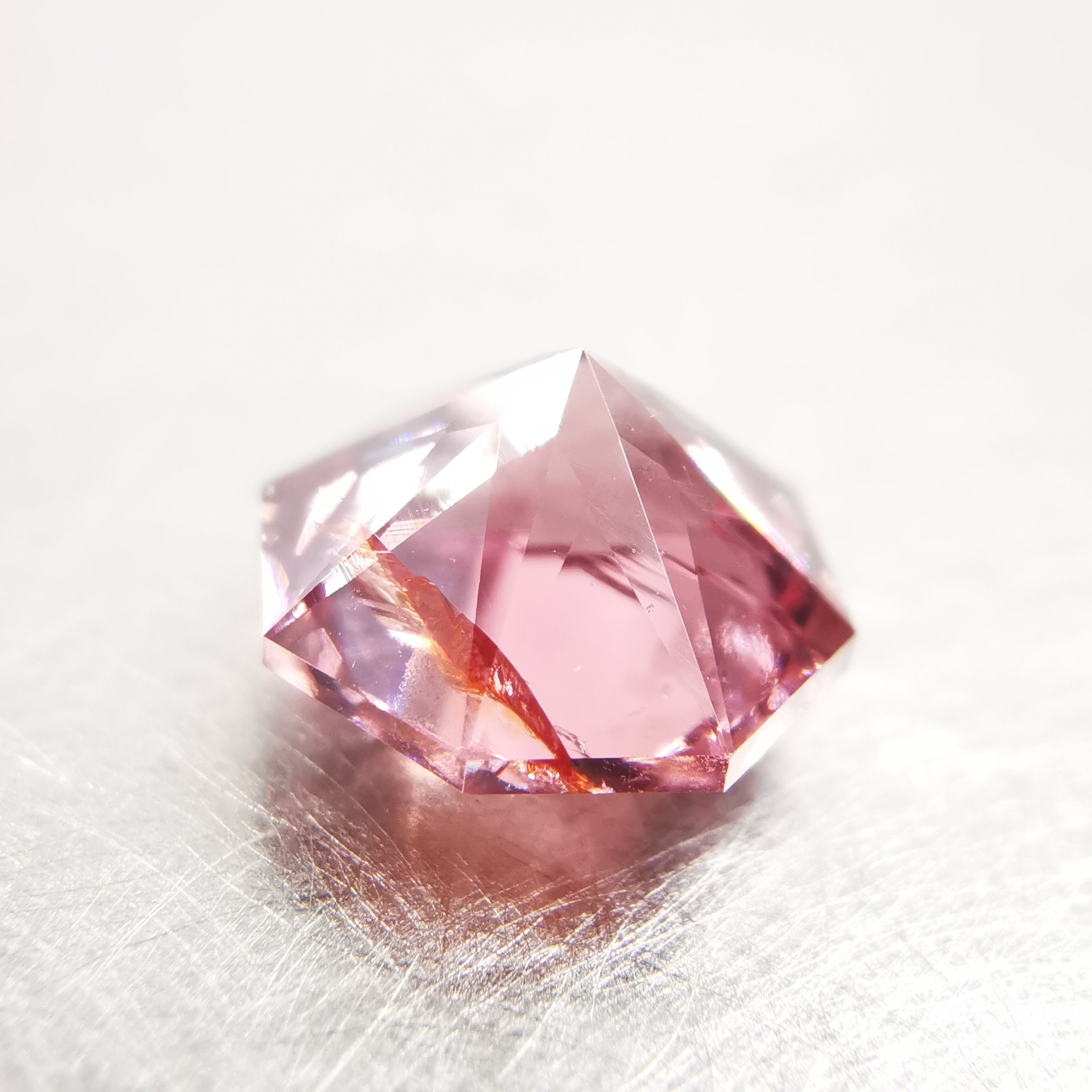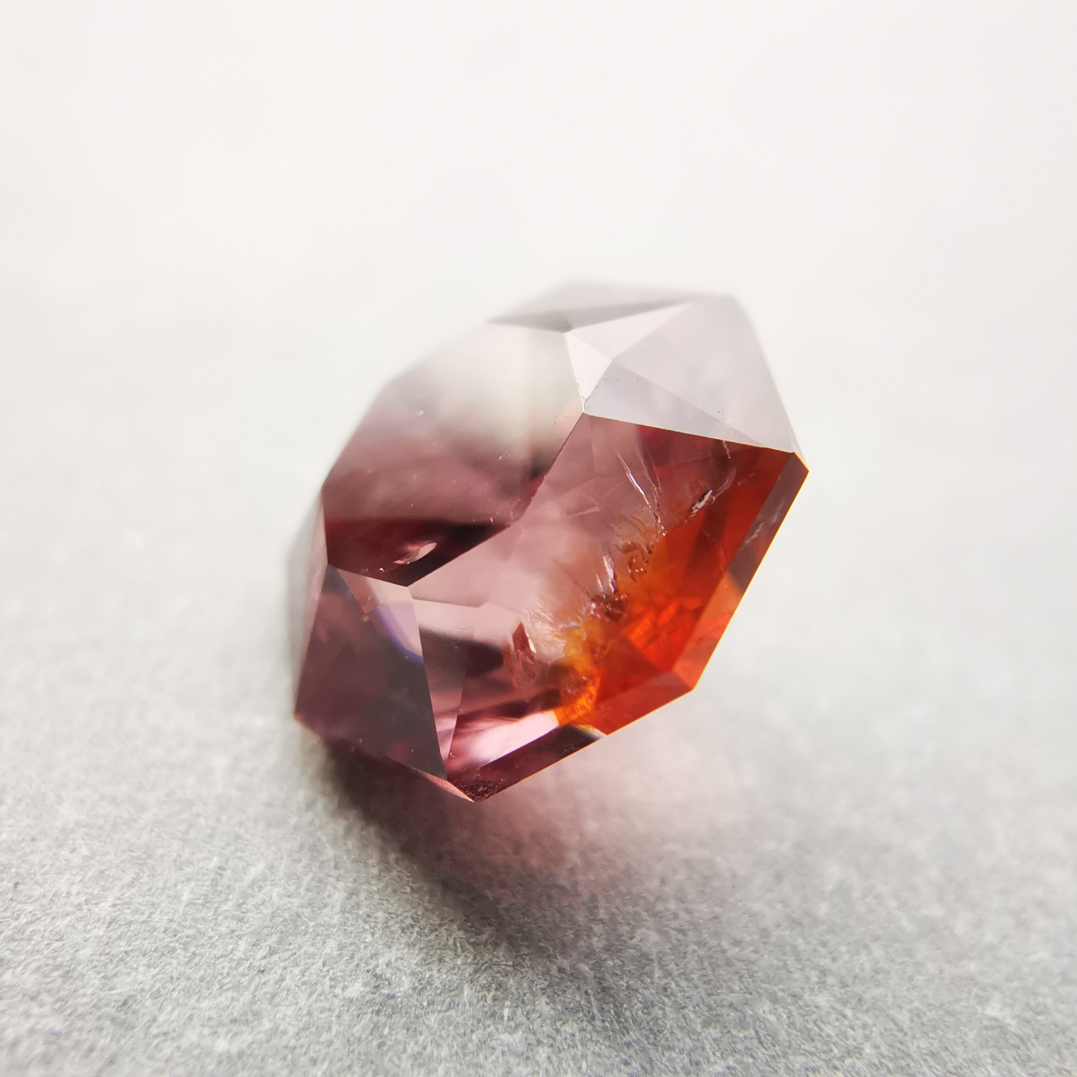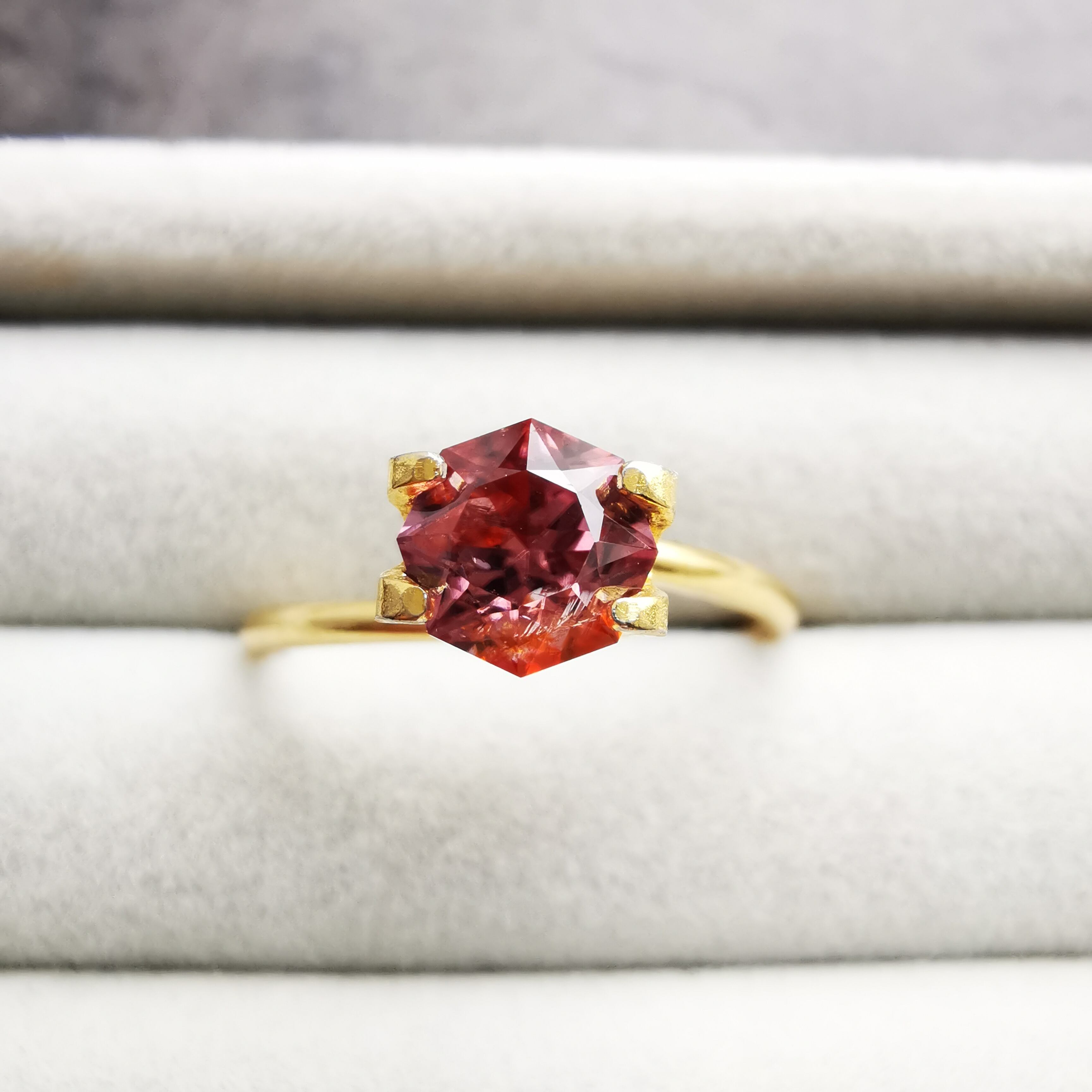 ピックレッドのジルコンの中から、オレンジ色のインクルージョンが鮮やかにきらめく印象的な一石です。
