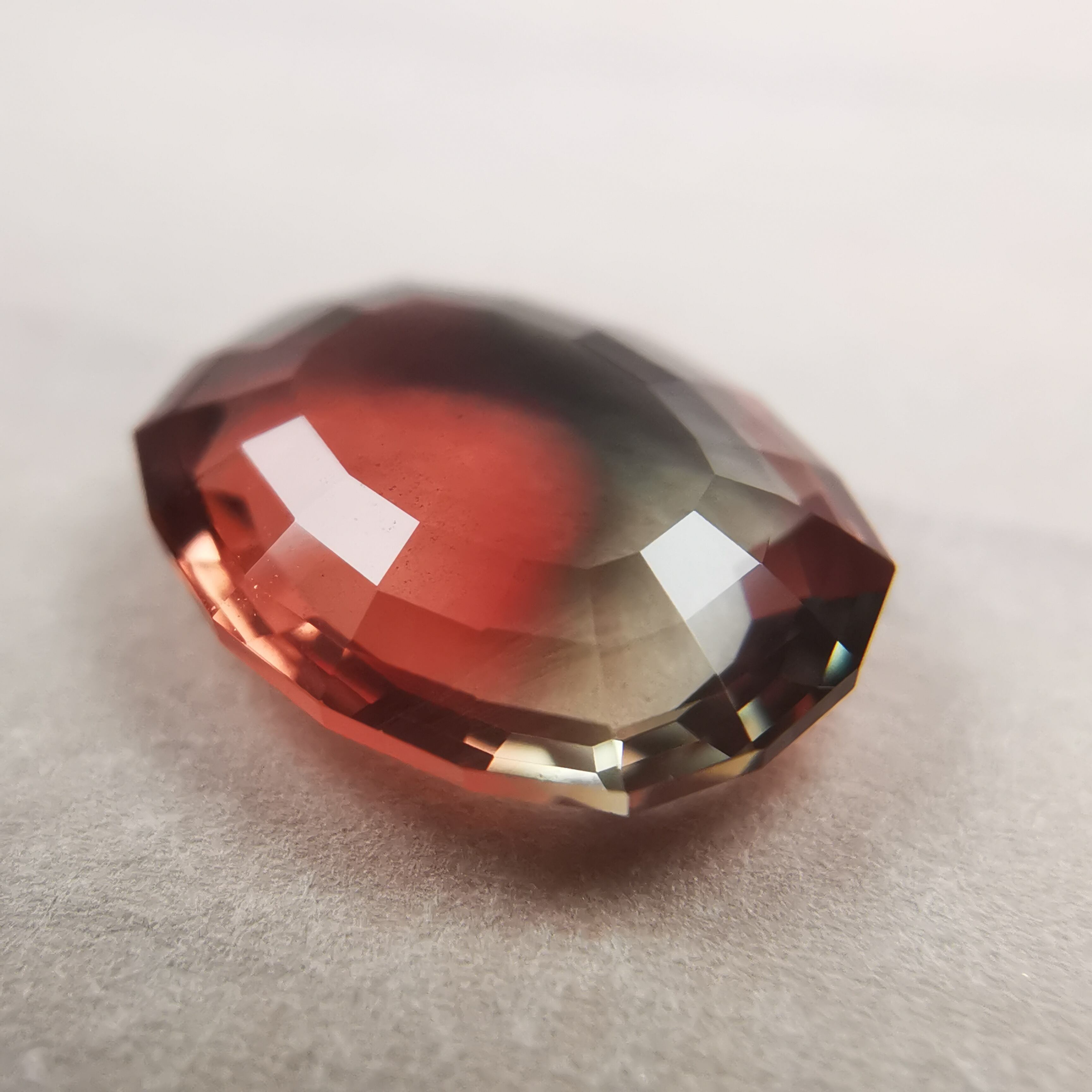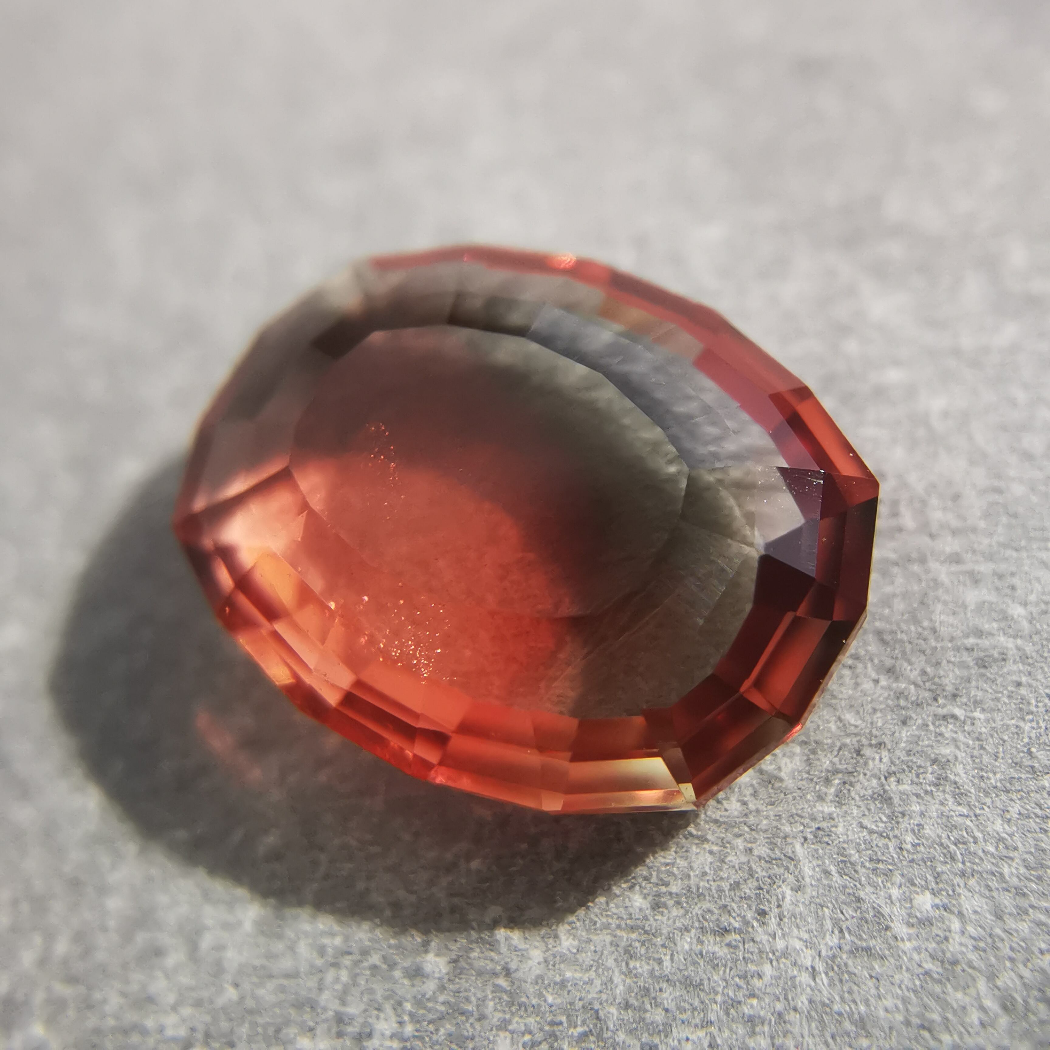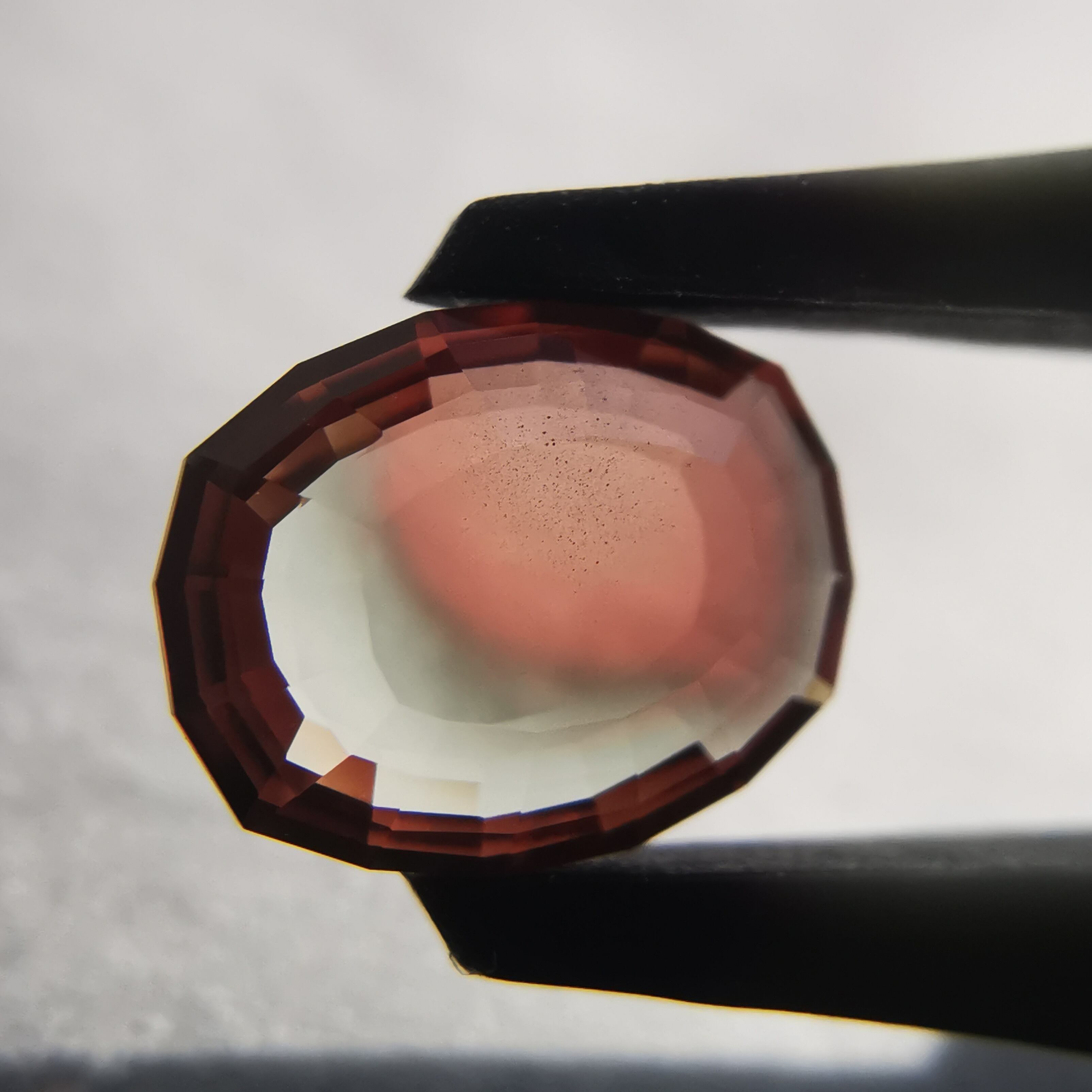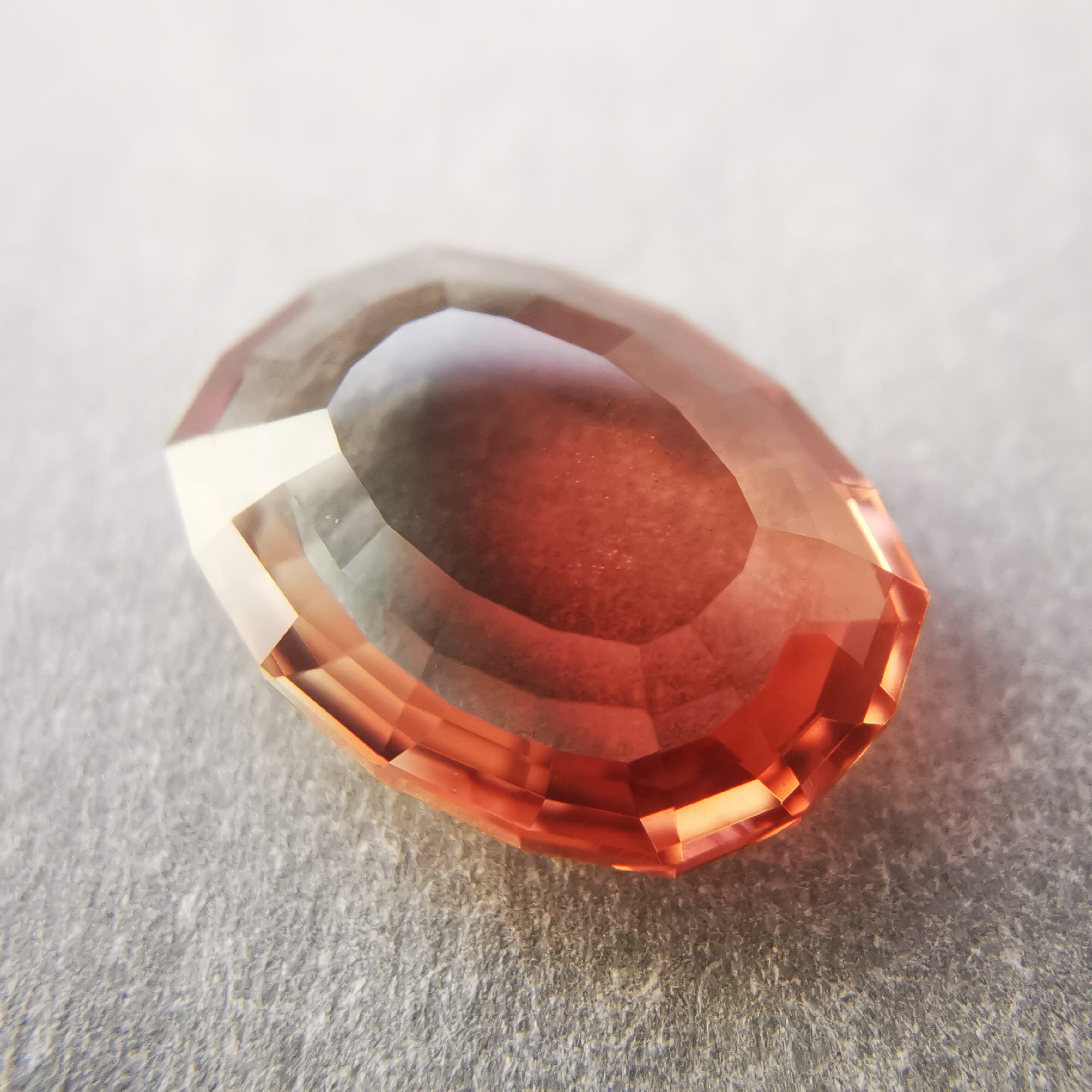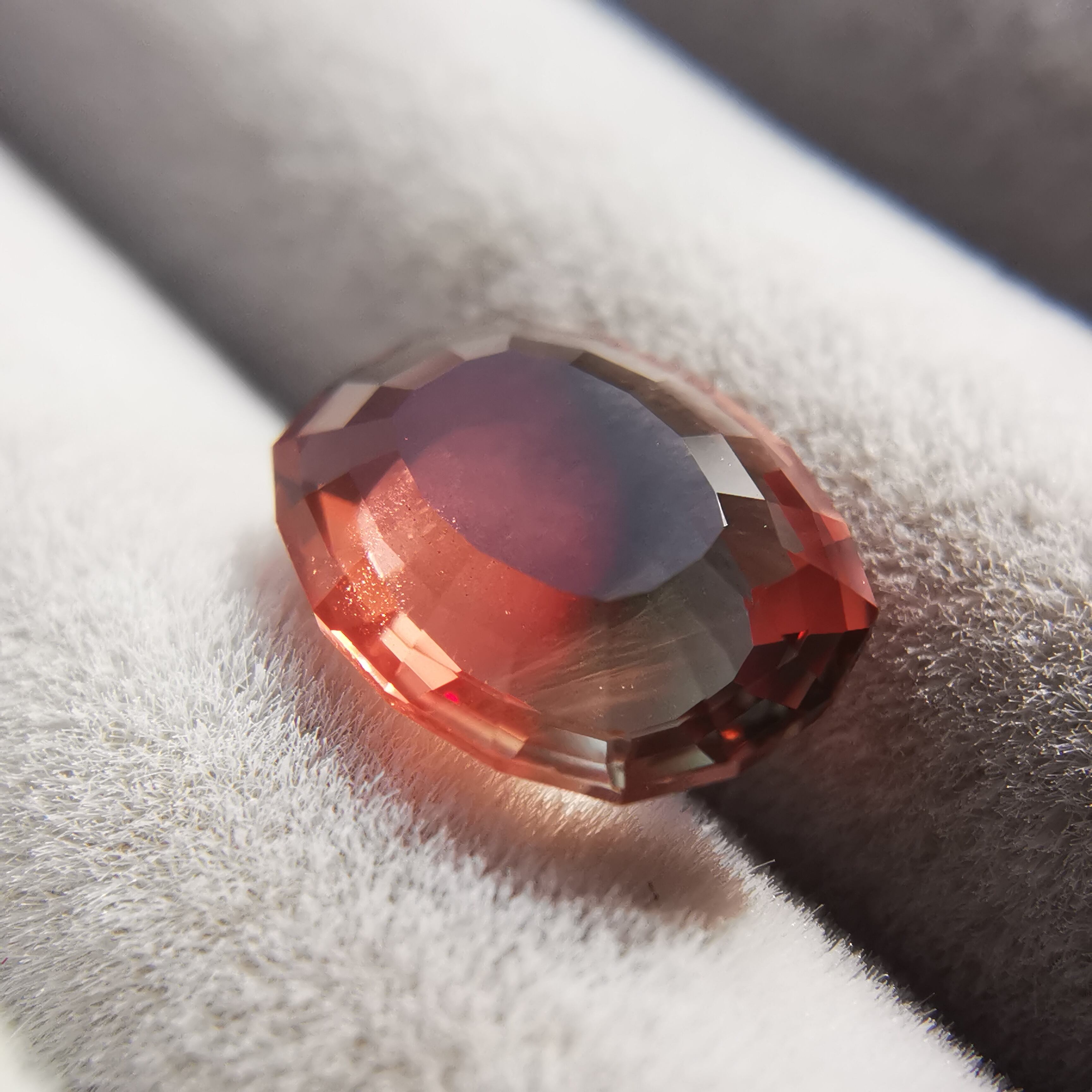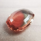 クリアな石の半分に浸み込むように広がったコパーレッド、傾けると、コパーレッドの淵の部分はわずかにピーコックグリーンに色付きます。