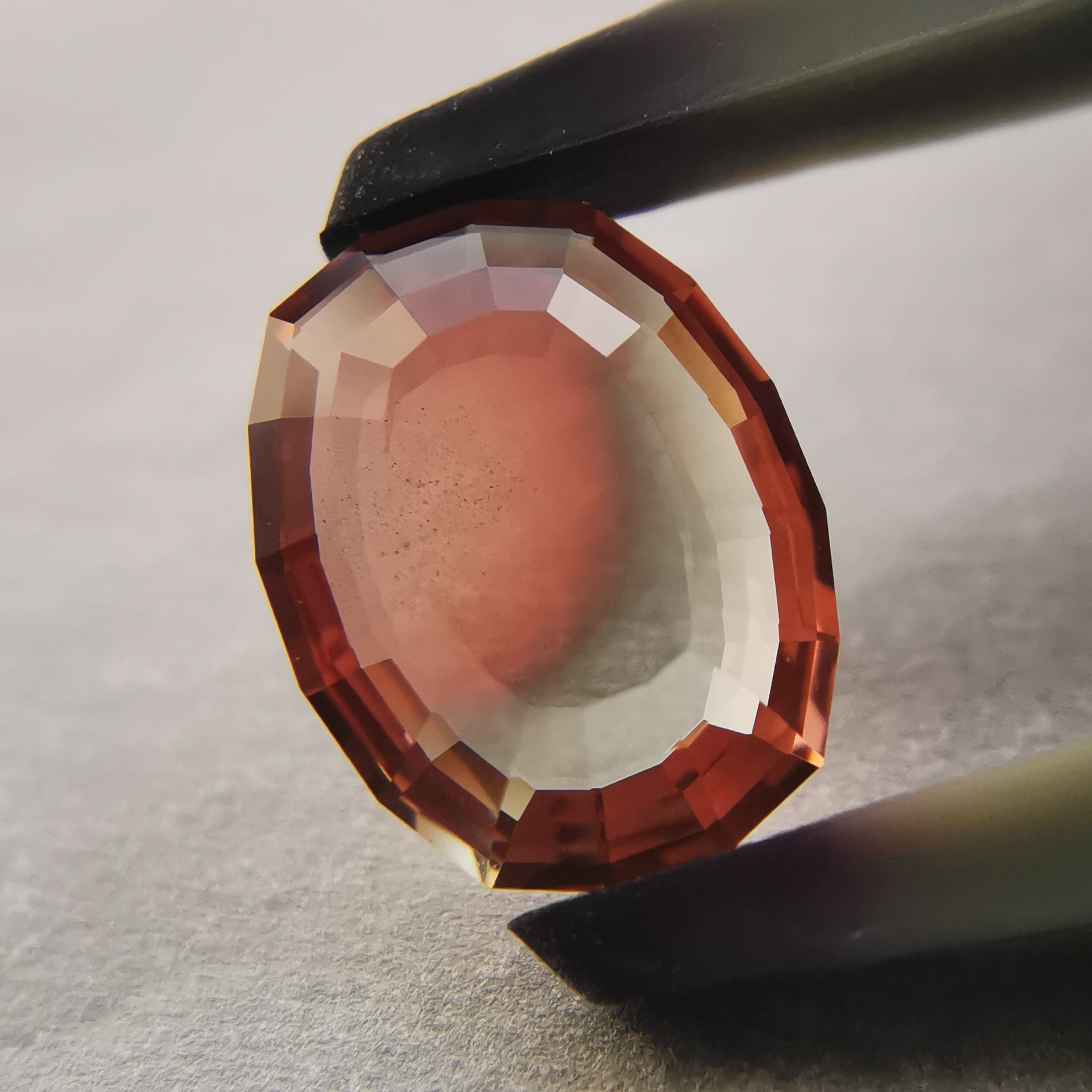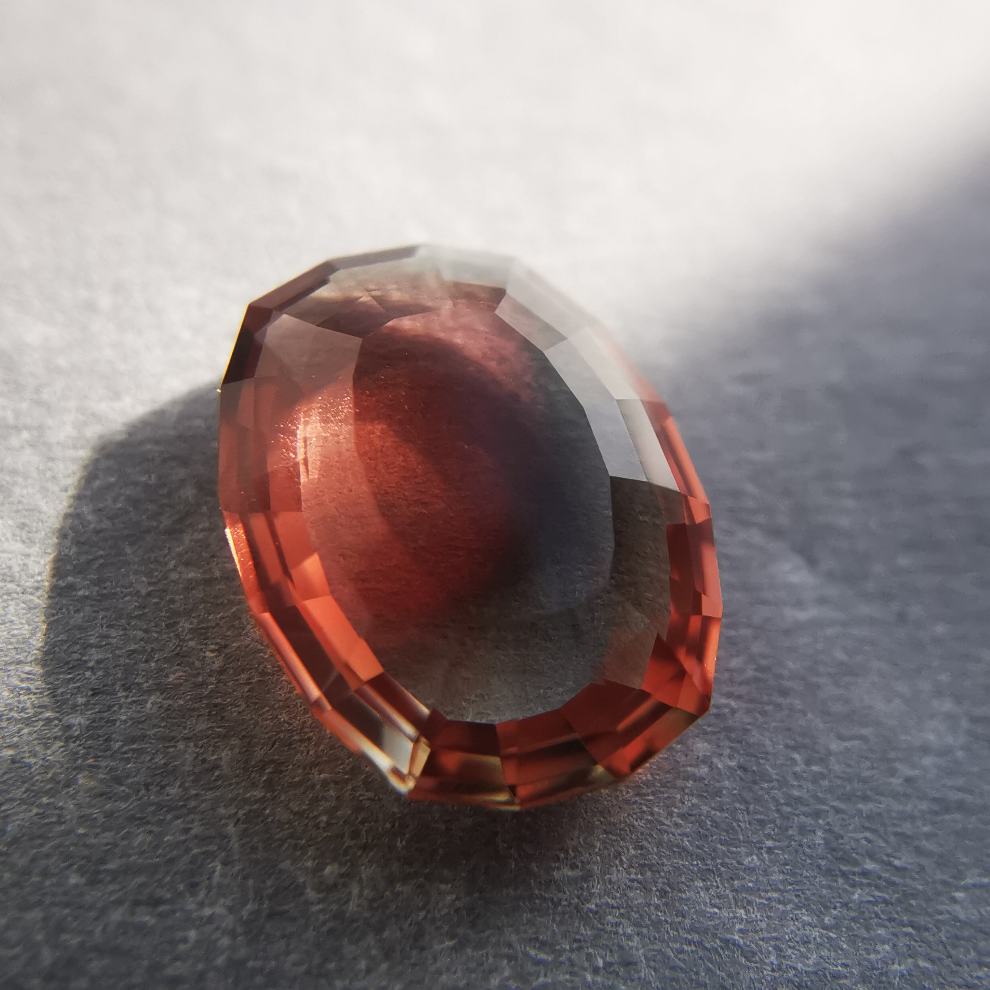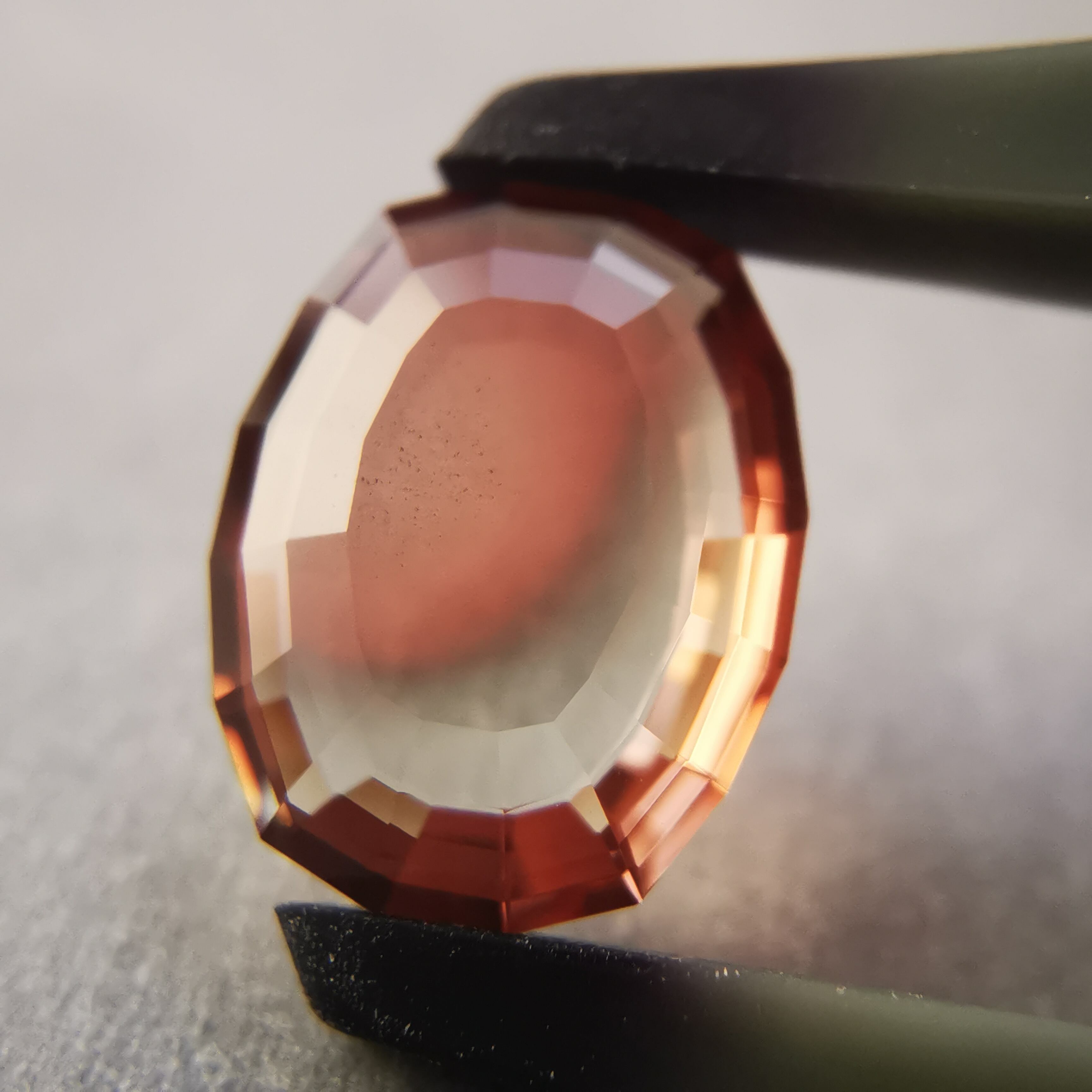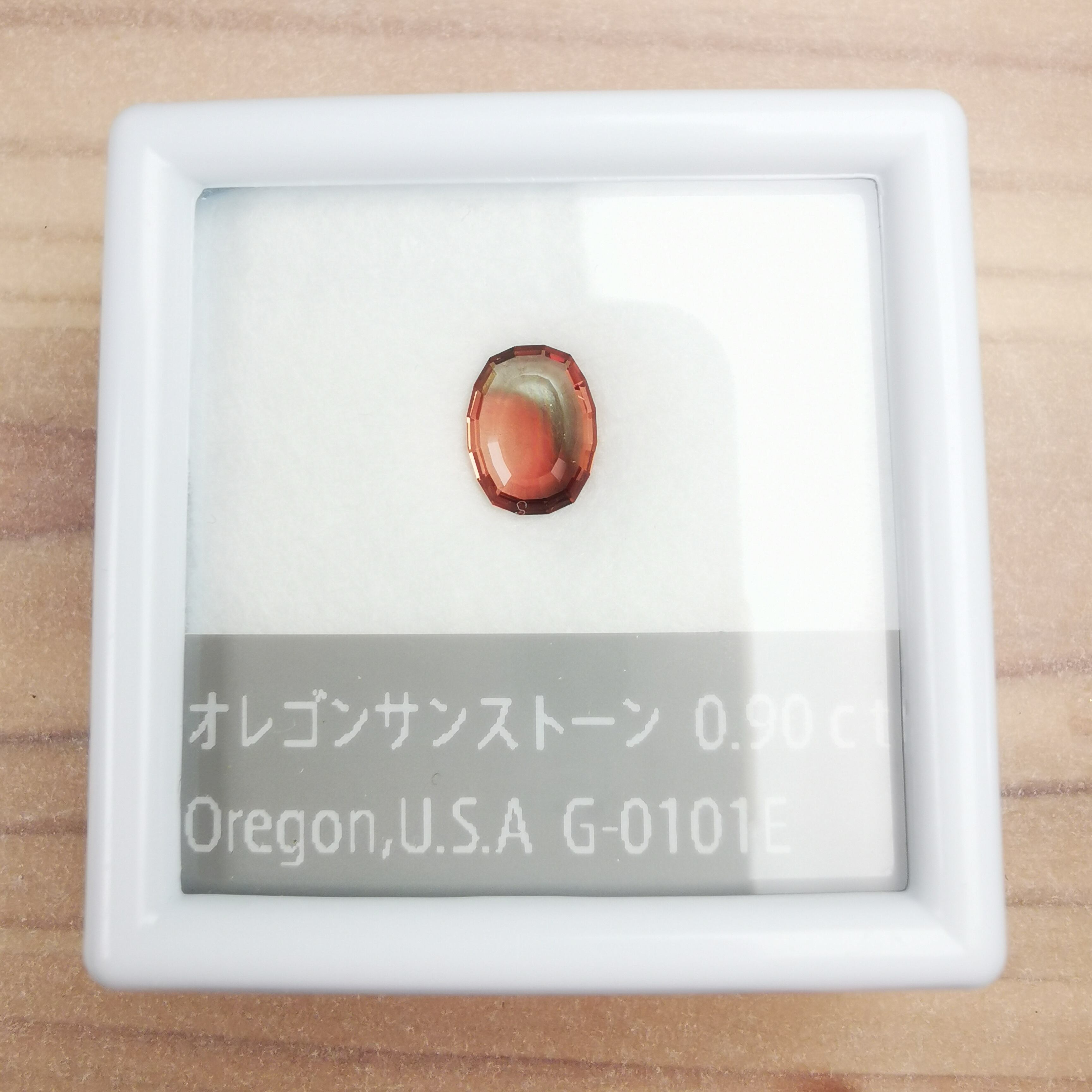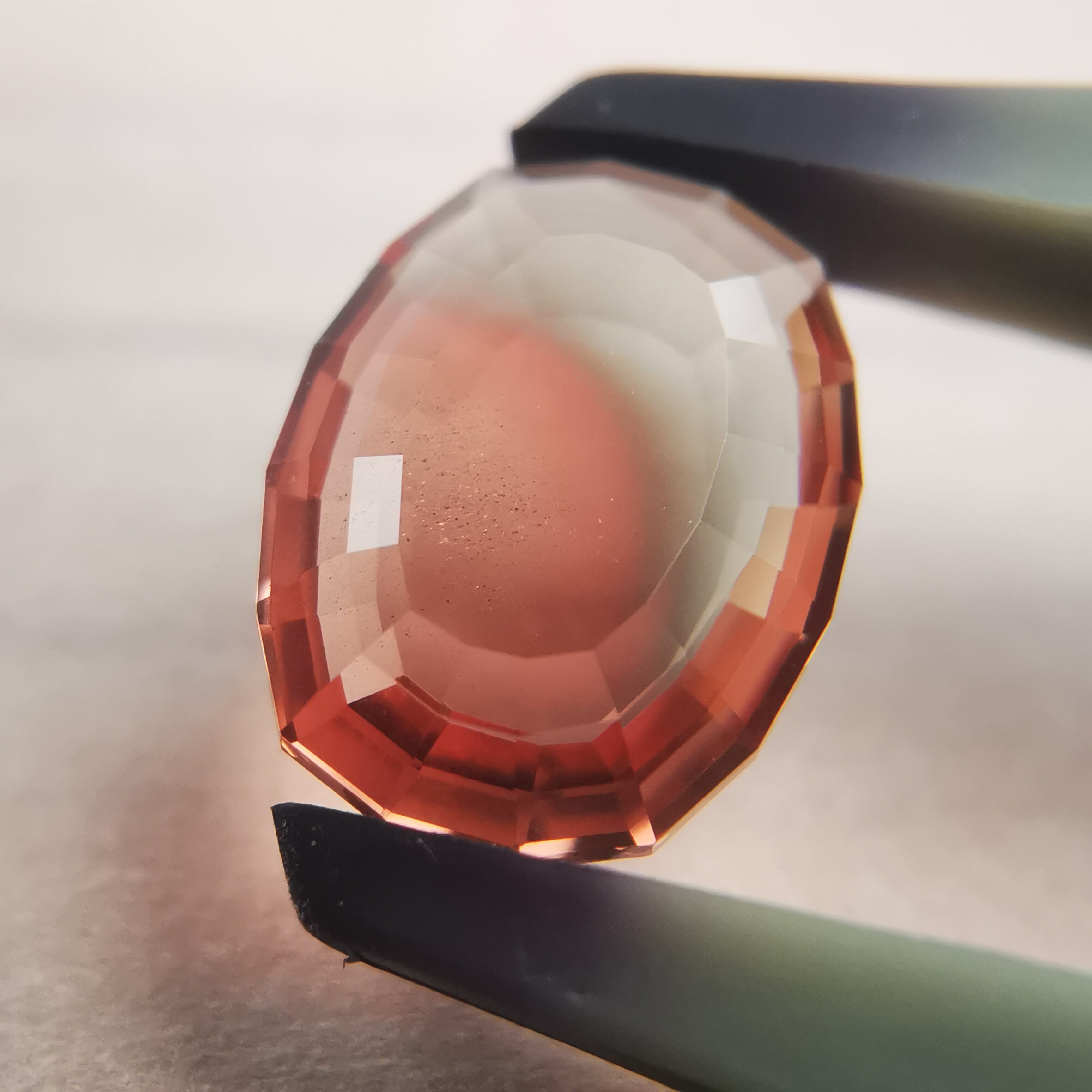 クリアな石の半分に浸み込むように広がったコパーレッド、傾けると、コパーレッドの淵の部分はわずかにピーコックグリーンに色付きます。