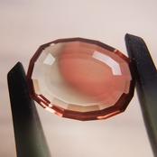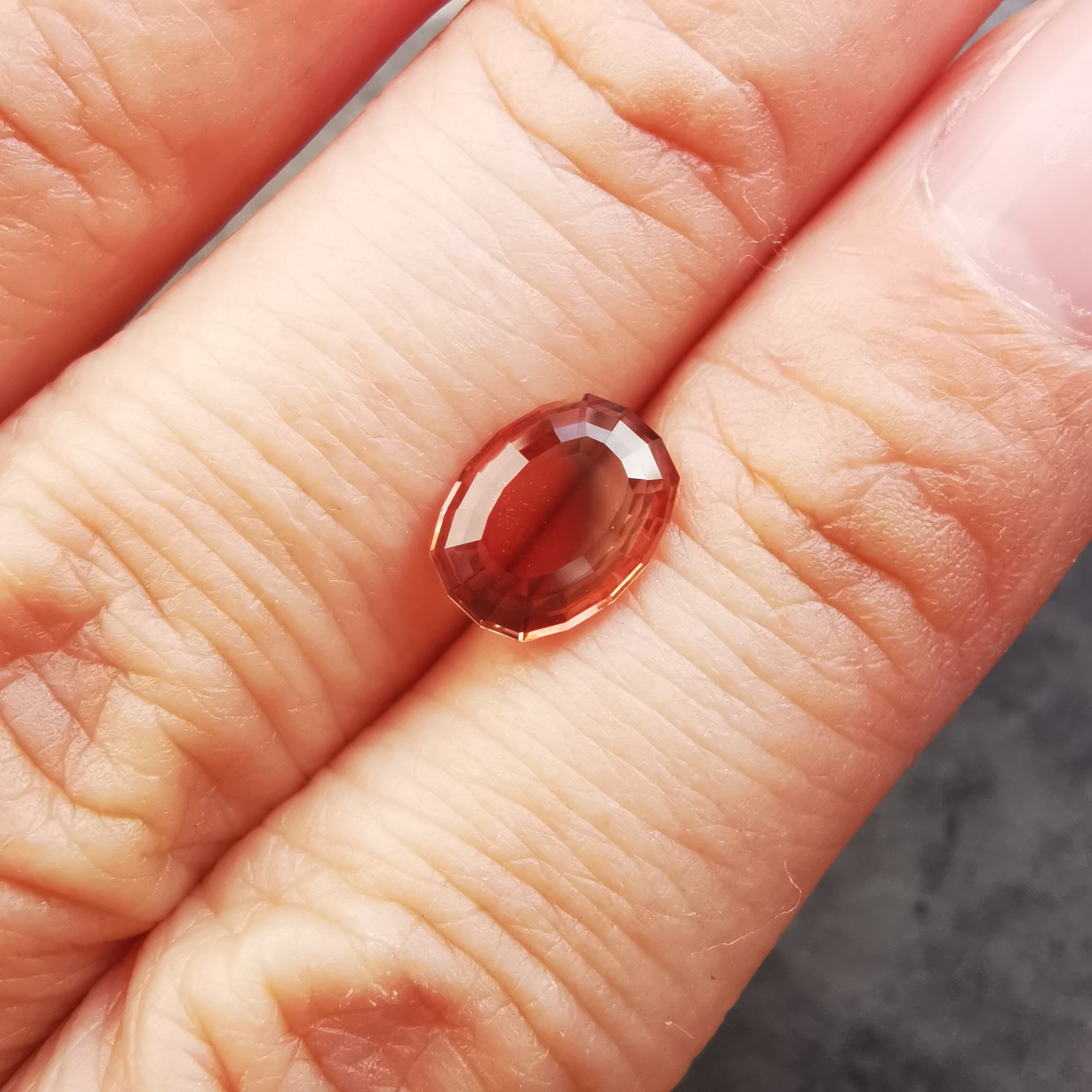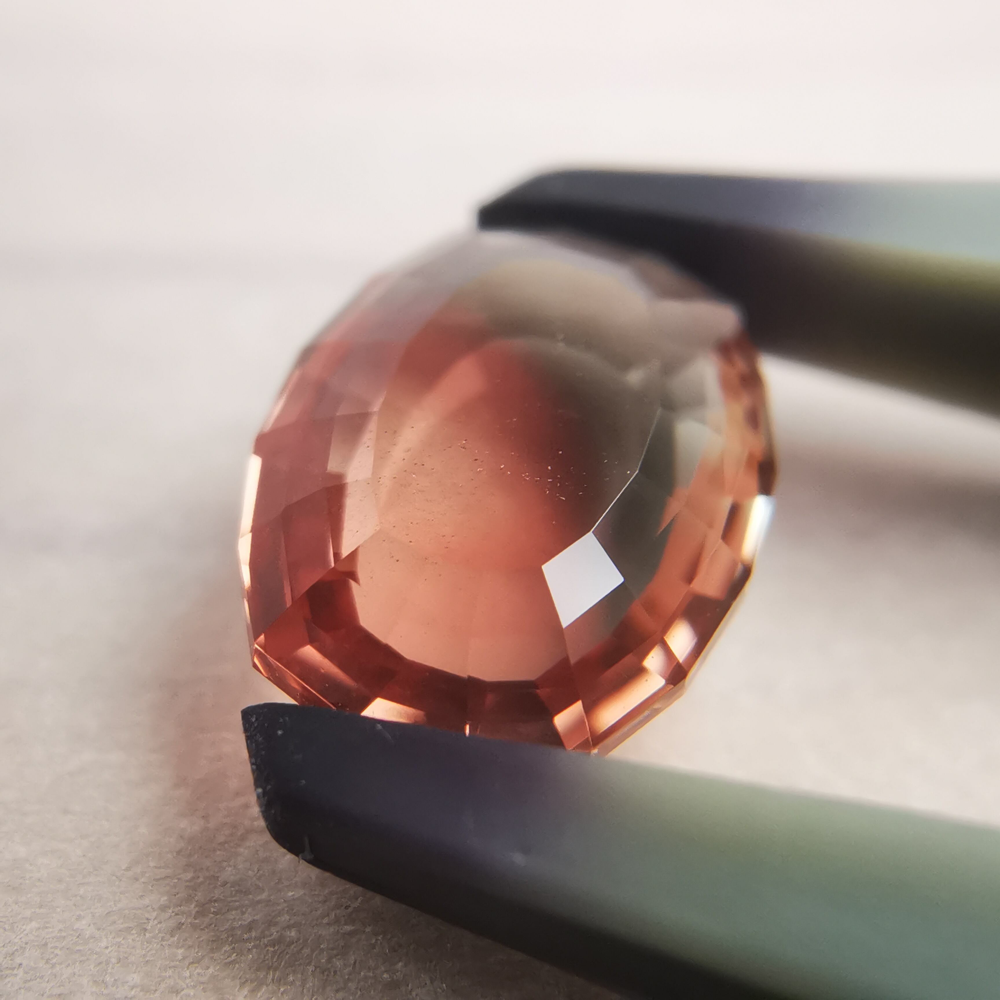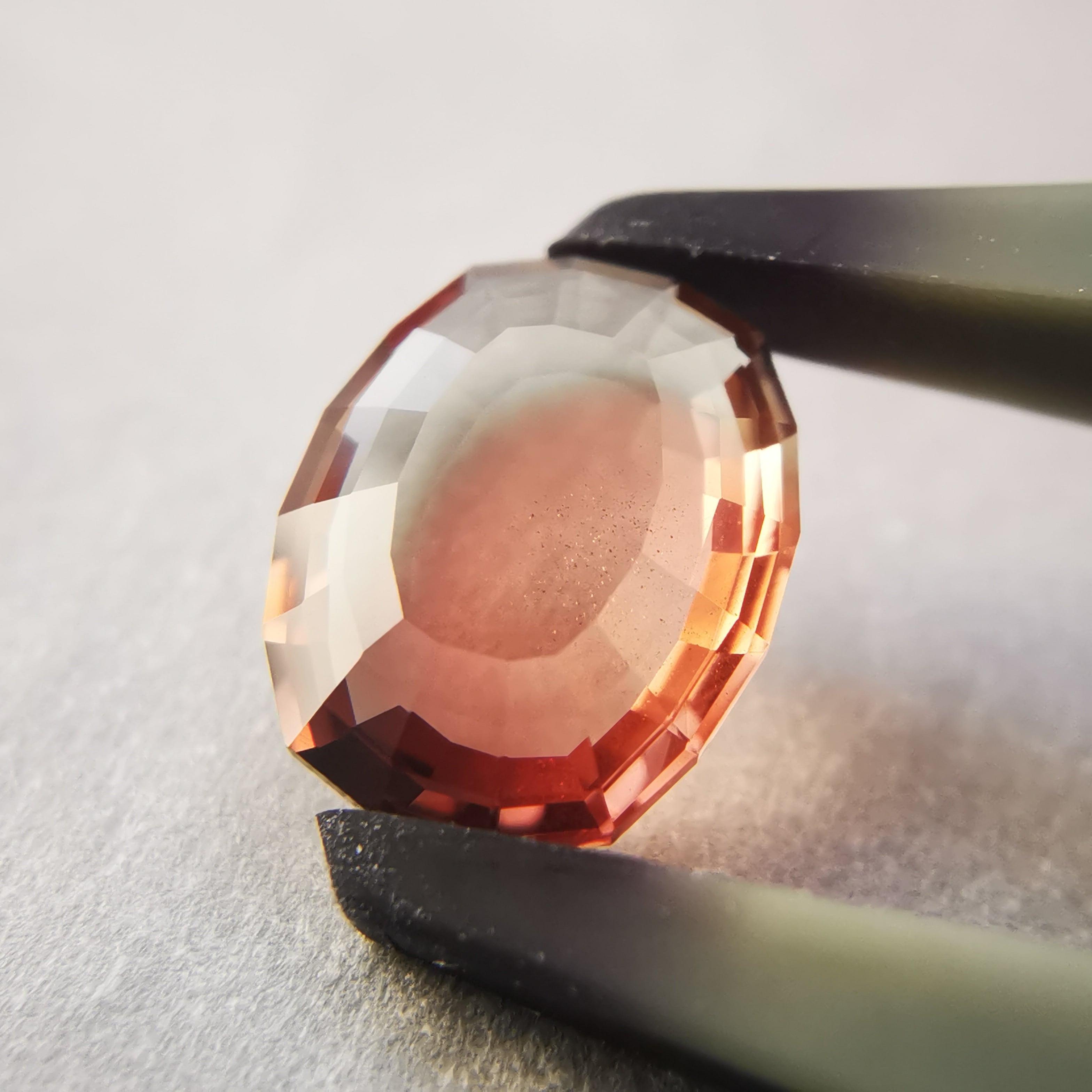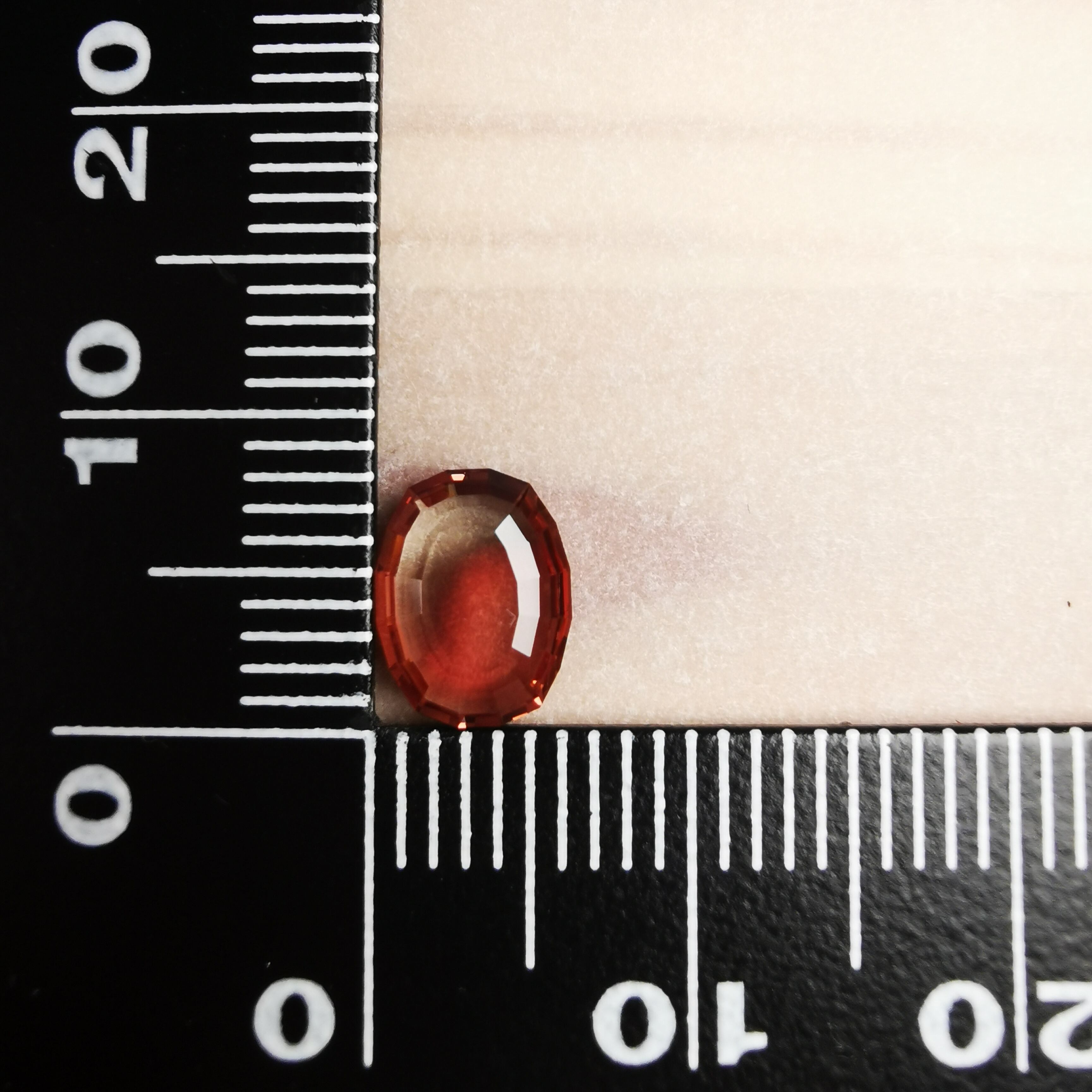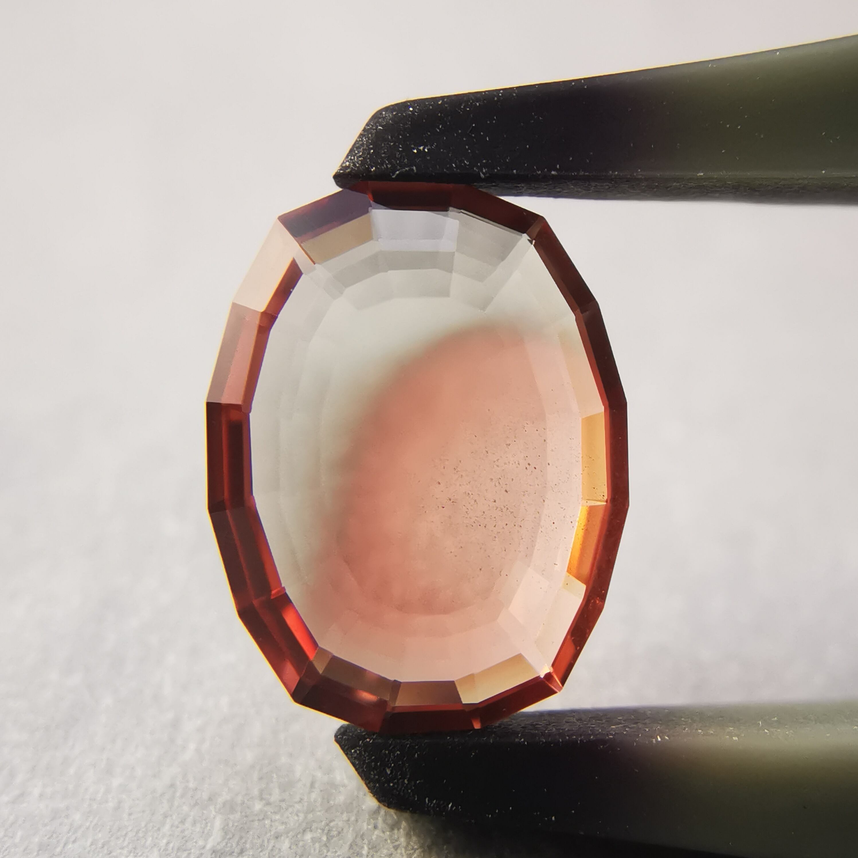 クリアな石の半分に浸み込むように広がったコパーレッド、傾けると、コパーレッドの淵の部分はわずかにピーコックグリーンに色付きます。