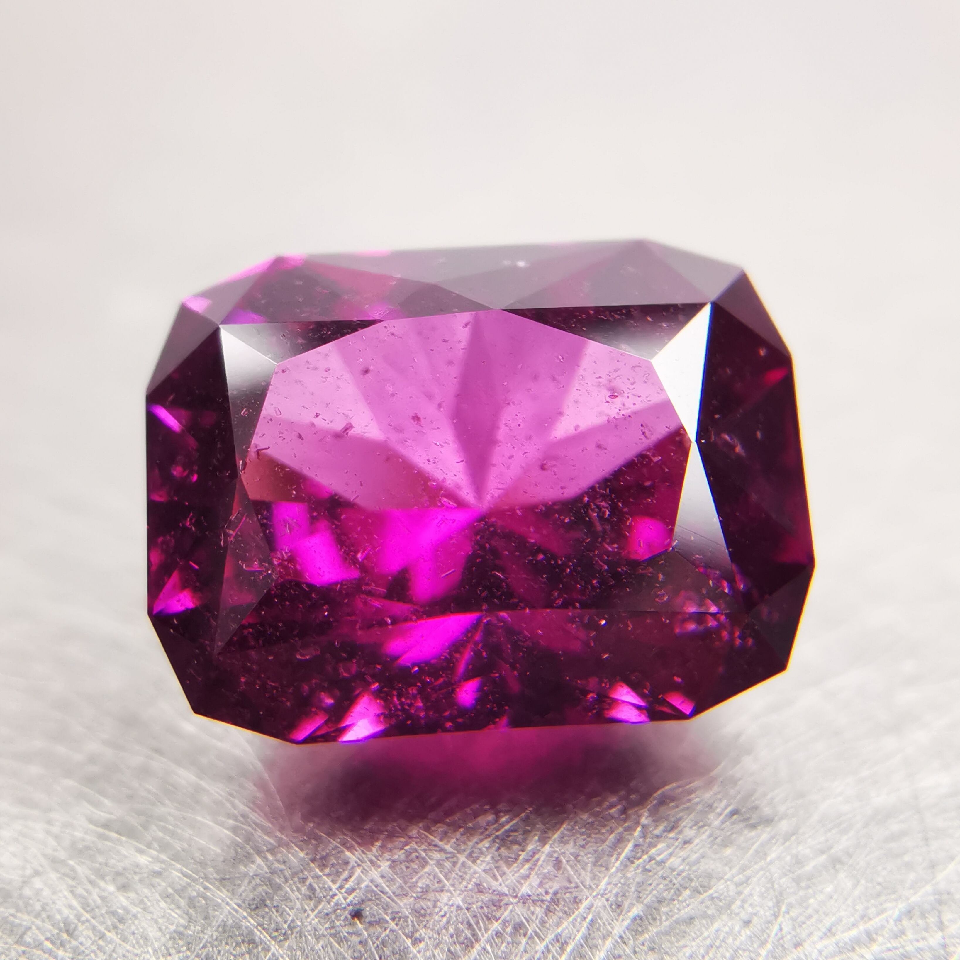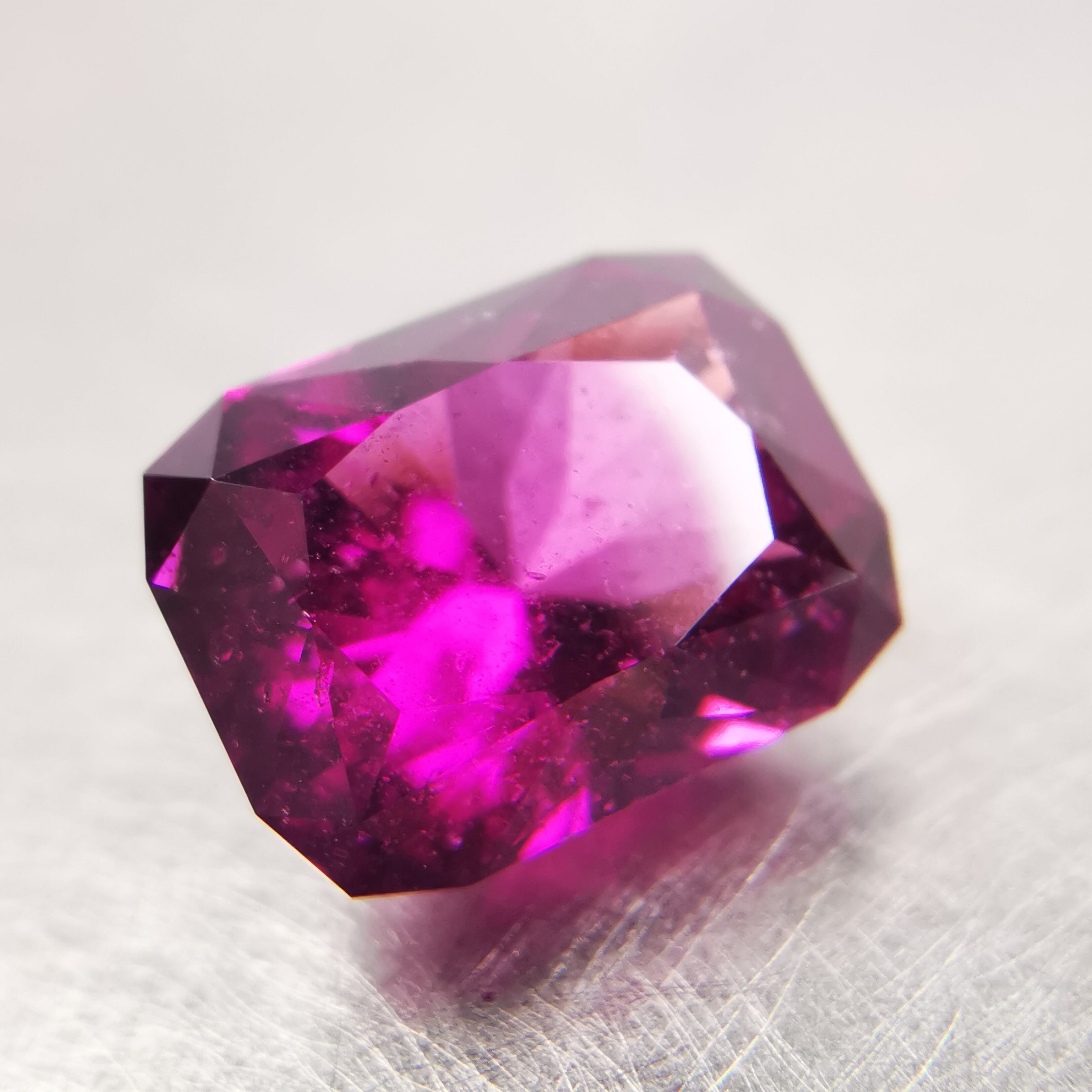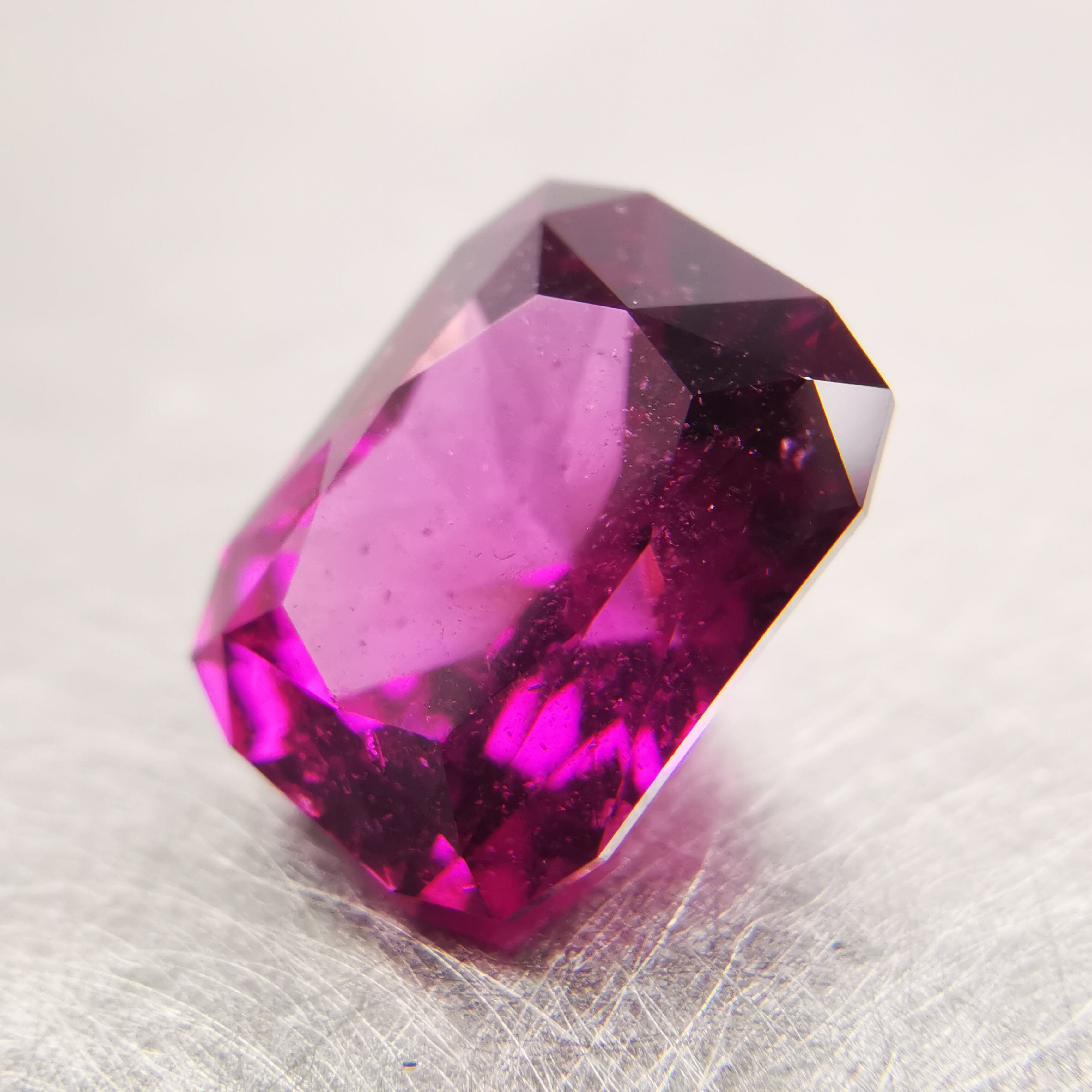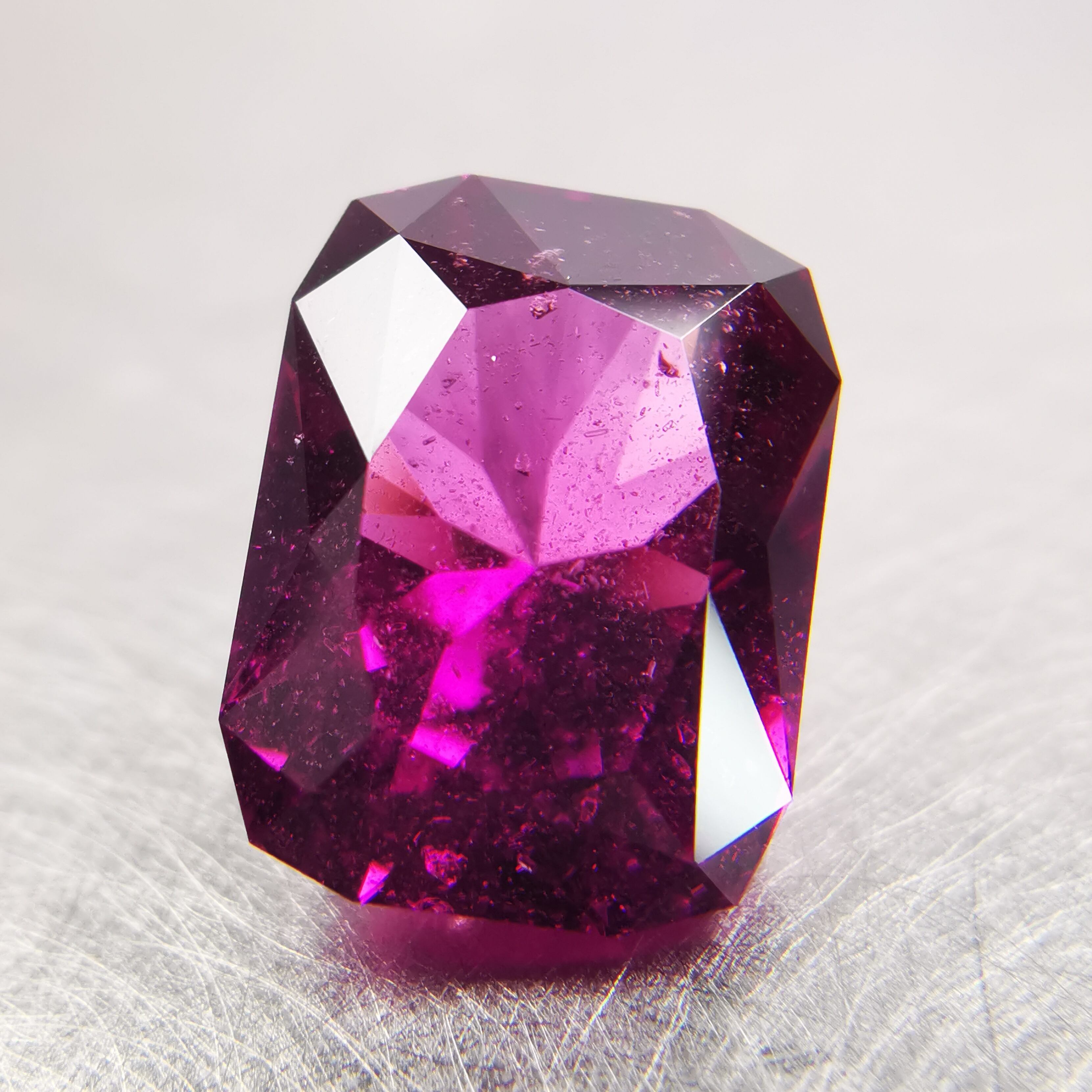 落ち着いたバーガンディー色の中から、鮮やかなピンクパープルが輝くガーネットです。