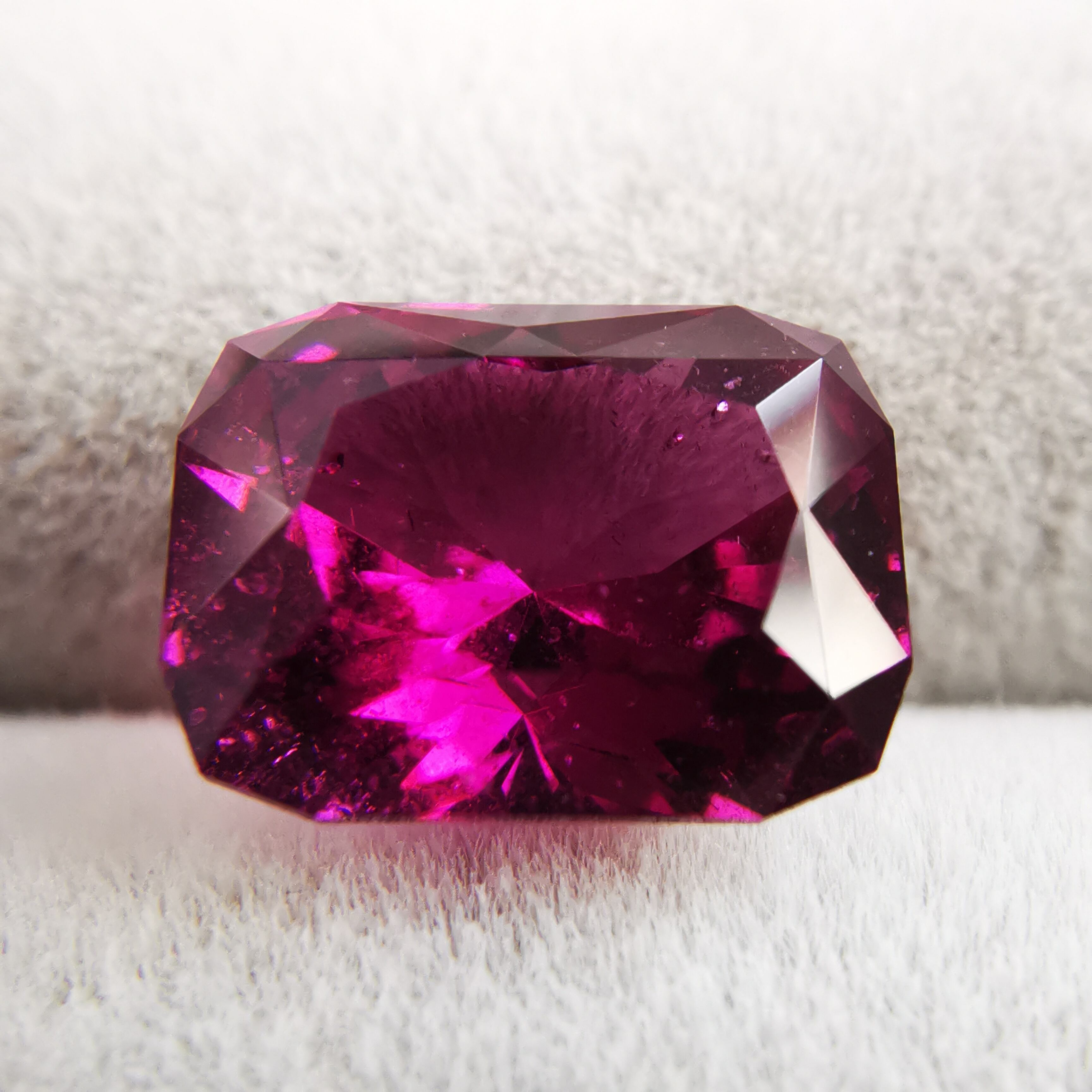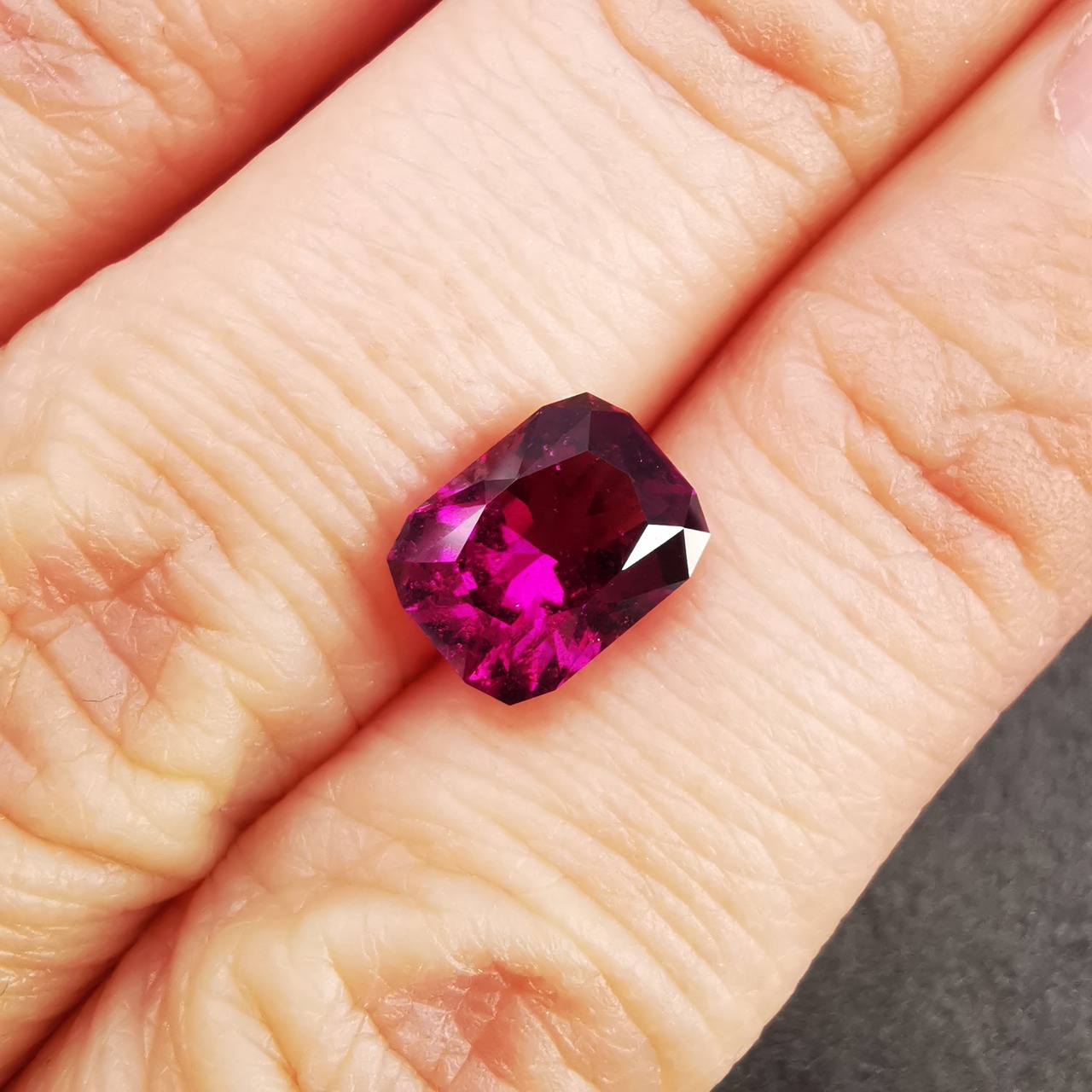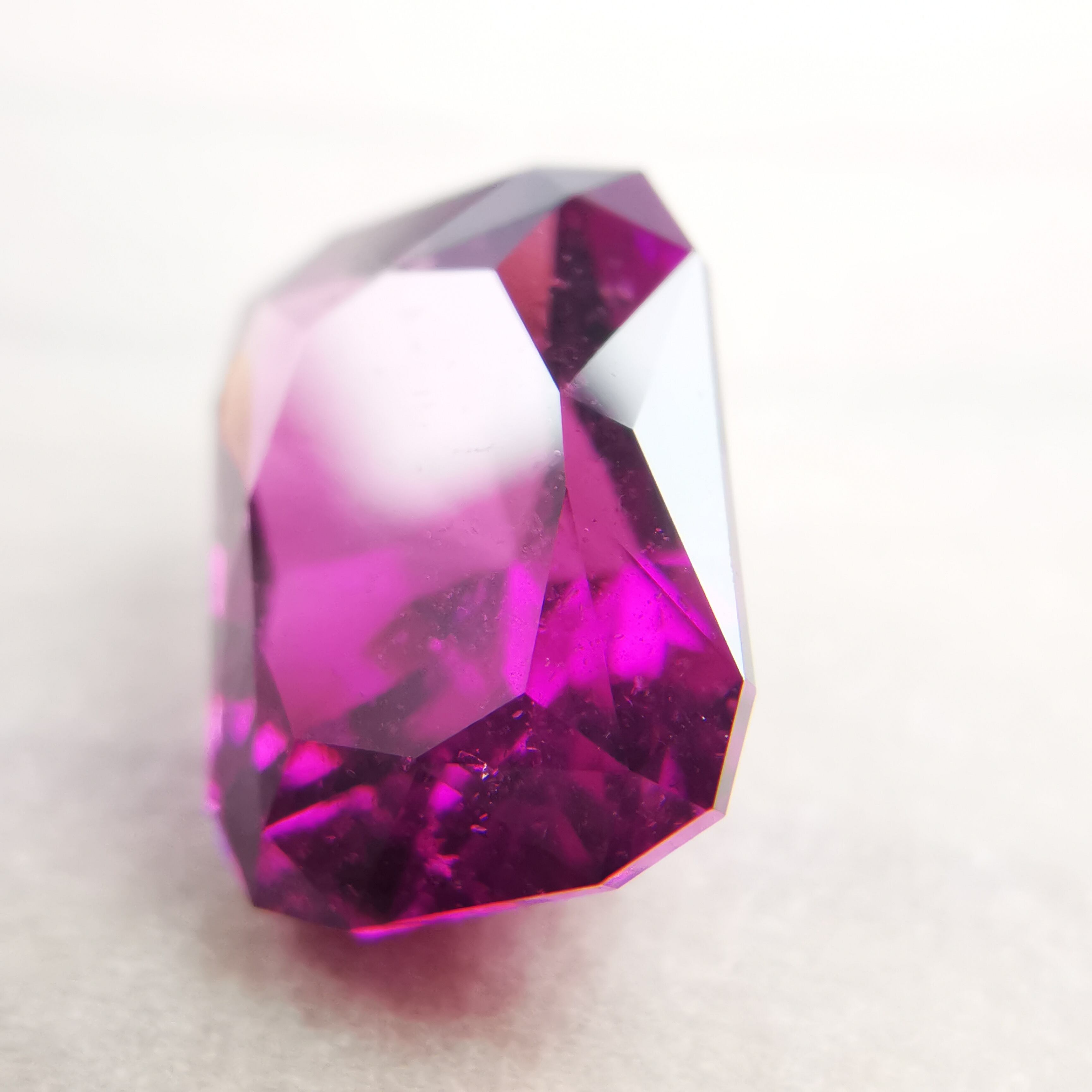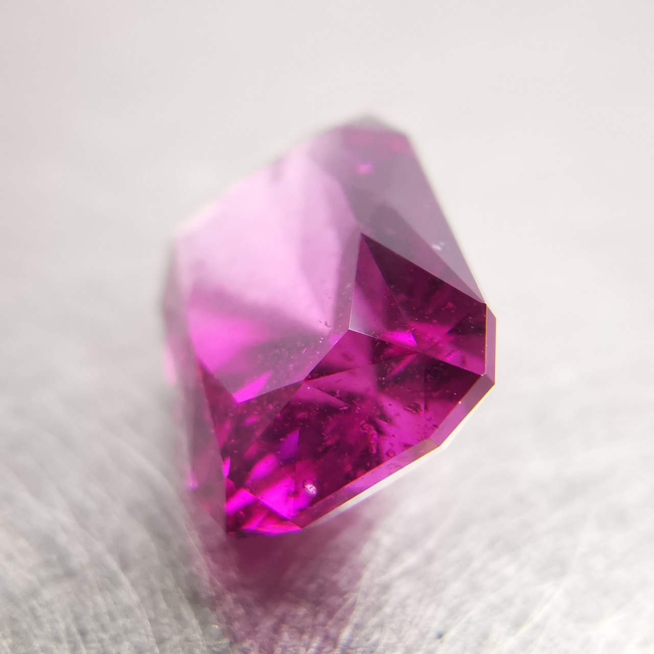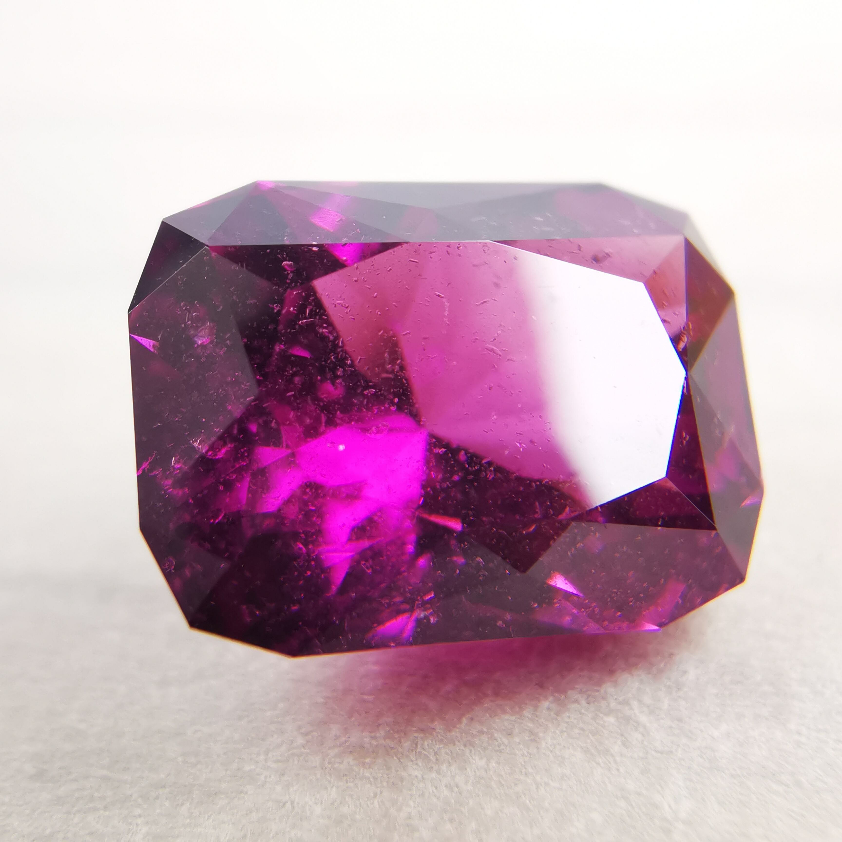 落ち着いたバーガンディー色の中から、鮮やかなピンクパープルが輝くガーネットです。