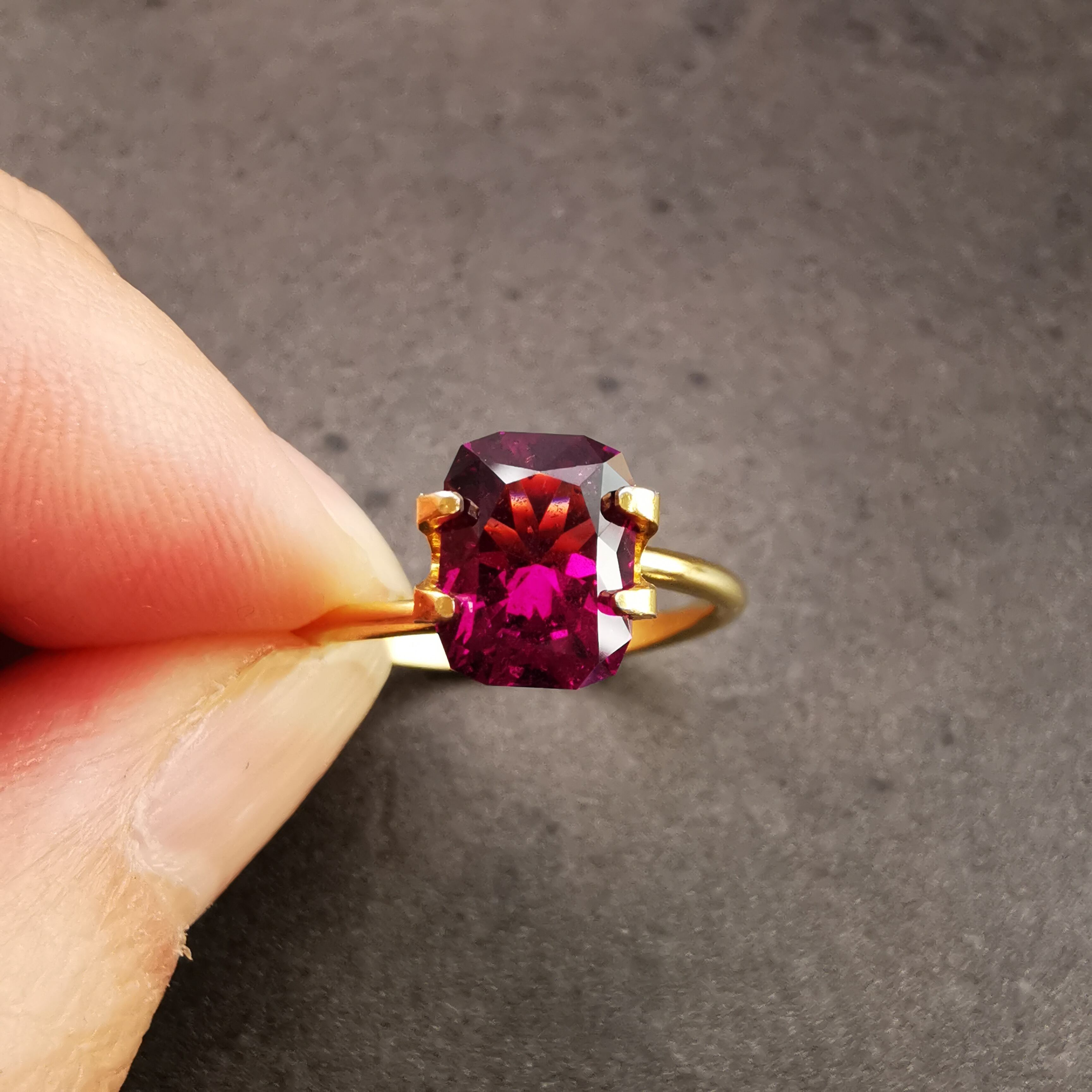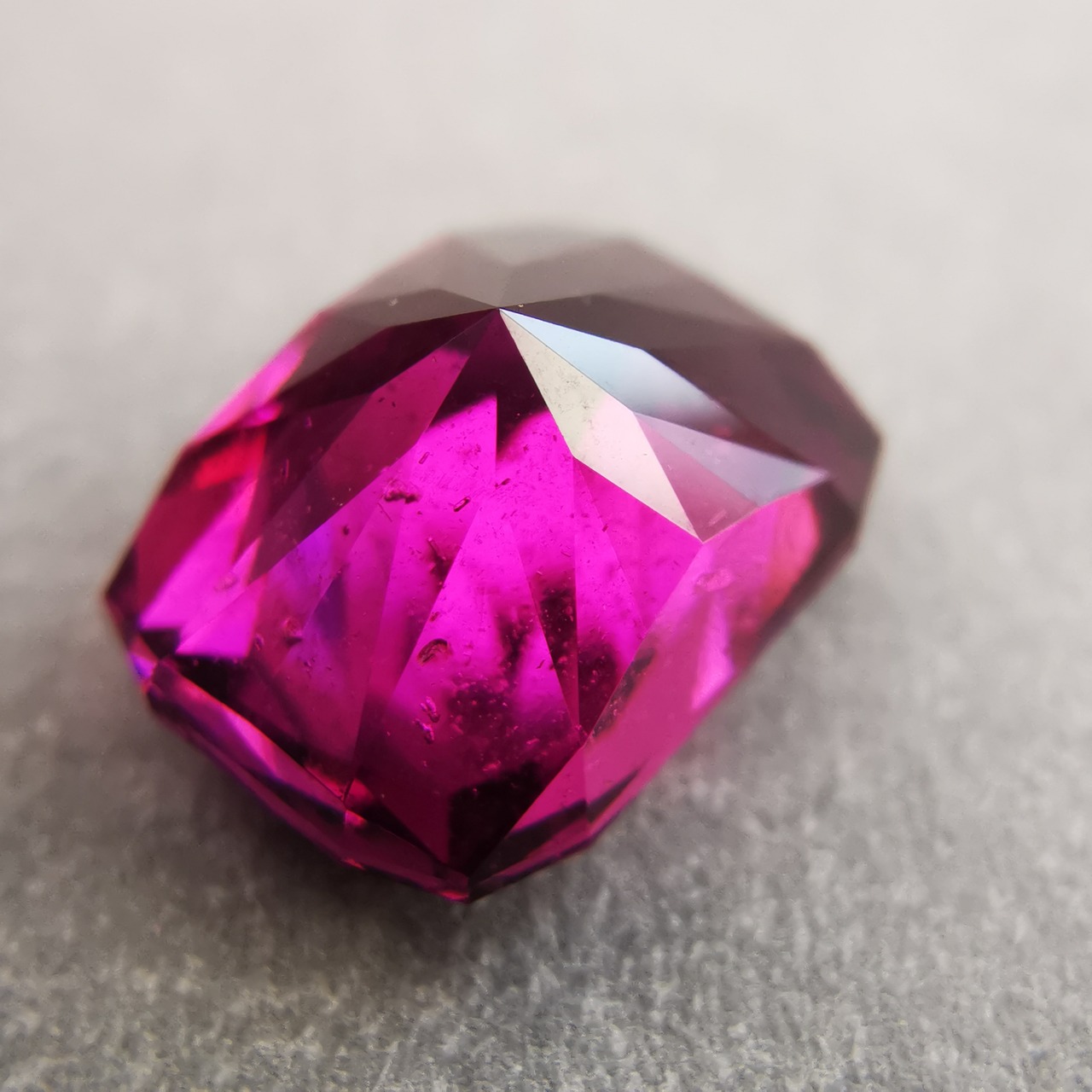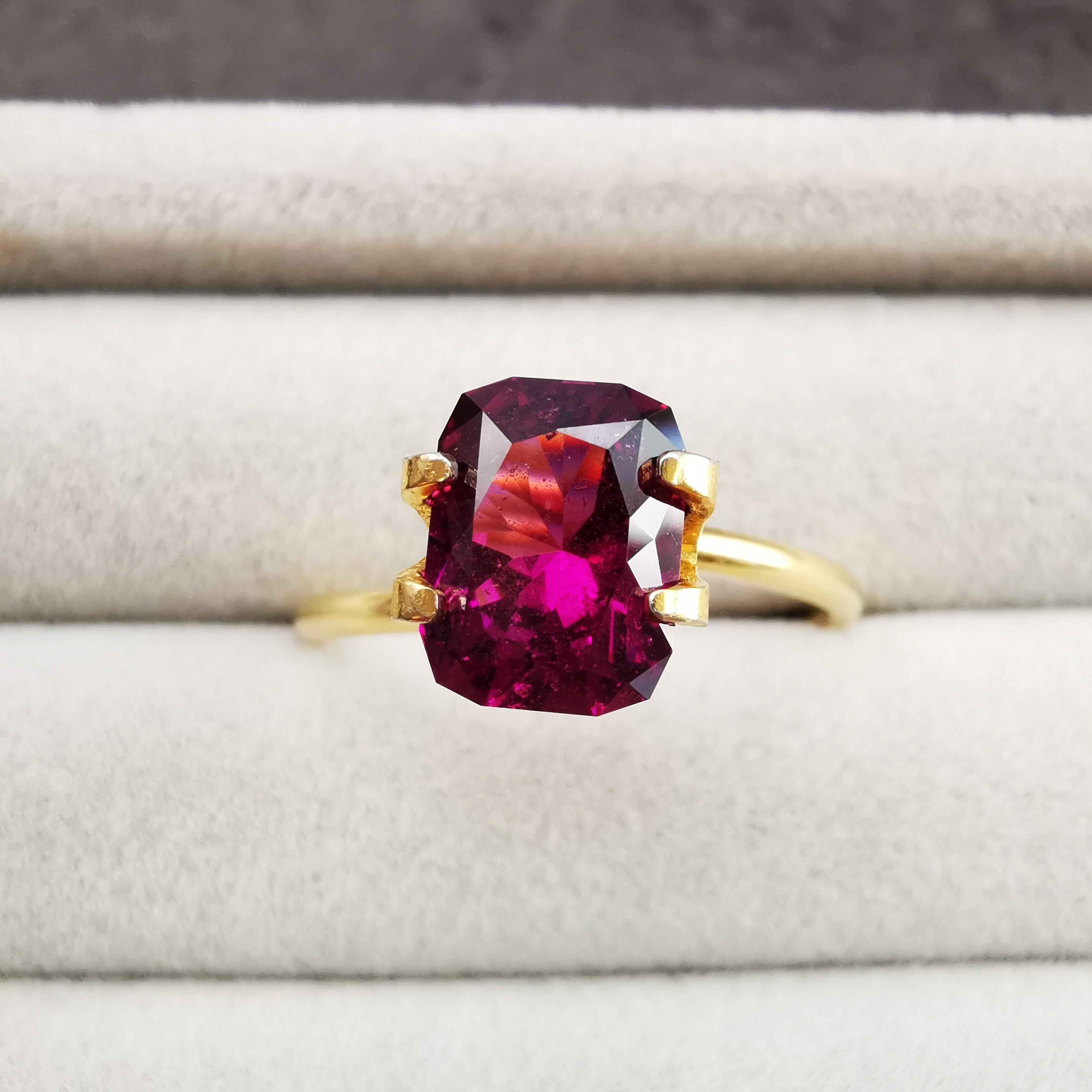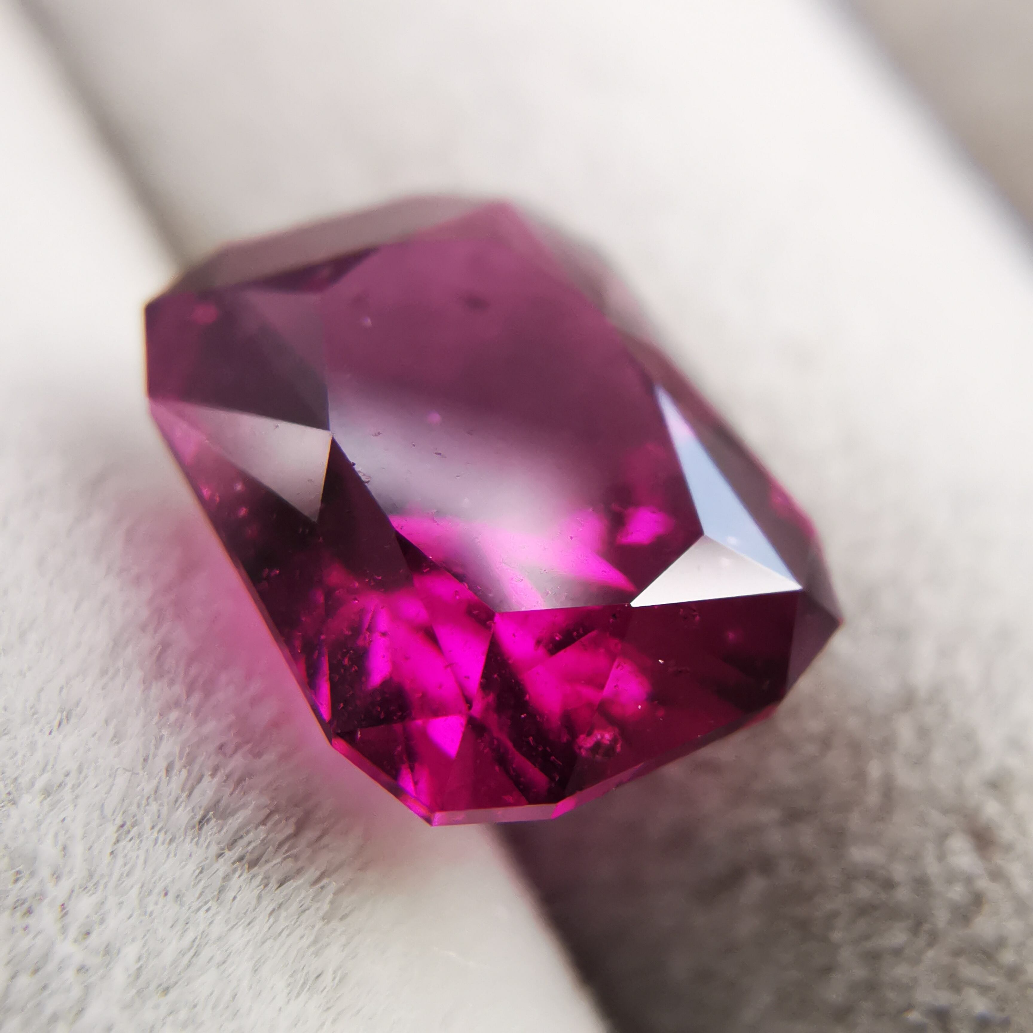 落ち着いたバーガンディー色の中から、鮮やかなピンクパープルが輝くガーネットです。