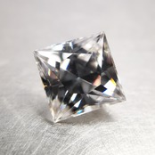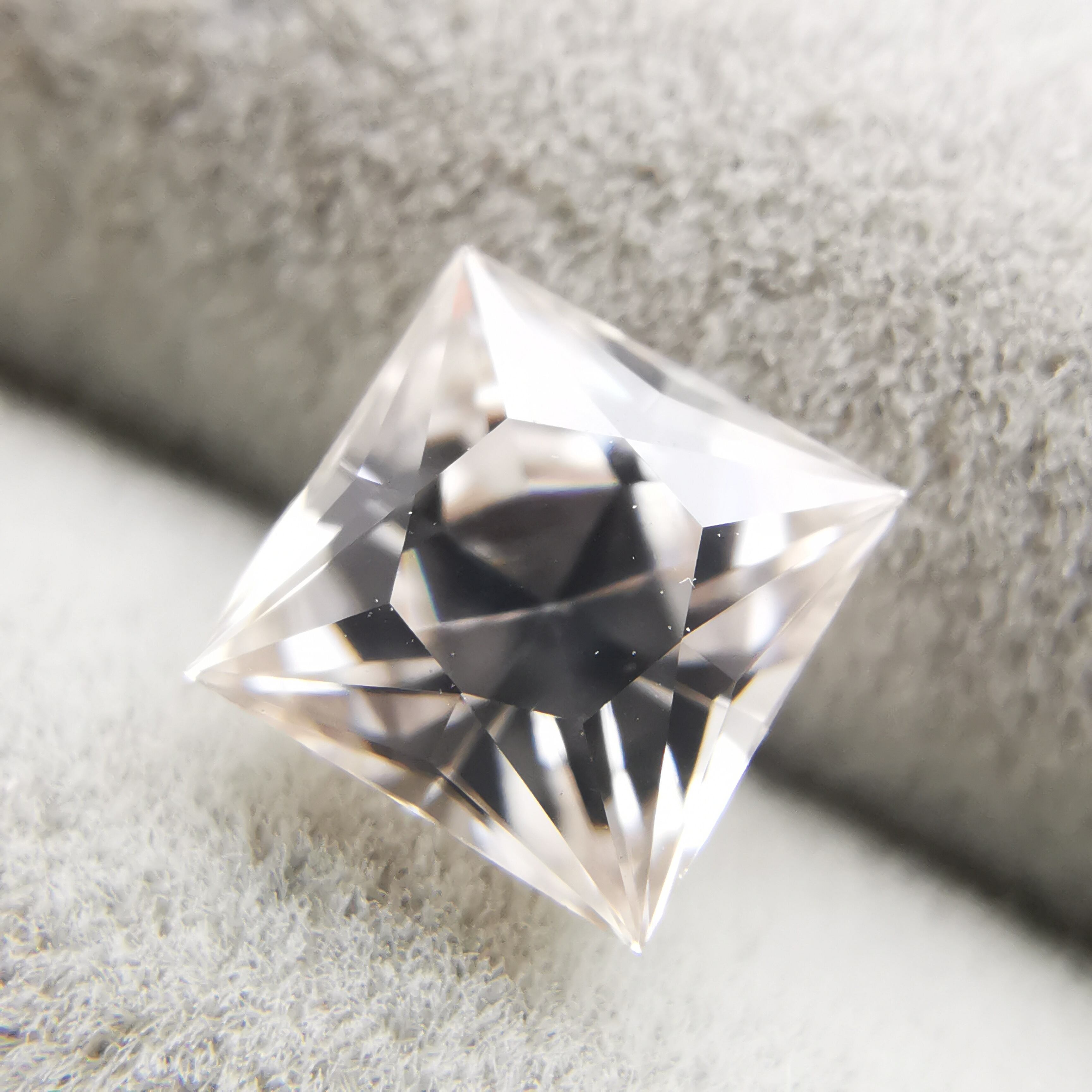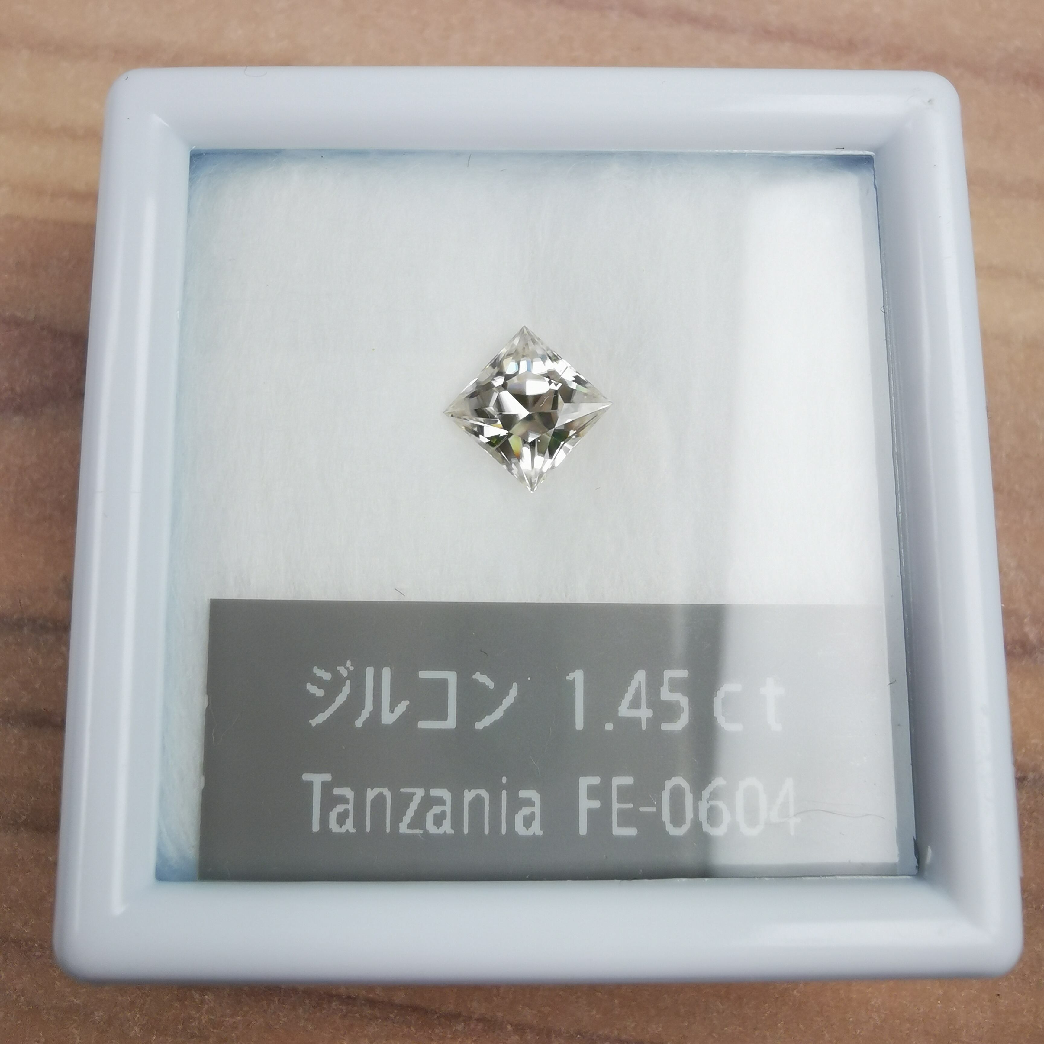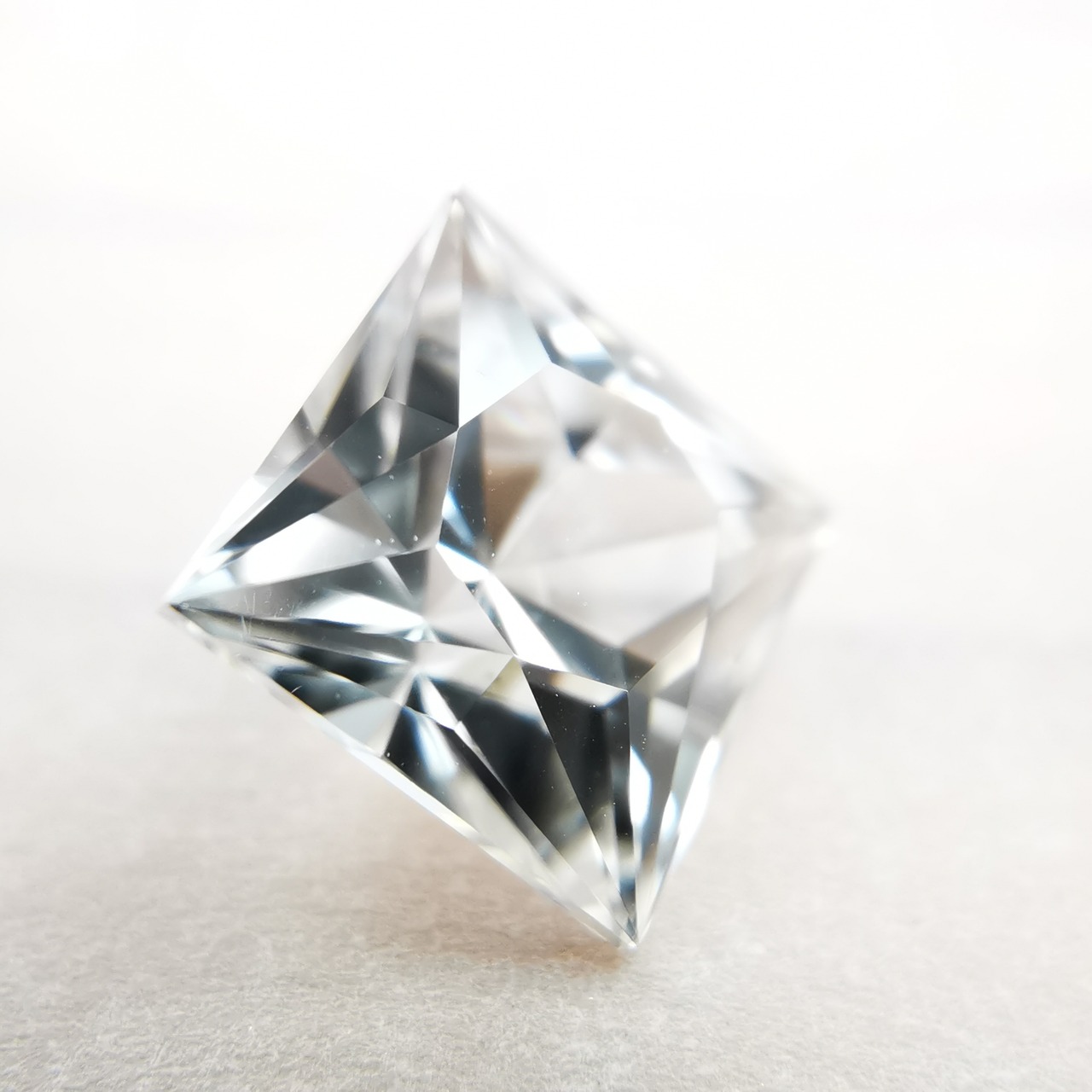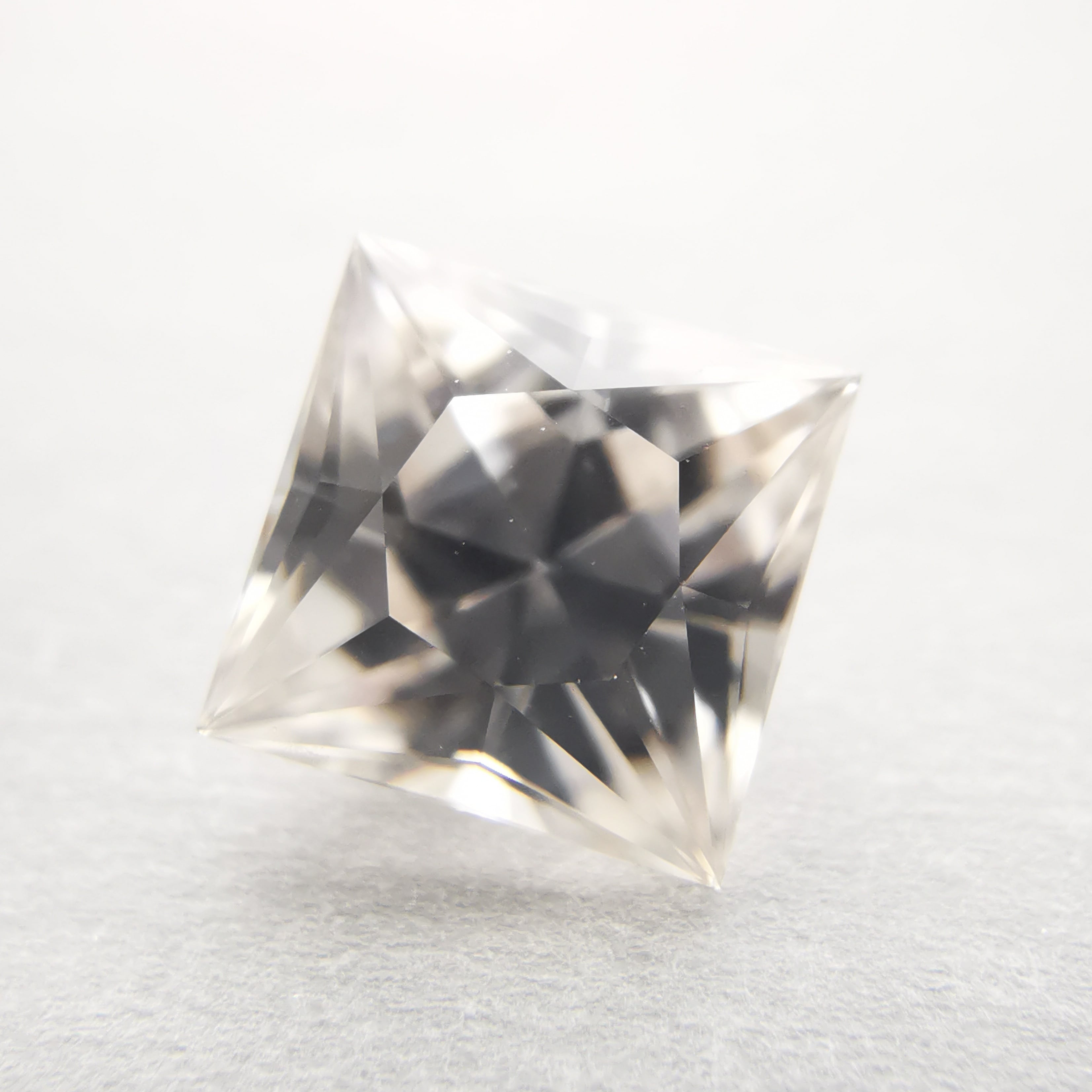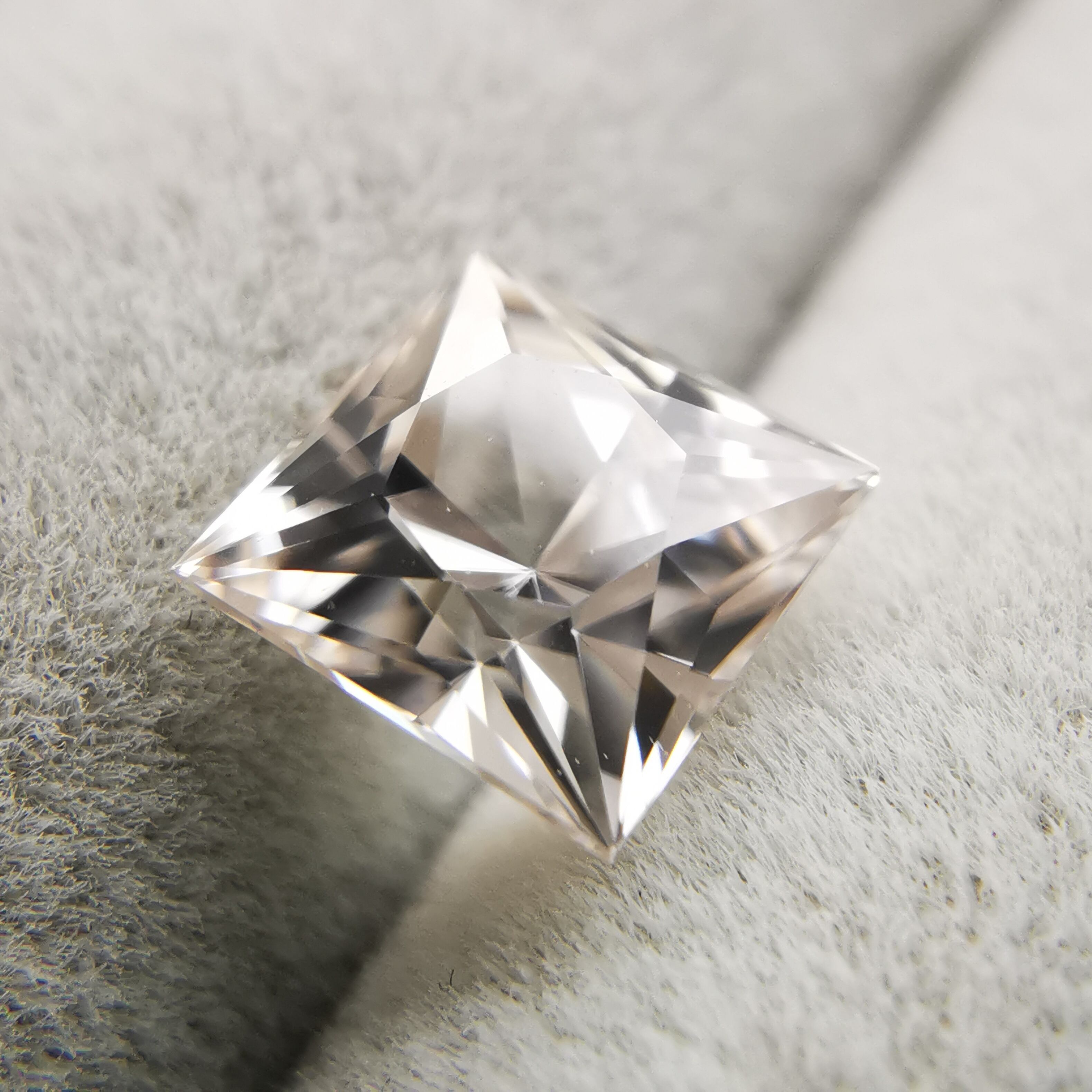 自然光の日陰では、わずかにベージュがかったしっとりとしたカラー、照明の下では虹色のファイアがきらめくメリーゴーランドのようなホワイトジルコンです。