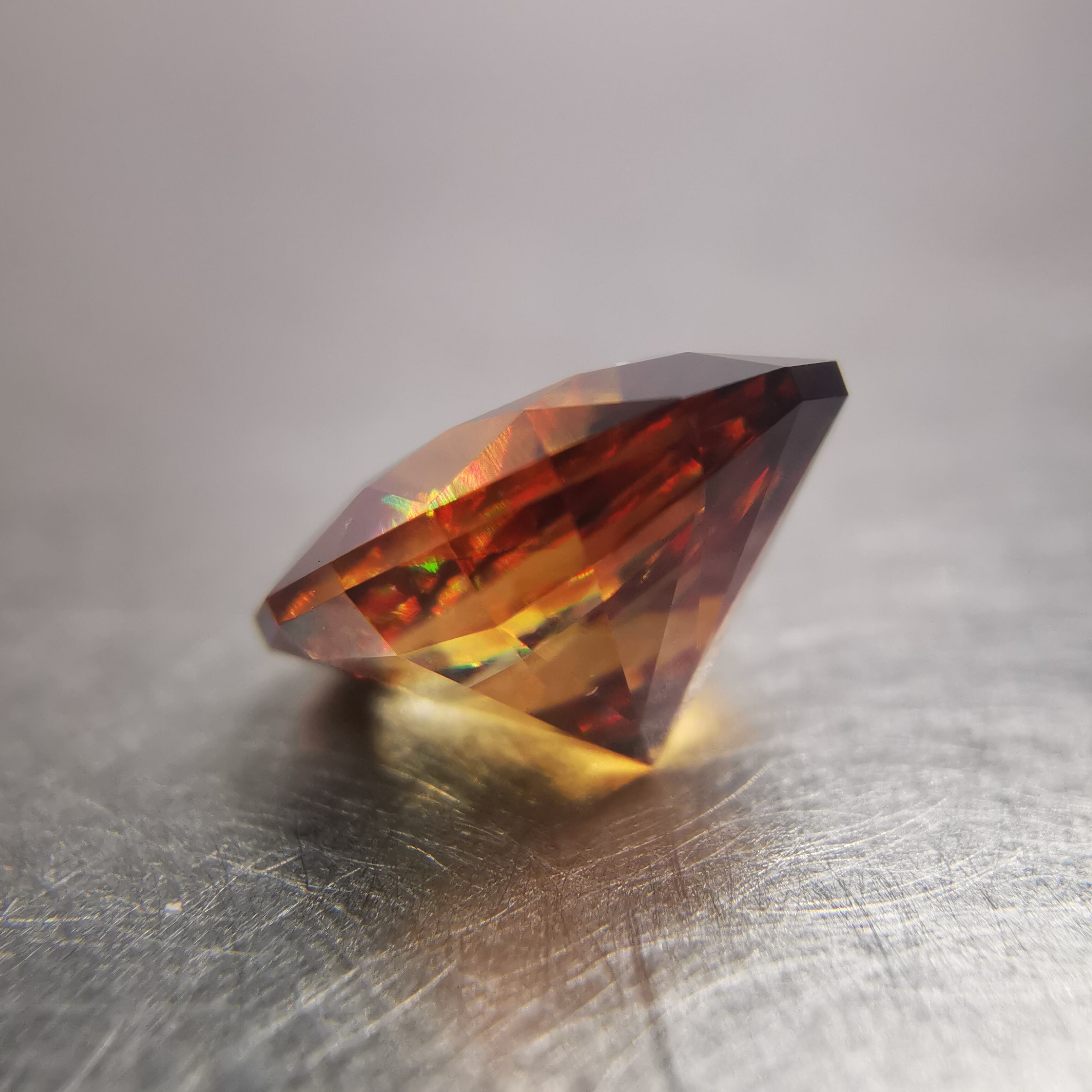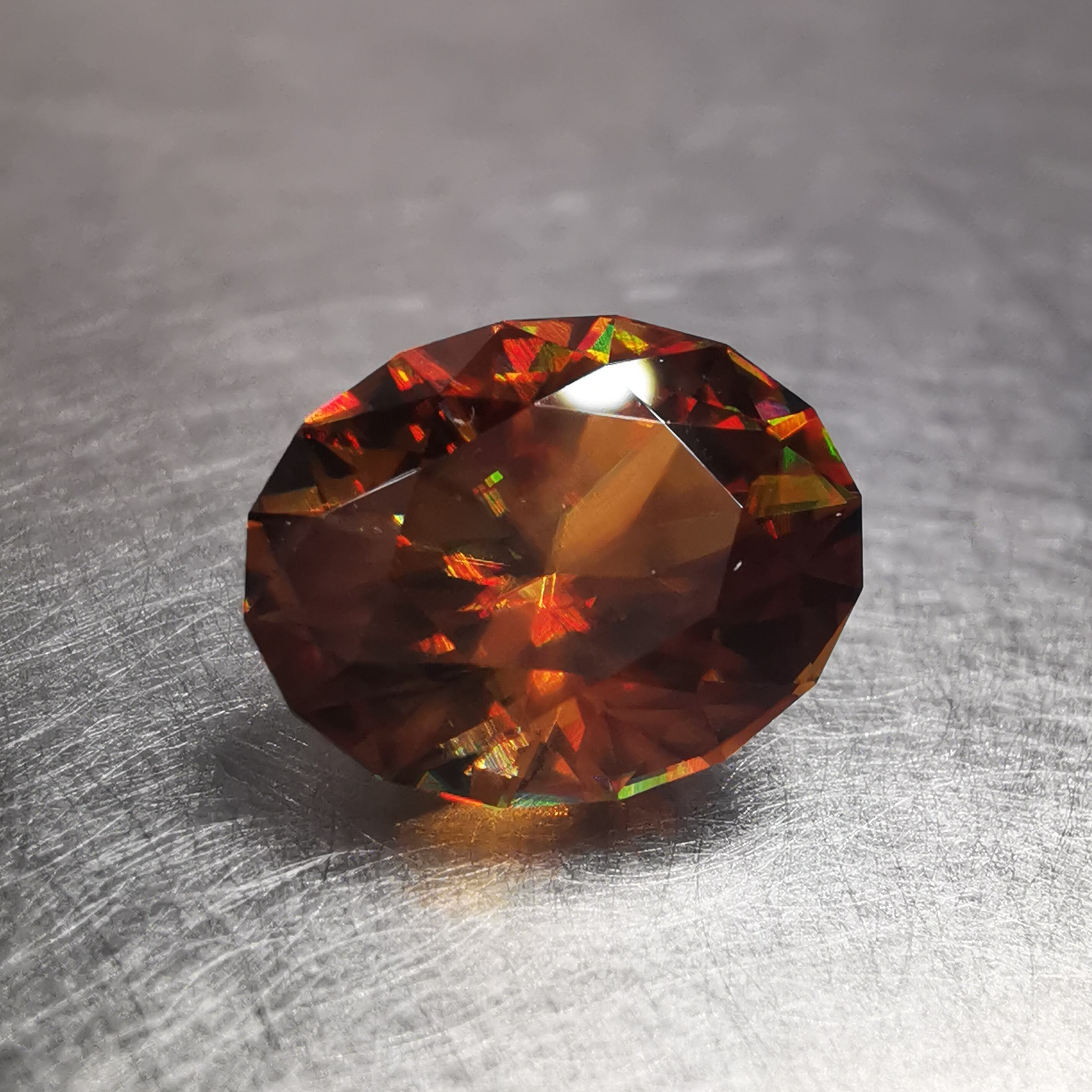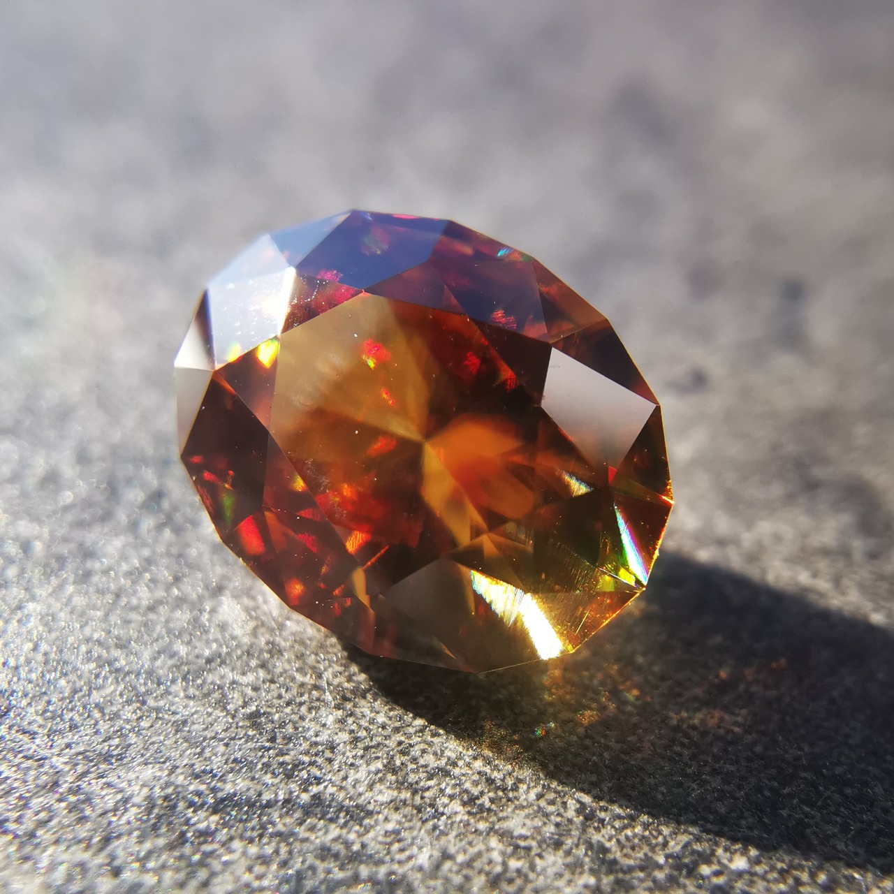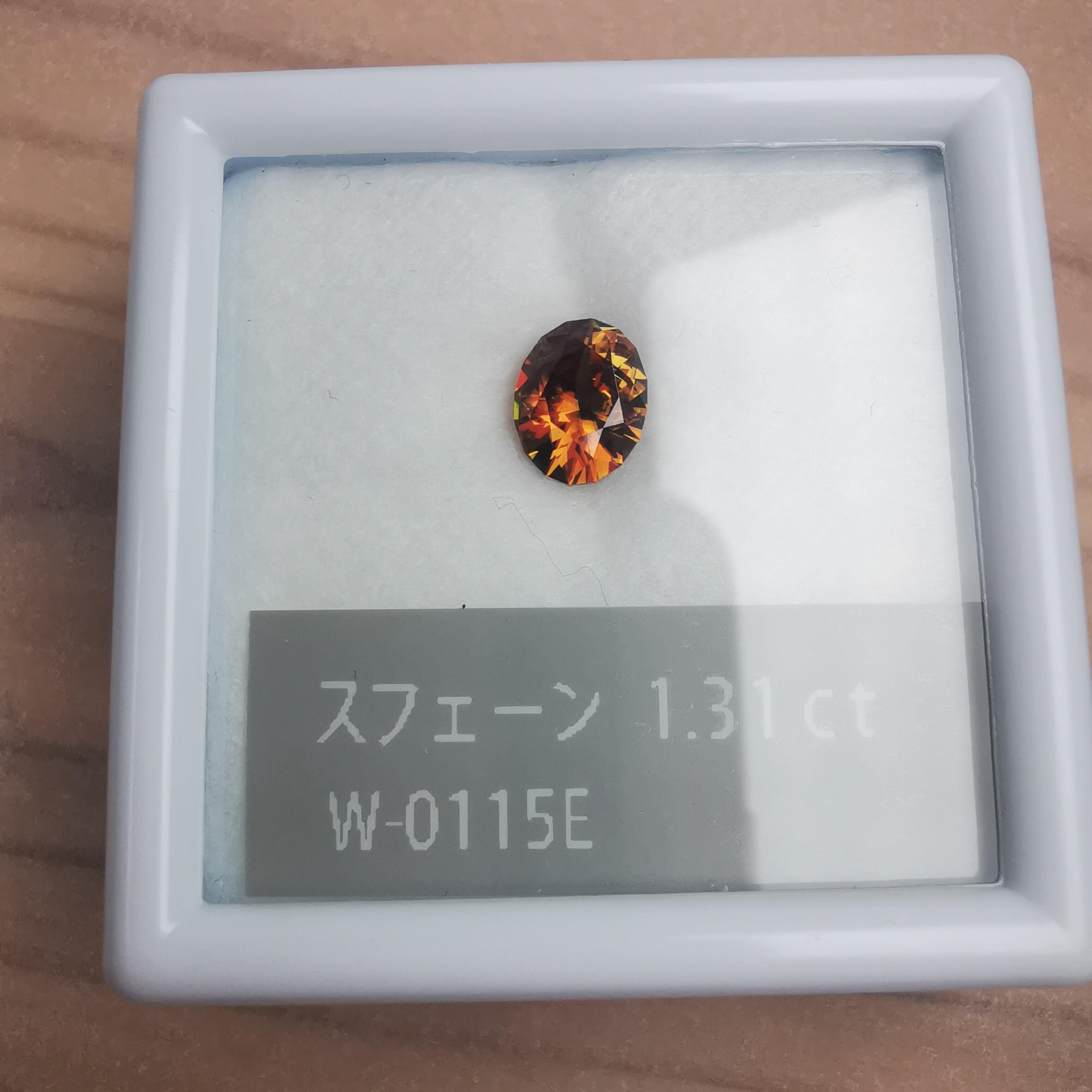 ブラウン系の石の中から、鮮やかなイエローオレンジがきらめき、虹色のファイアが溢れるように輝くスフェーンです。
