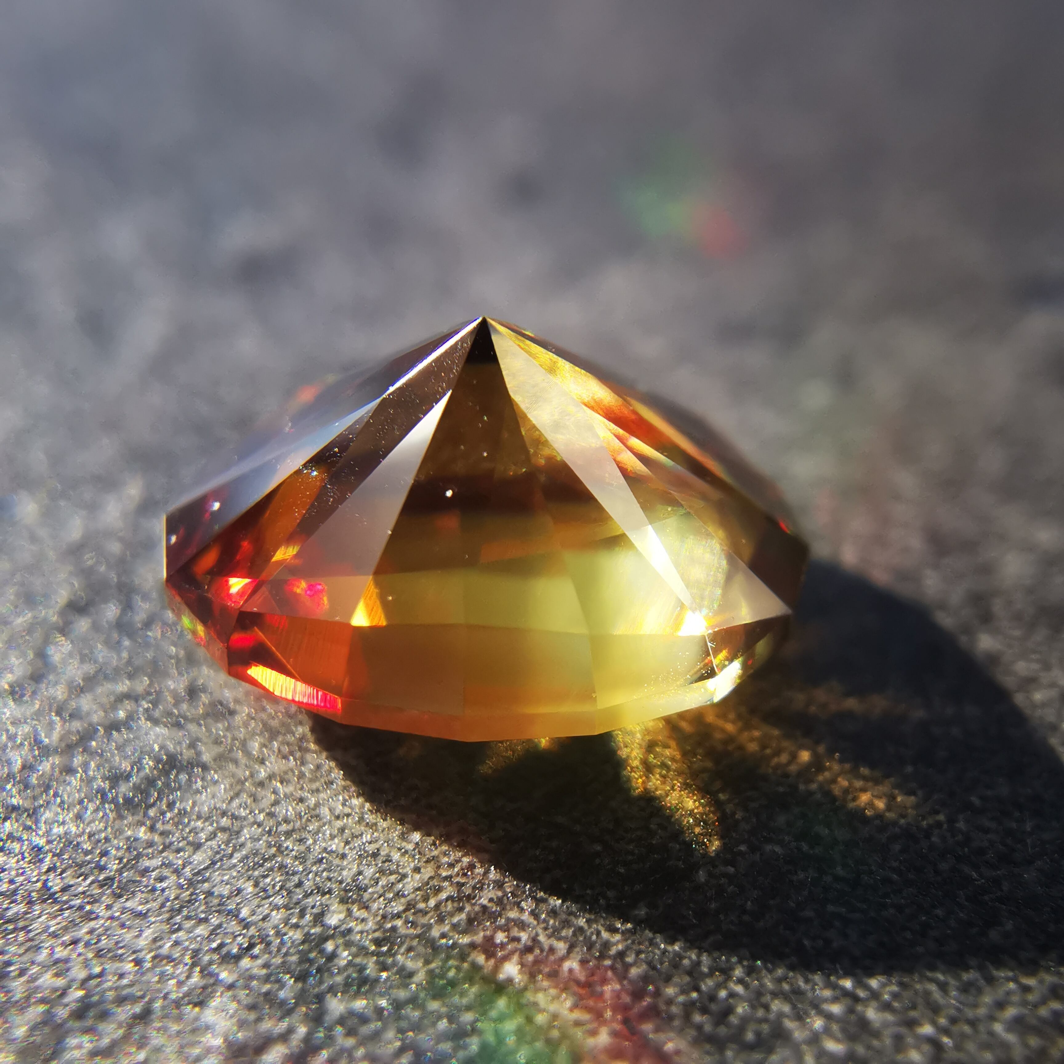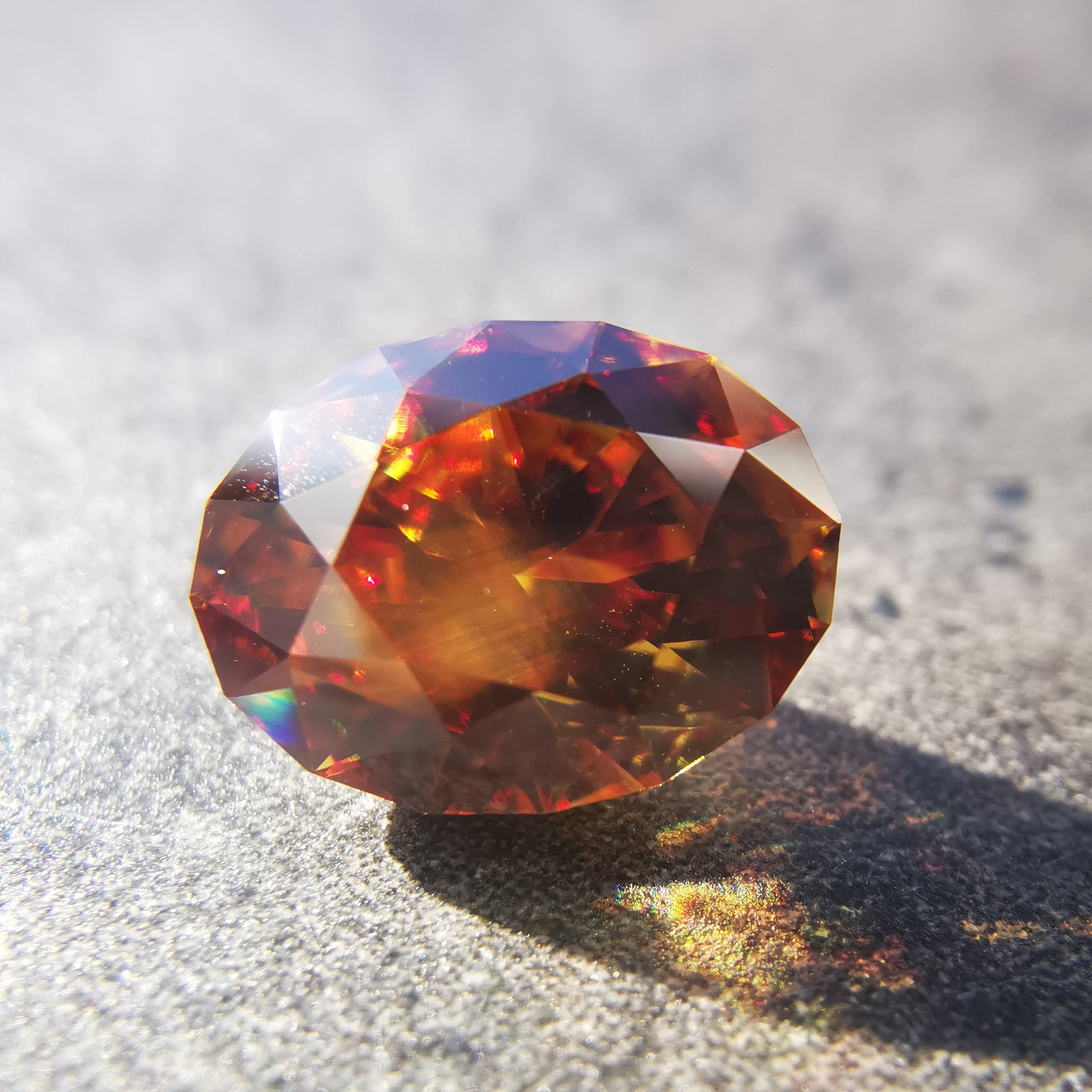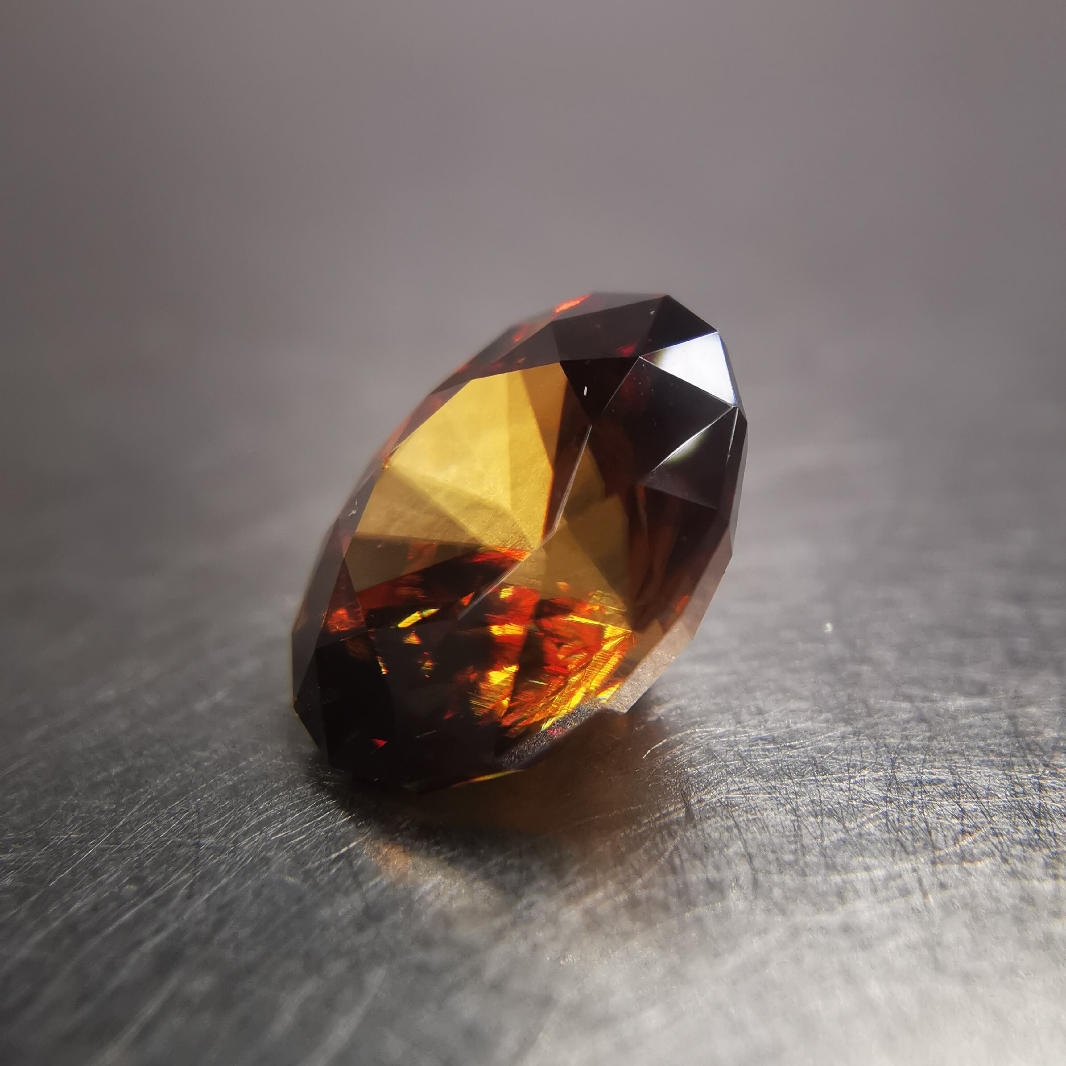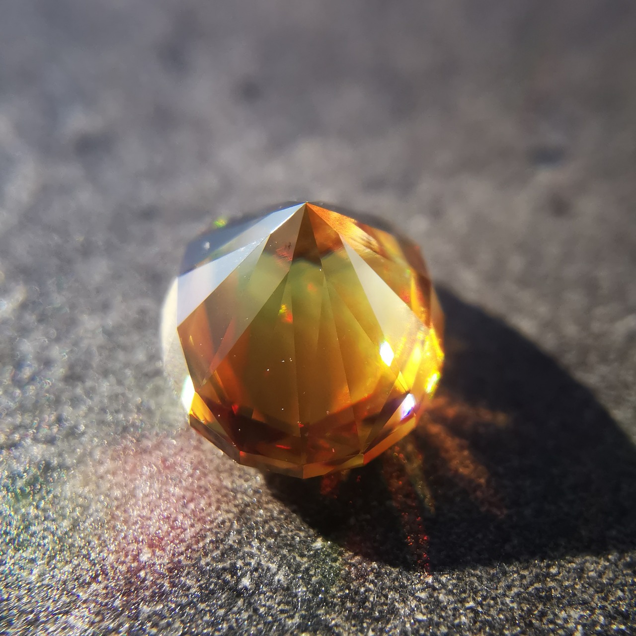 ブラウン系の石の中から、鮮やかなイエローオレンジがきらめき、虹色のファイアが溢れるように輝くスフェーンです。