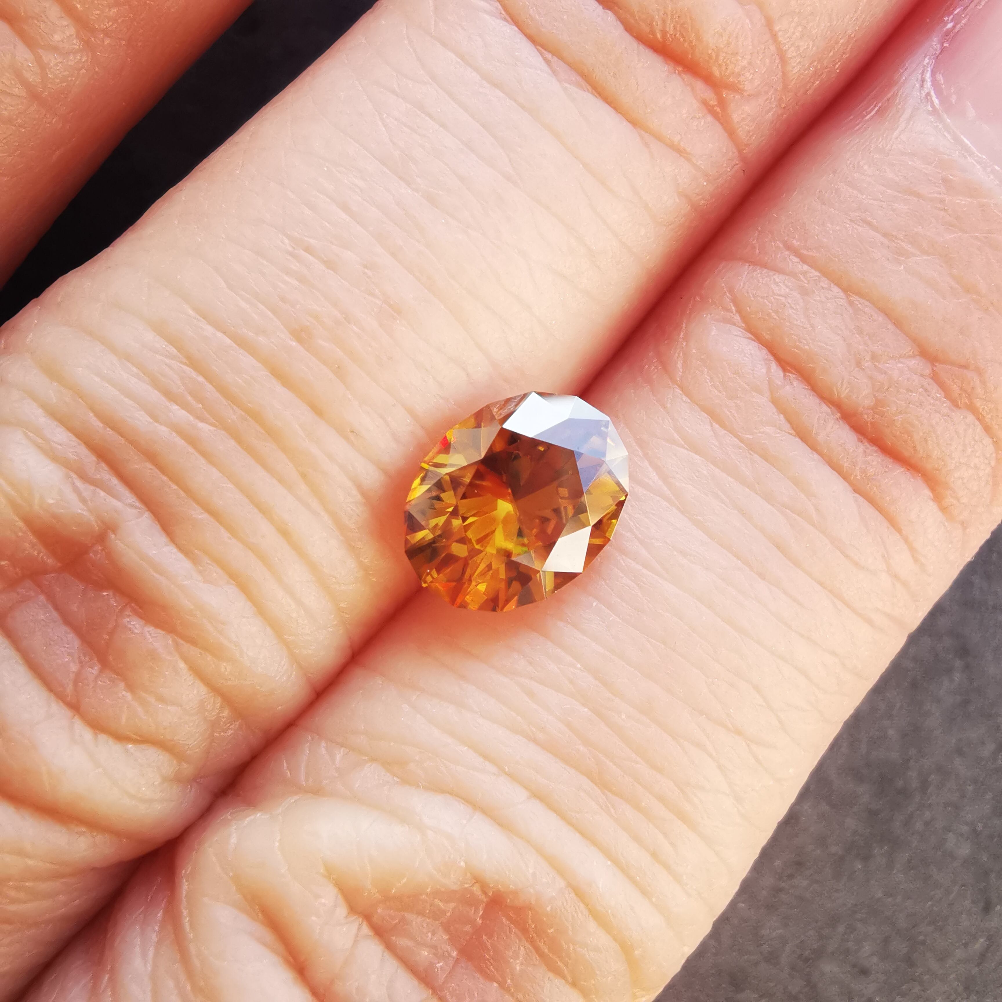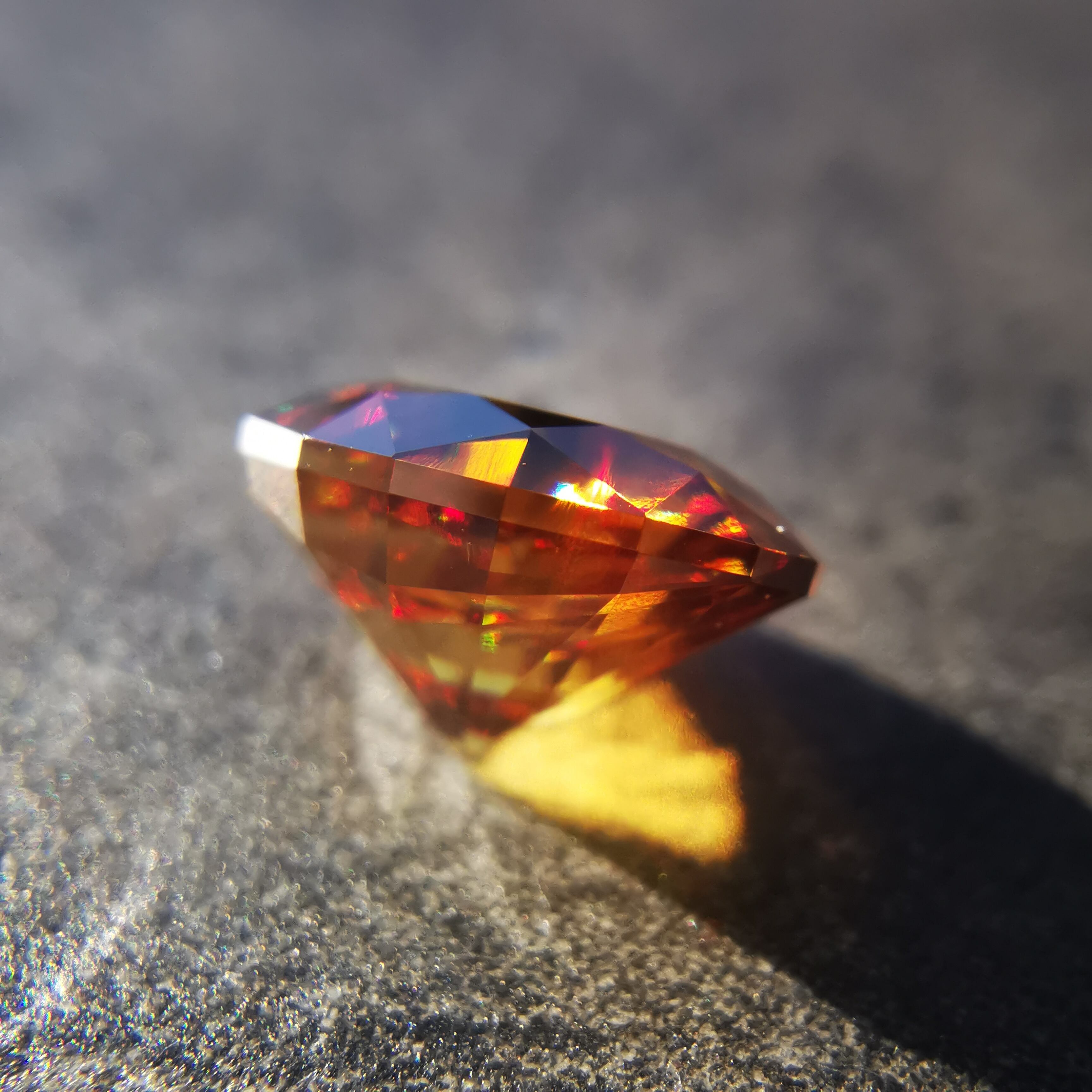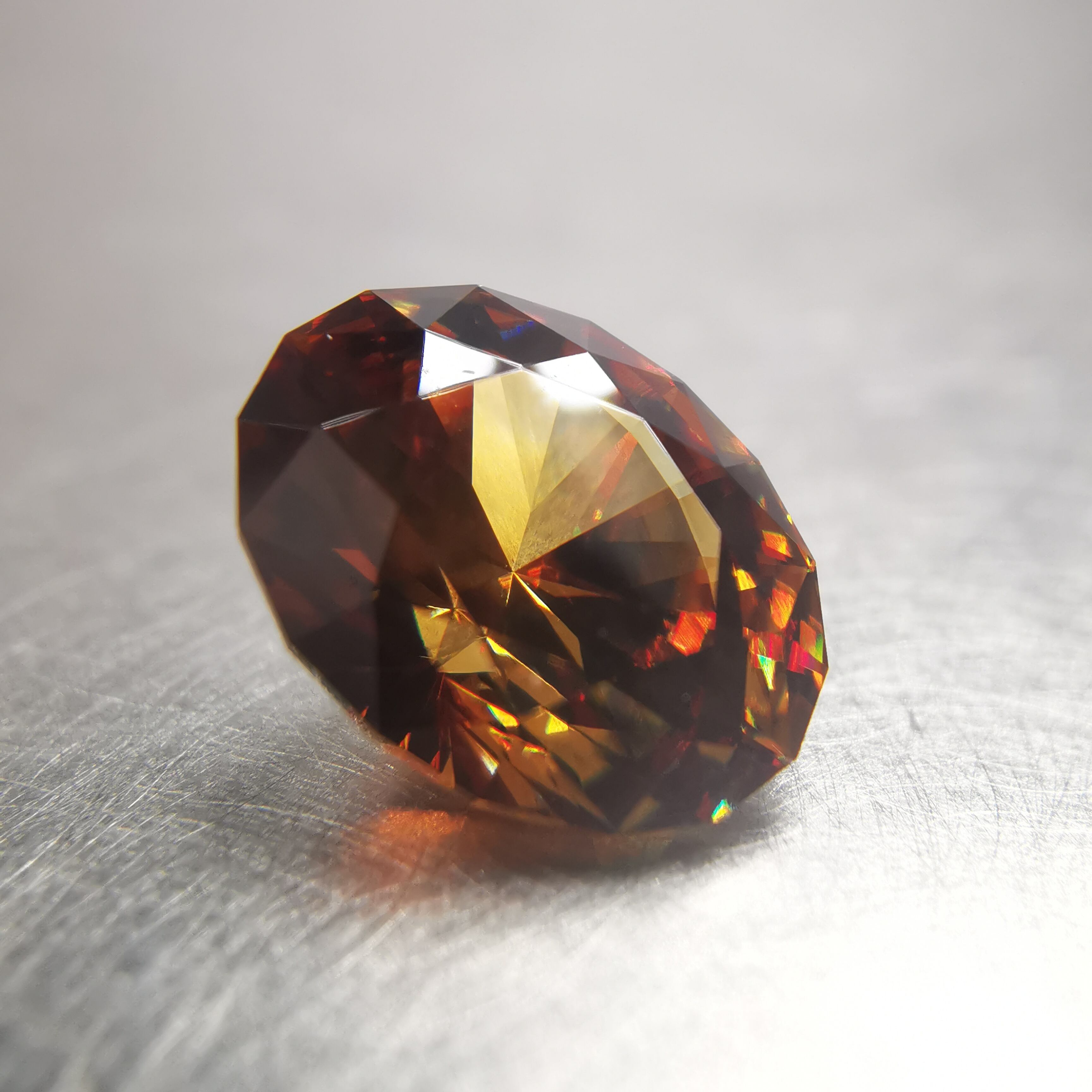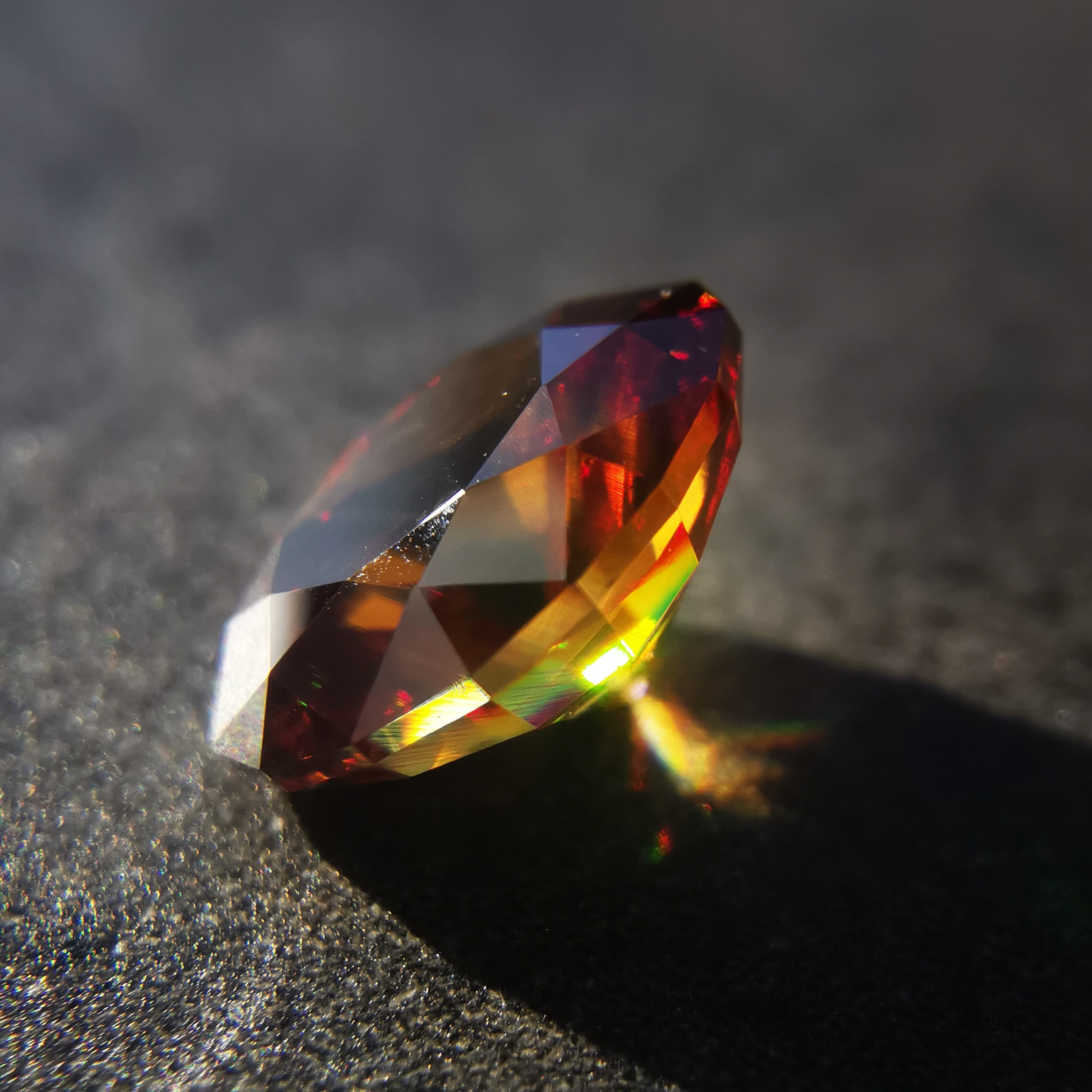 ブラウン系の石の中から、鮮やかなイエローオレンジがきらめき、虹色のファイアが溢れるように輝くスフェーンです。