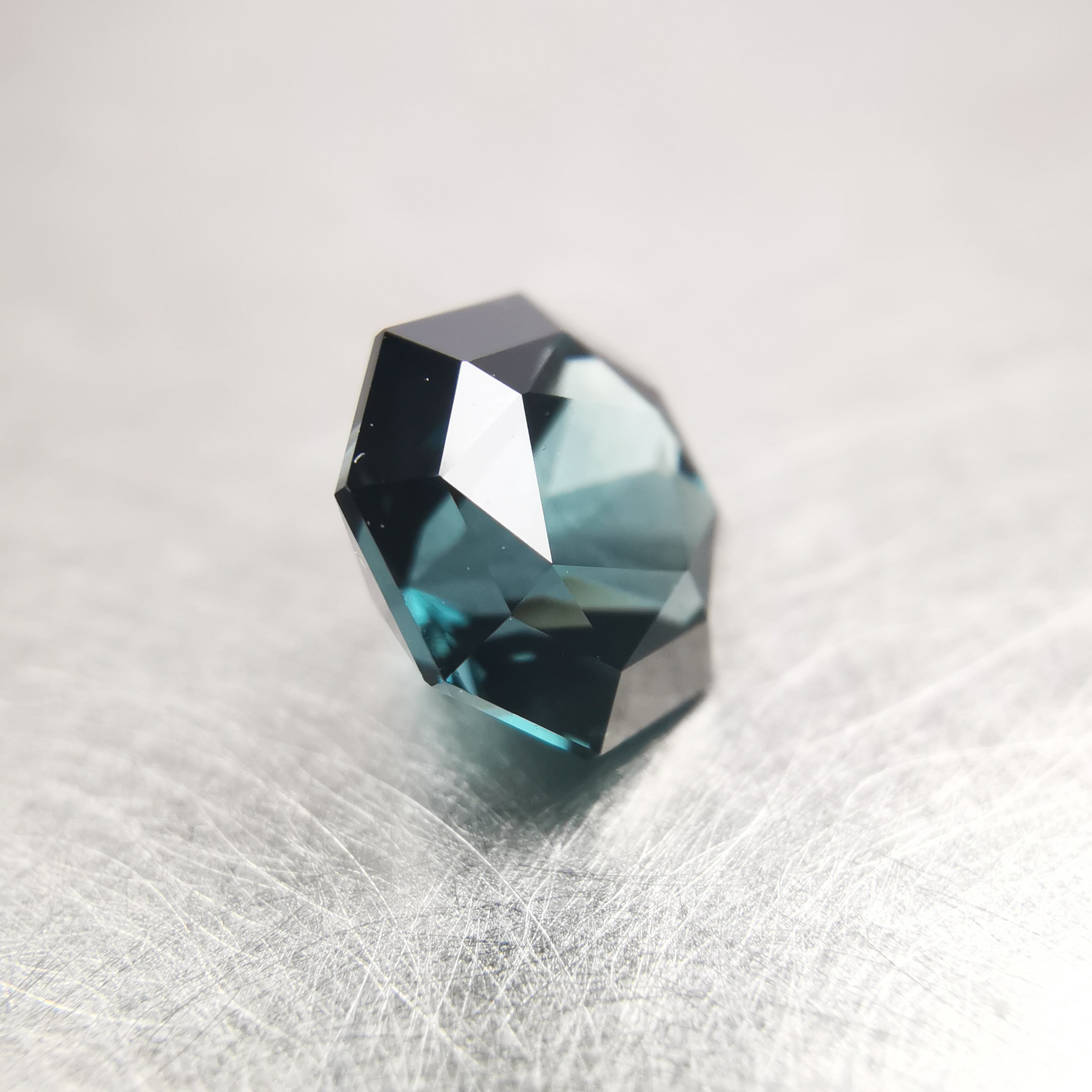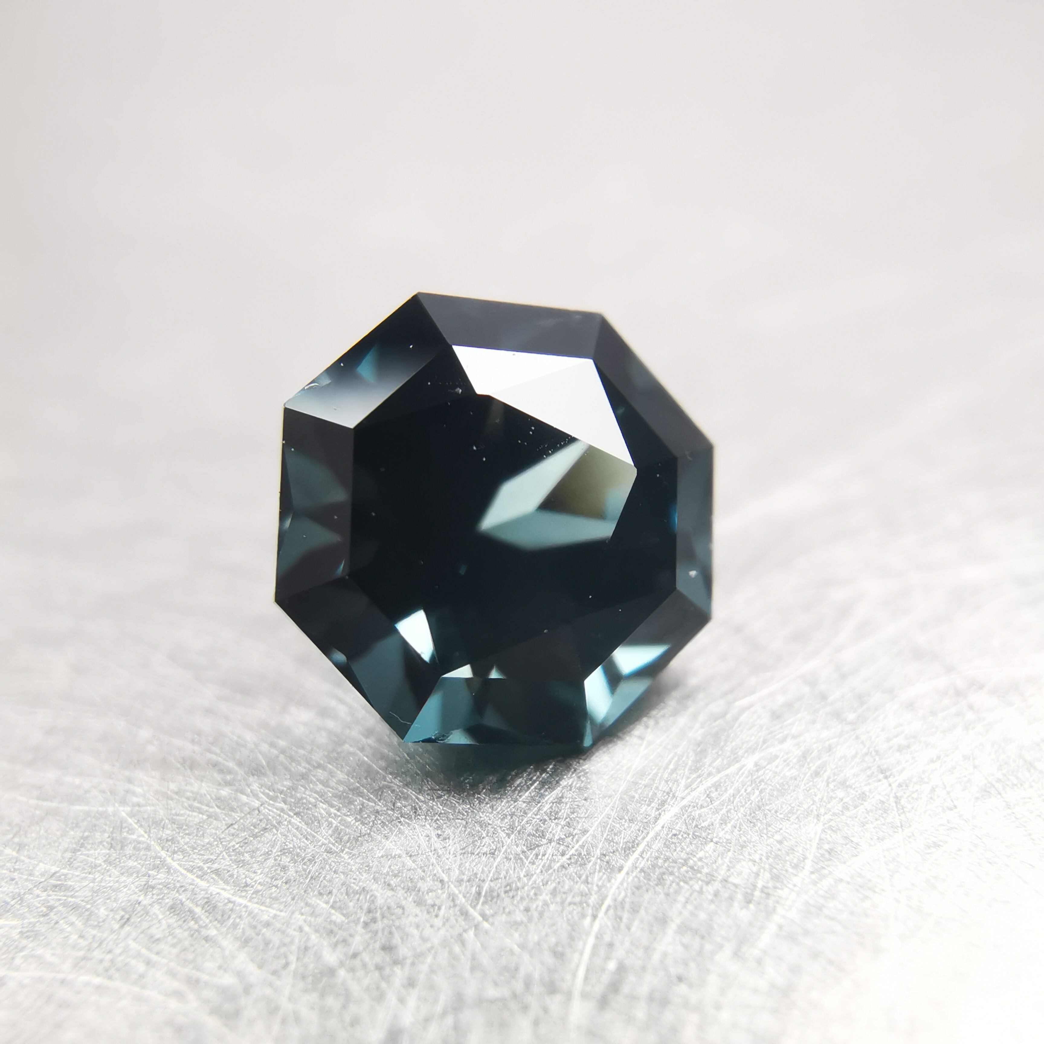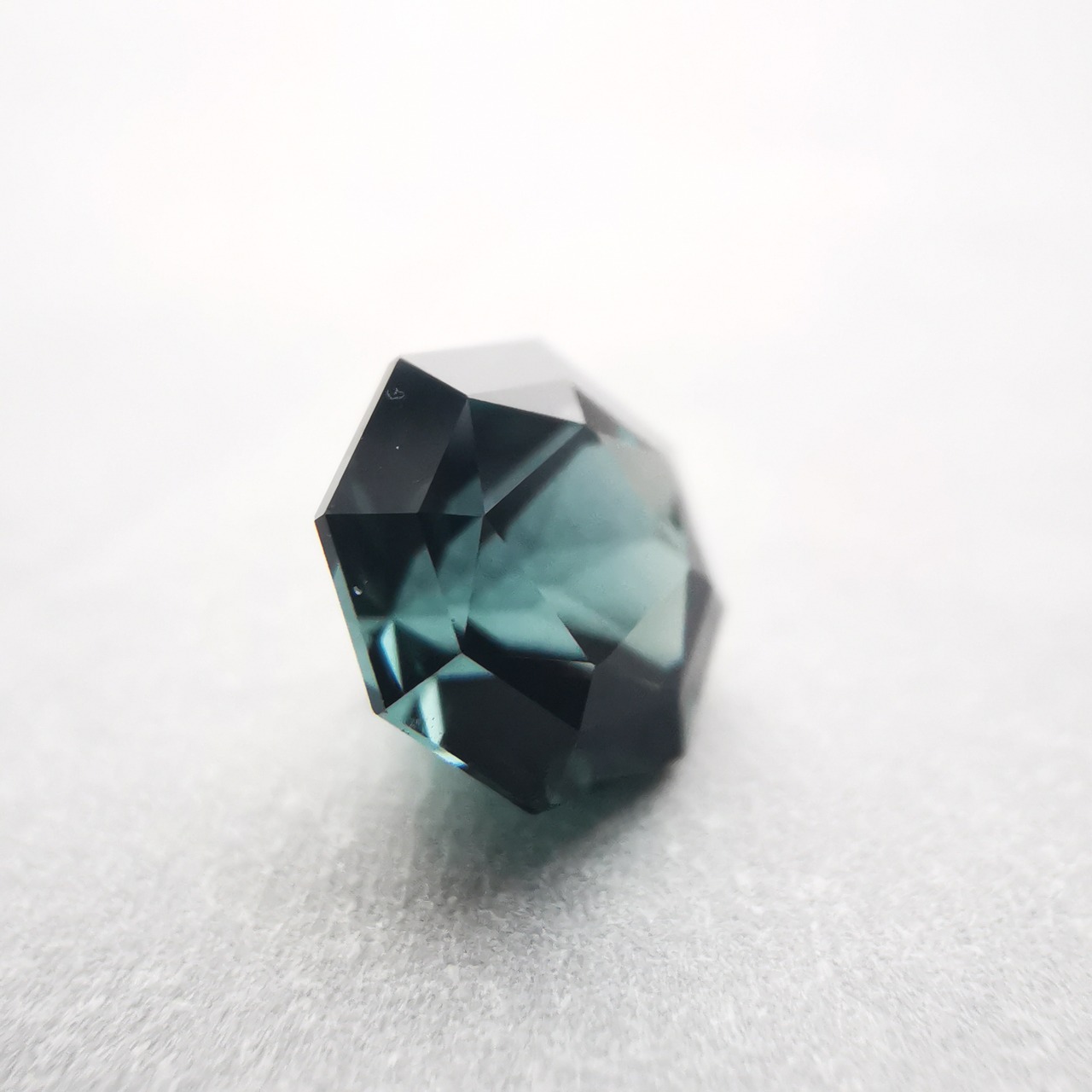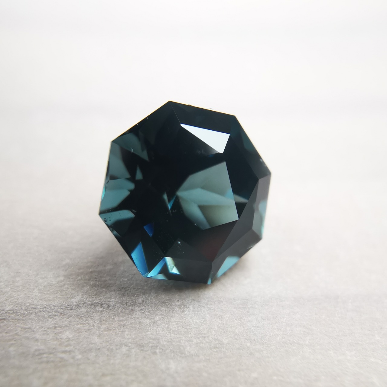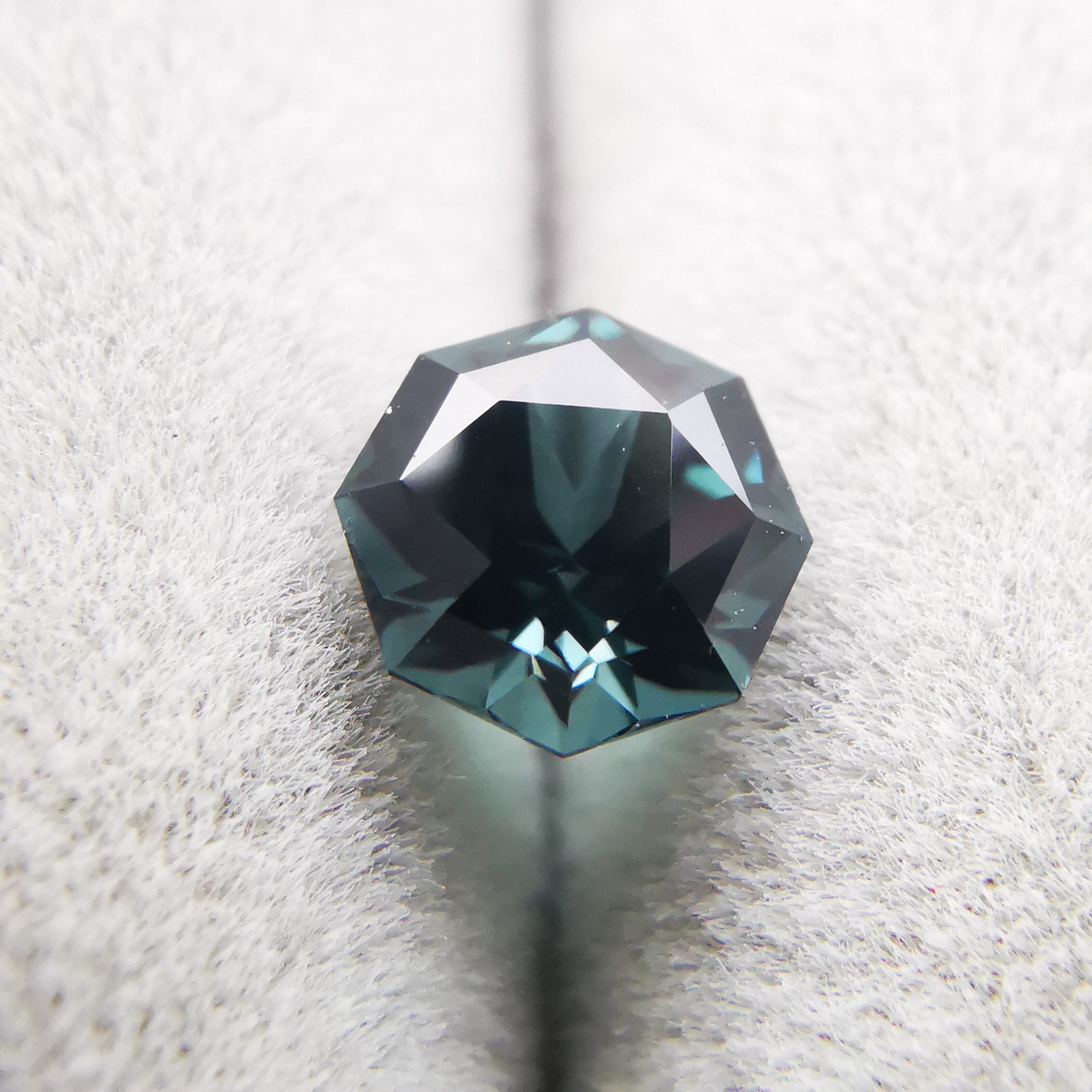 深い森を思わせる暗いフォレストグリーンの中から、ブルーグリーンの光が鋭くきらめく、スピネルらしい一石です。