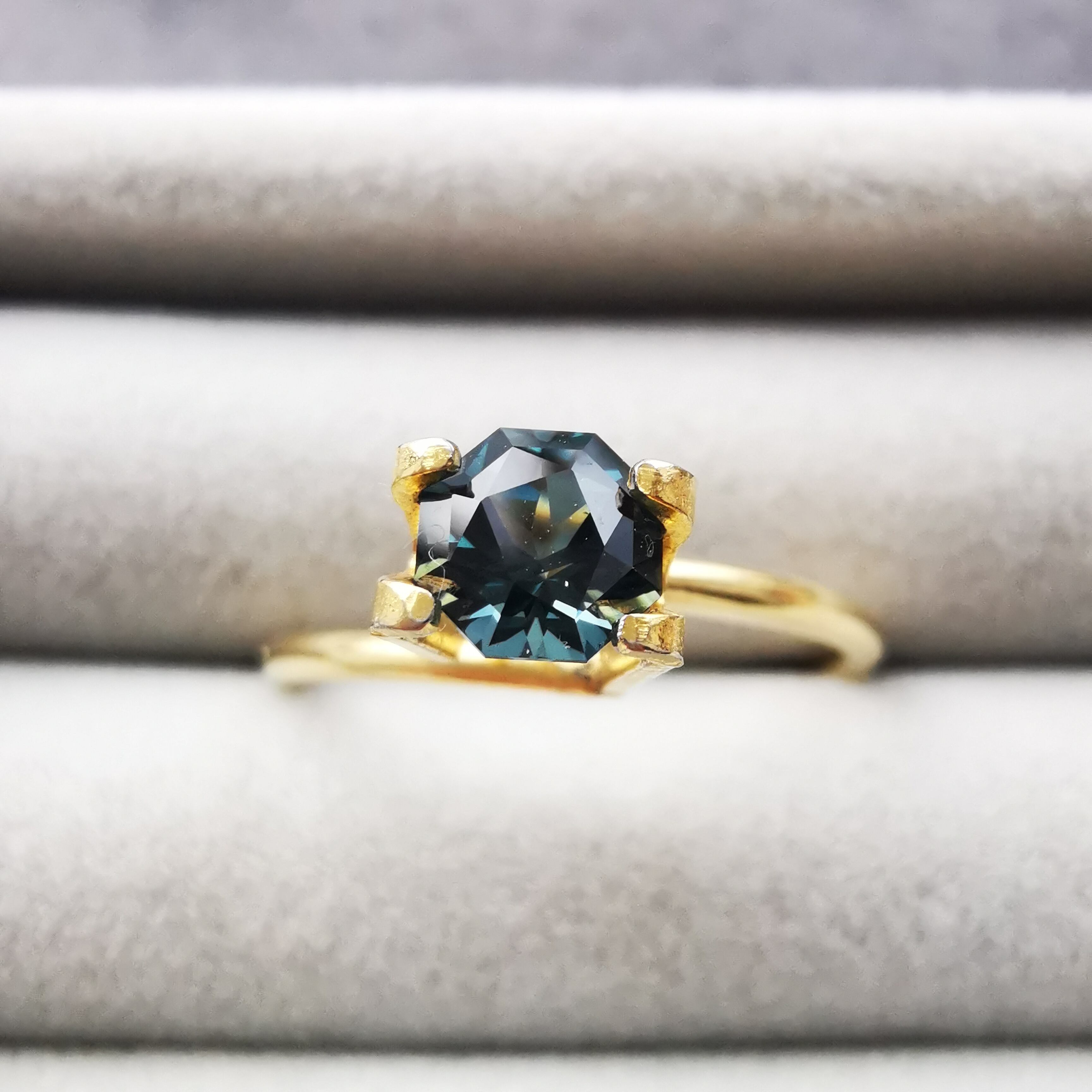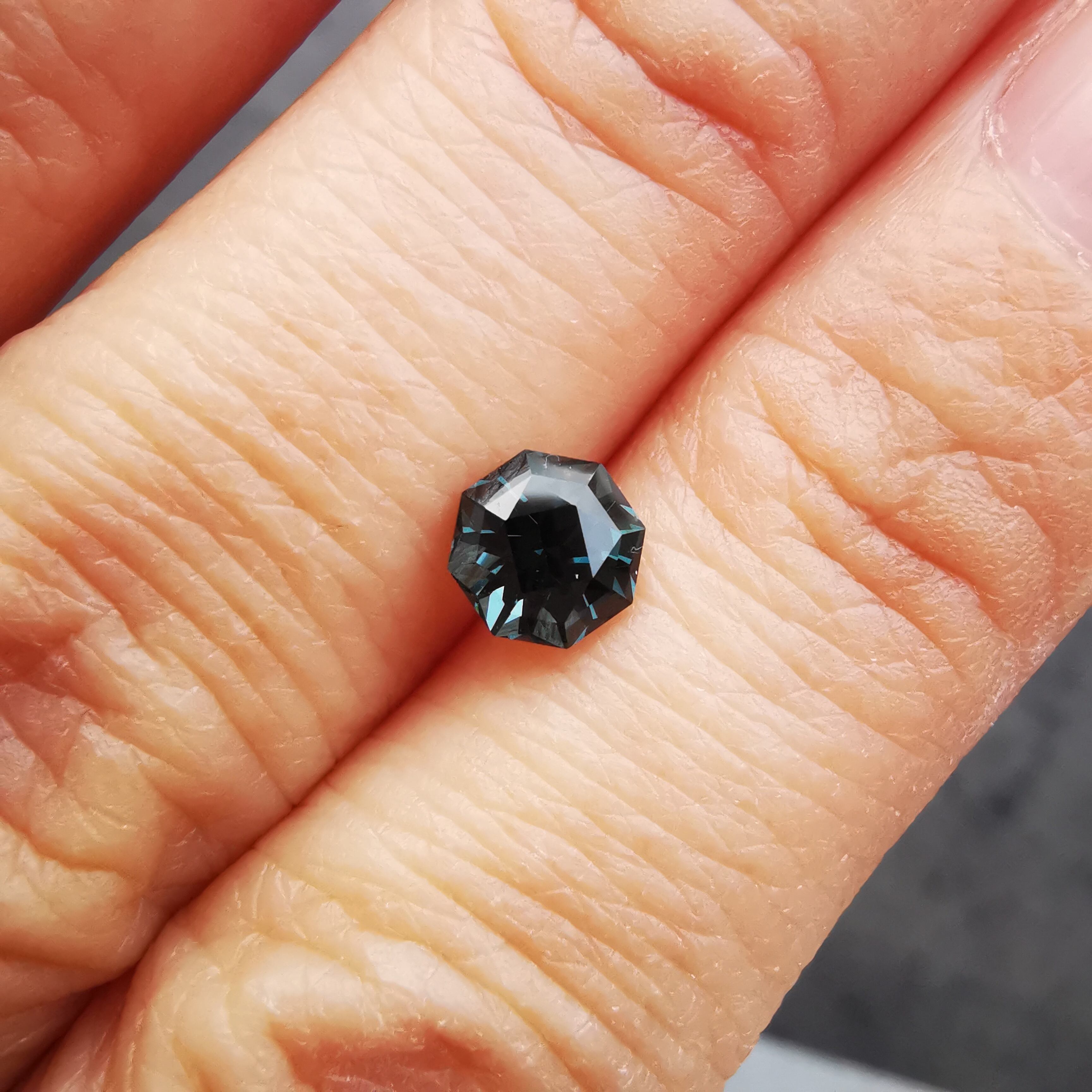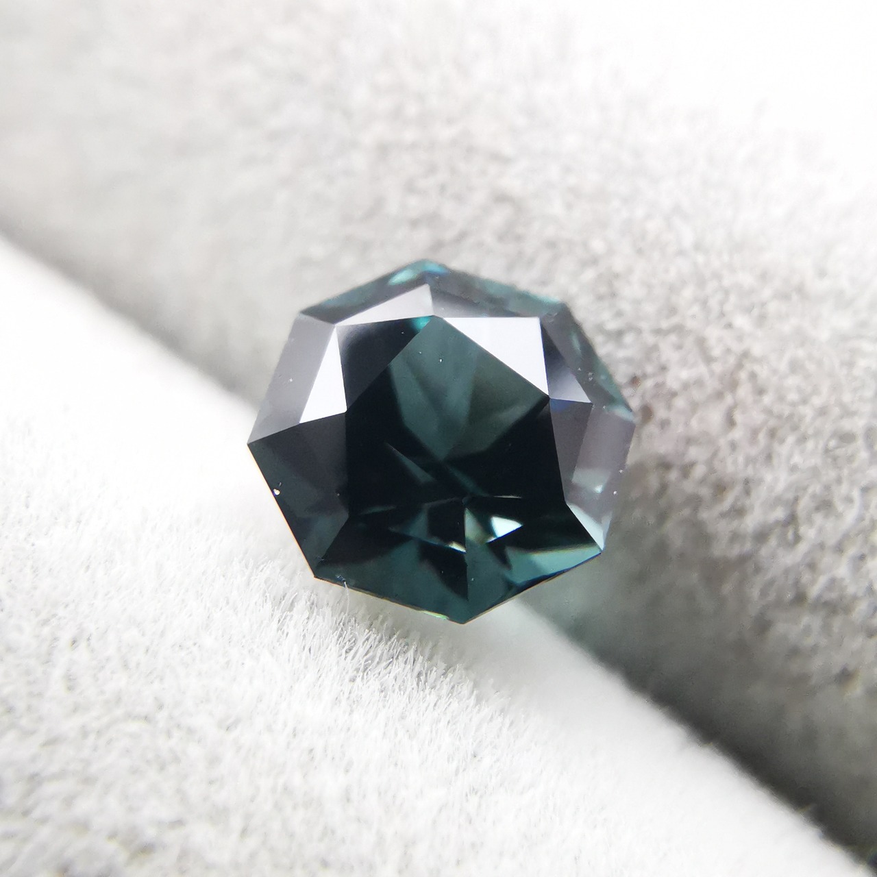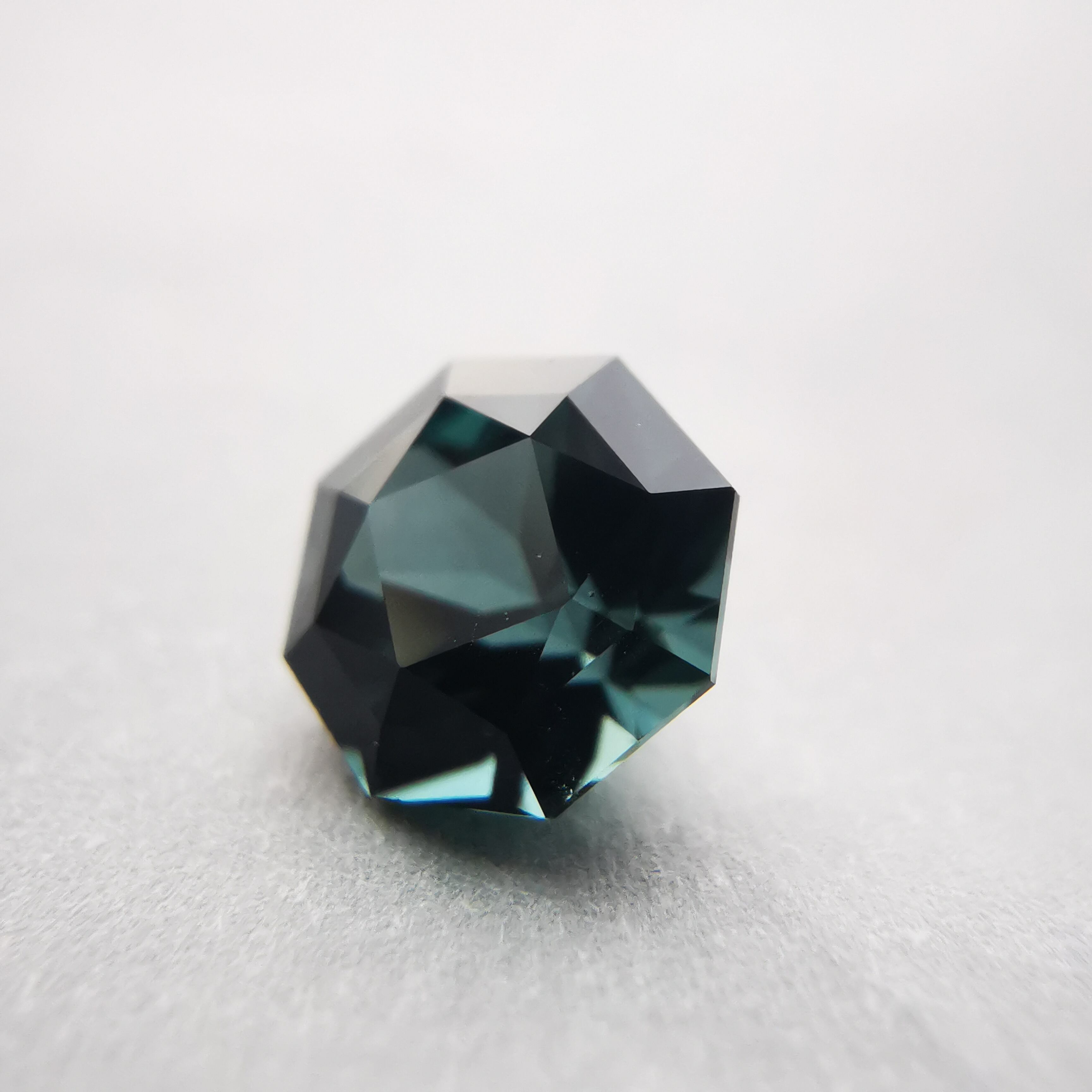 深い森を思わせる暗いフォレストグリーンの中から、ブルーグリーンの光が鋭くきらめく、スピネルらしい一石です。