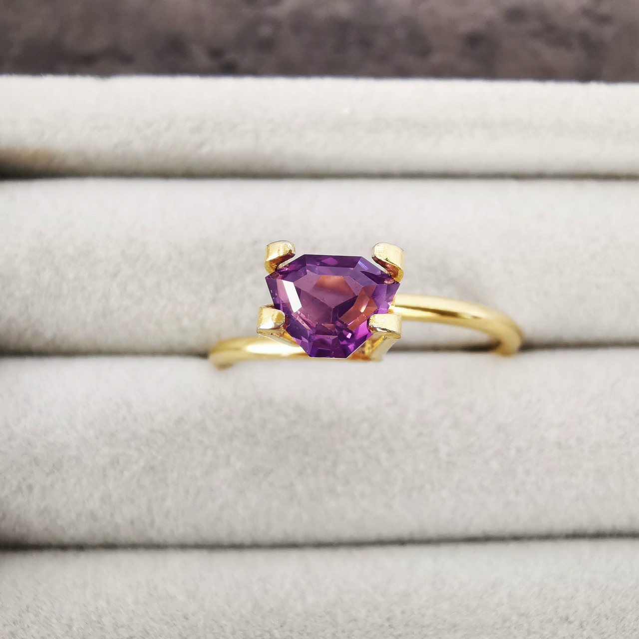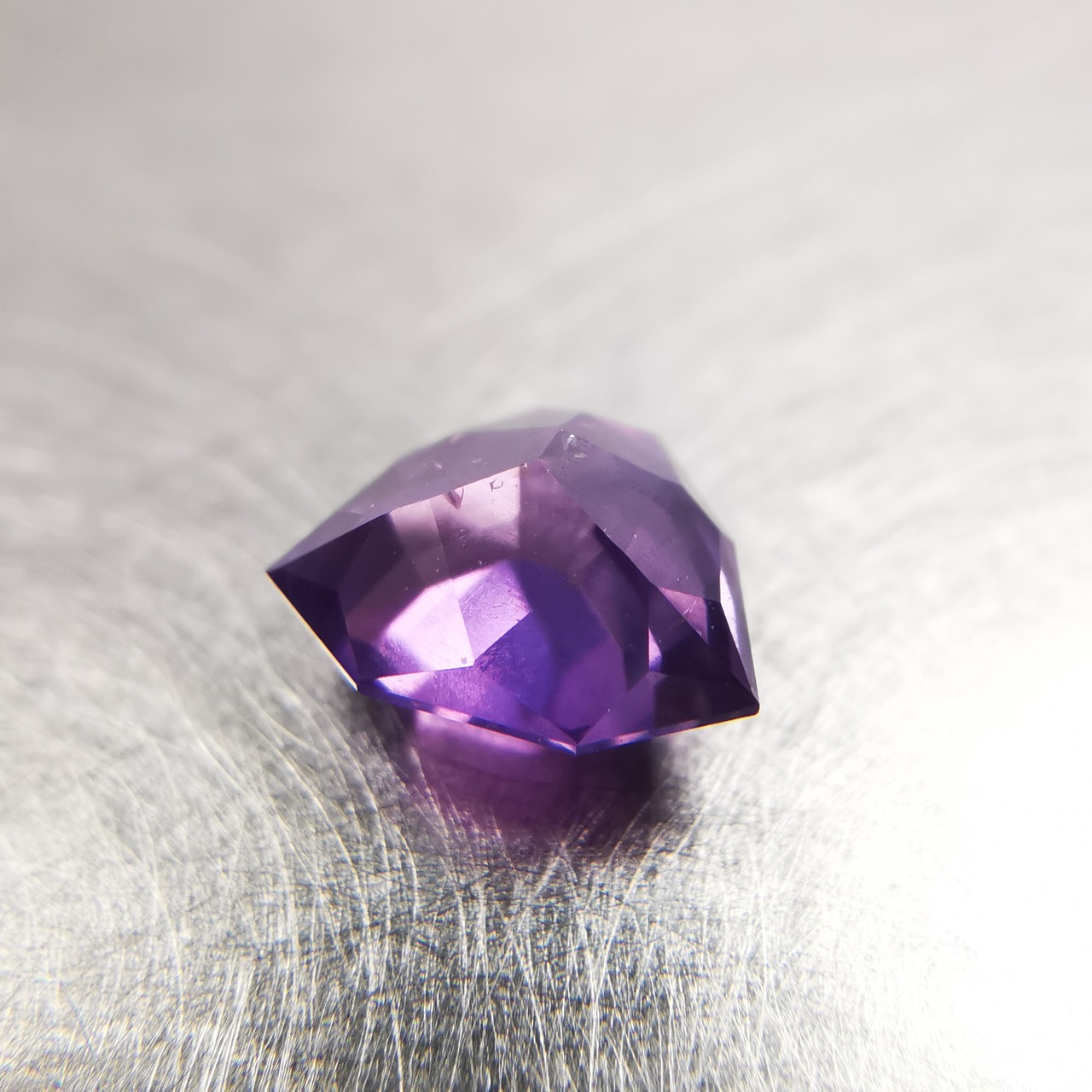 紫系のサファイアは電球で照らすと化けるタイプが多いのですが、もちろんこの石も例外ではなく、パープルピンクのきらめきが妖艶に輝きます。