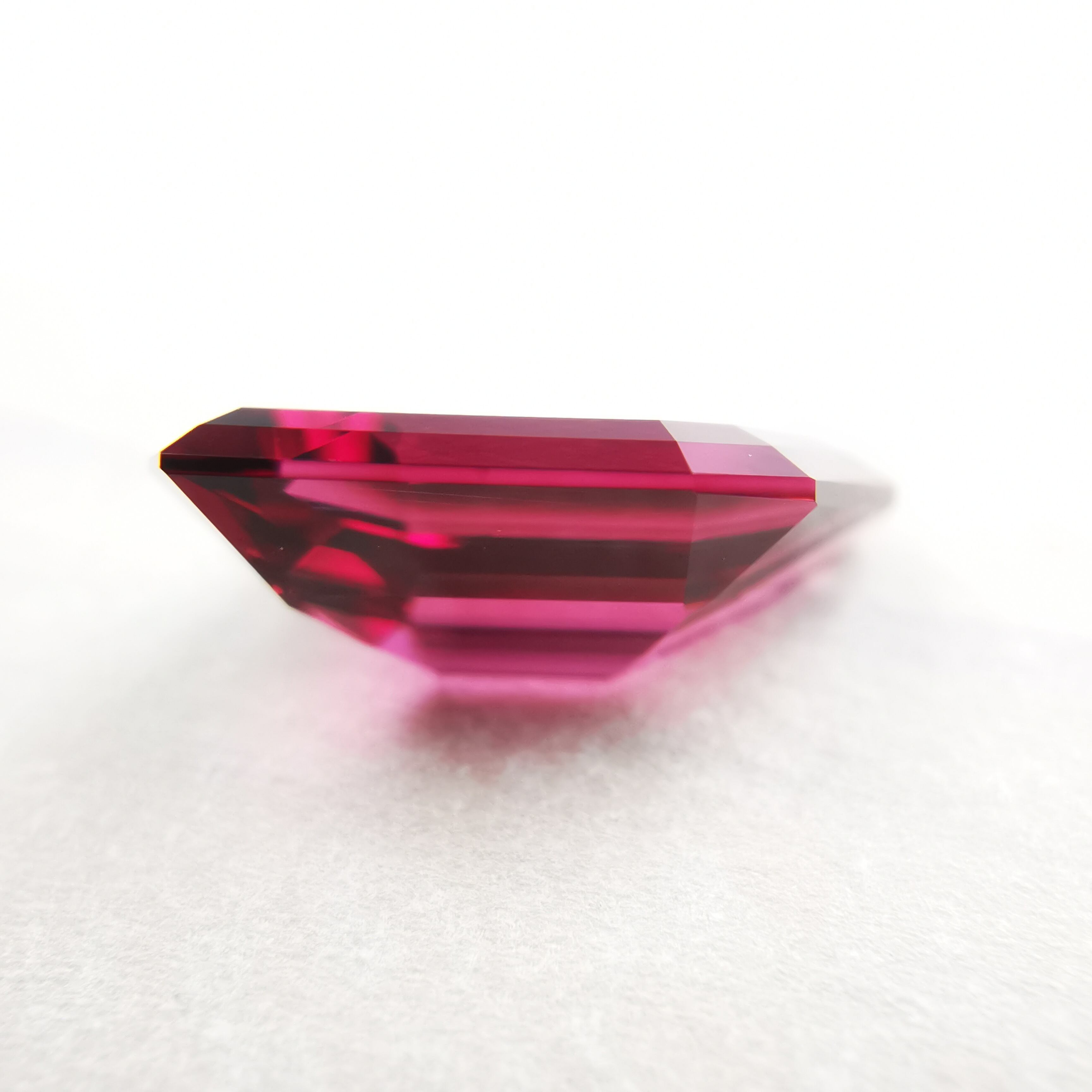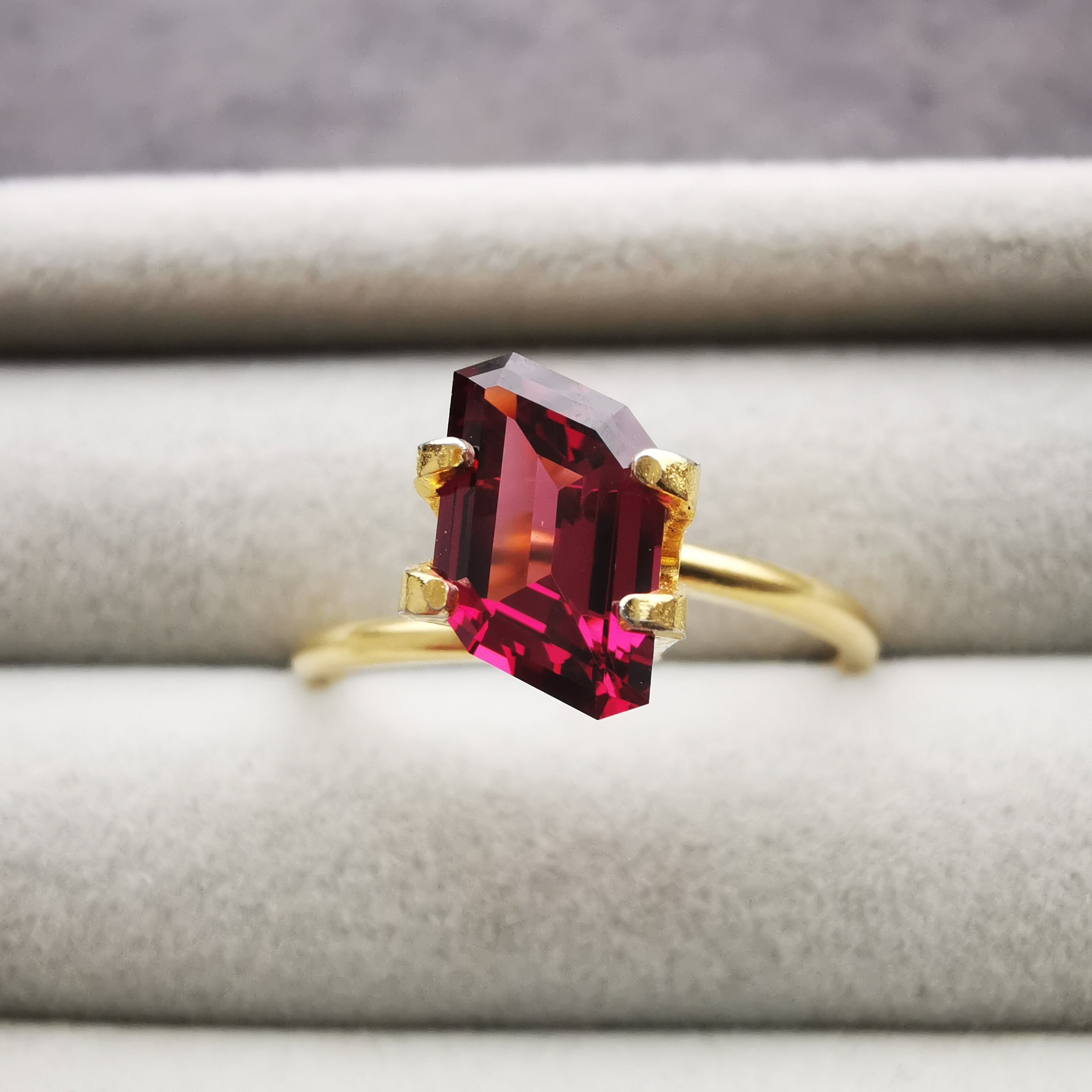 エメラルドカットの、片方の肩をグイッと引っ張ったようなデザイン性の高いカットで、傾けると変則的なきらめきが現れます。
