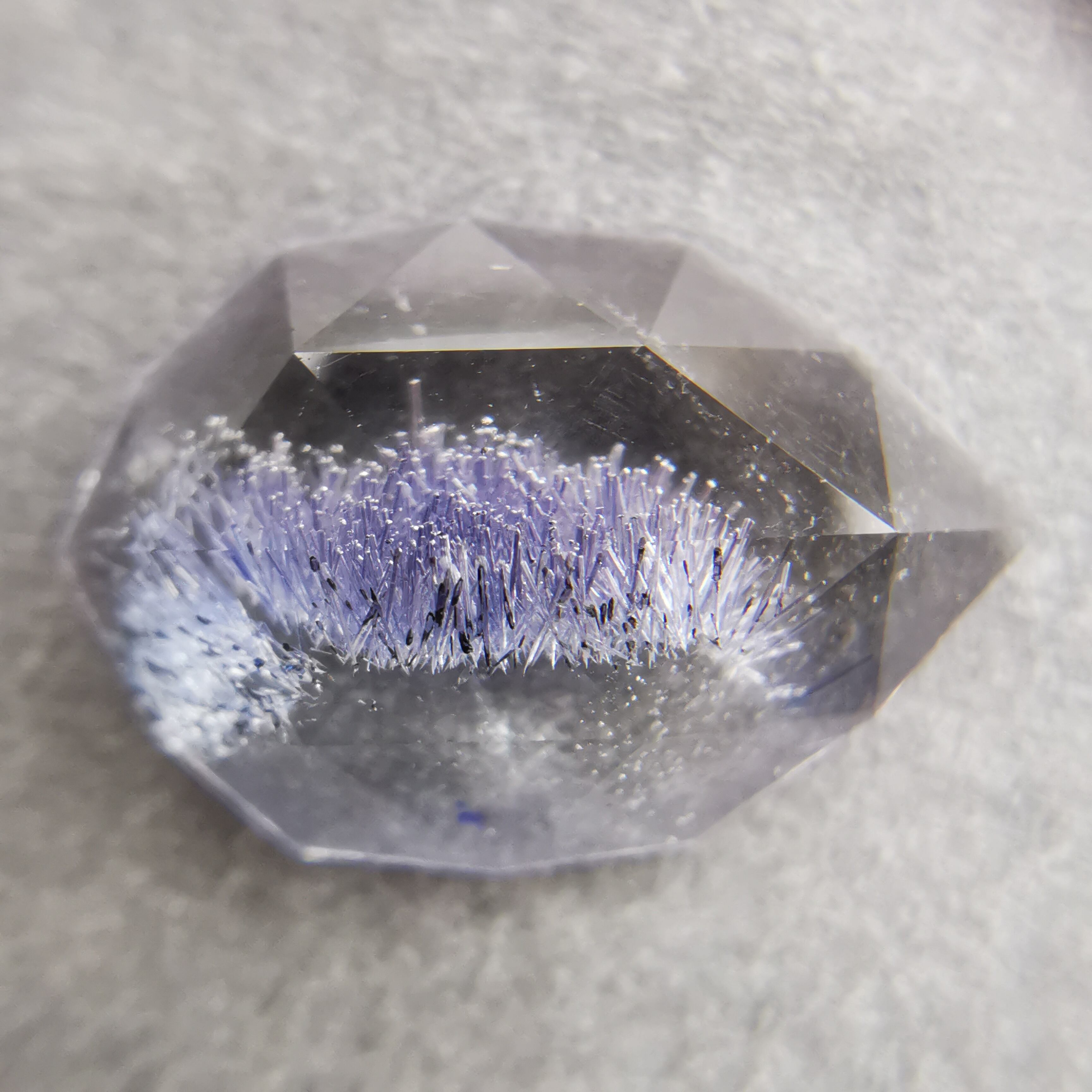 石の中心部に、結晶が横から生えるように入った、デュモルチェライトインクォーツです。