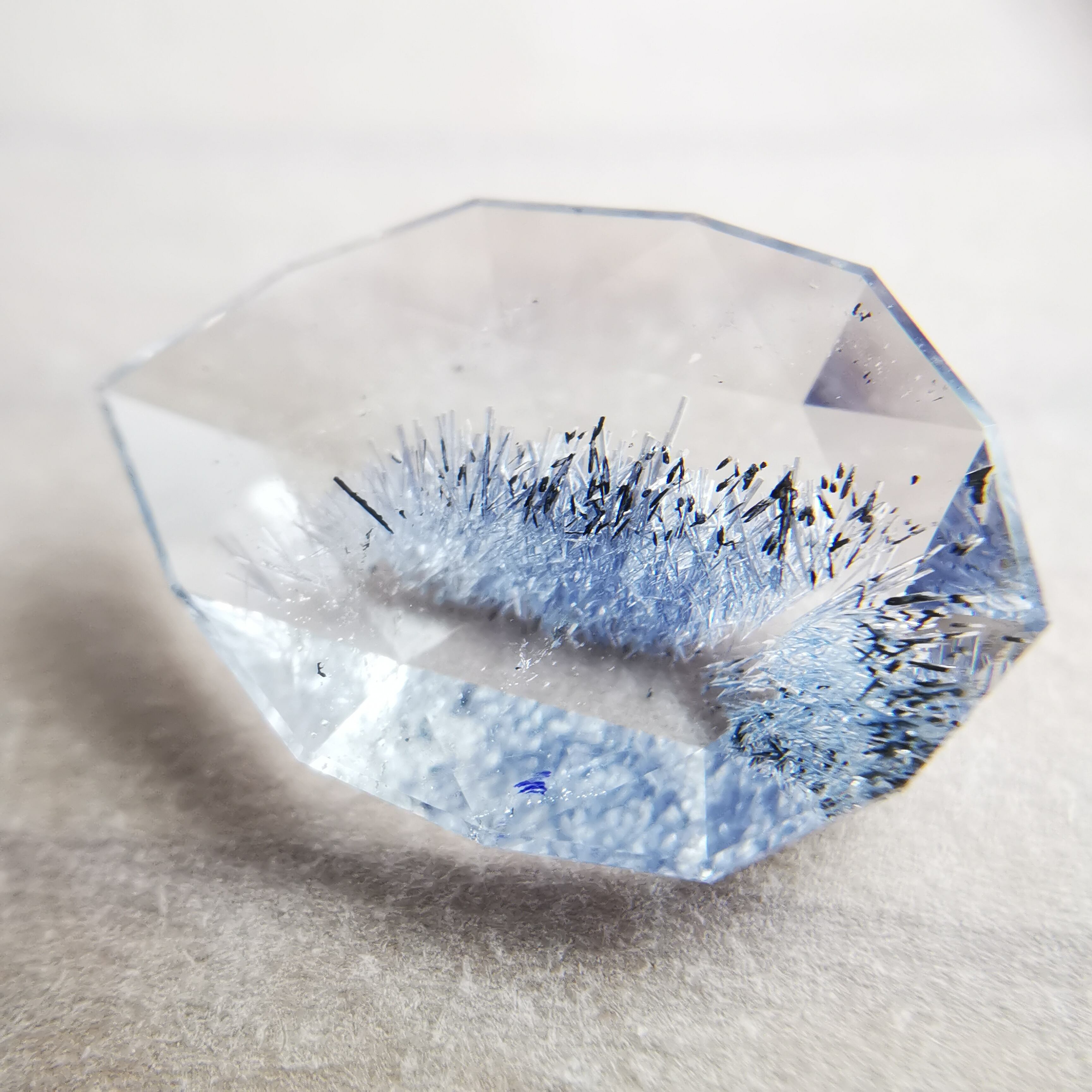 通常、結晶が下から生えるようにカットしますが、結晶根元まですっかり見えるような角度が、とても不思議で新鮮です。