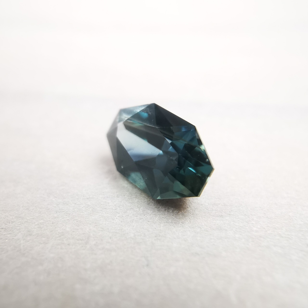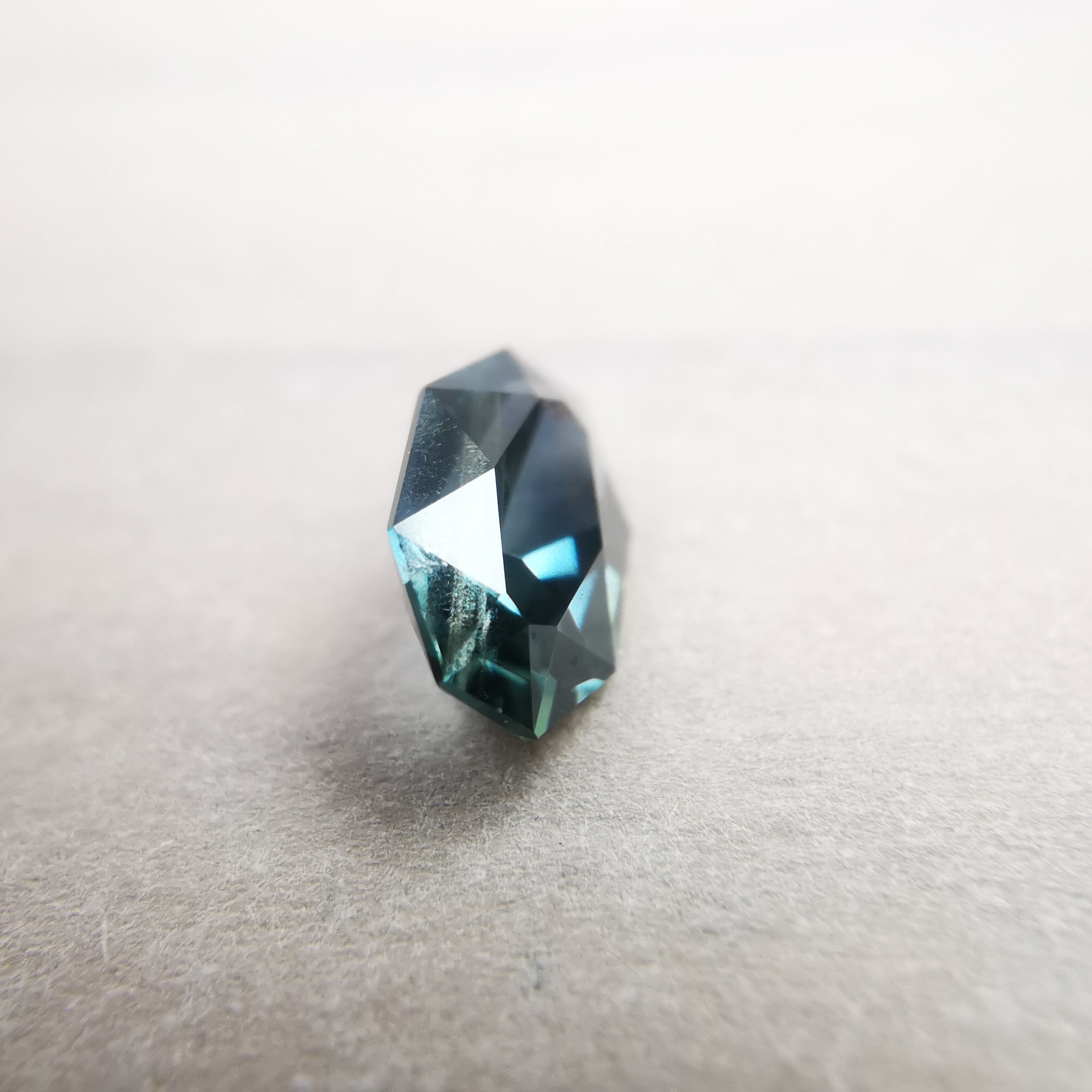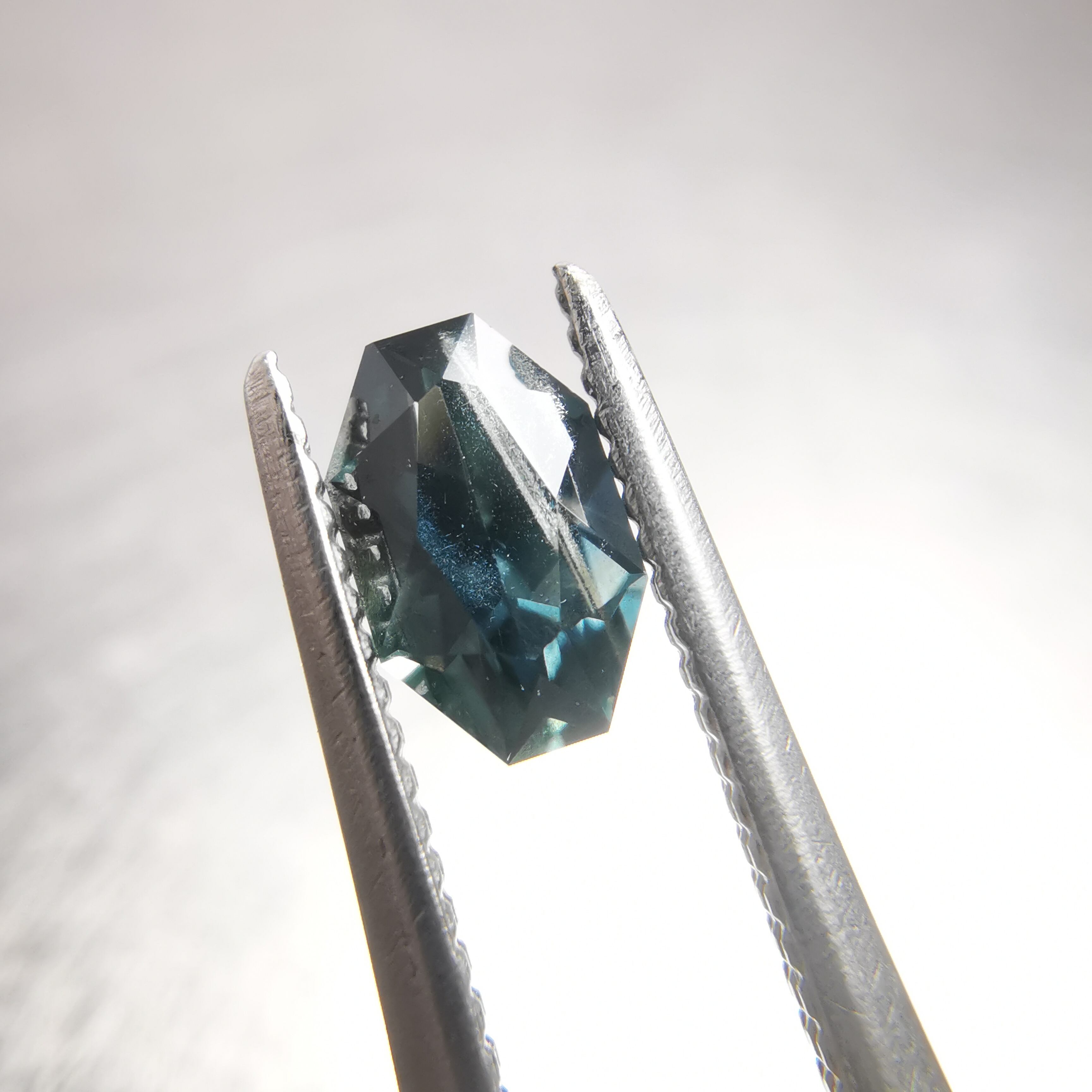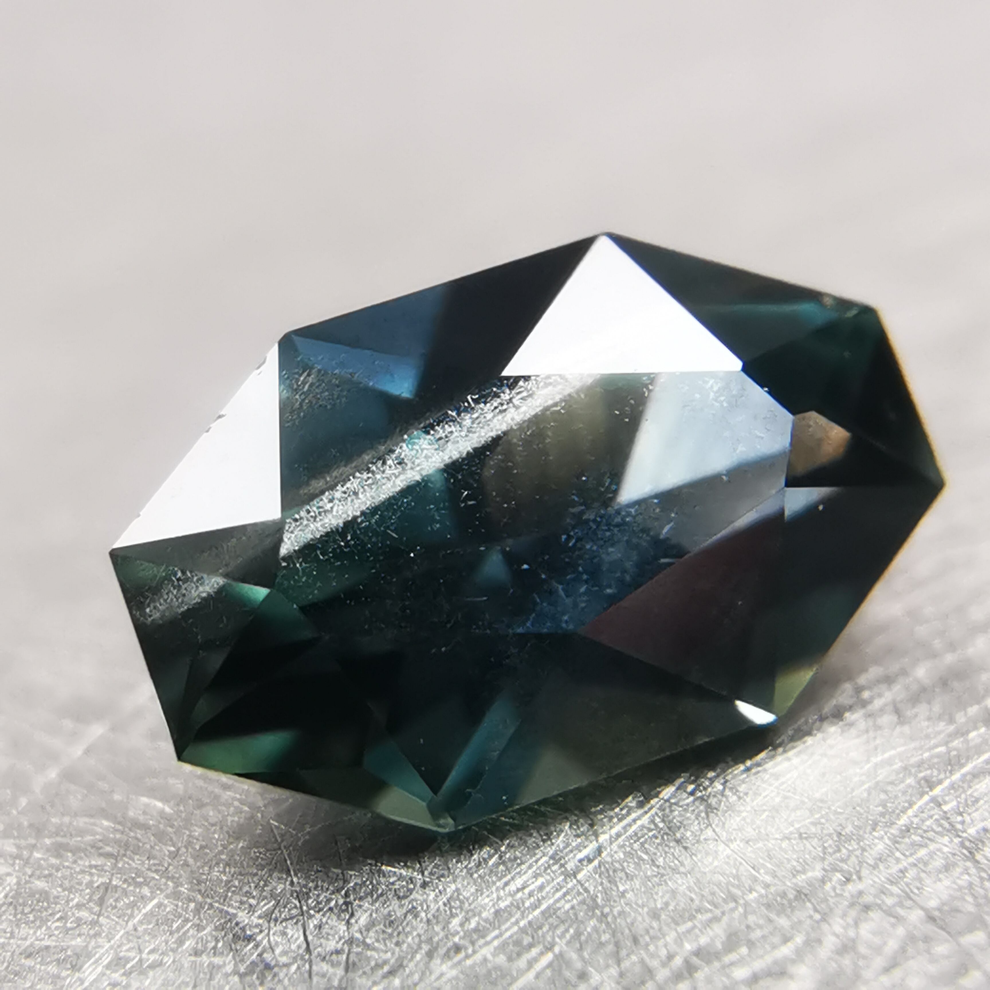 暗く深いブルーグリーンから、ハッとするようなスカイブルーがきらめくサファイアです。