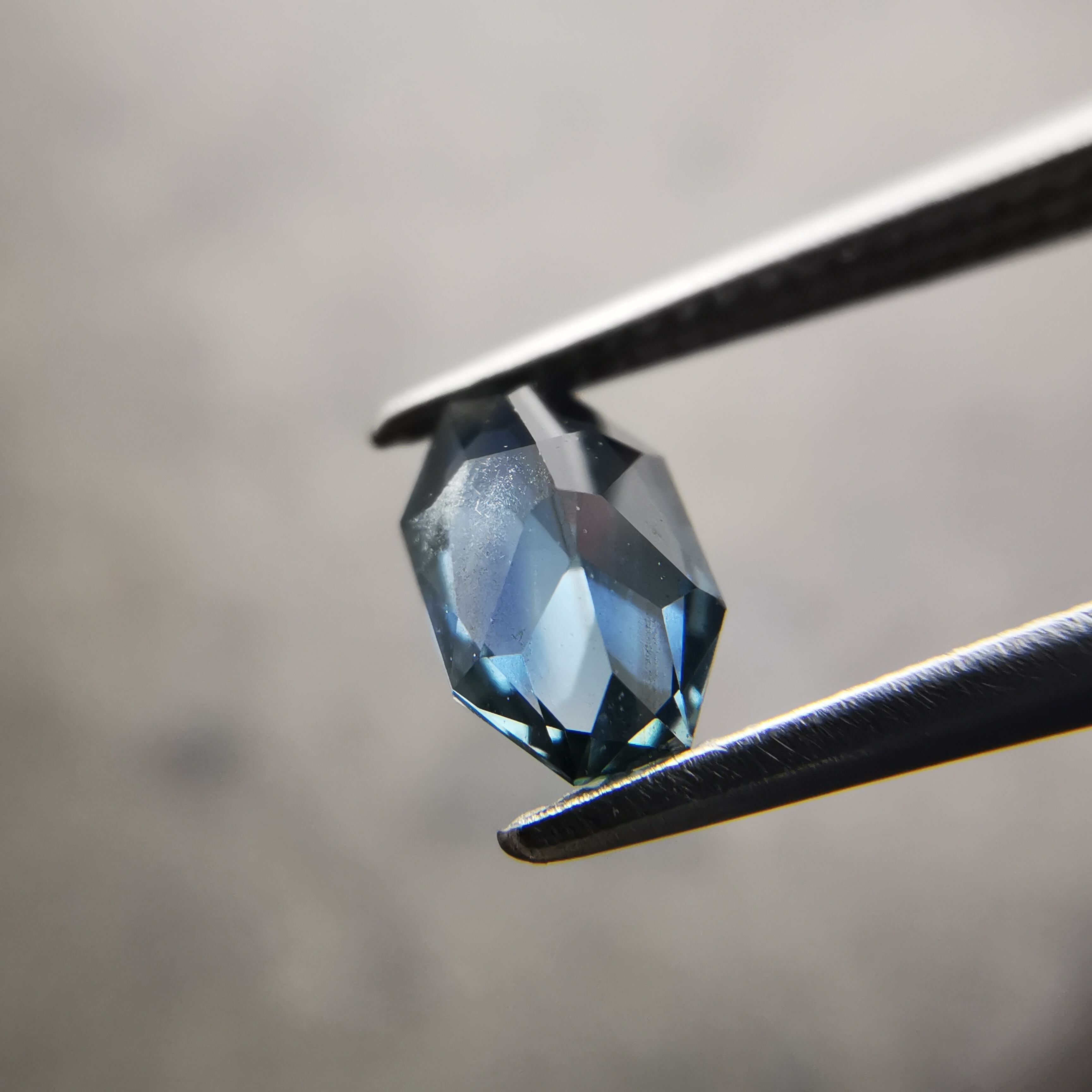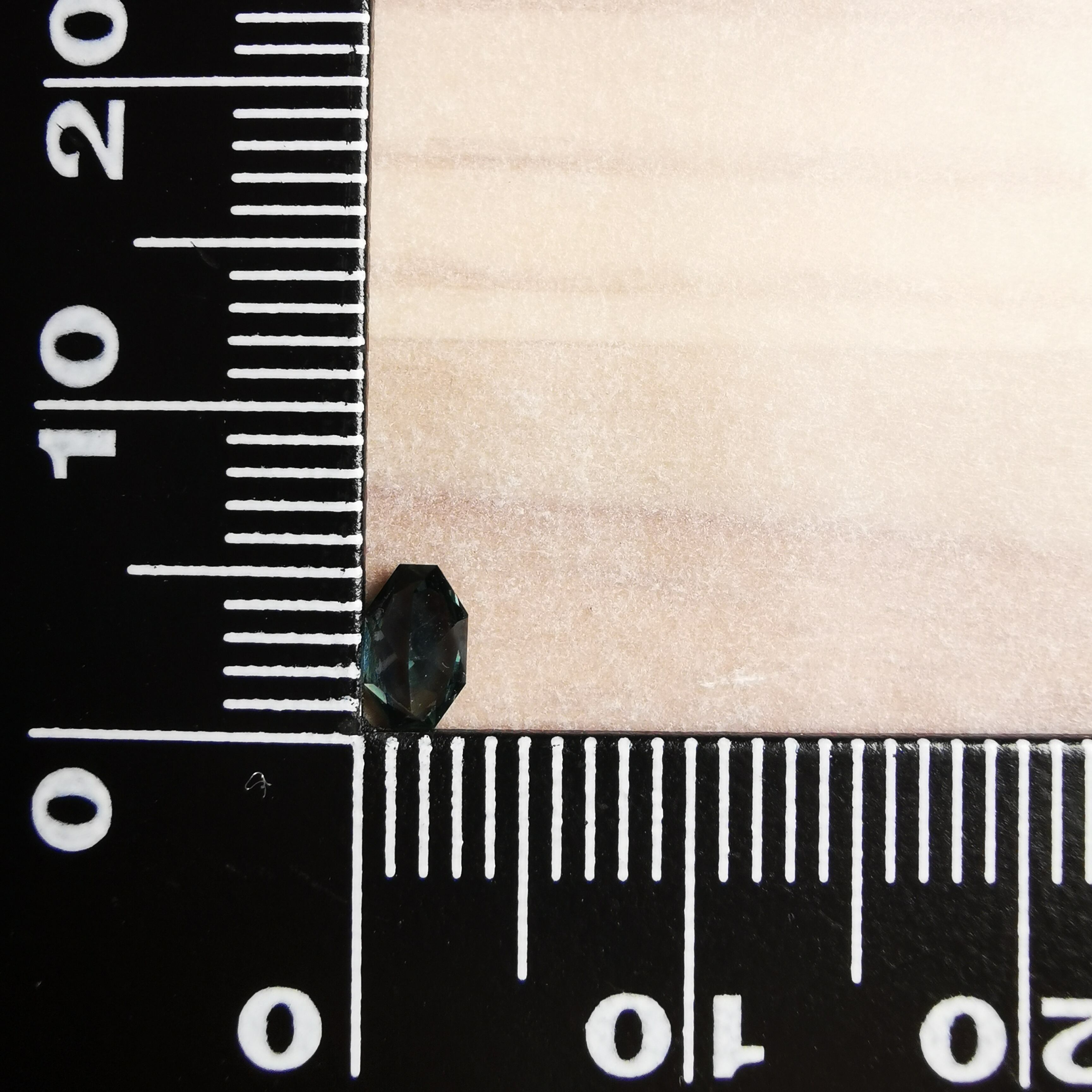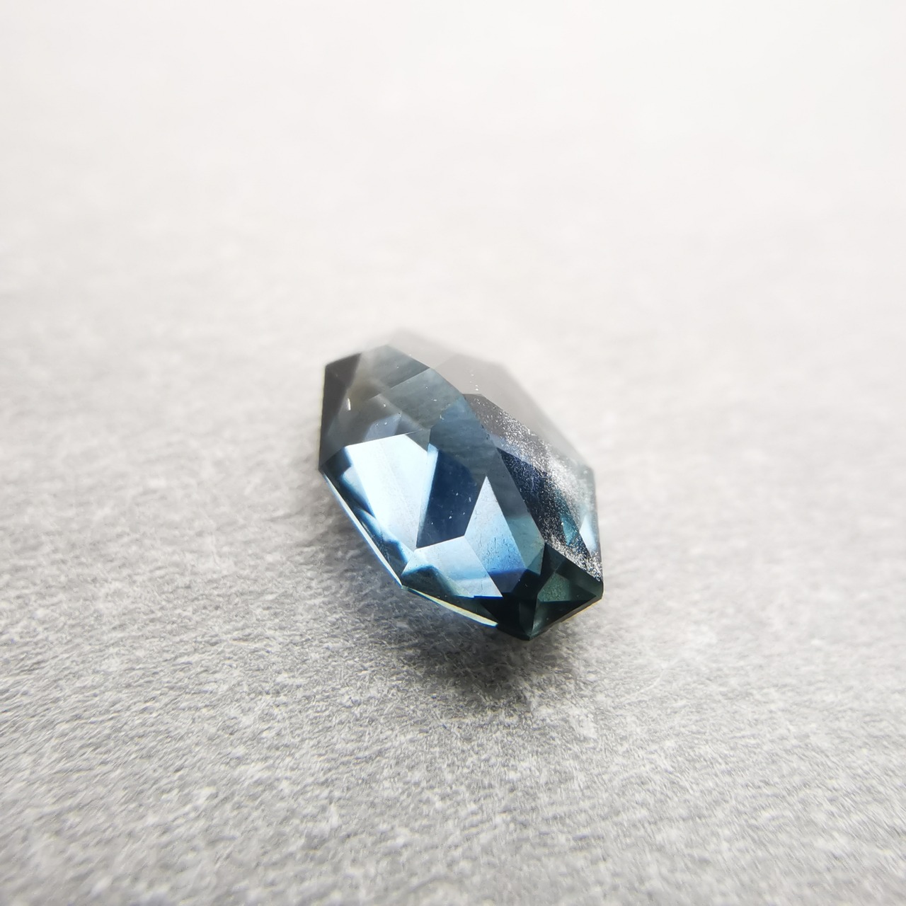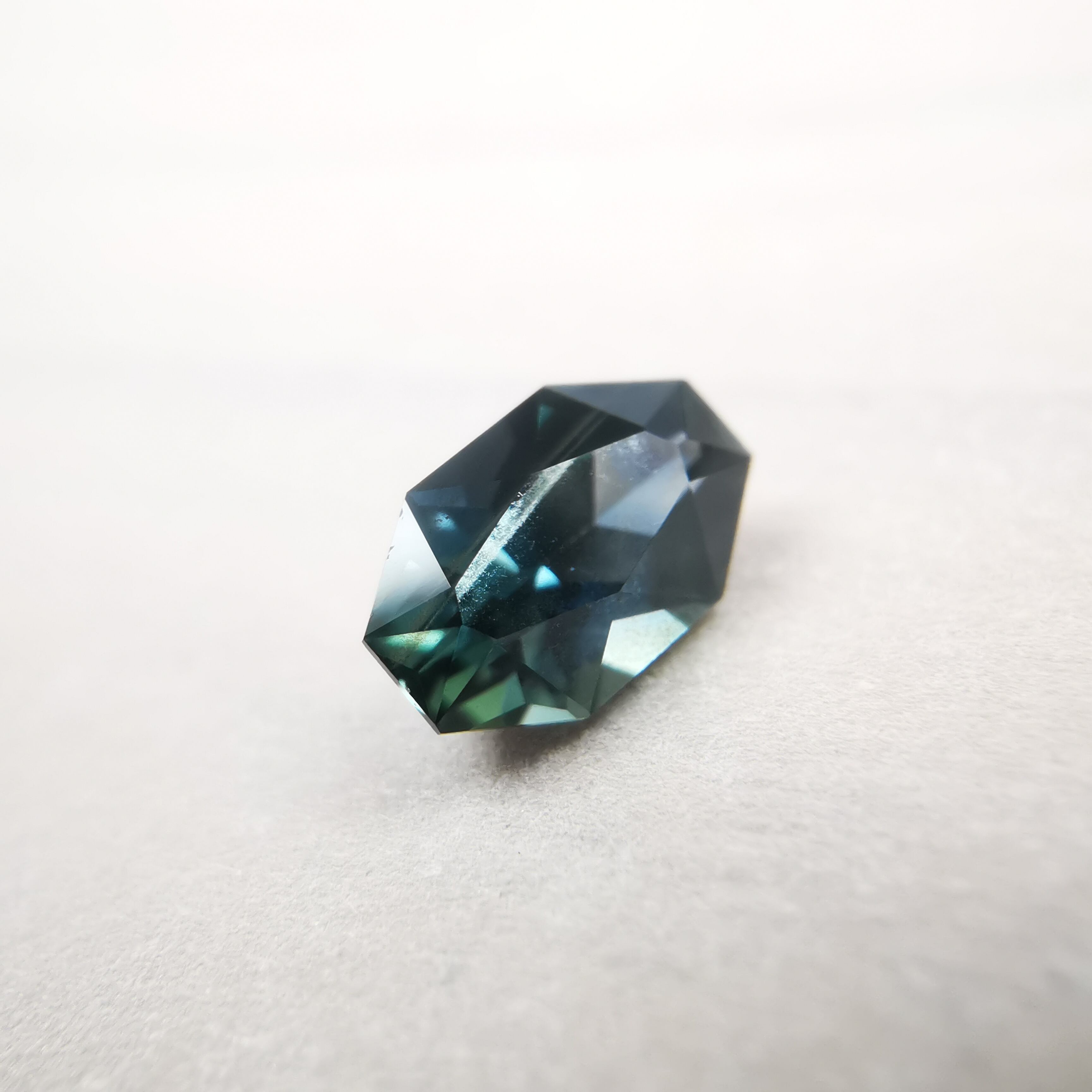暗く深いブルーグリーンから、ハッとするようなスカイブルーがきらめくサファイアです。
