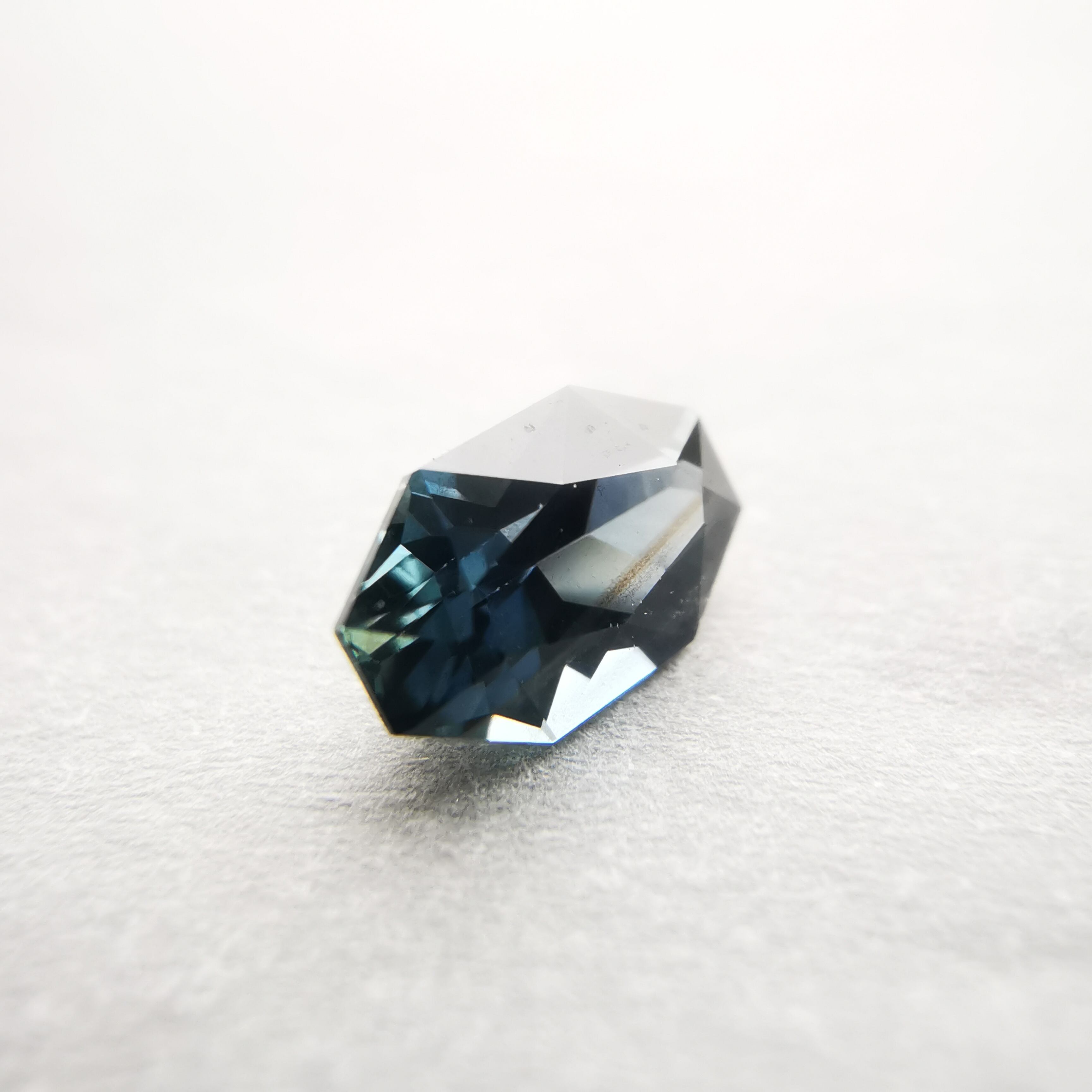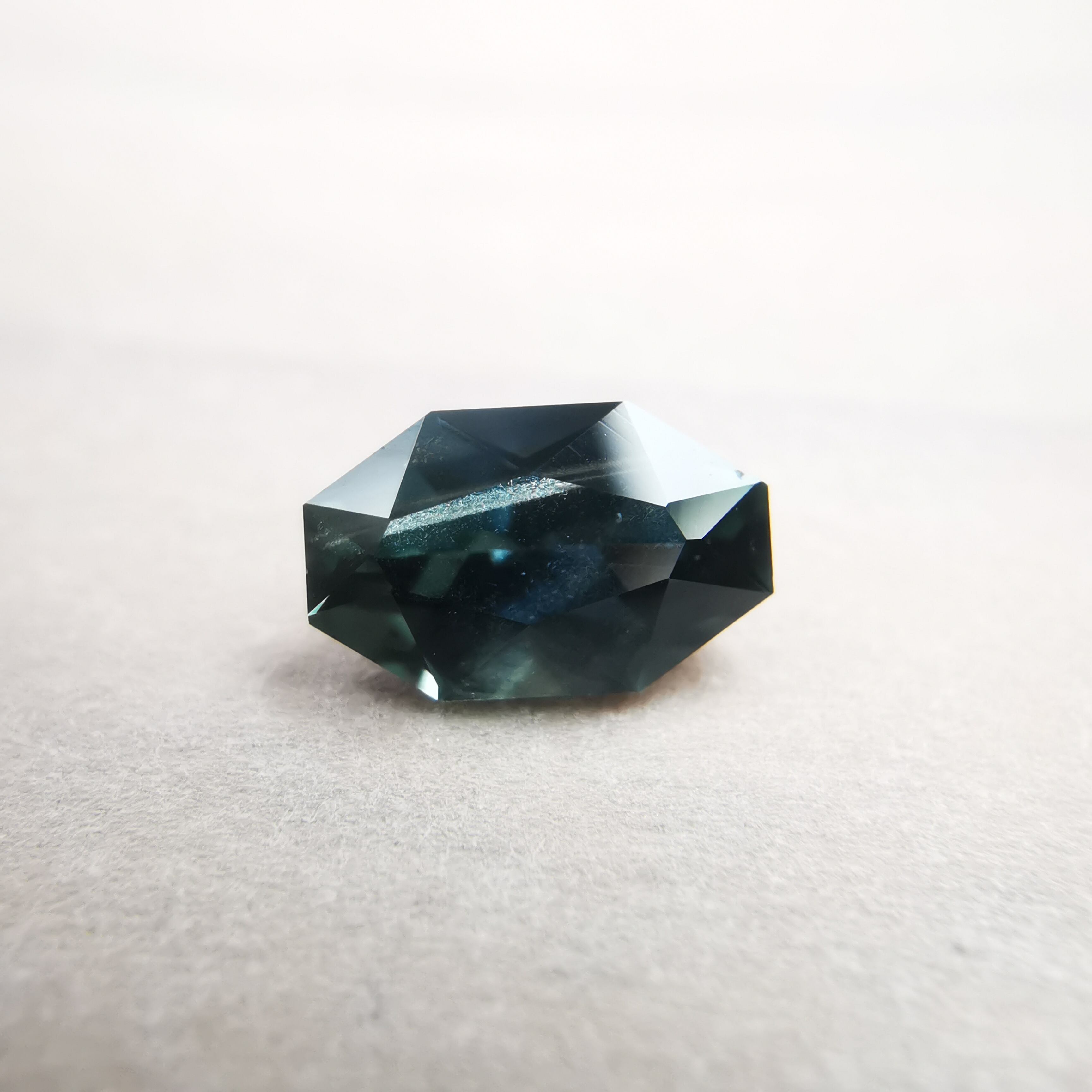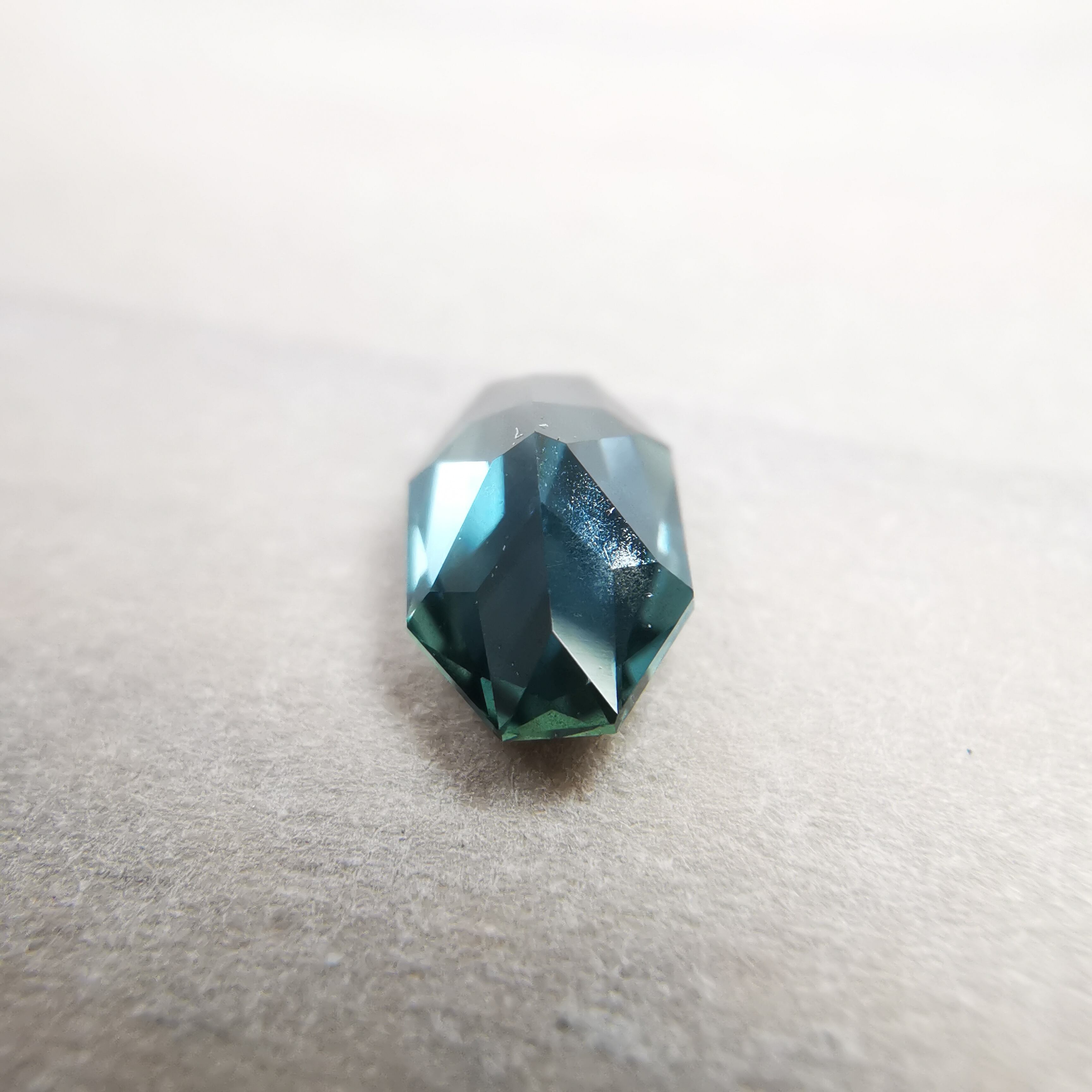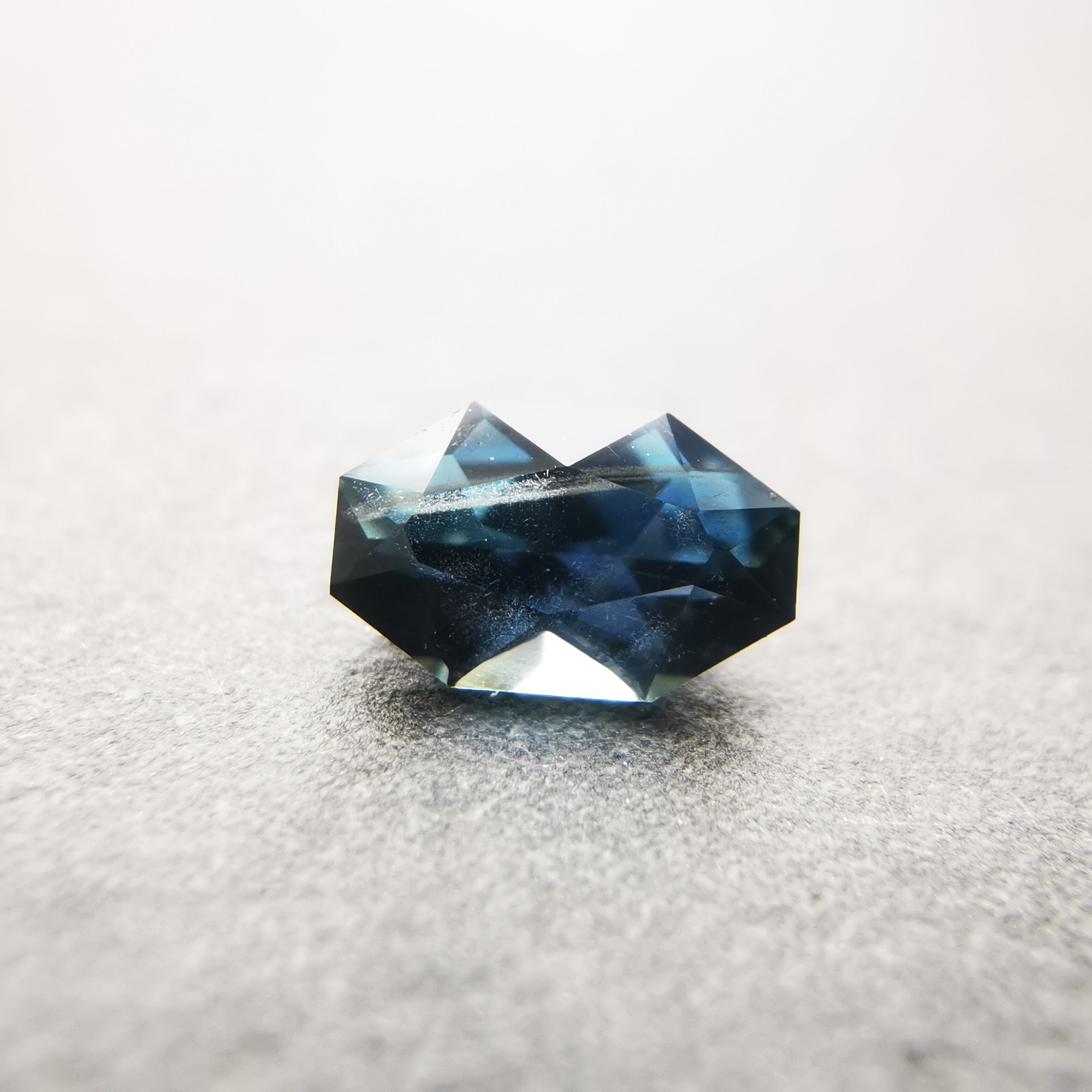 暗く深いブルーグリーンから、ハッとするようなスカイブルーがきらめくサファイアです。