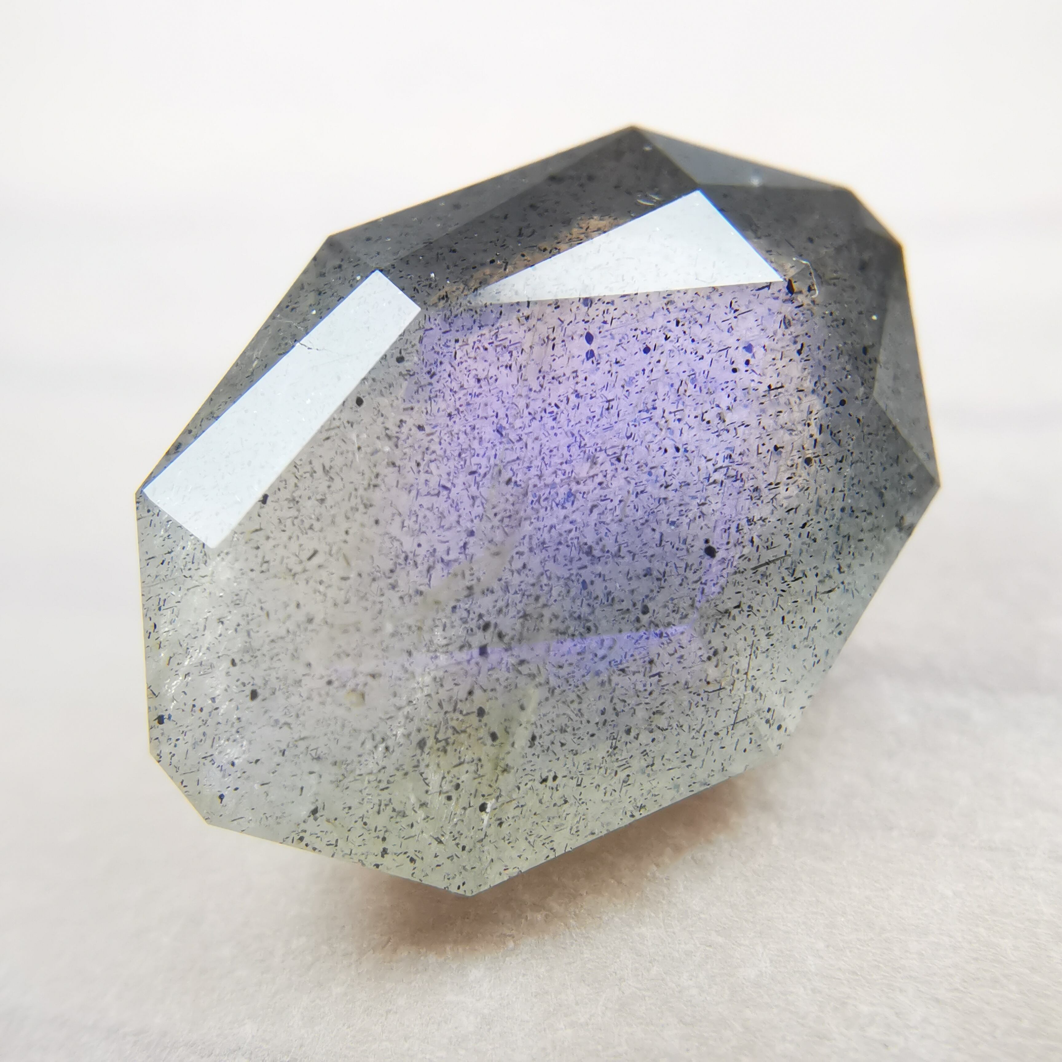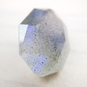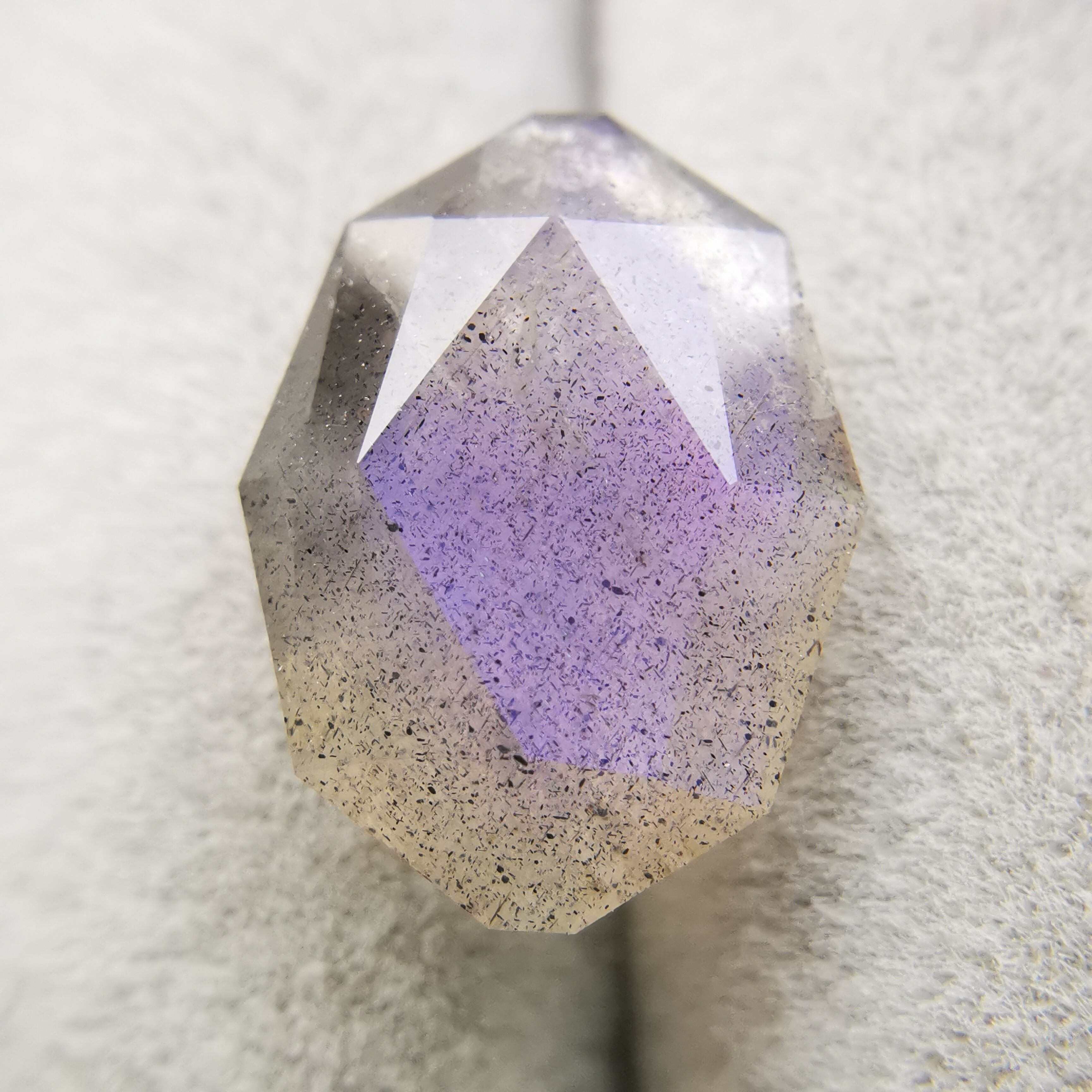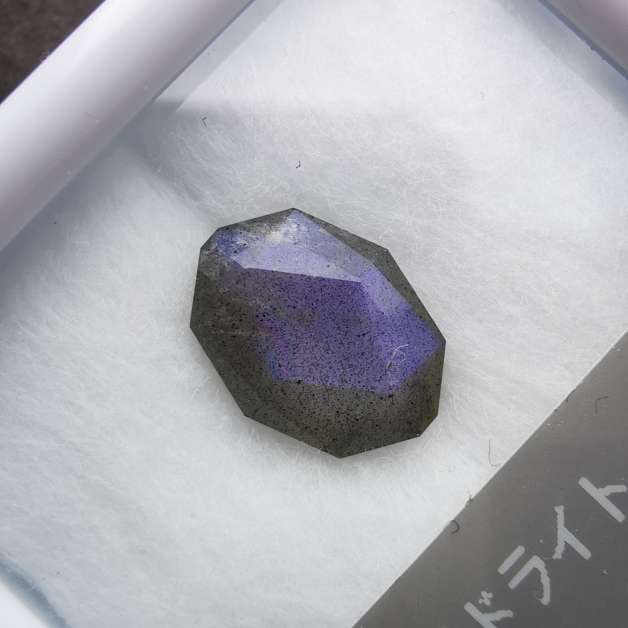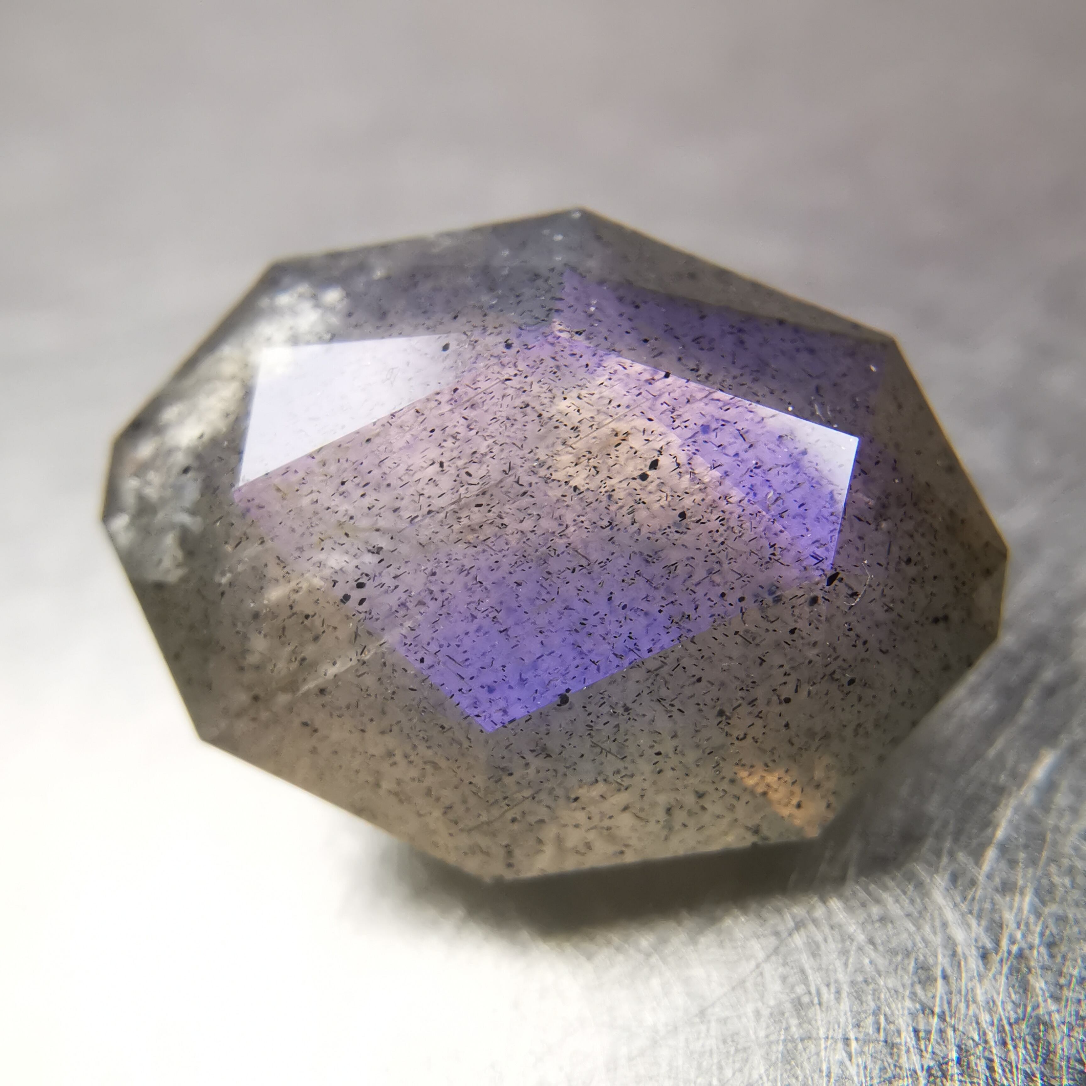 半透明なグレーの石の表面に現れるラブラドレッセンスはブルー寄りのパープルです。