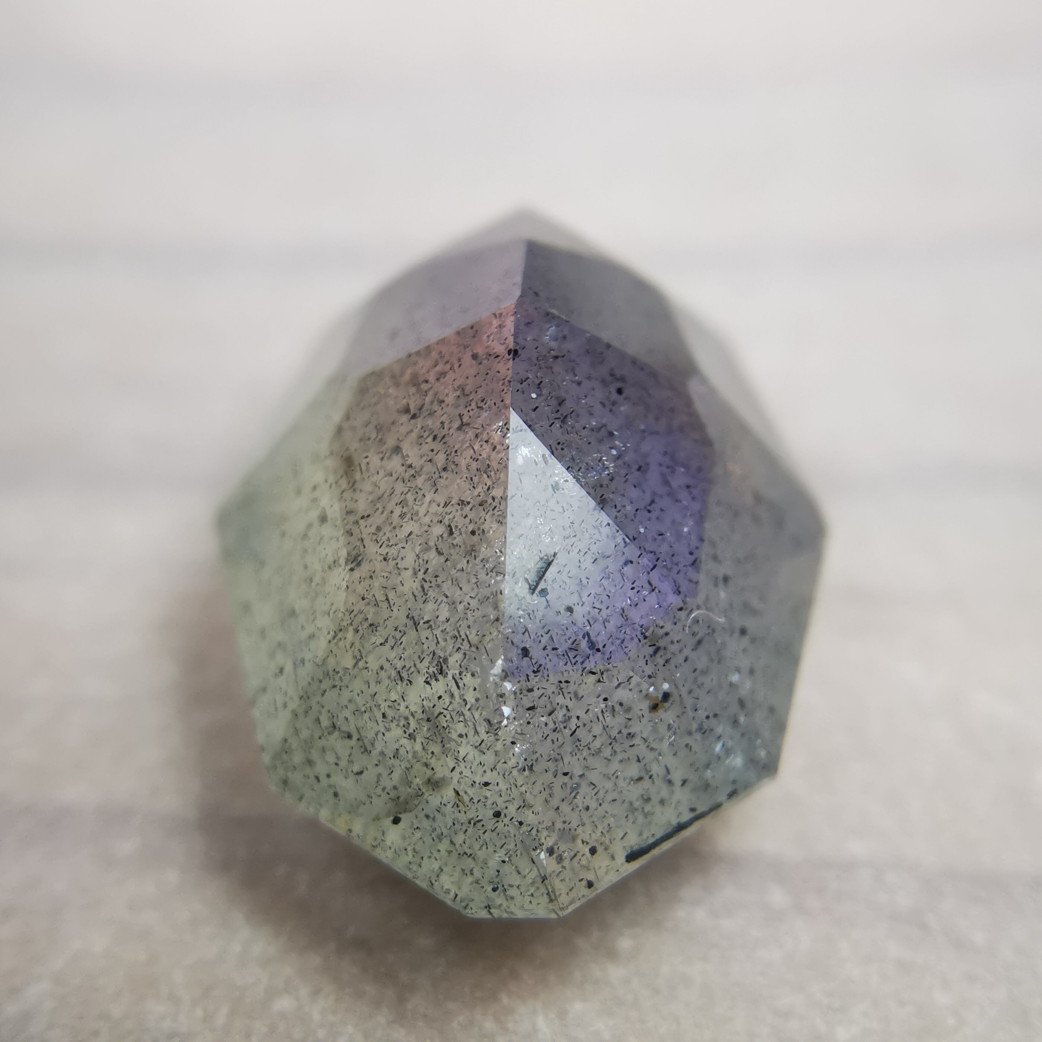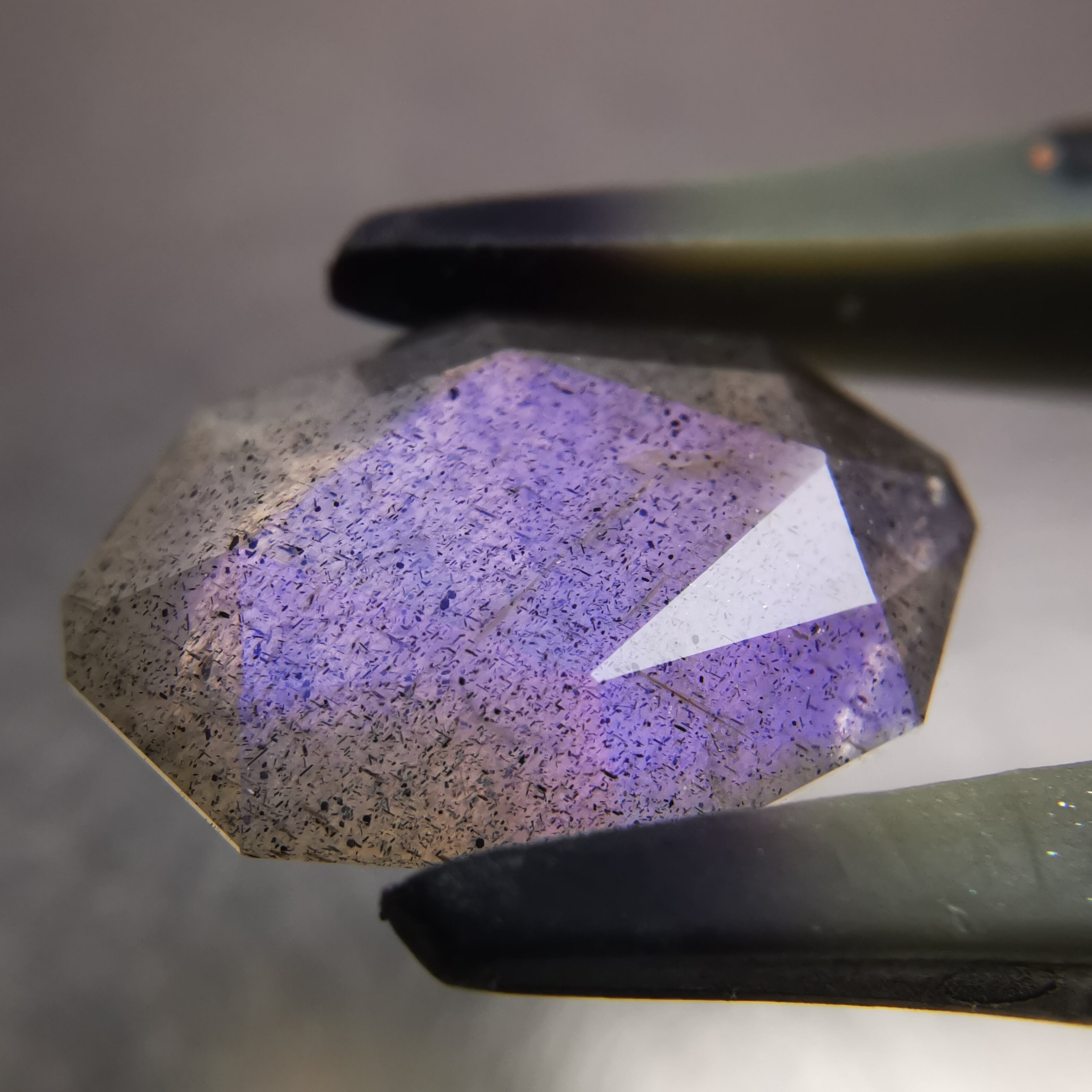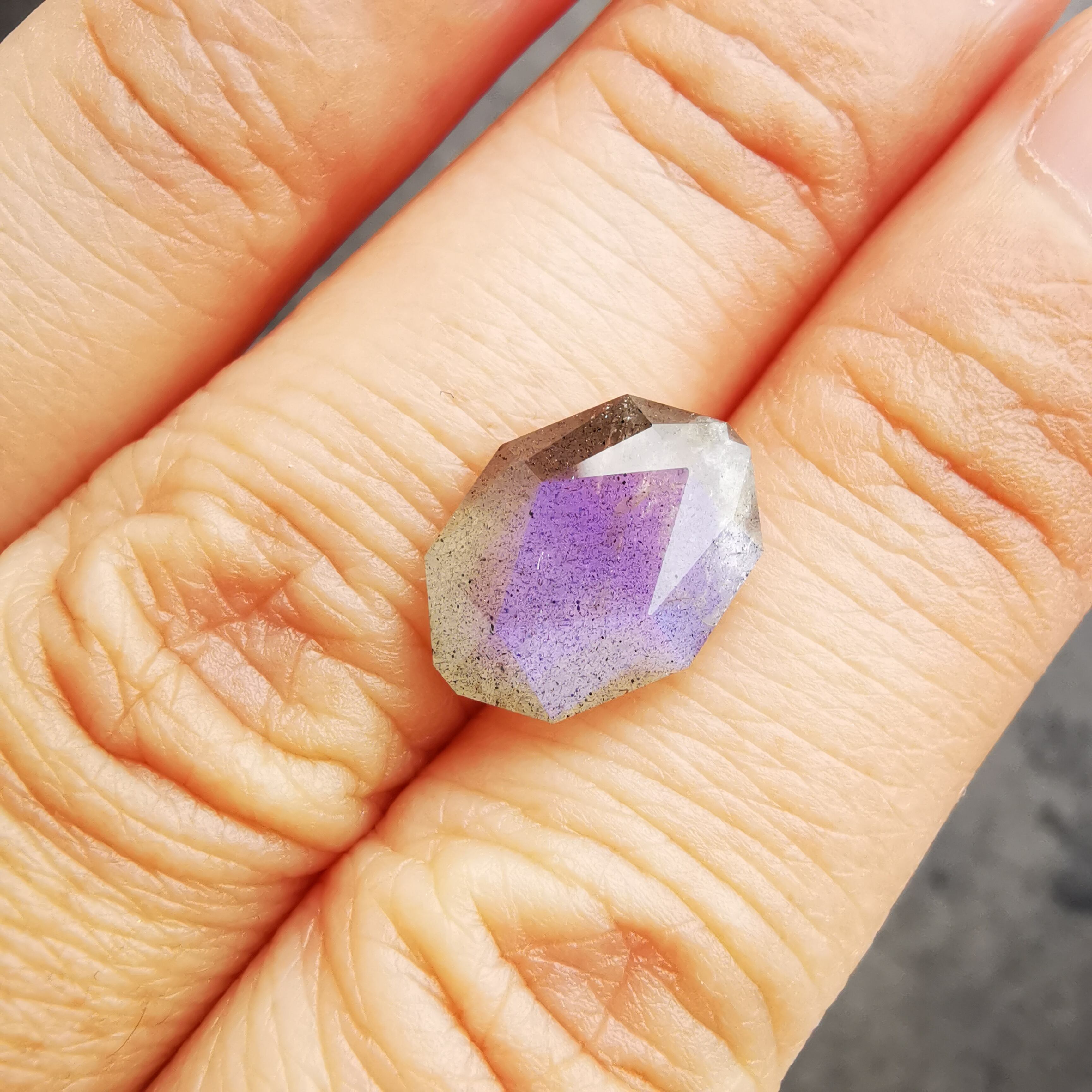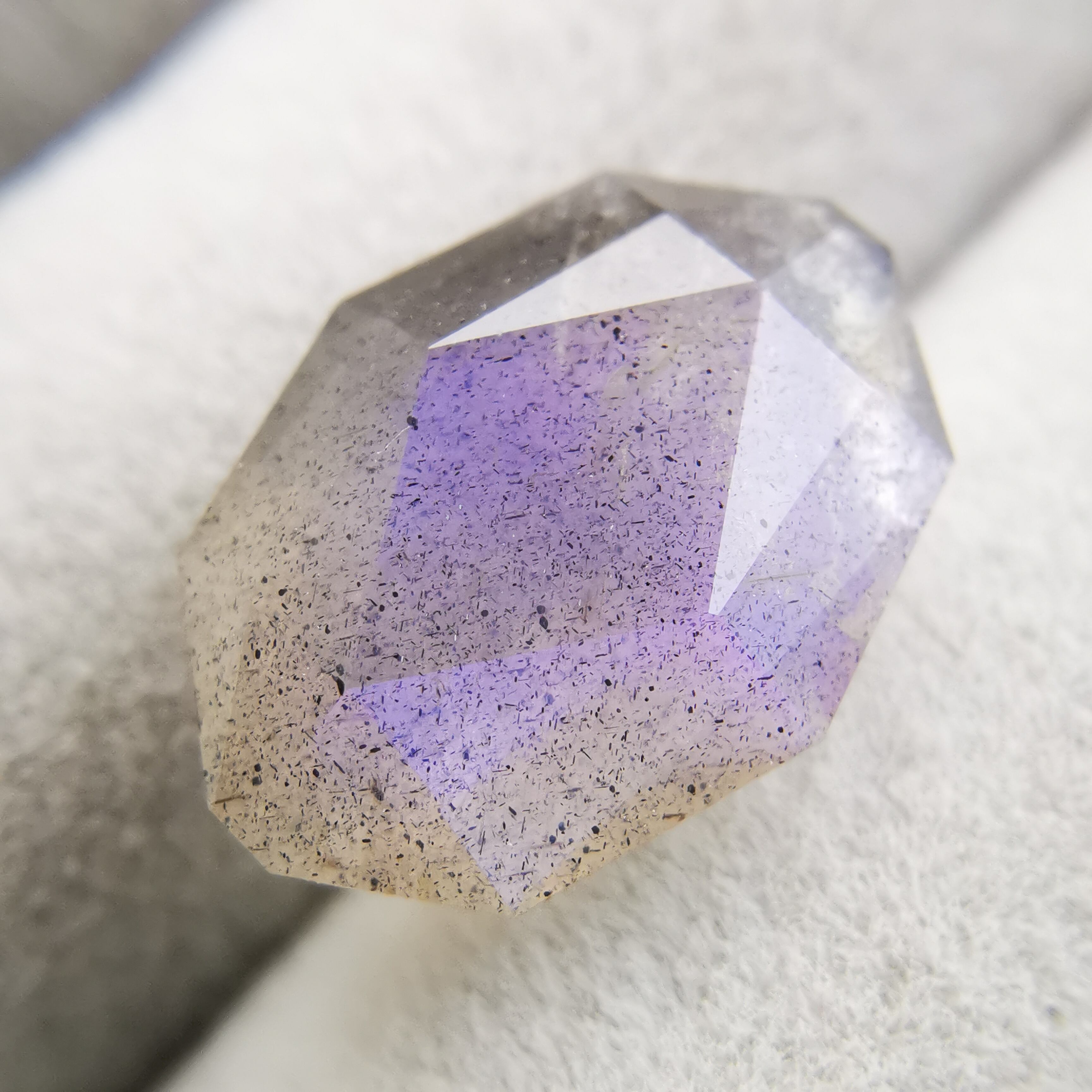 半透明なグレーの石の表面に現れるラブラドレッセンスはブルー寄りのパープルです。