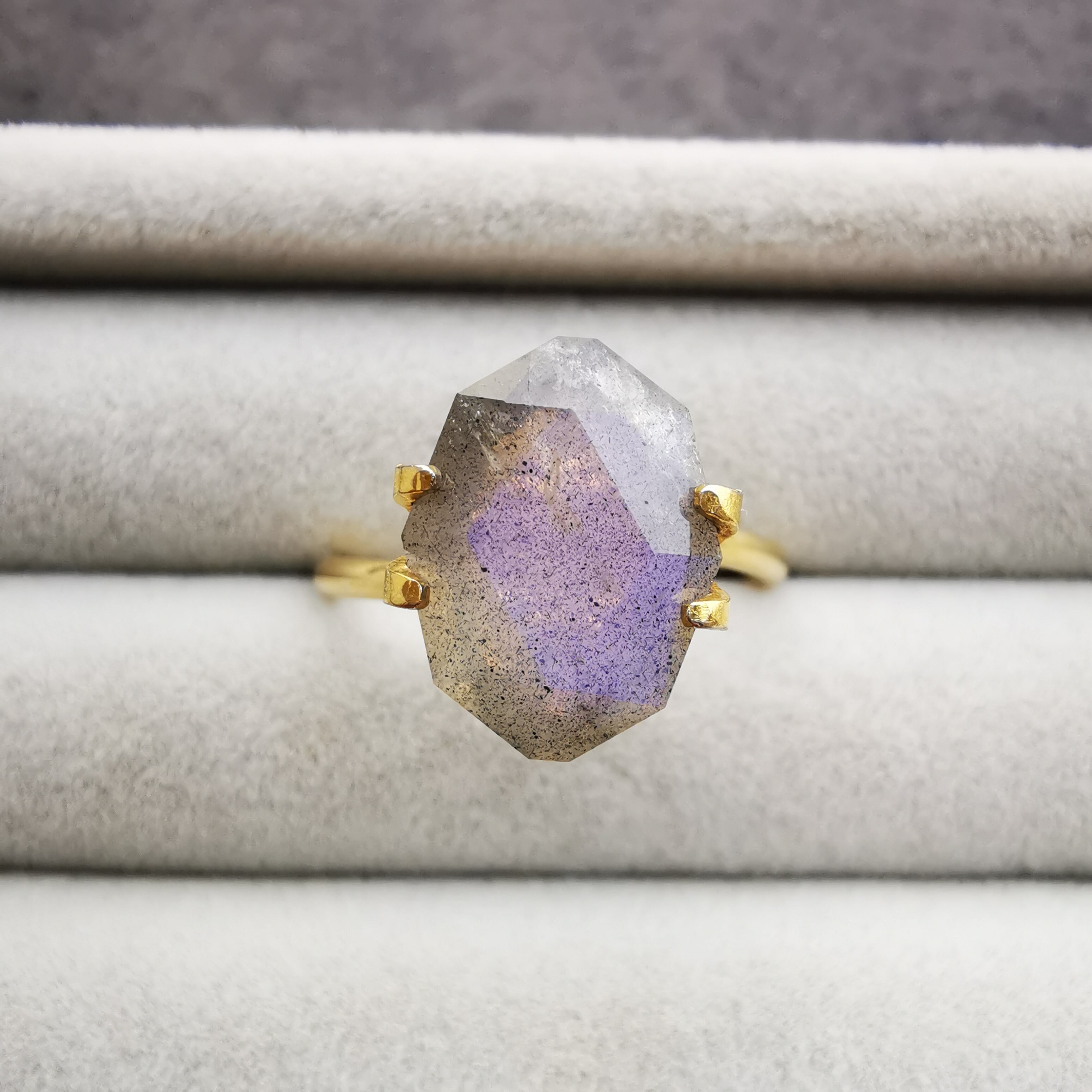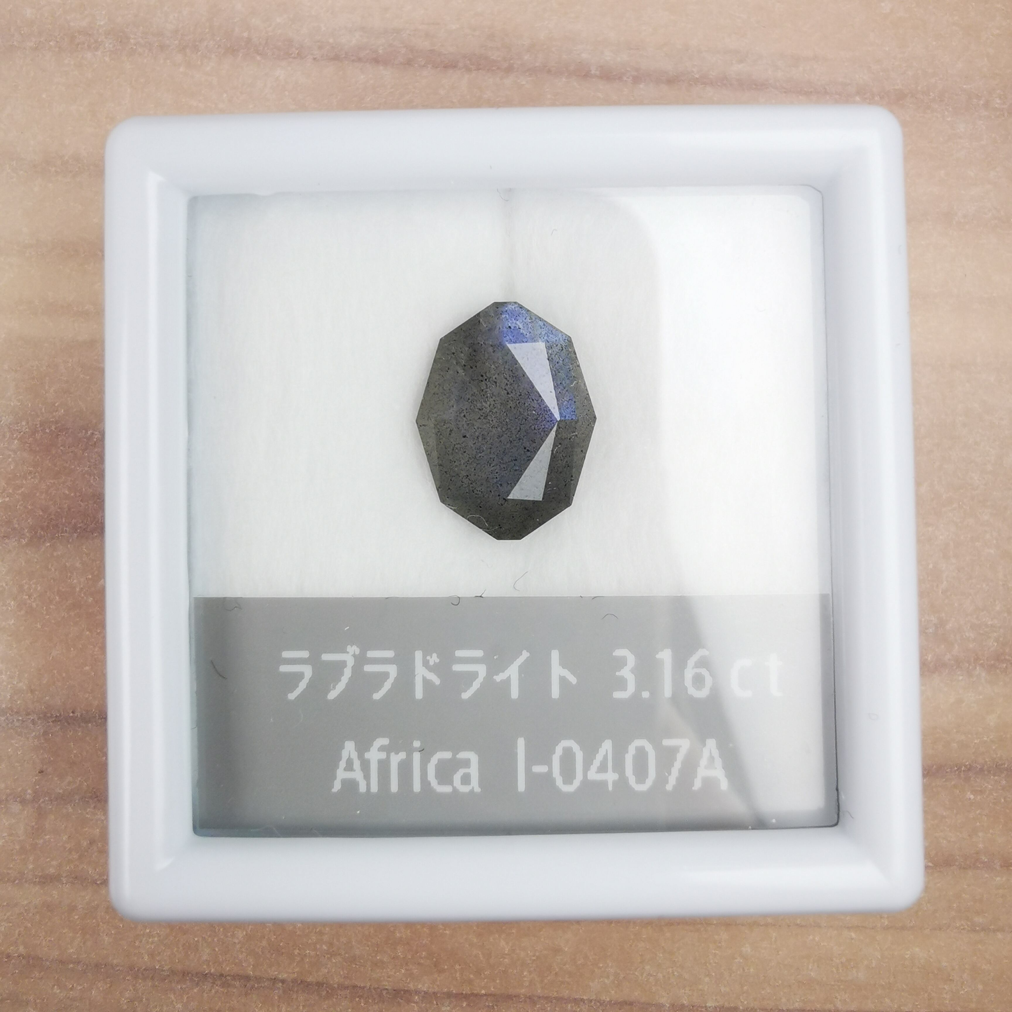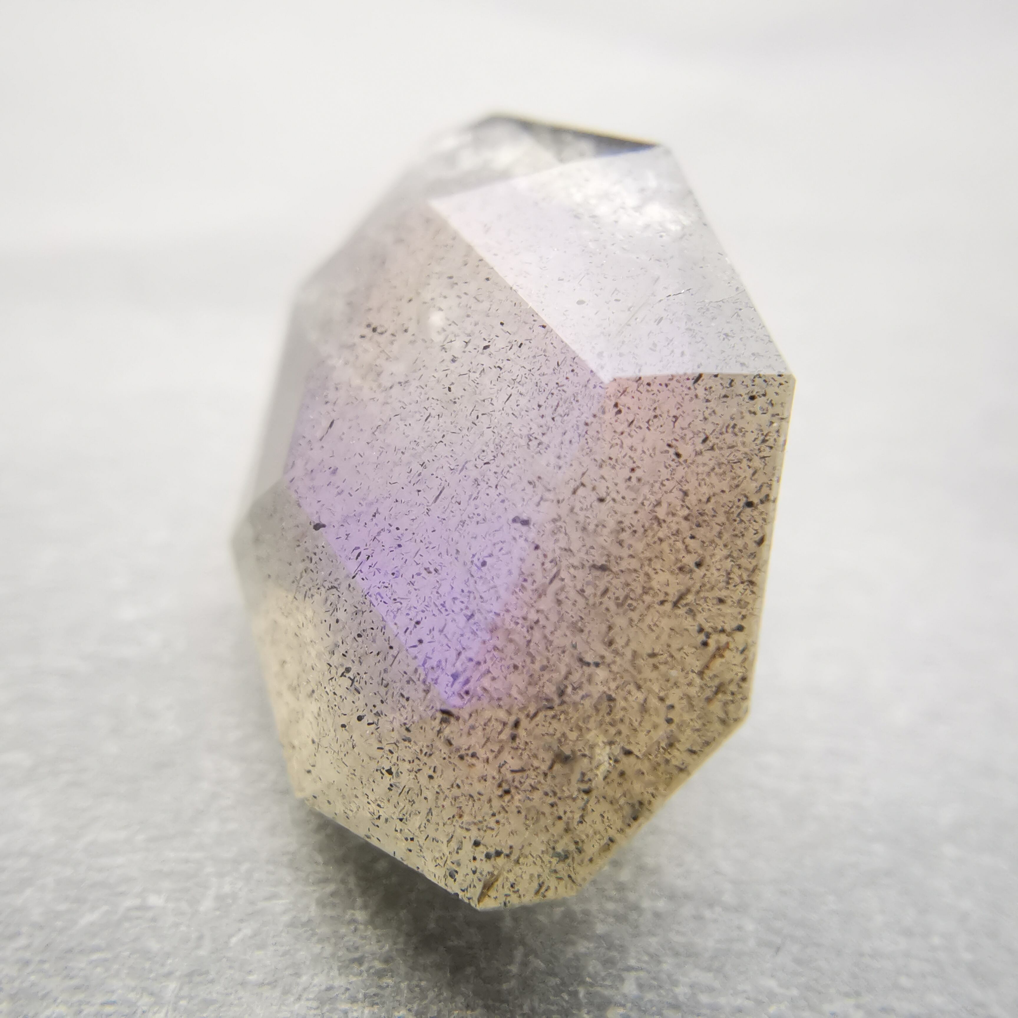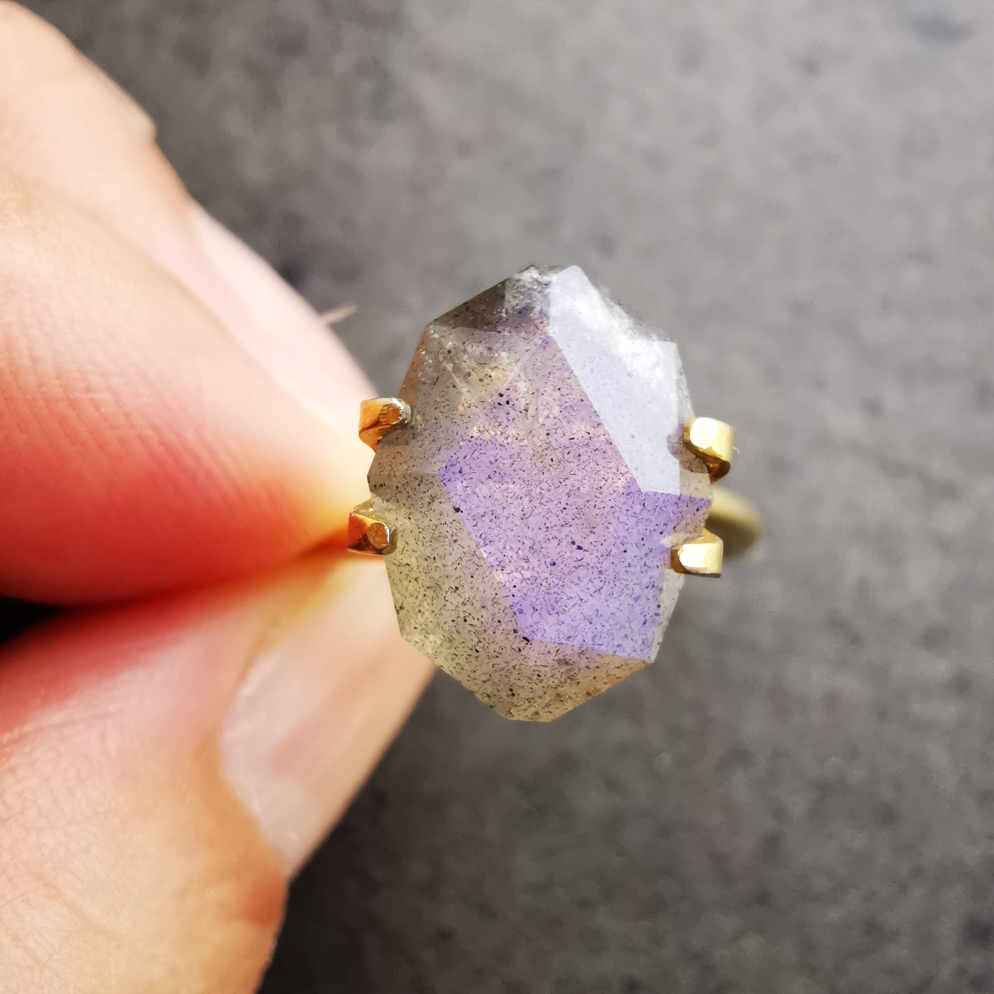 半透明なグレーの石の表面に現れるラブラドレッセンスはブルー寄りのパープルです。