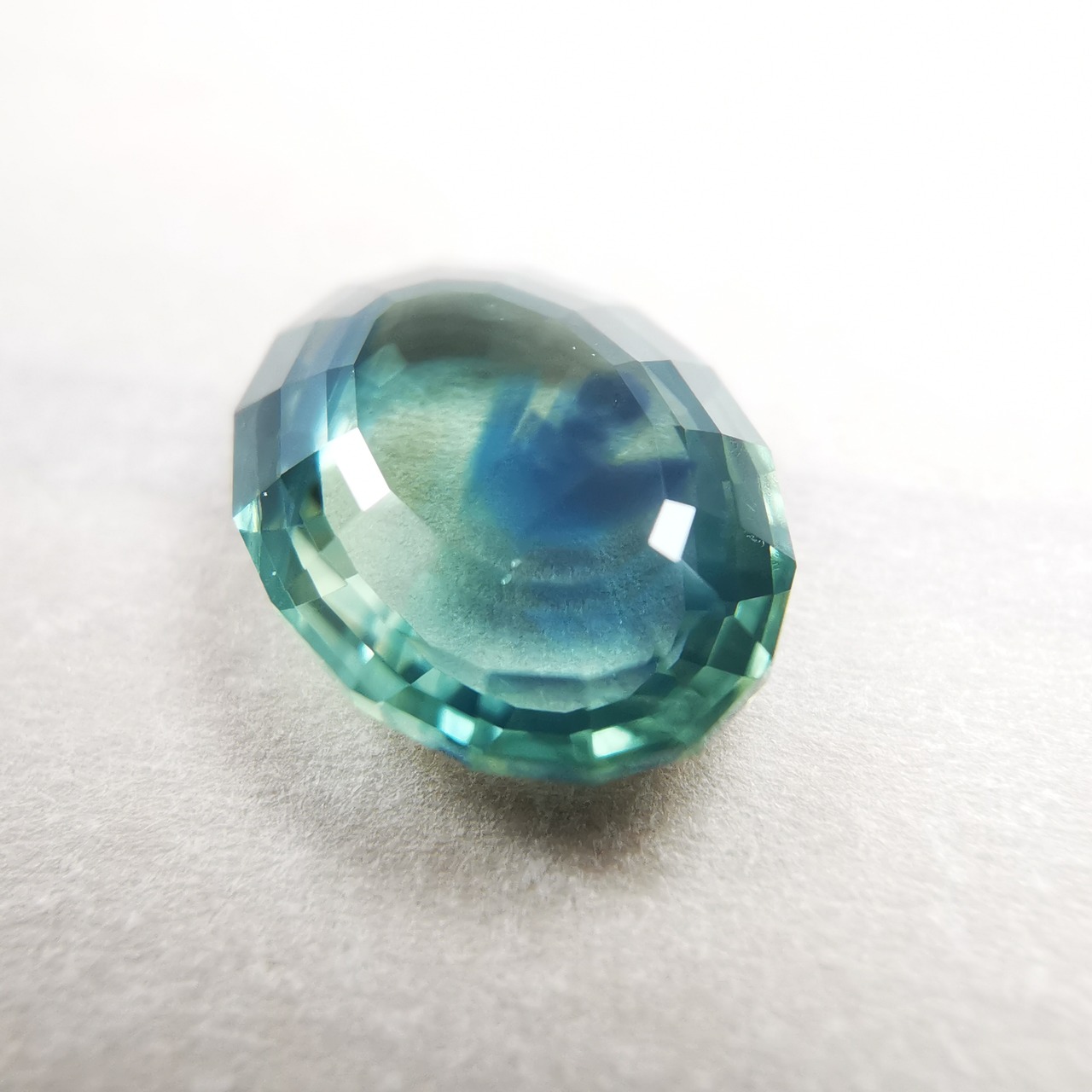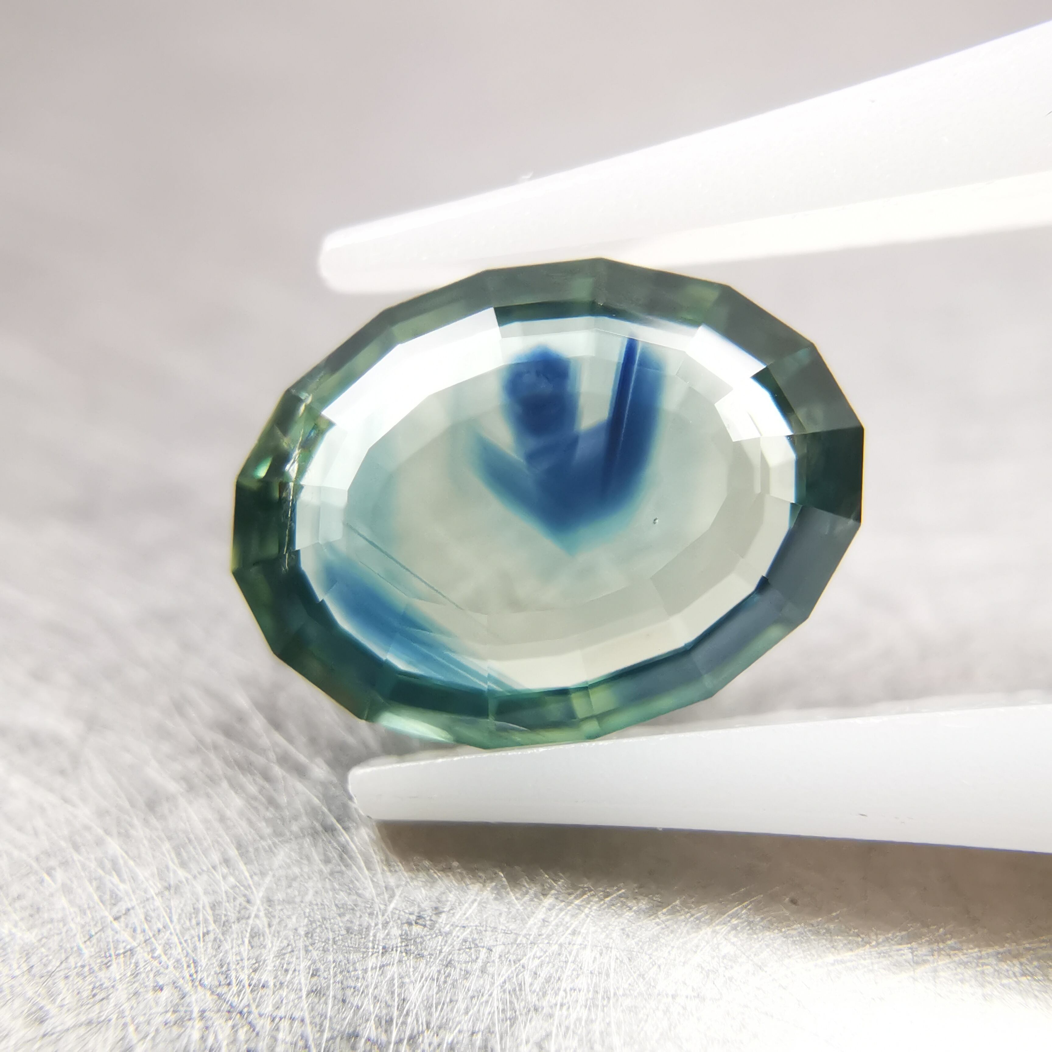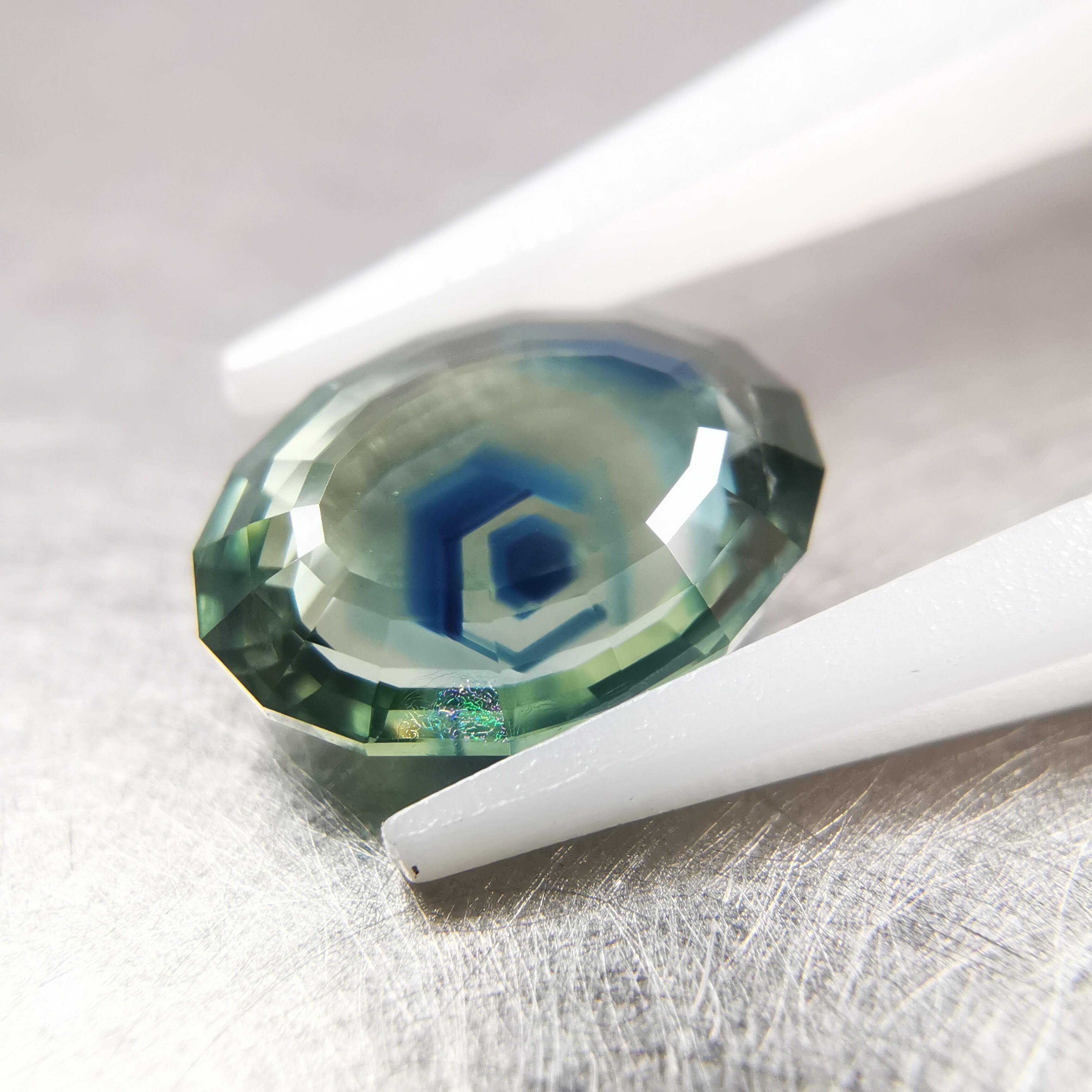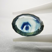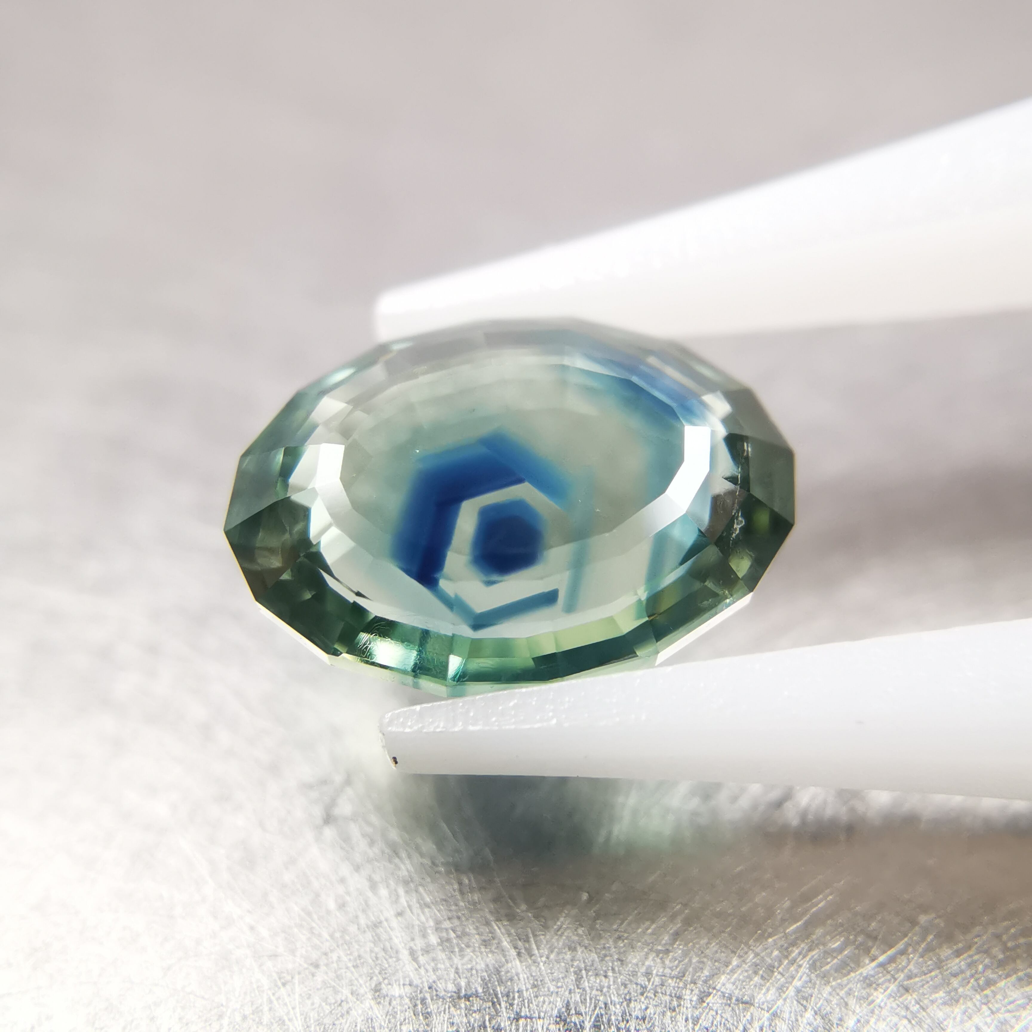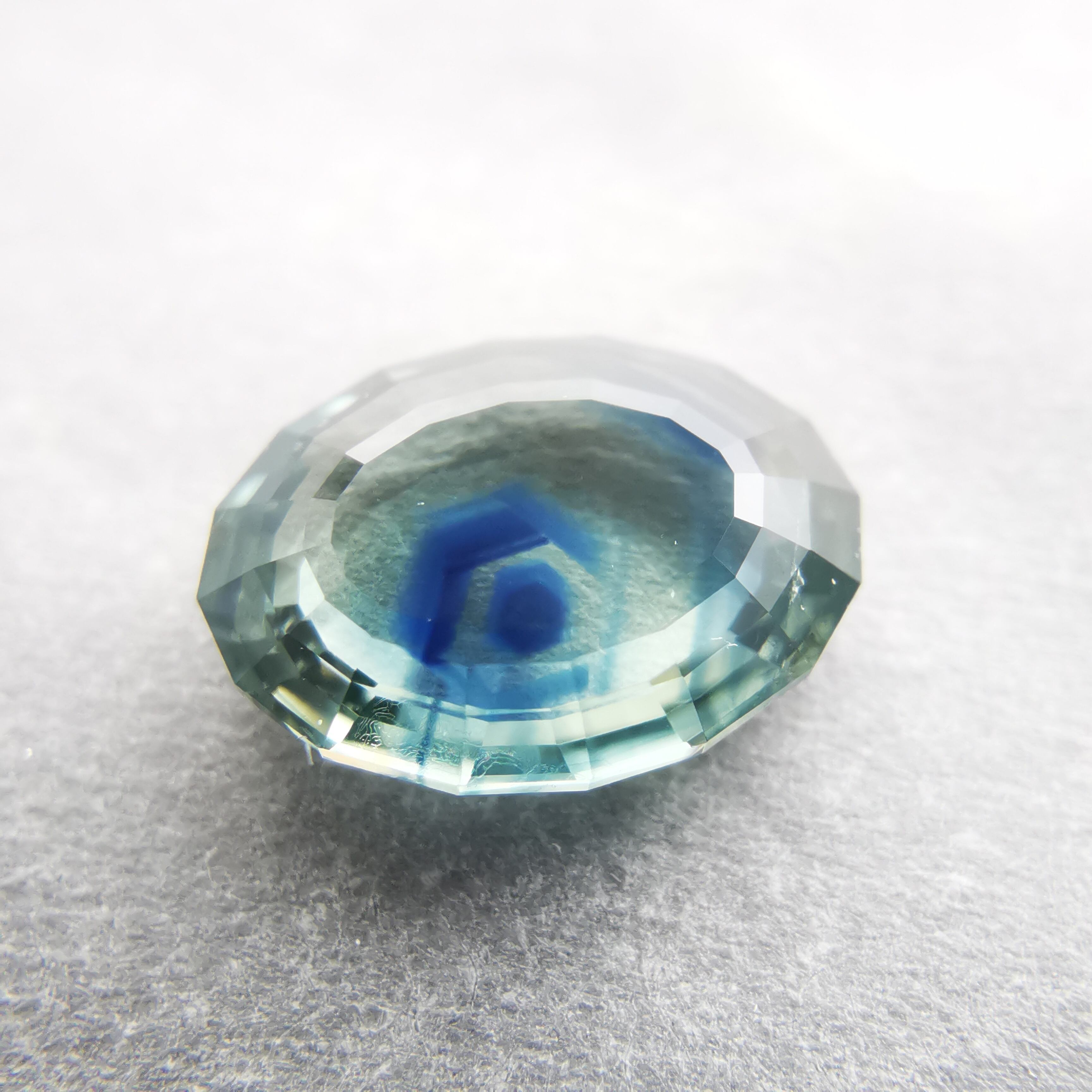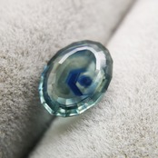 ごく淡くクリーンなアイスグリーンのサファイアに、紺色の成長線がくっきりと入っています。