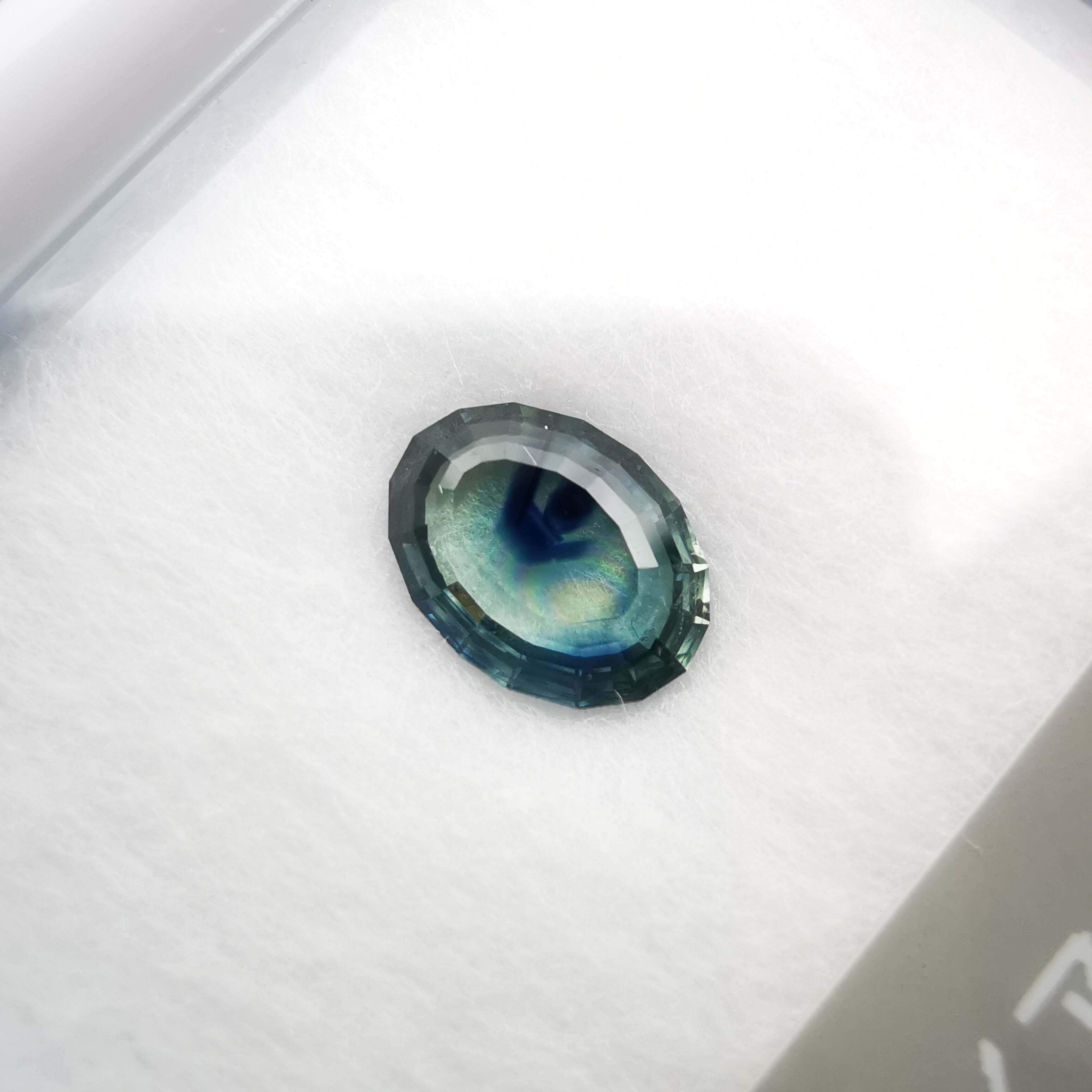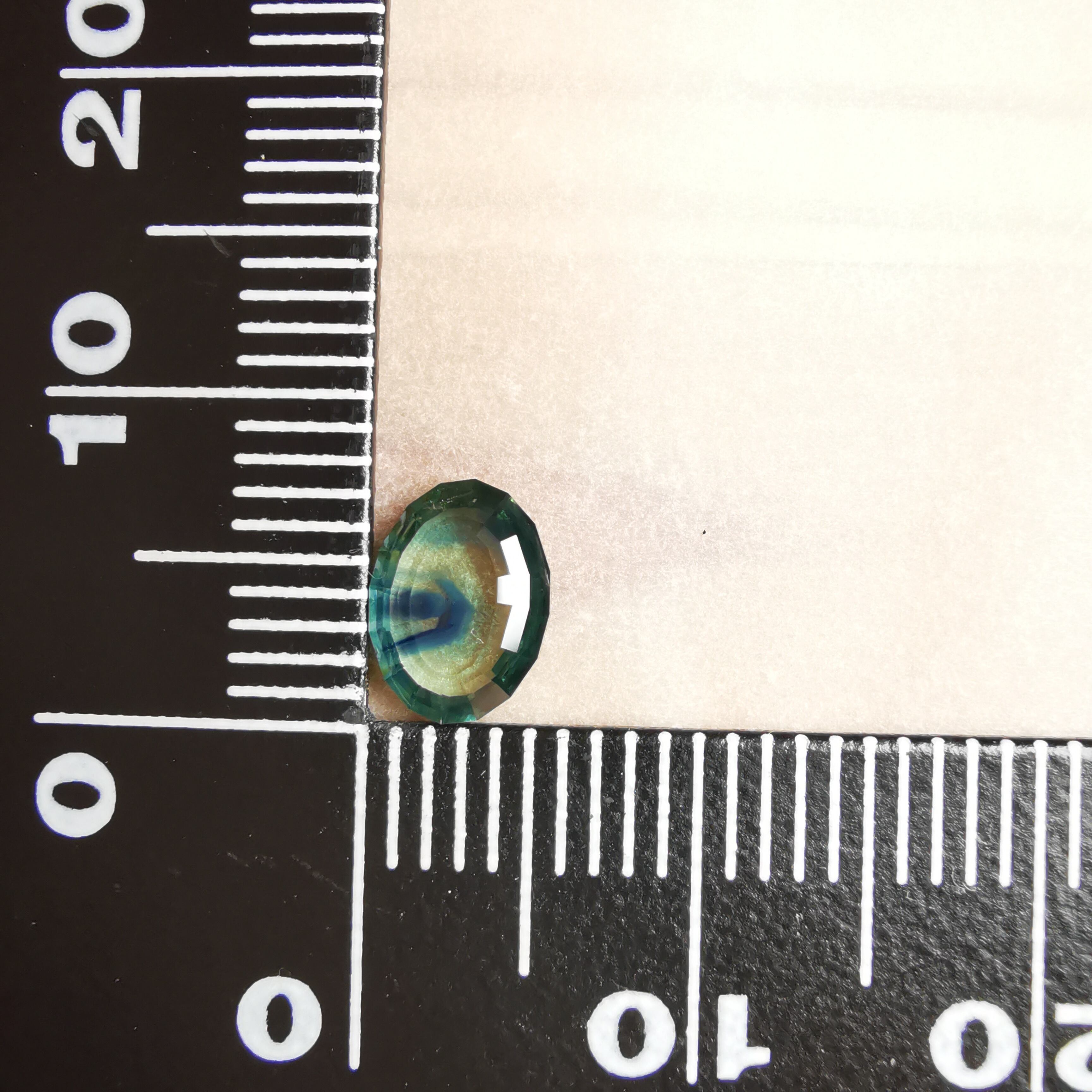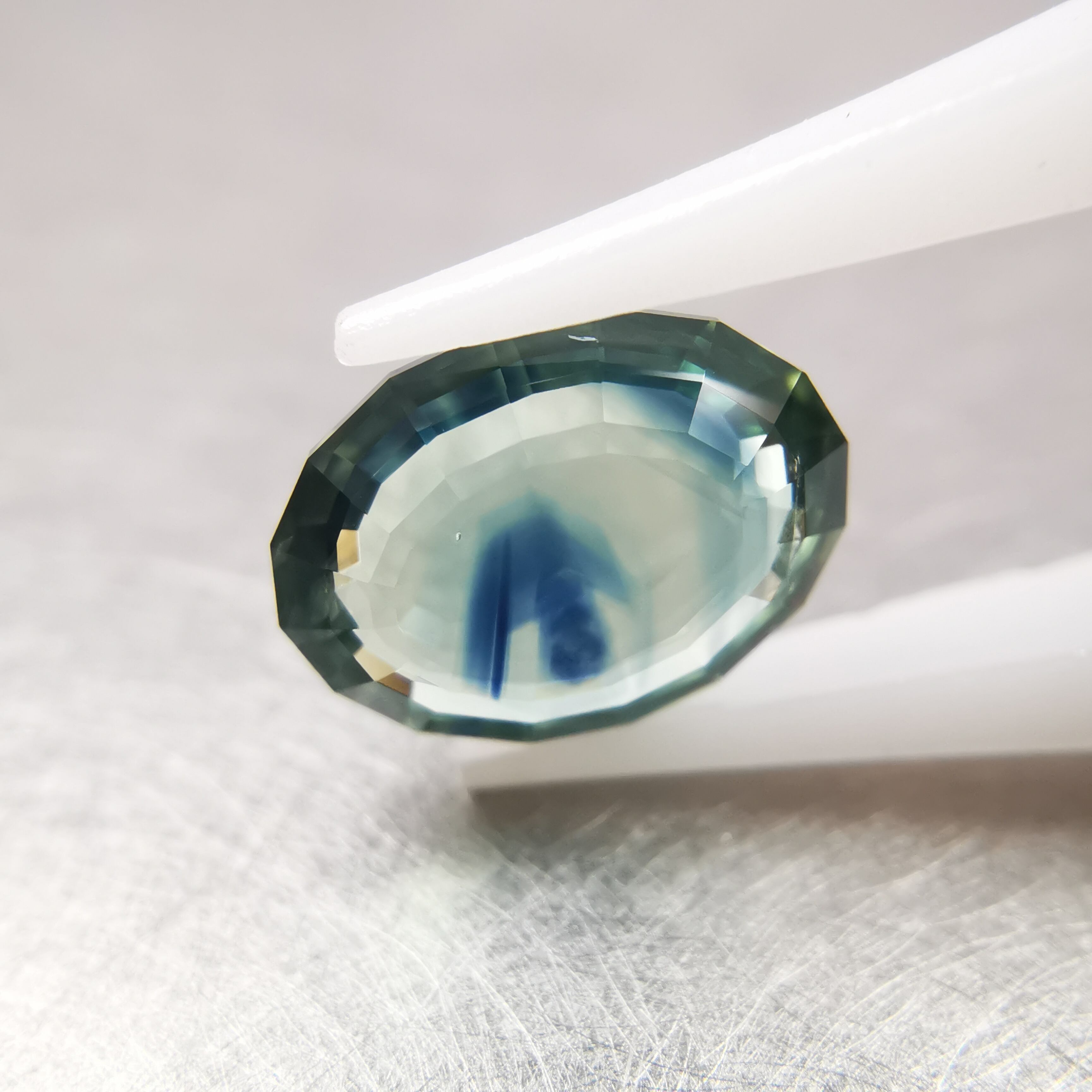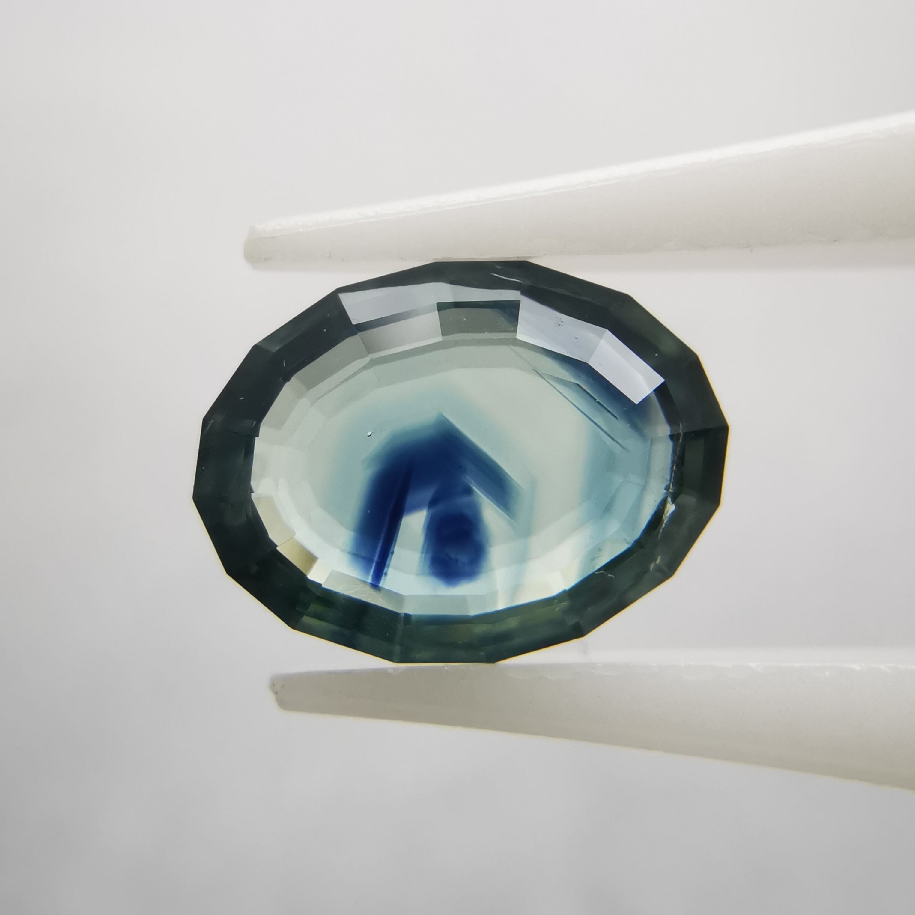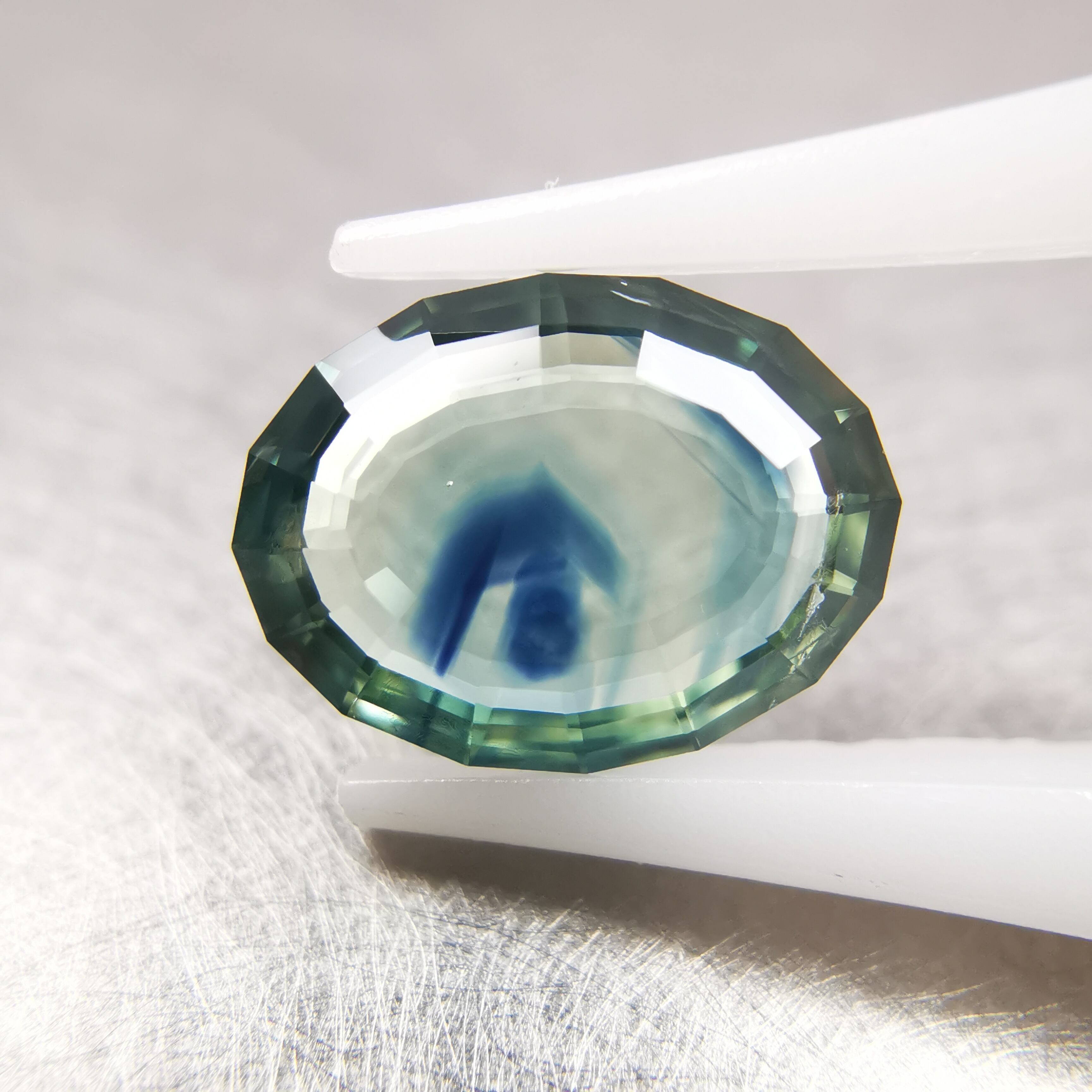 ごく淡くクリーンなアイスグリーンのサファイアに、紺色の成長線がくっきりと入っています。