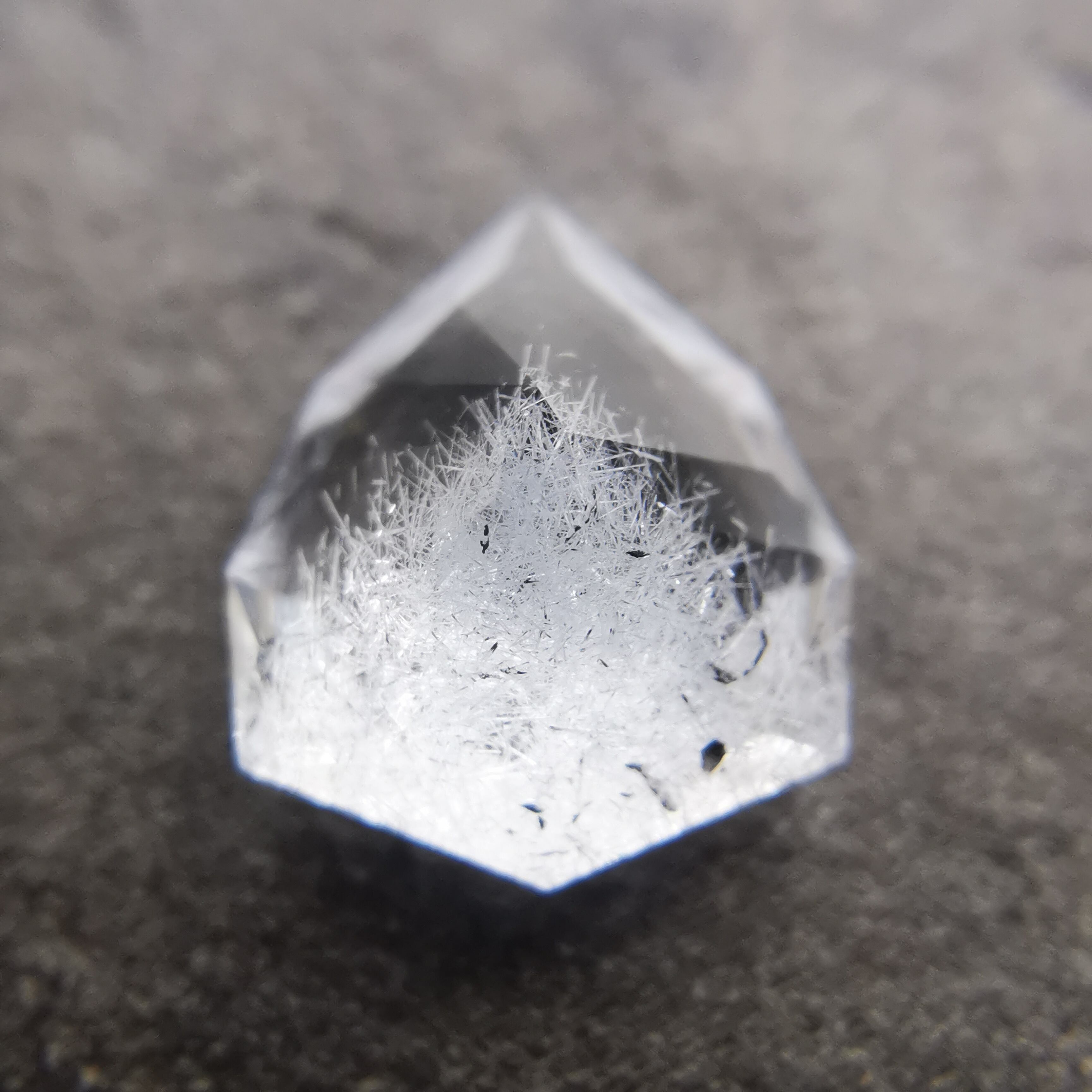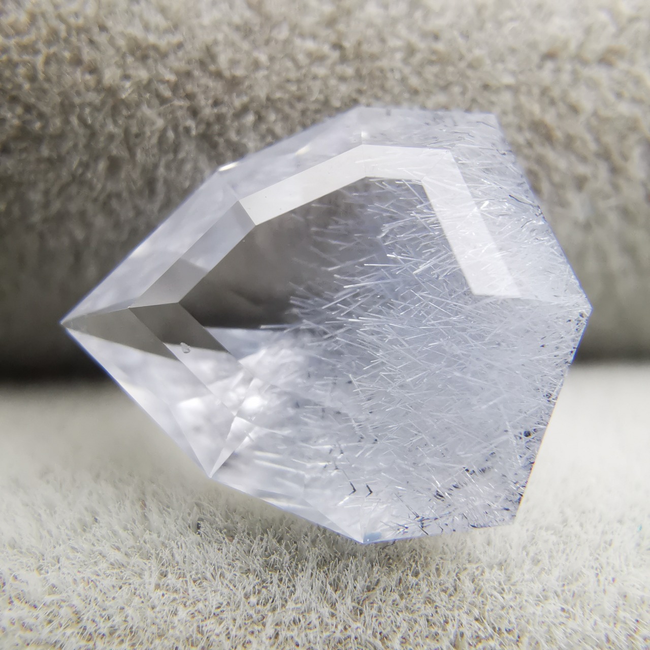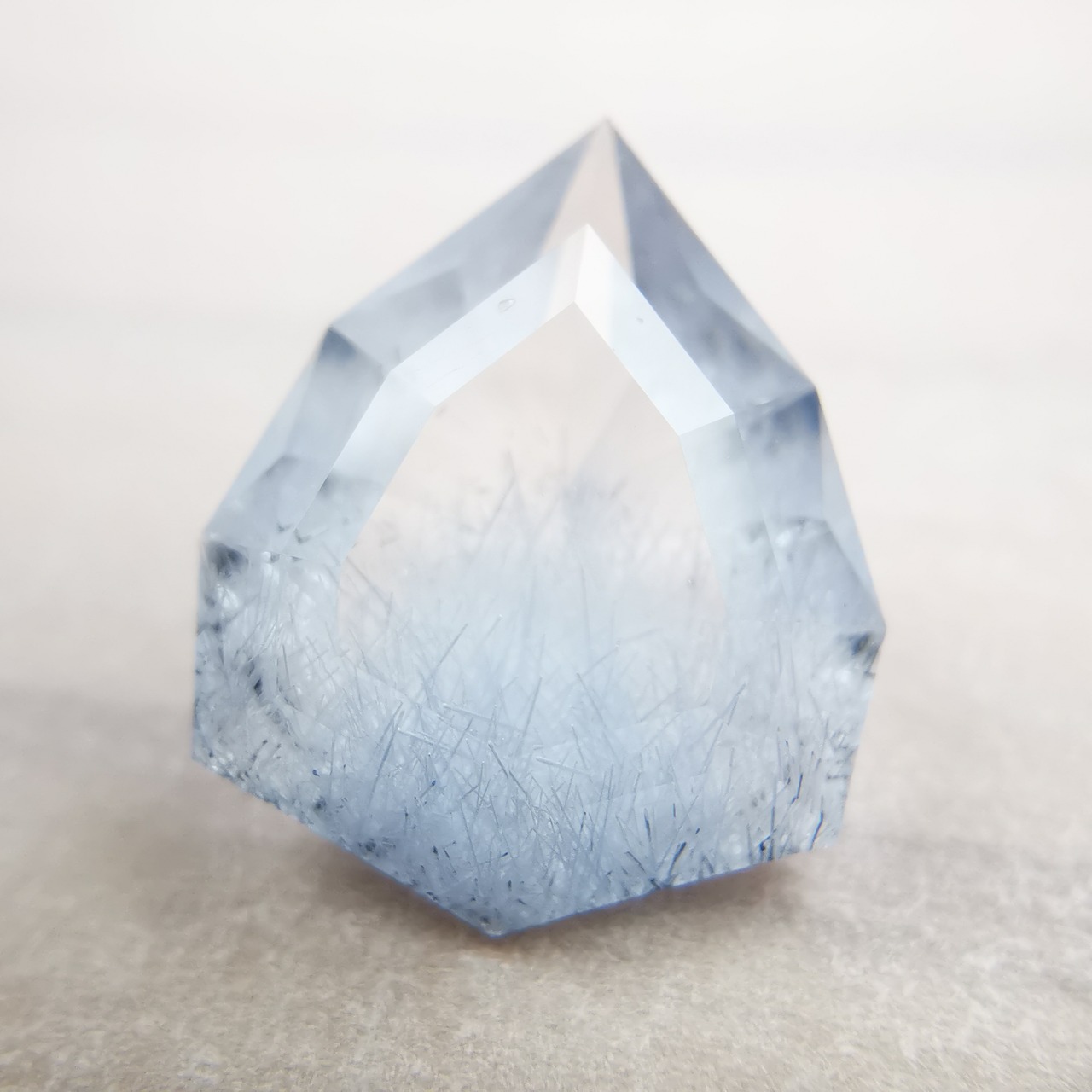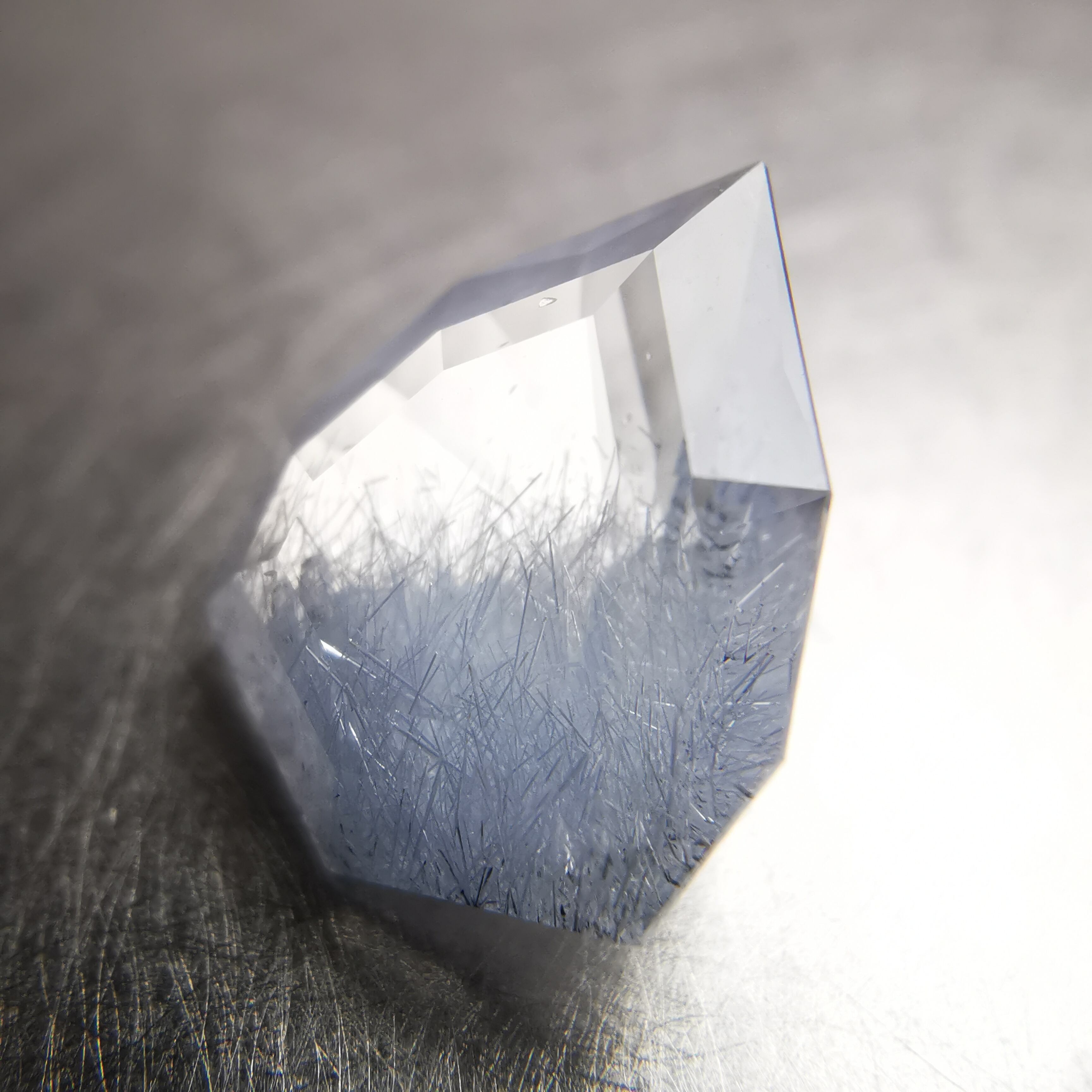 クォーツに入ったふわふわの羽毛のようなデュモルチェライトの結晶が、軽やかで儚げな雰囲気です。