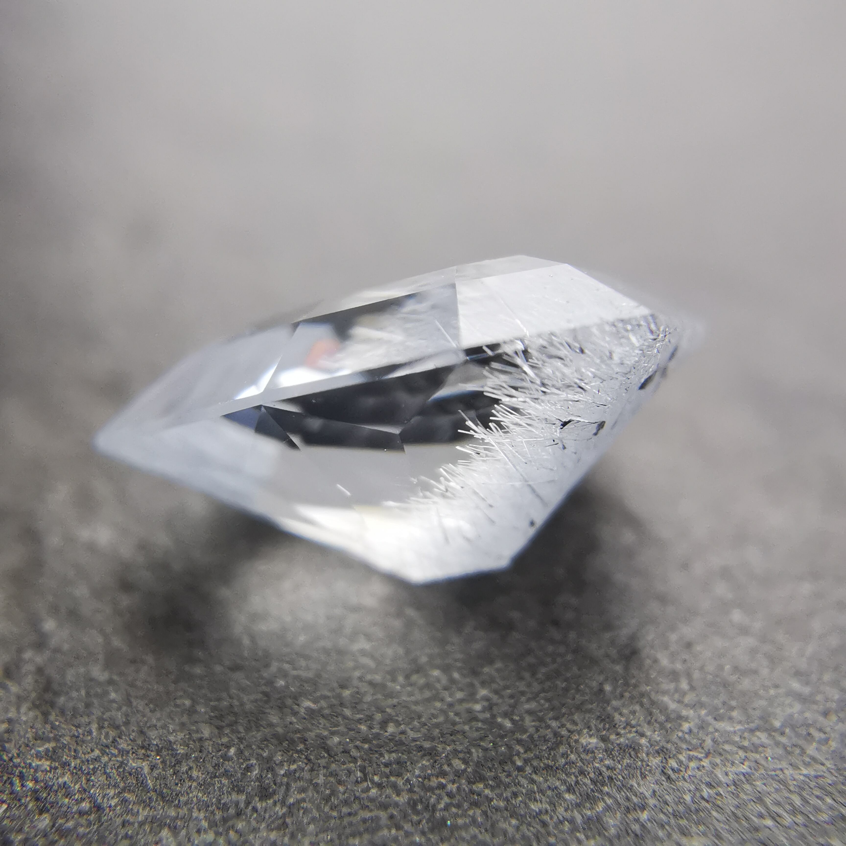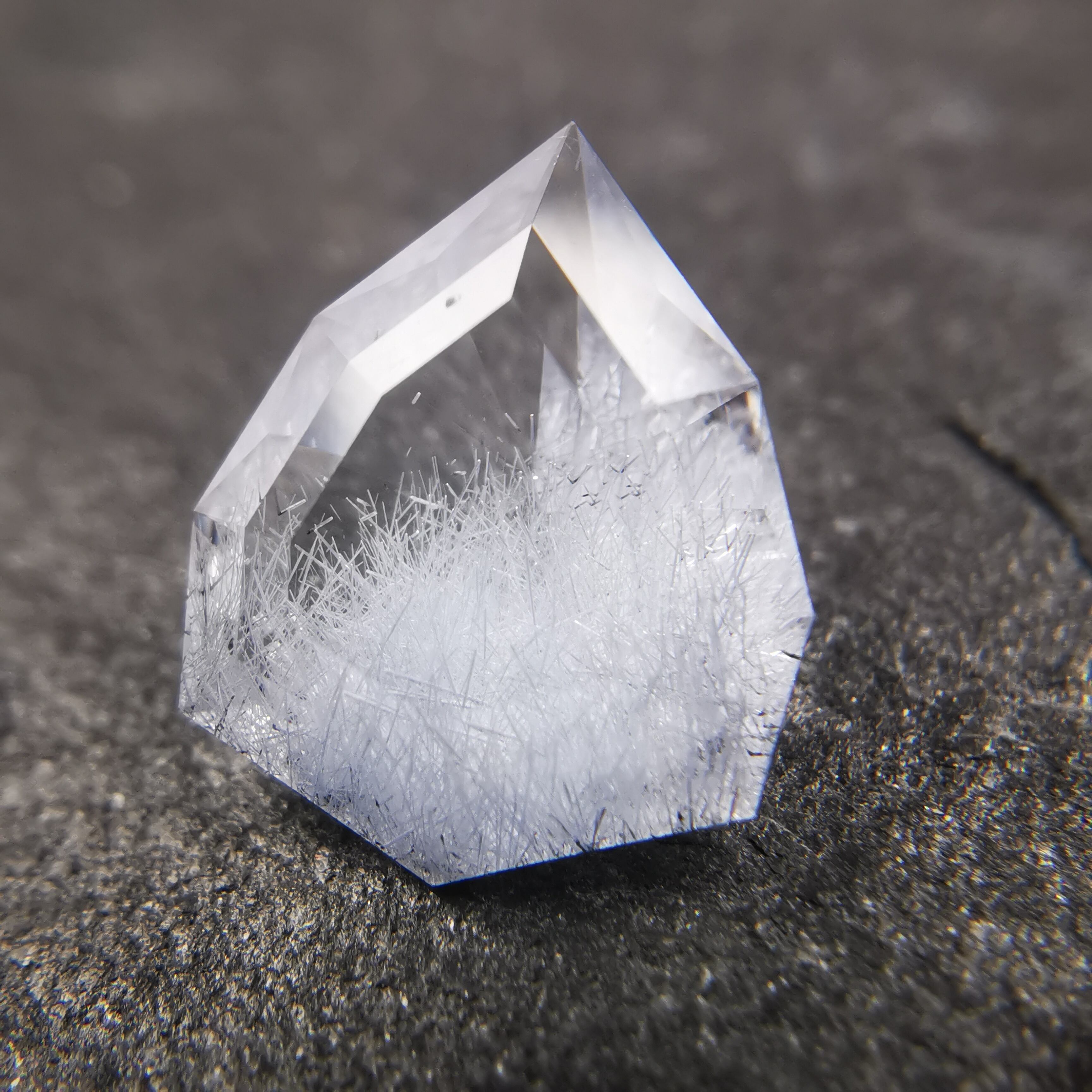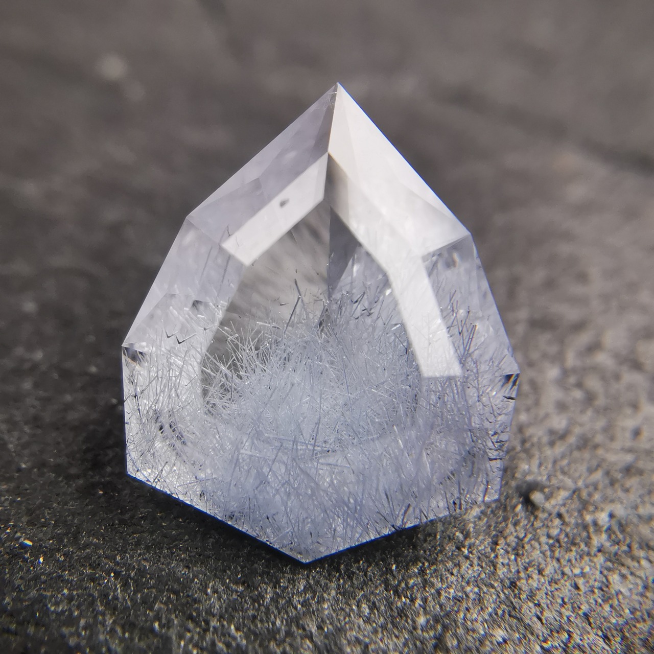 クォーツに入ったふわふわの羽毛のようなデュモルチェライトの結晶が、軽やかで儚げな雰囲気です。