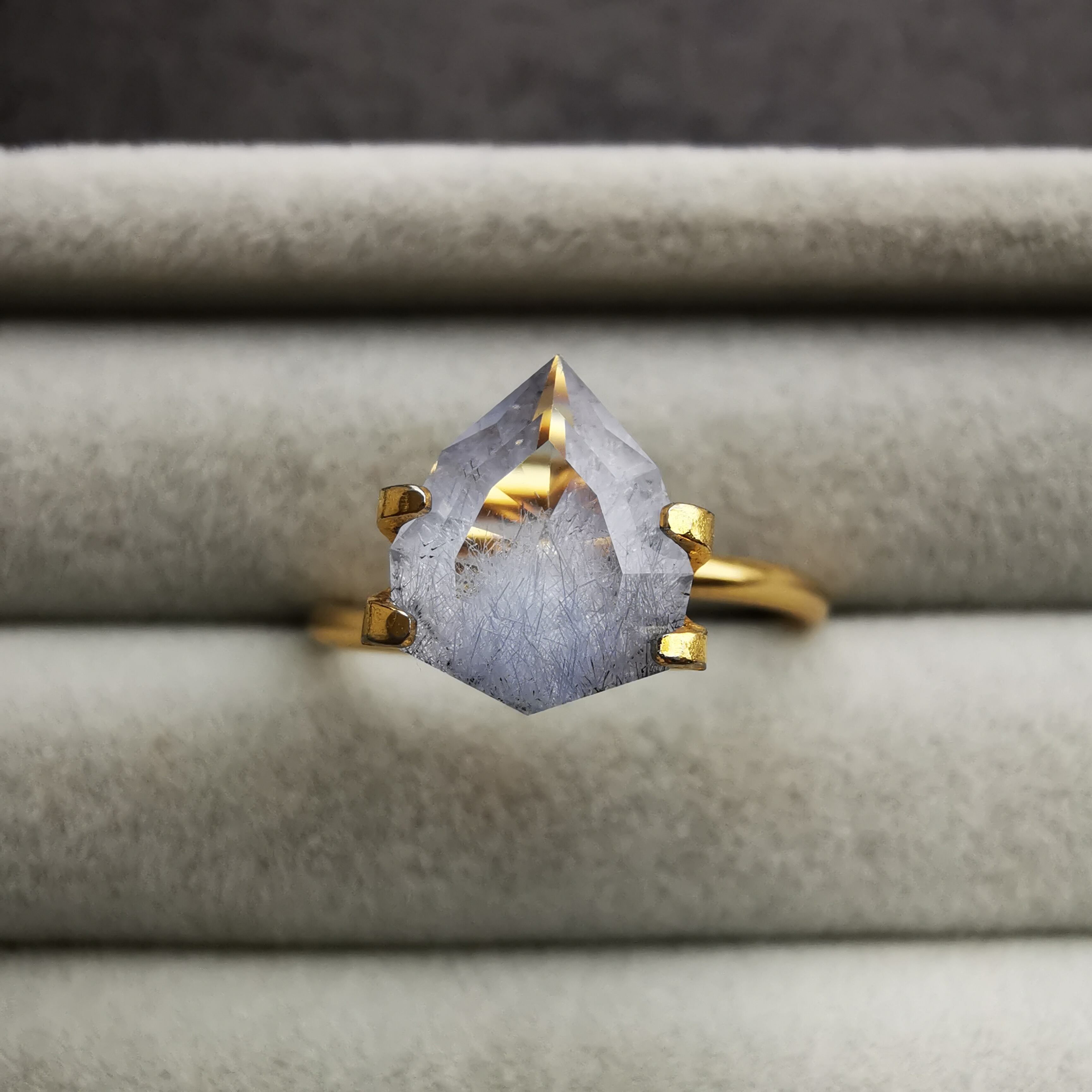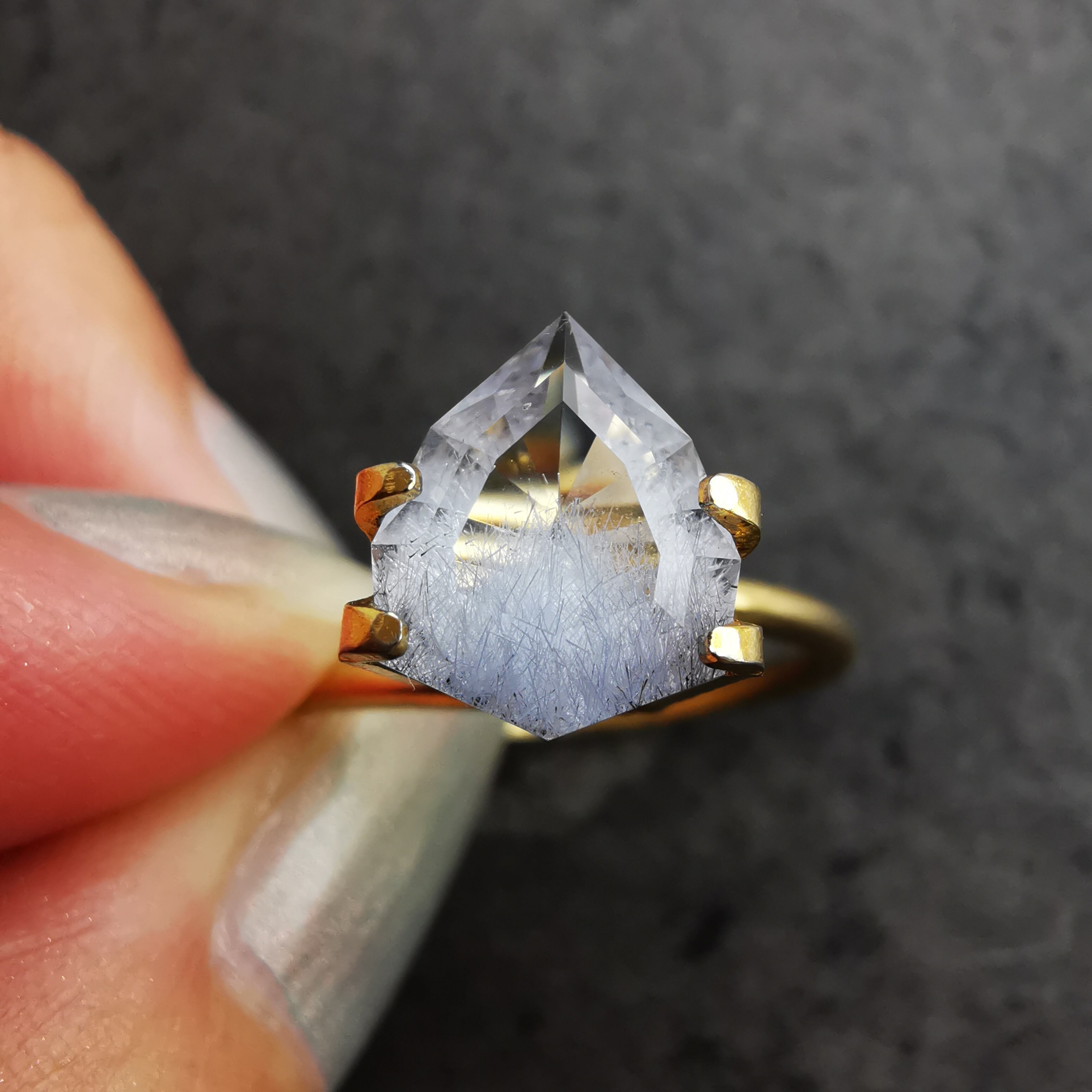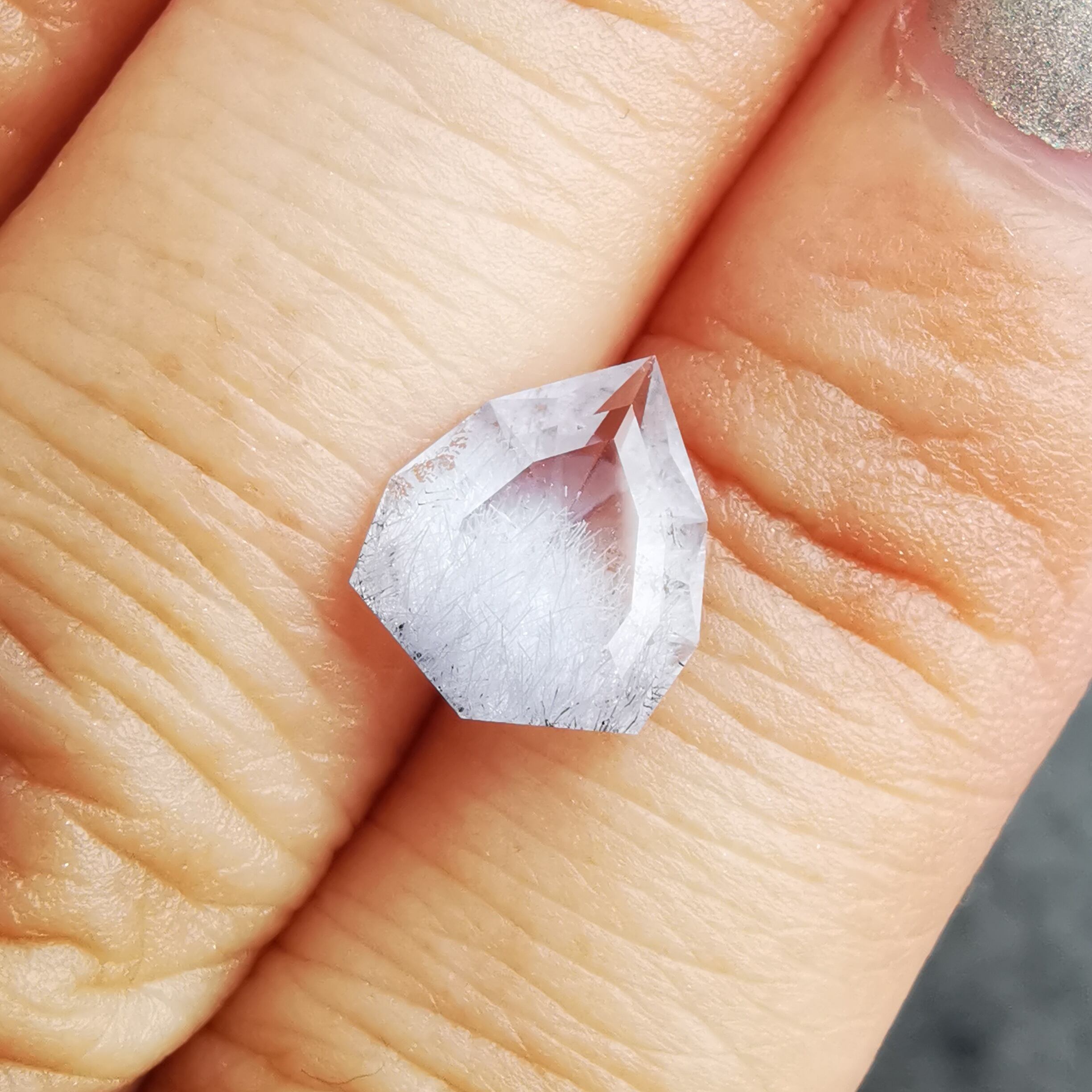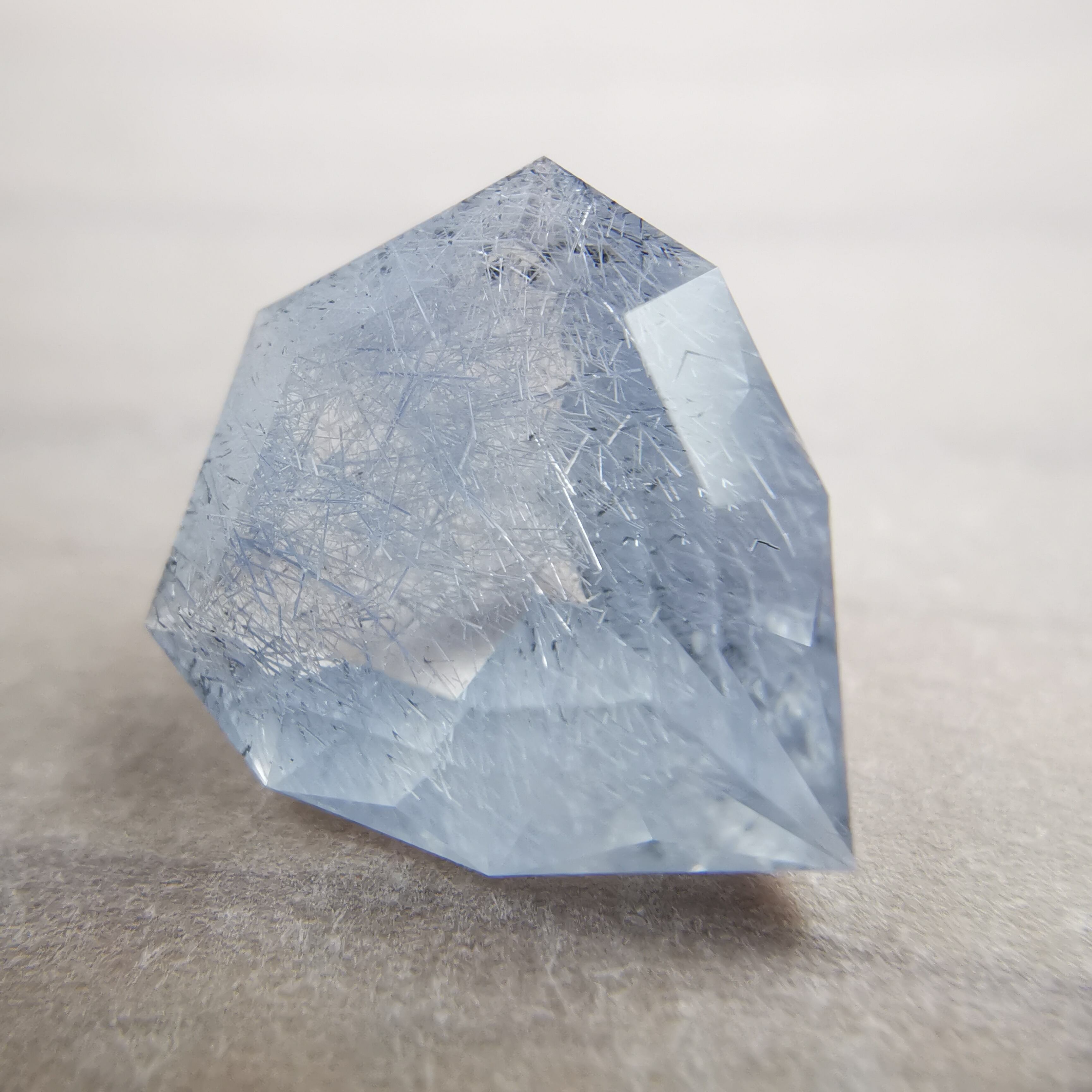 クォーツに入ったふわふわの羽毛のようなデュモルチェライトの結晶が、軽やかで儚げな雰囲気です。