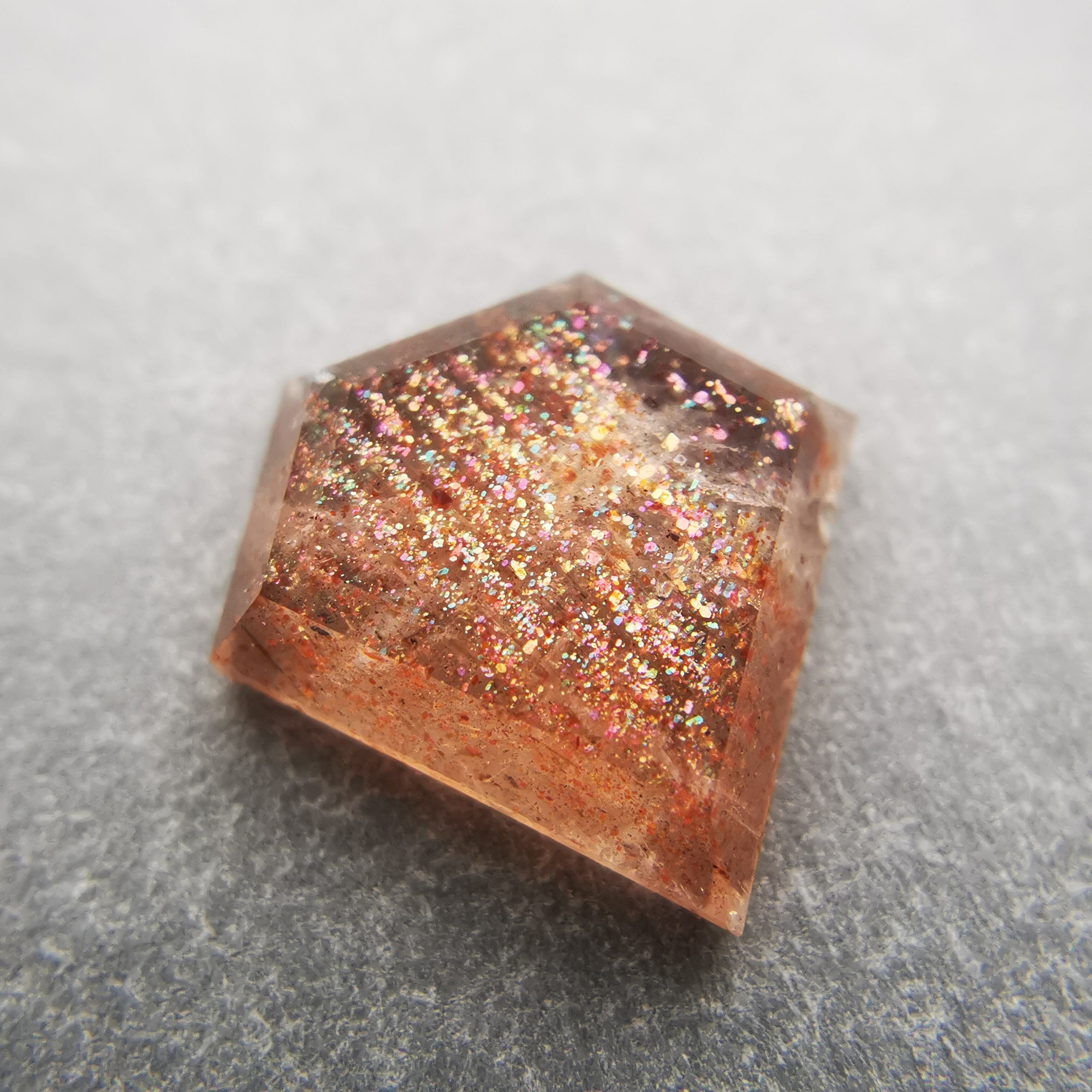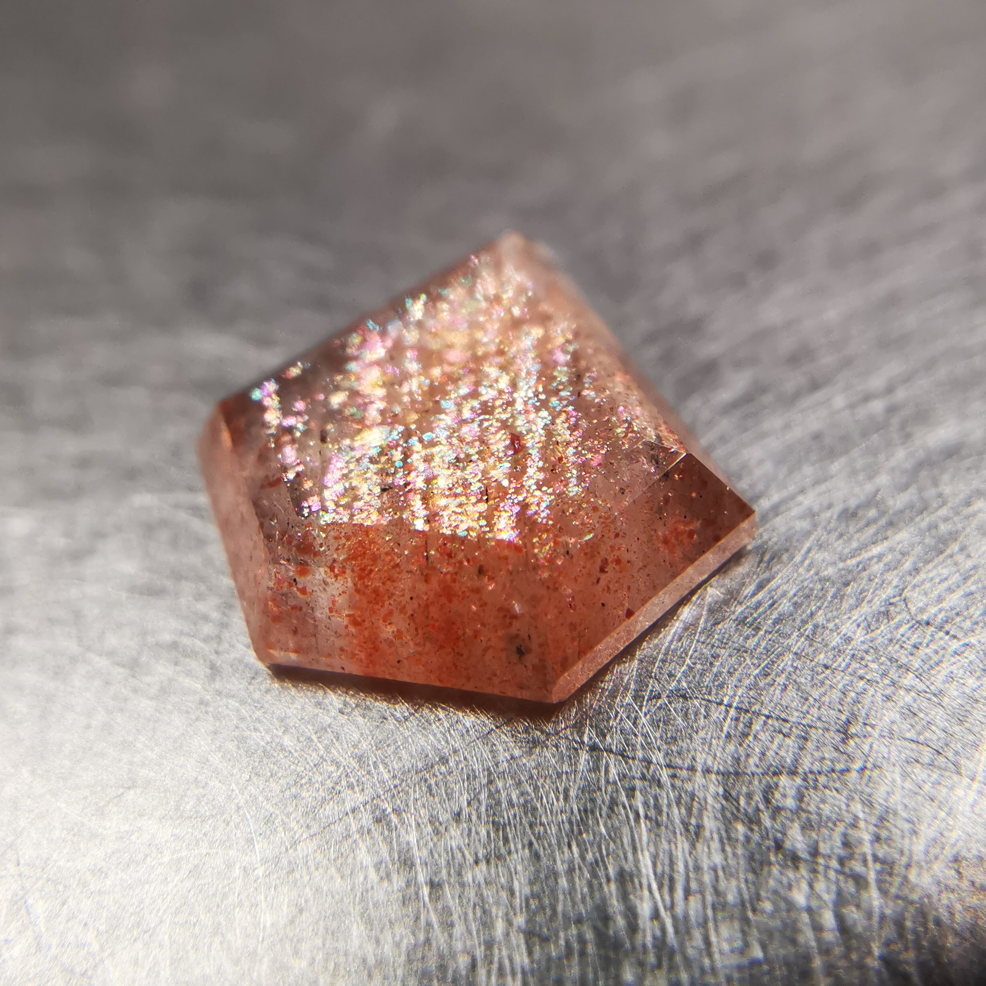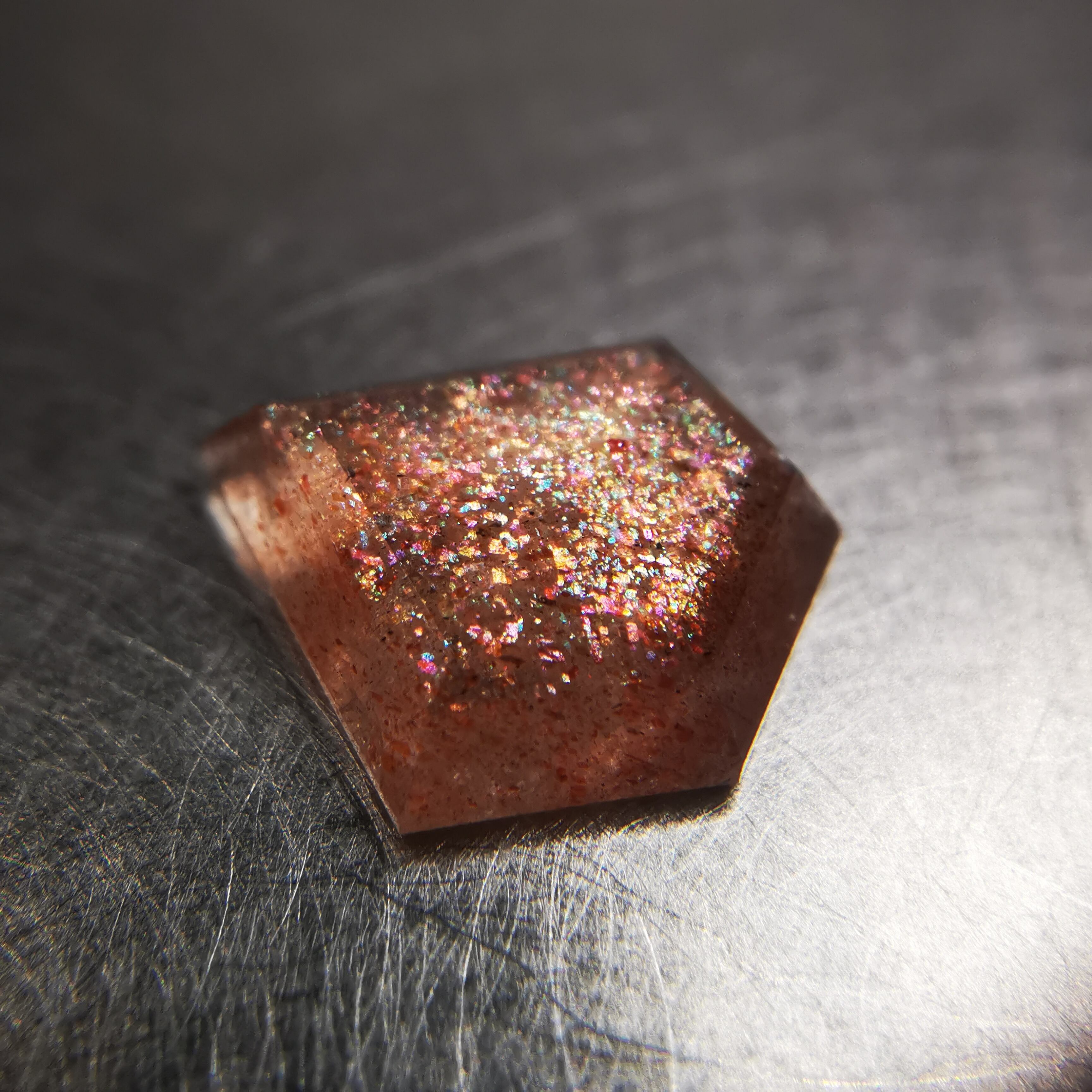 半透明の石に流れ落ちるように入ったインクルージョンが、虹色にきらめくサンストーンです。