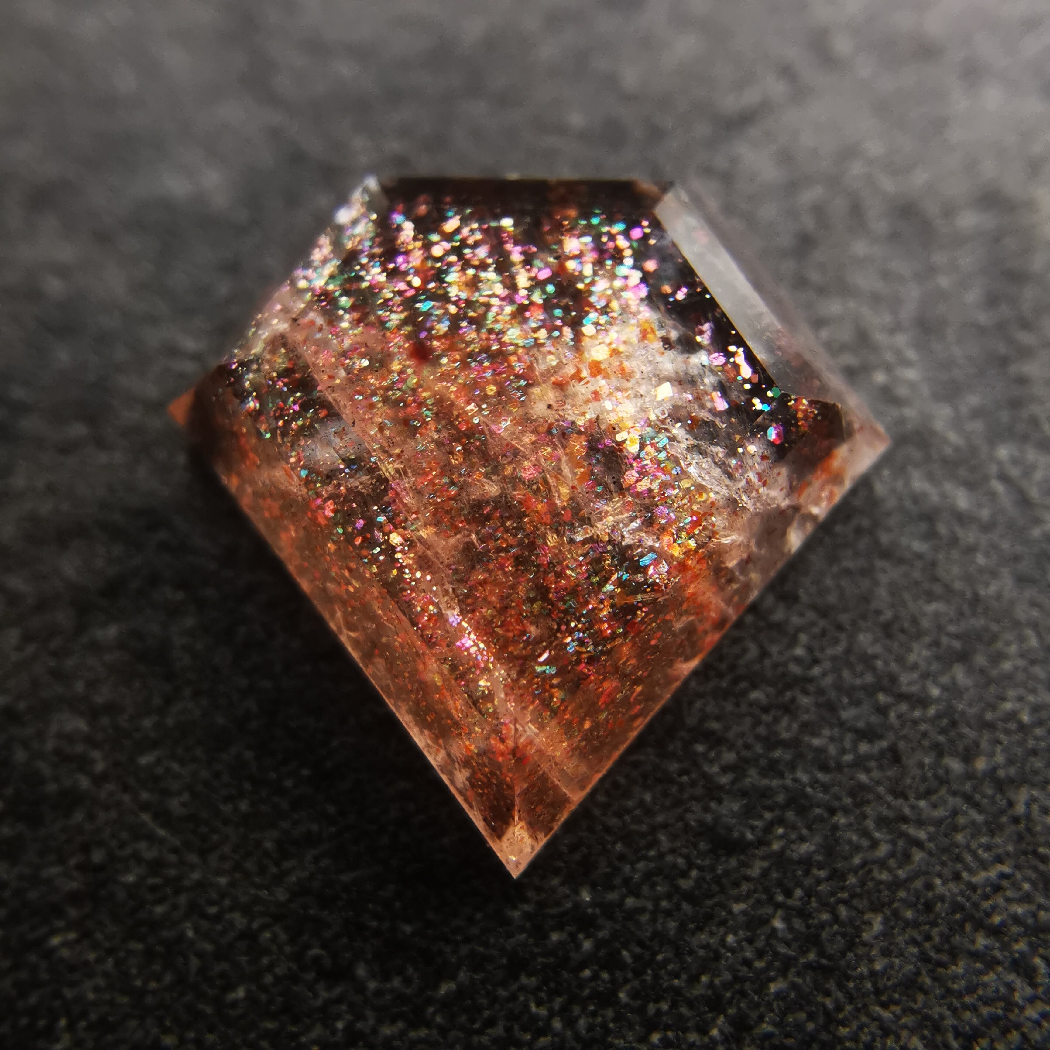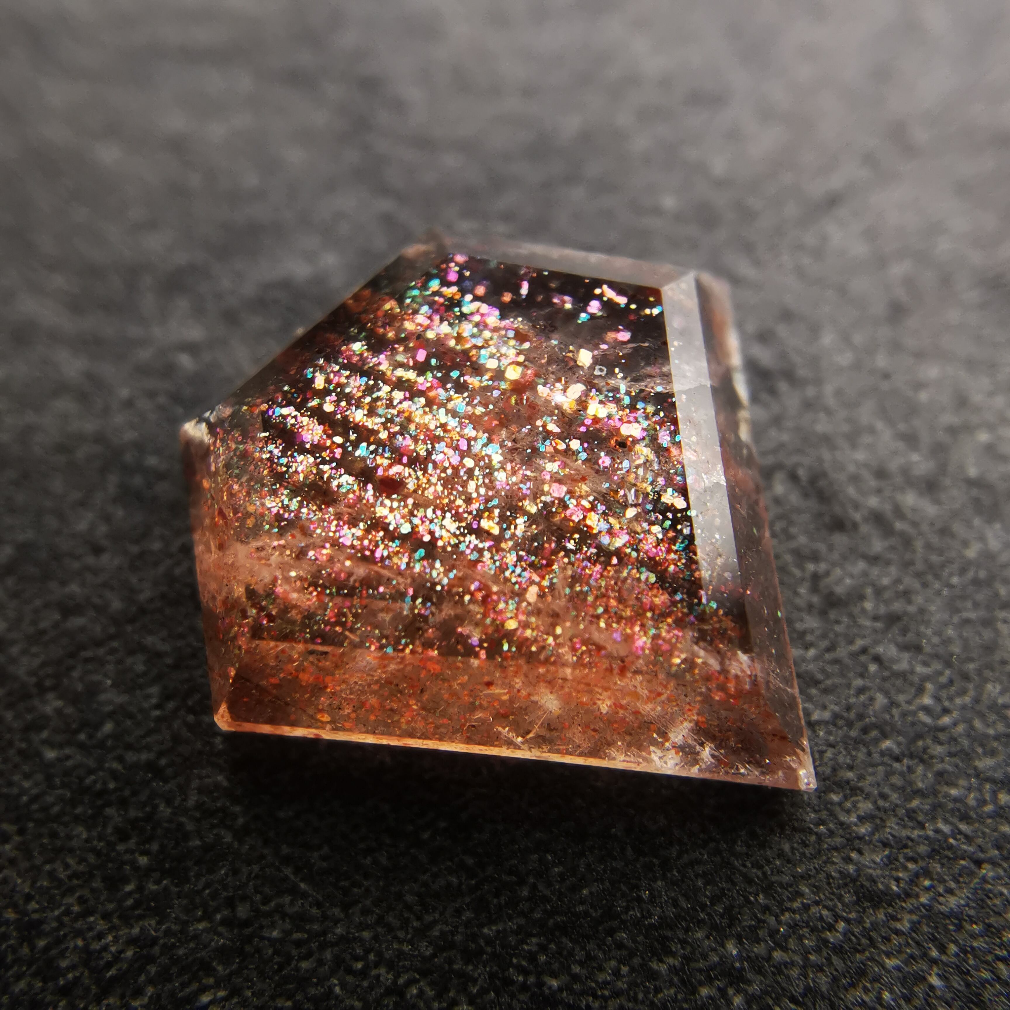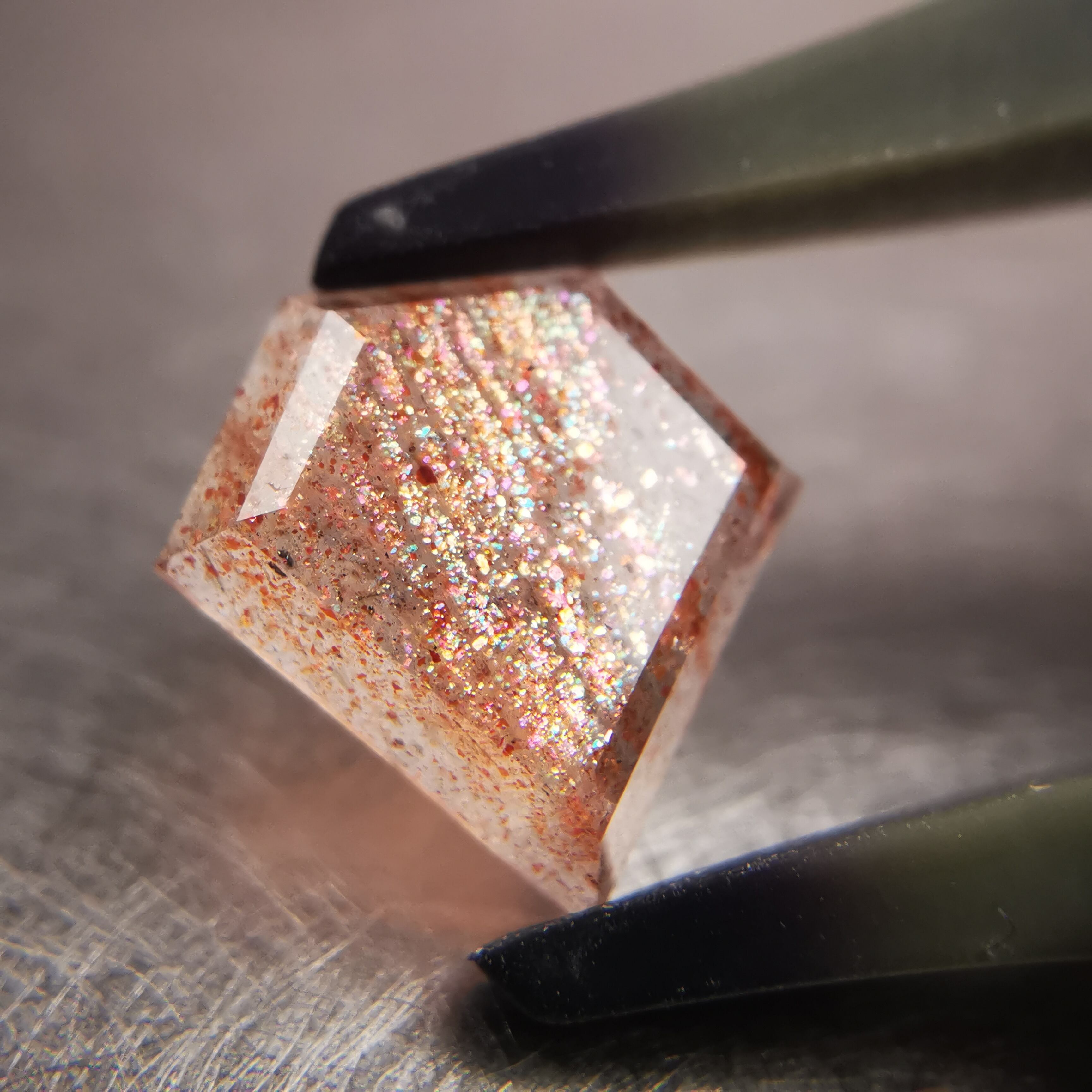 半透明の石に流れ落ちるように入ったインクルージョンが、虹色にきらめくサンストーンです。