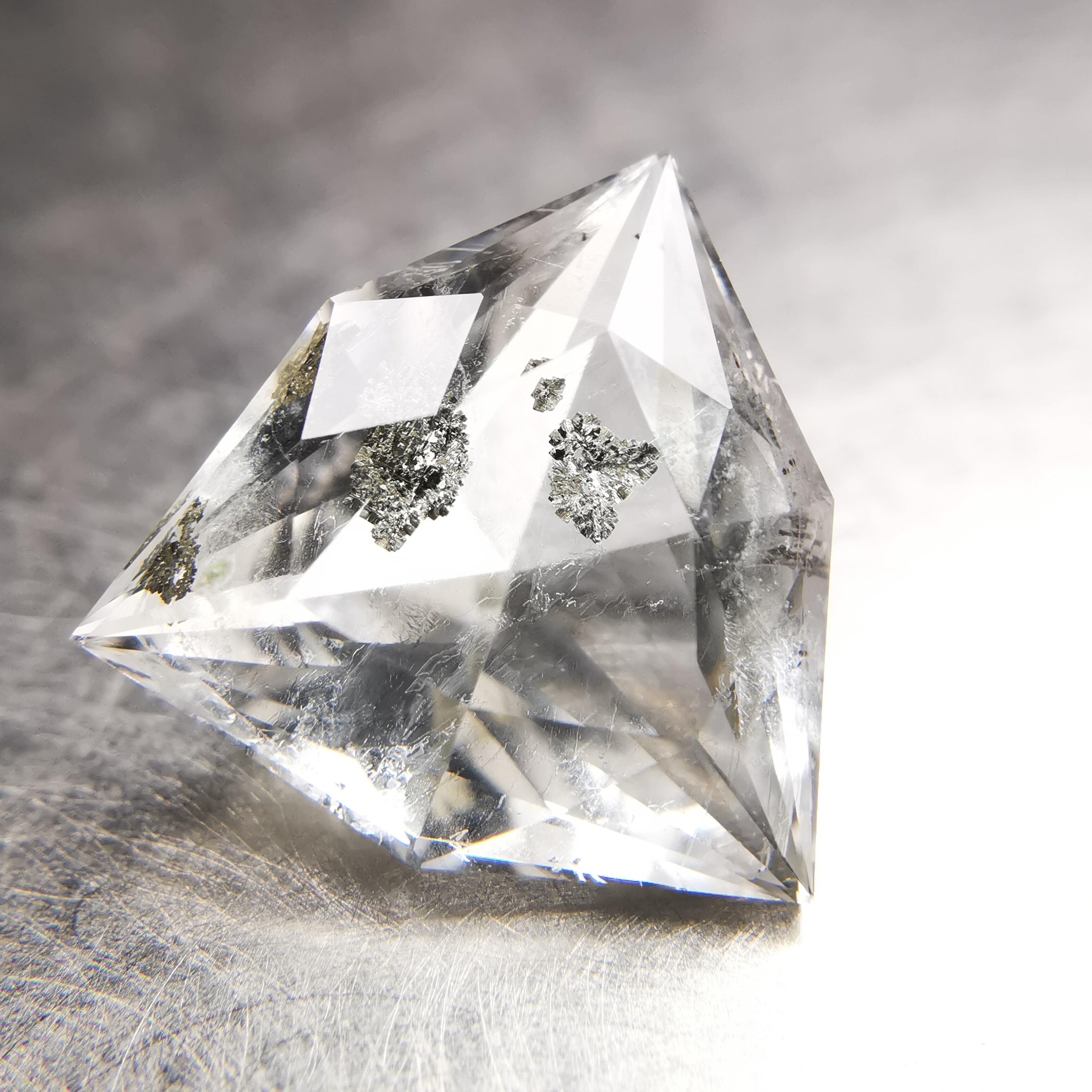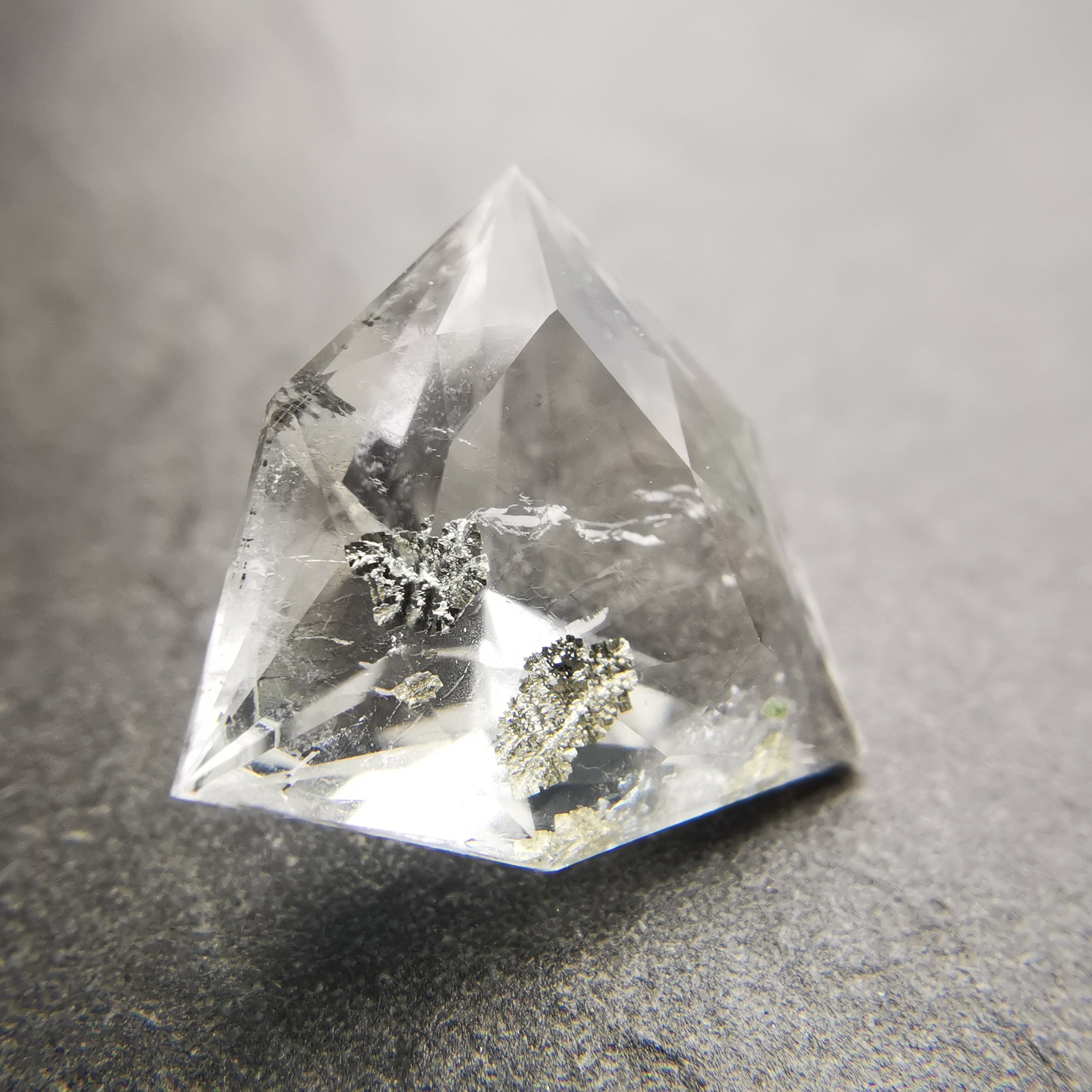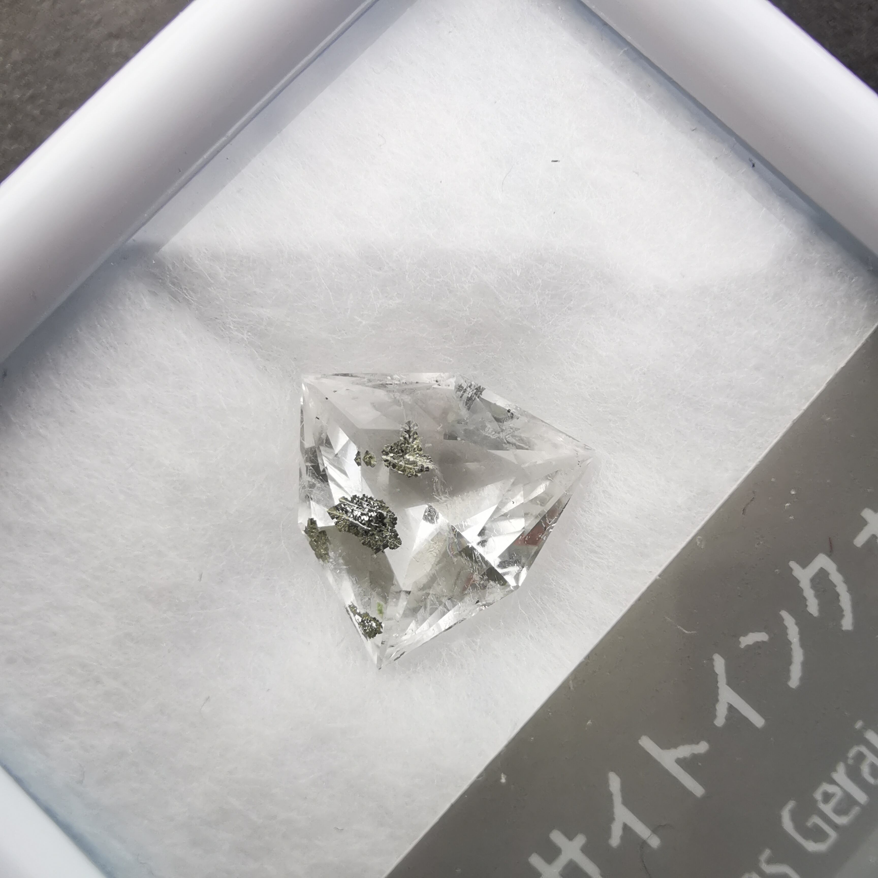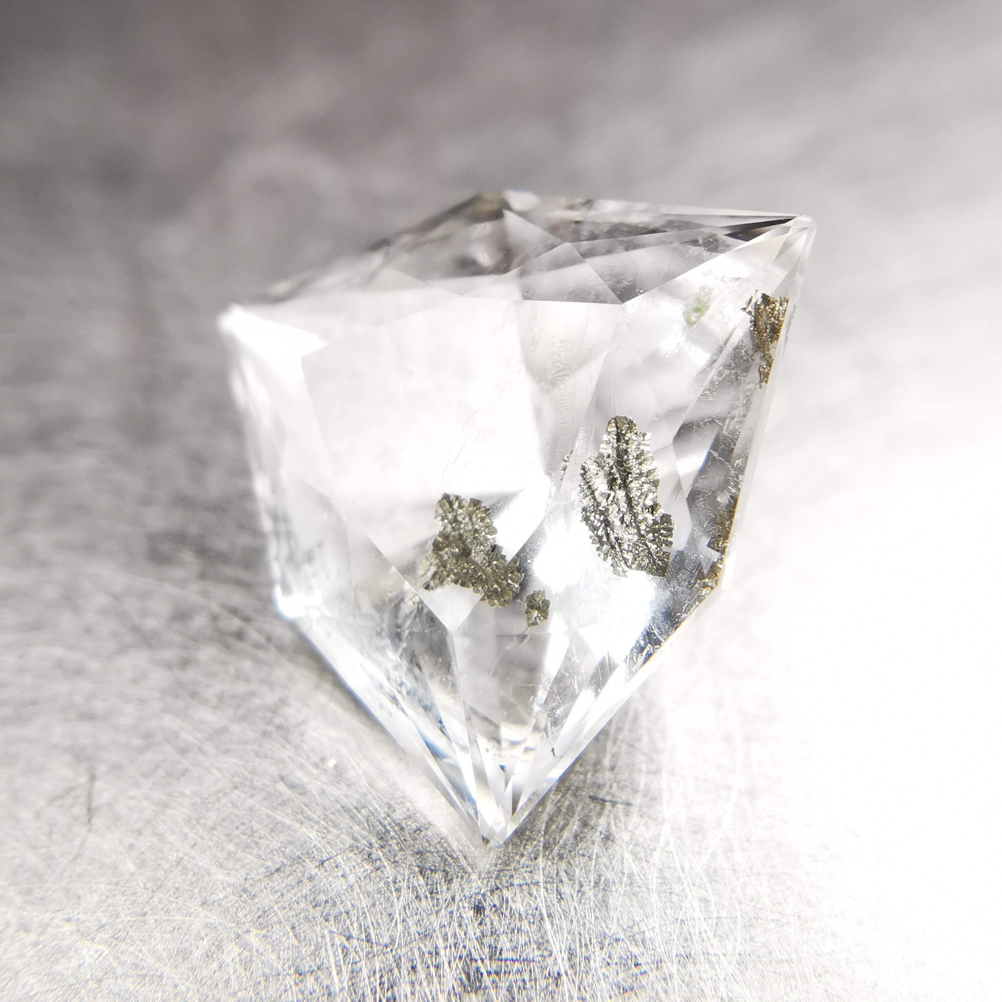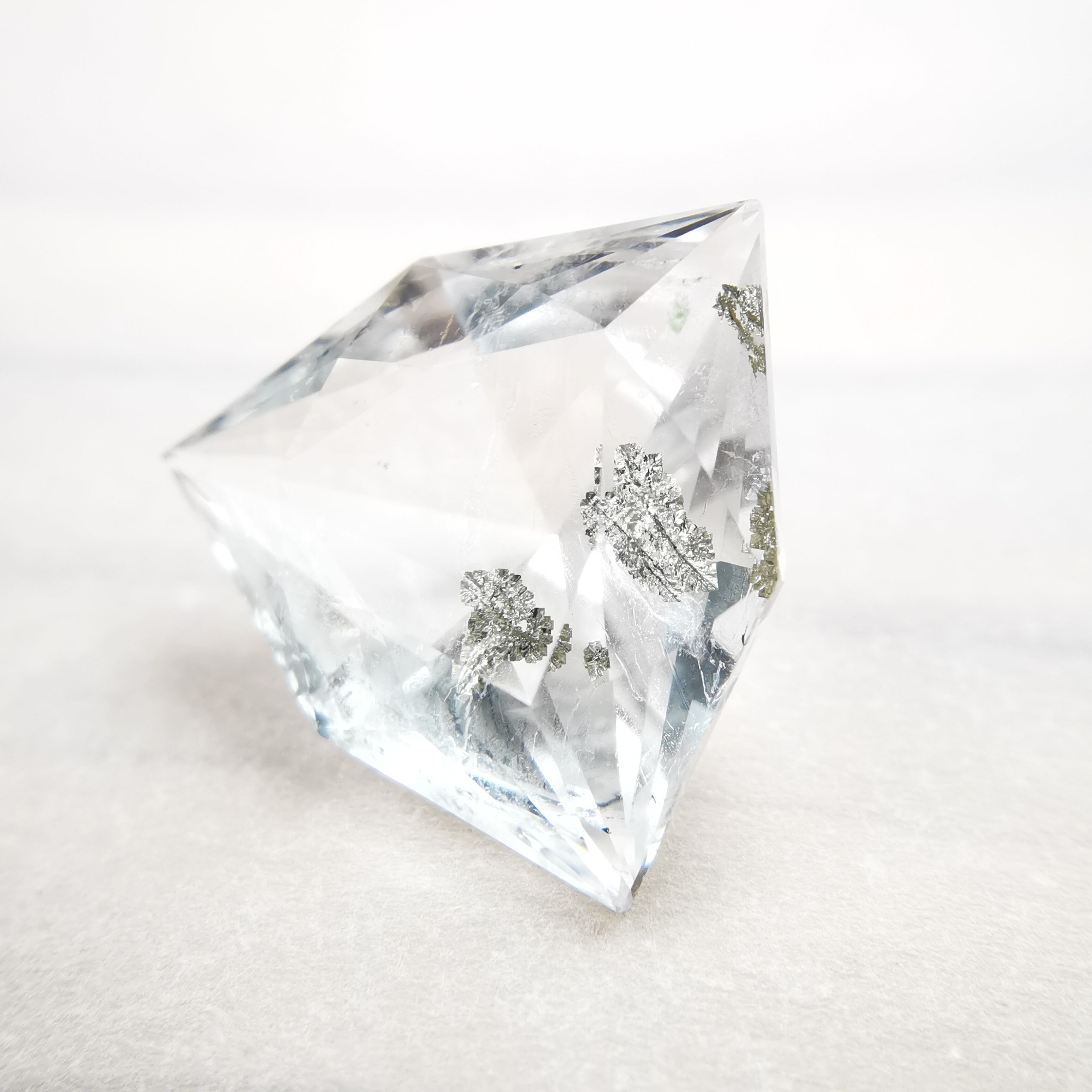 羽のような金属光沢のマーカサイトが、ヒラヒラと水晶の中に浮いているような一石です。