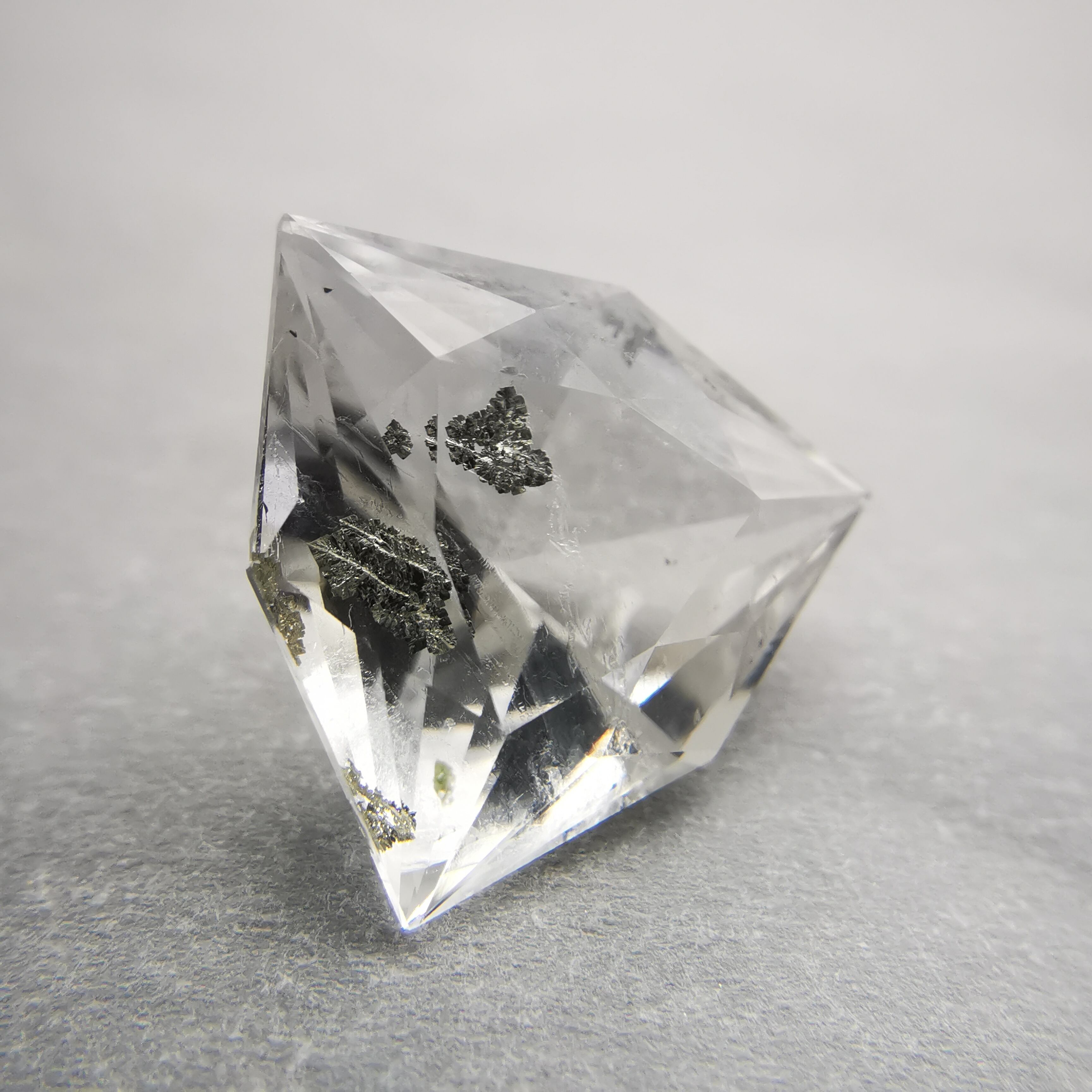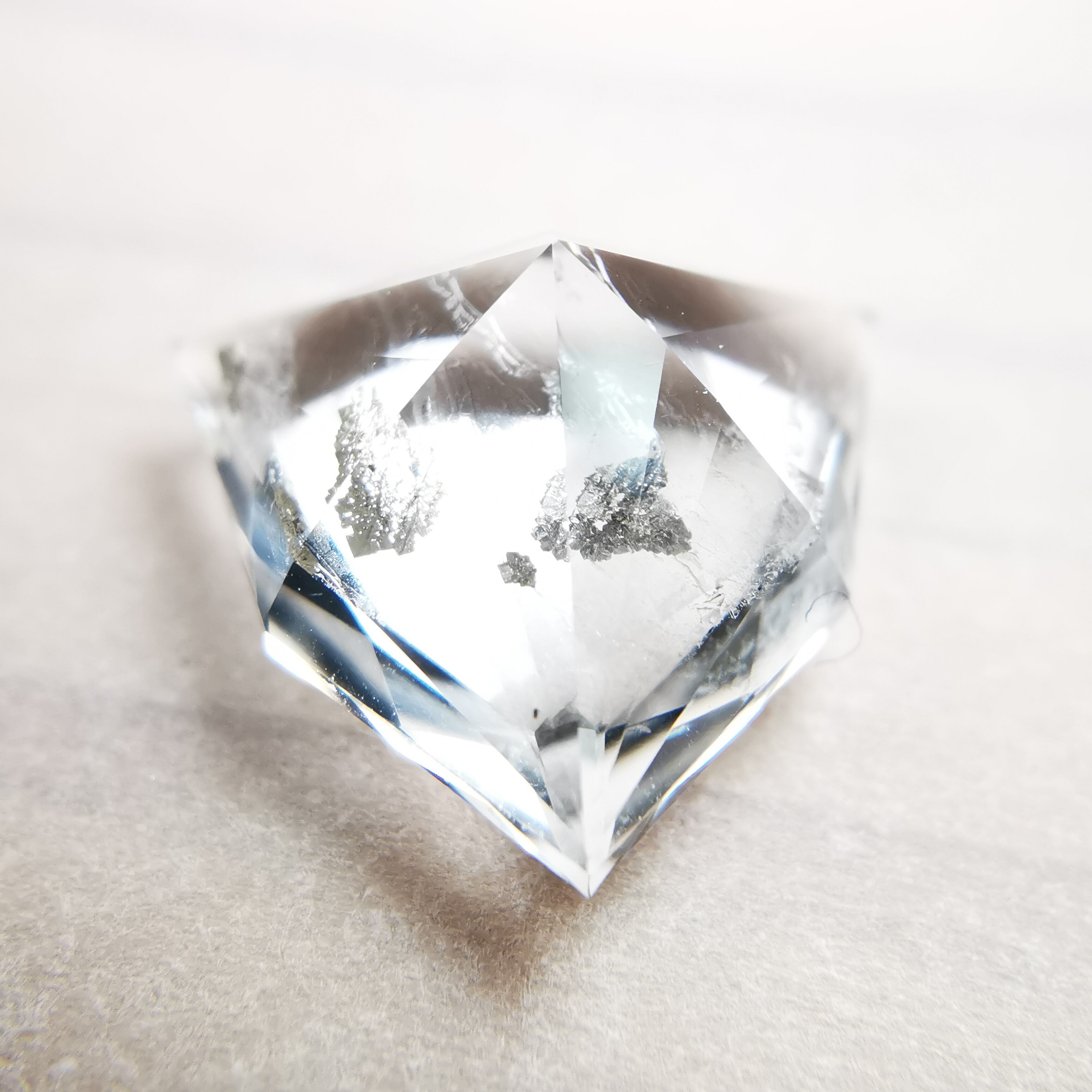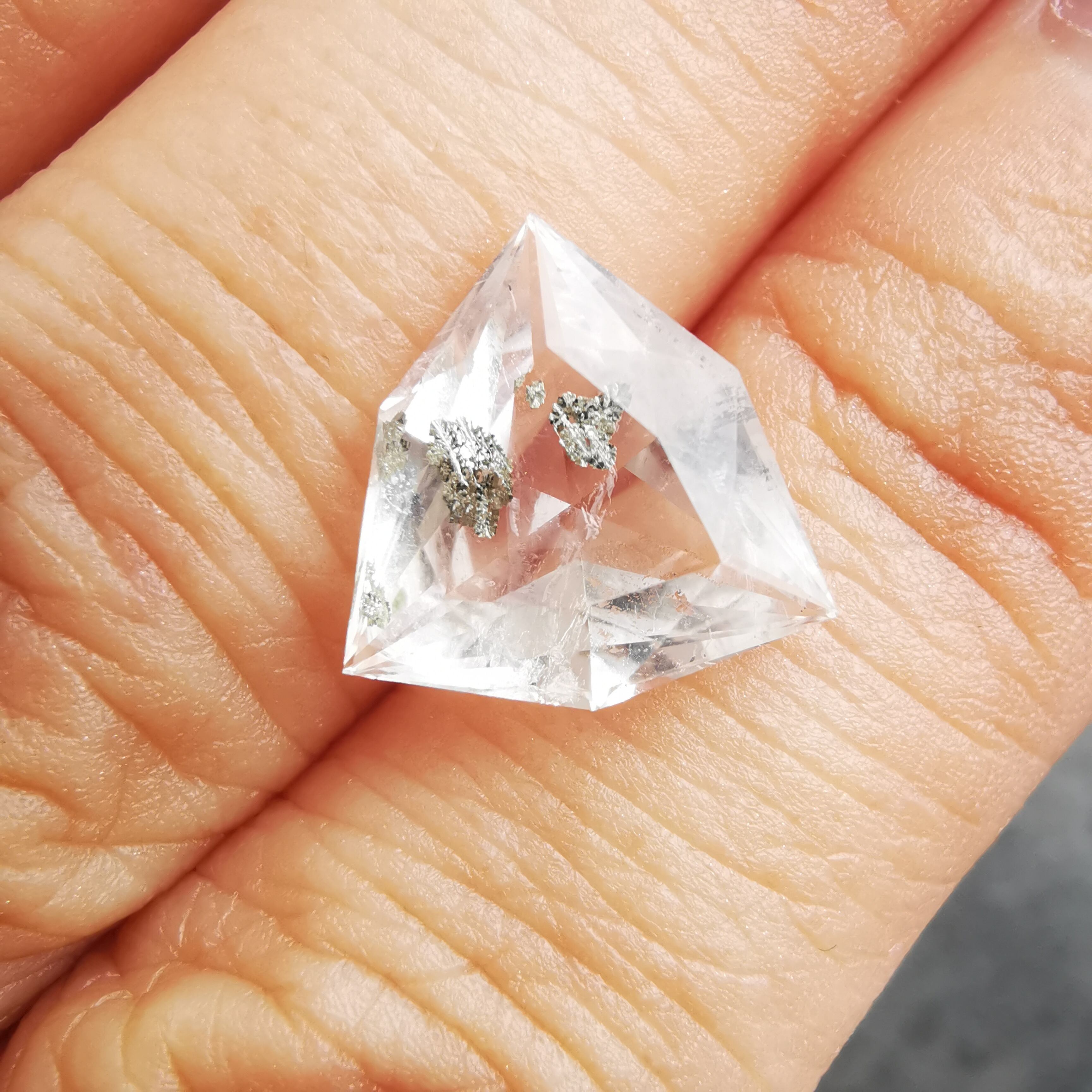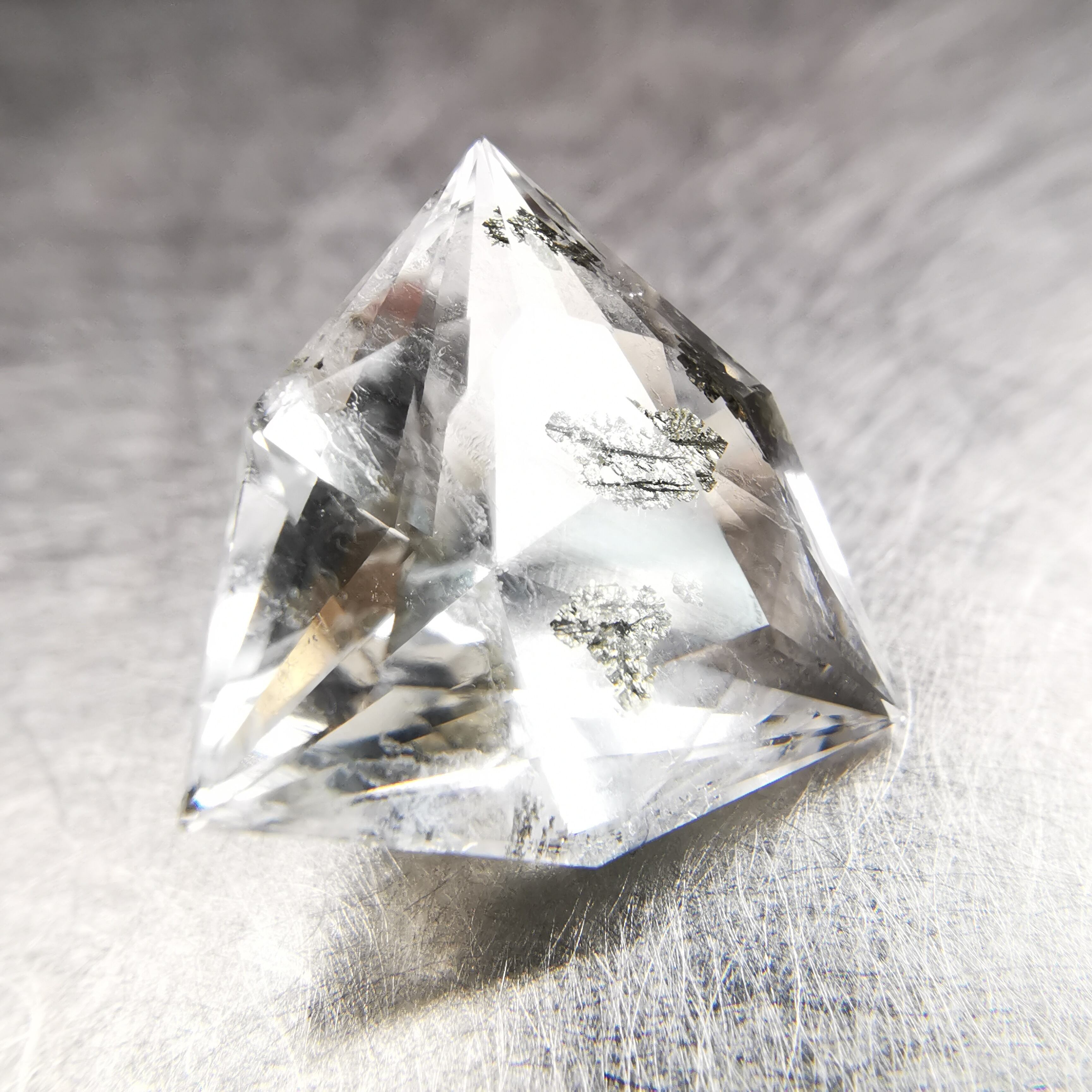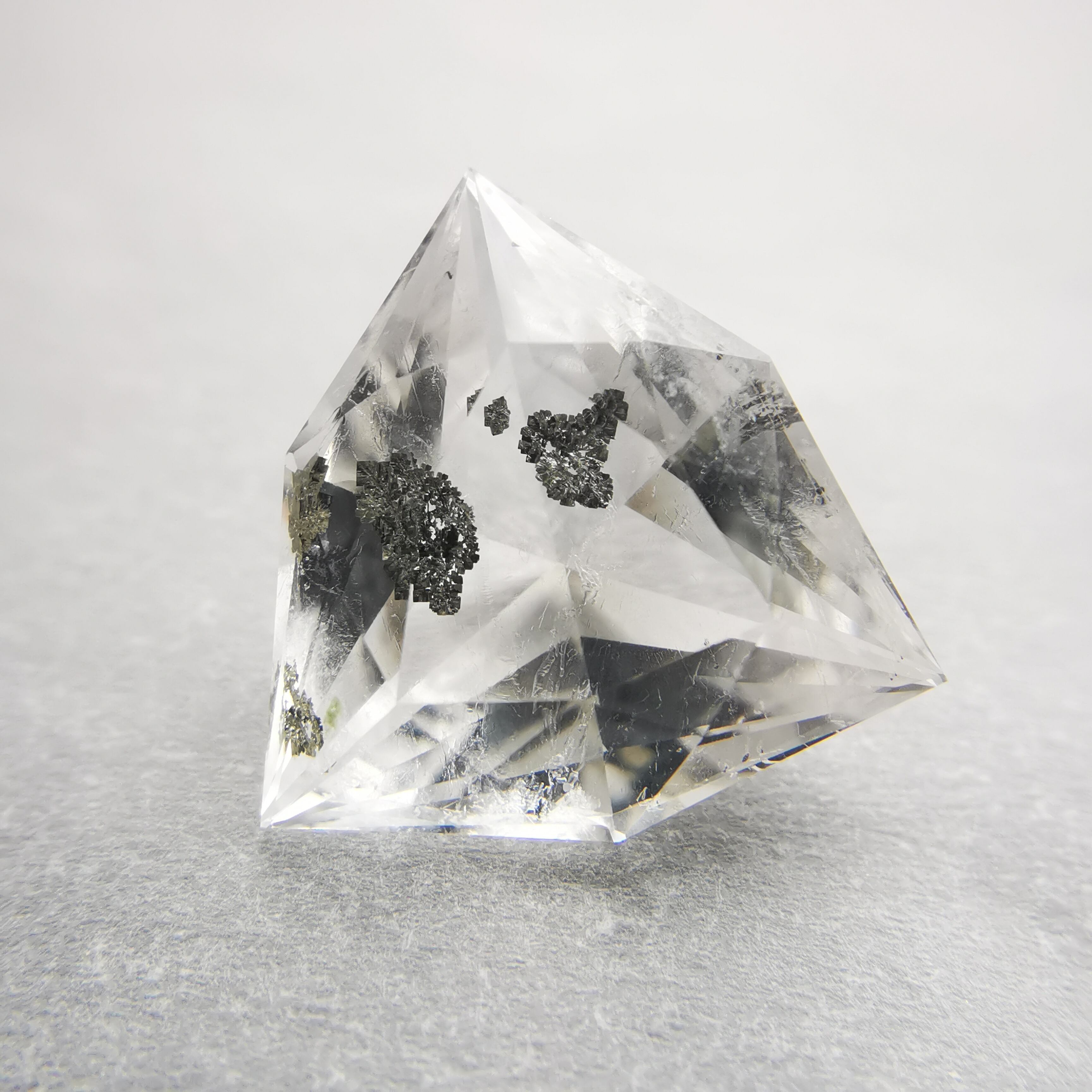 羽のような金属光沢のマーカサイトが、ヒラヒラと水晶の中に浮いているような一石です。
