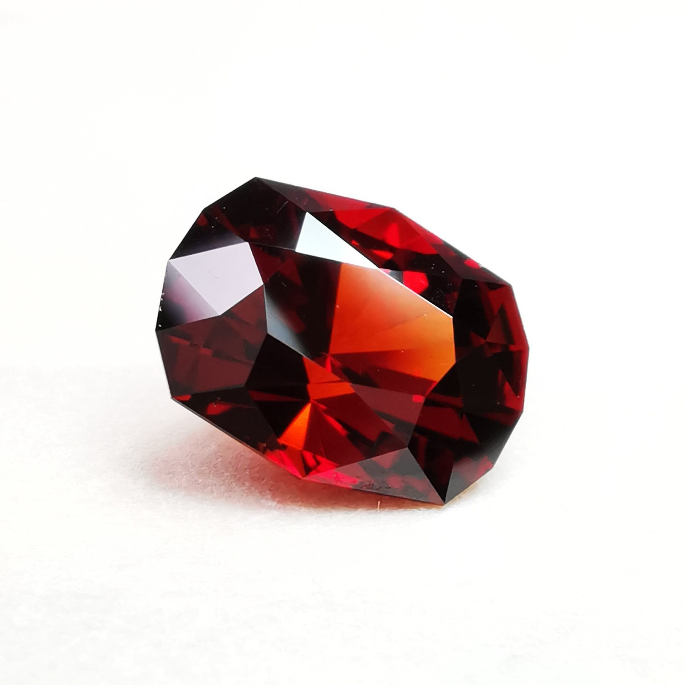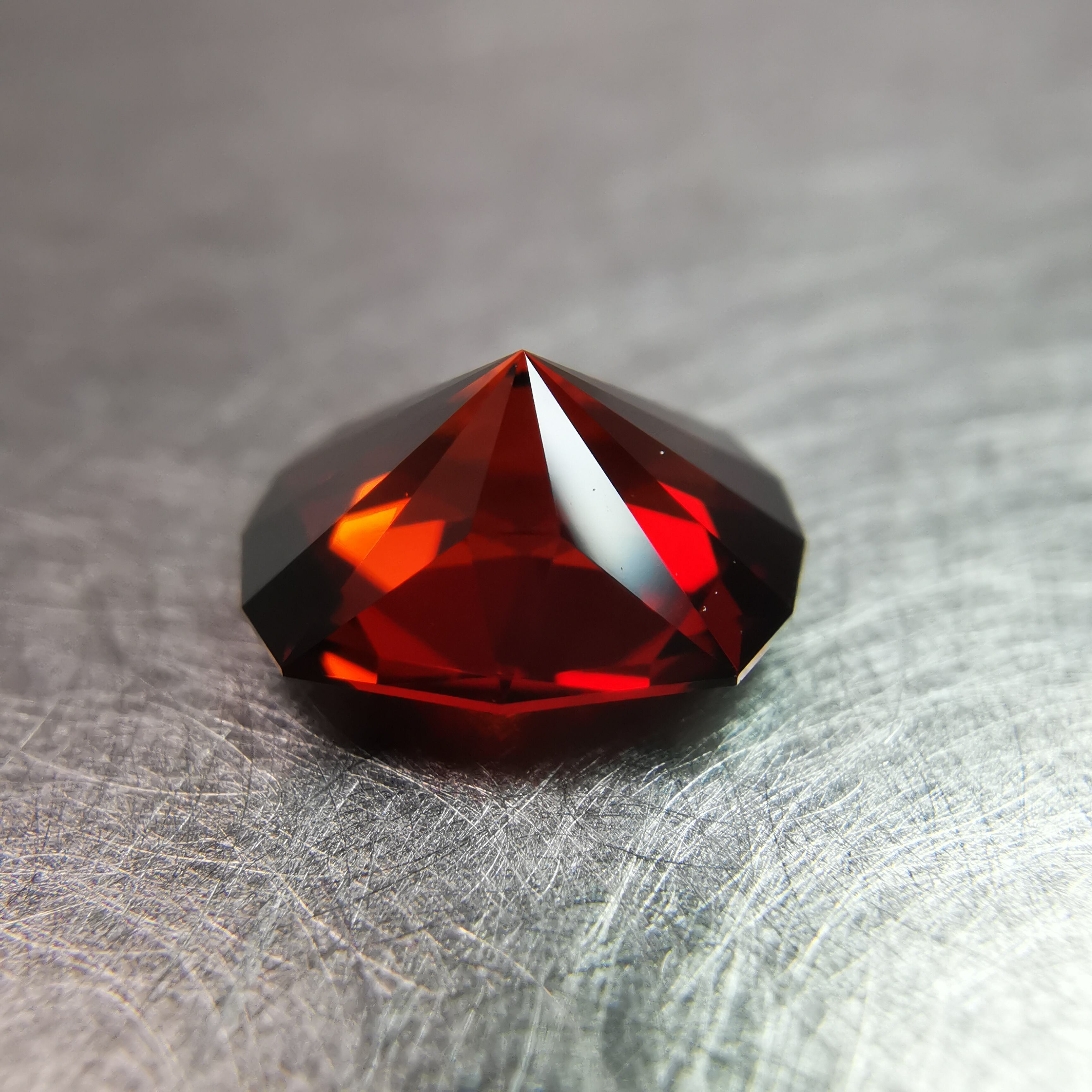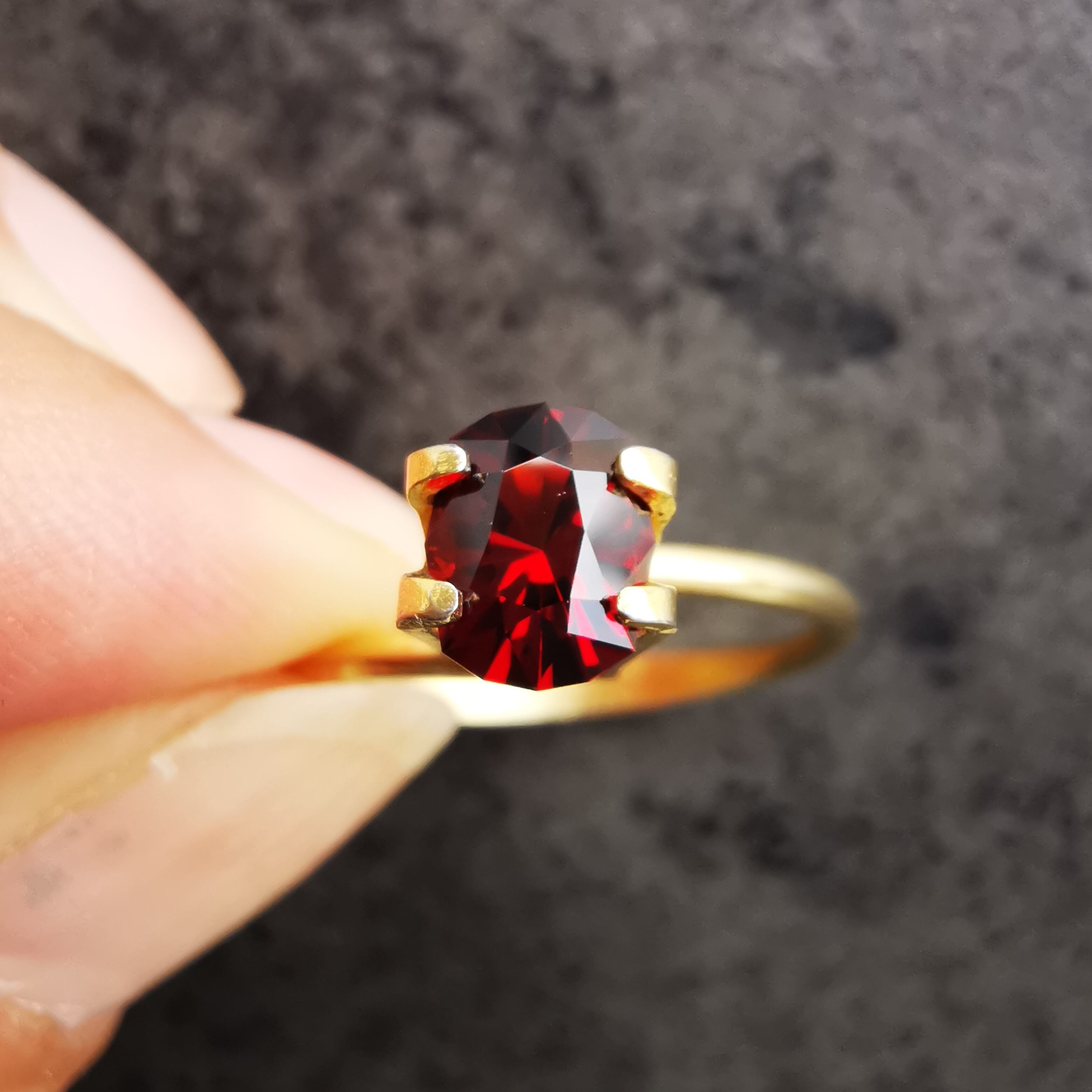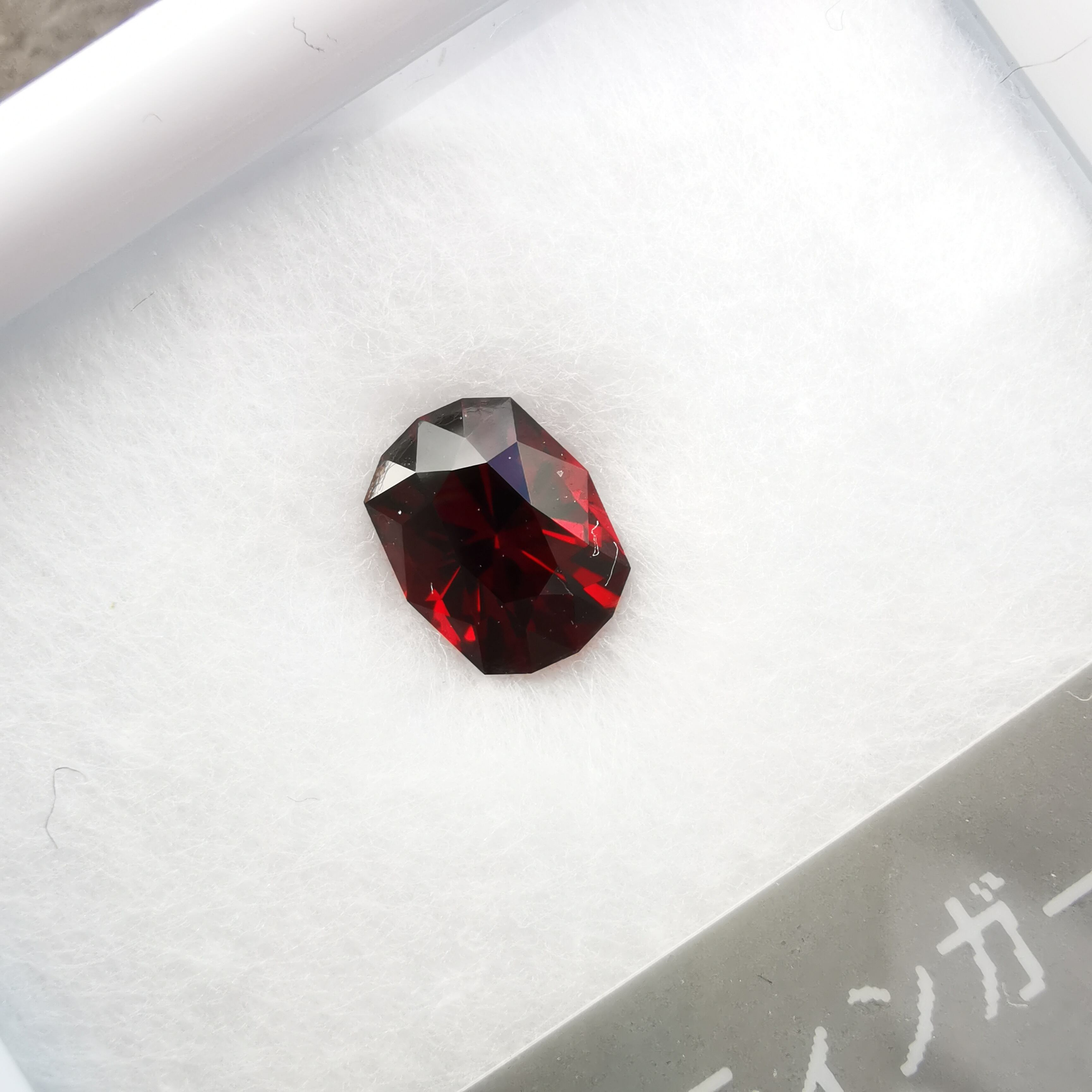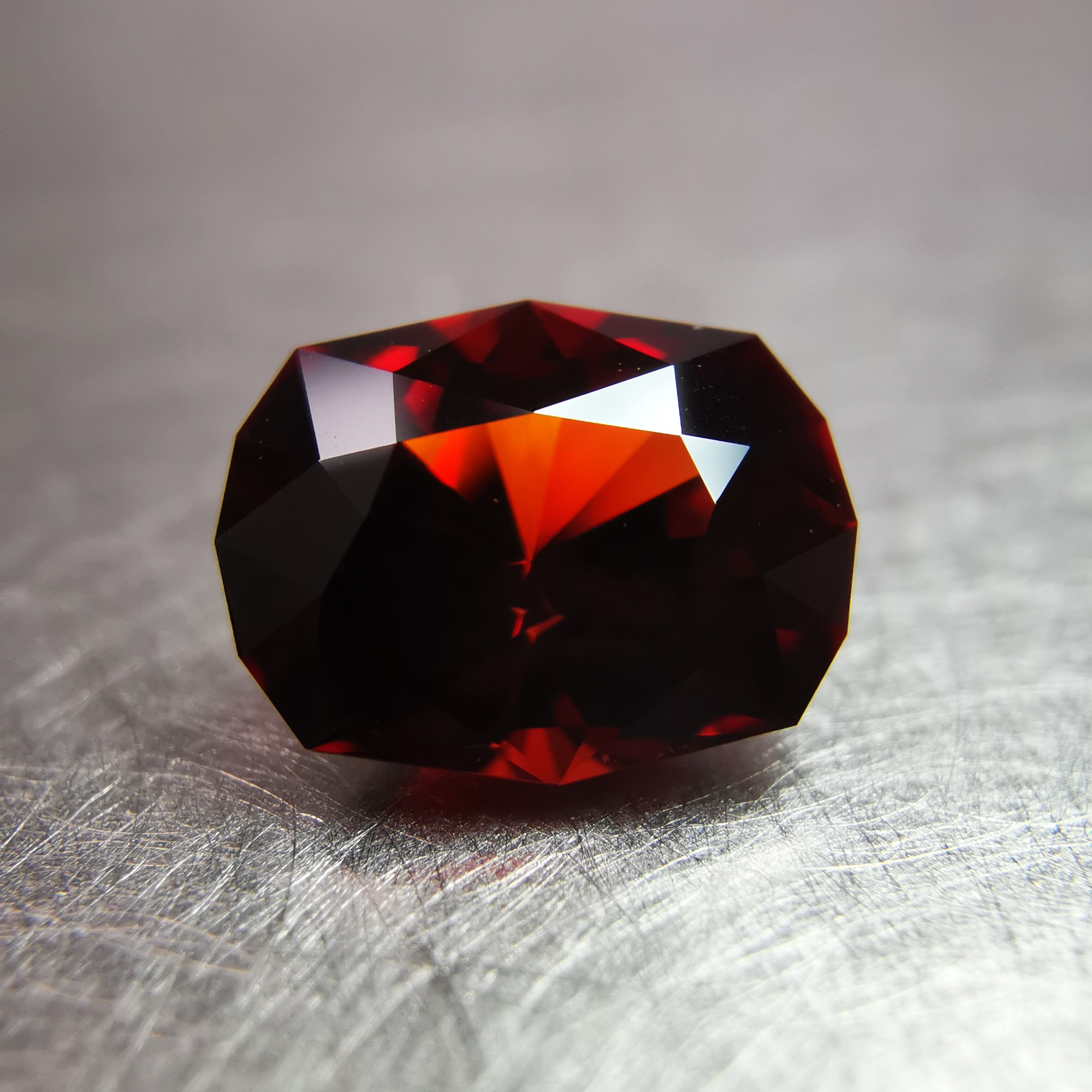 暗い石の中から、朱色寄りの鮮やかな赤が、ほとばしるようにきらめくガーネットです。