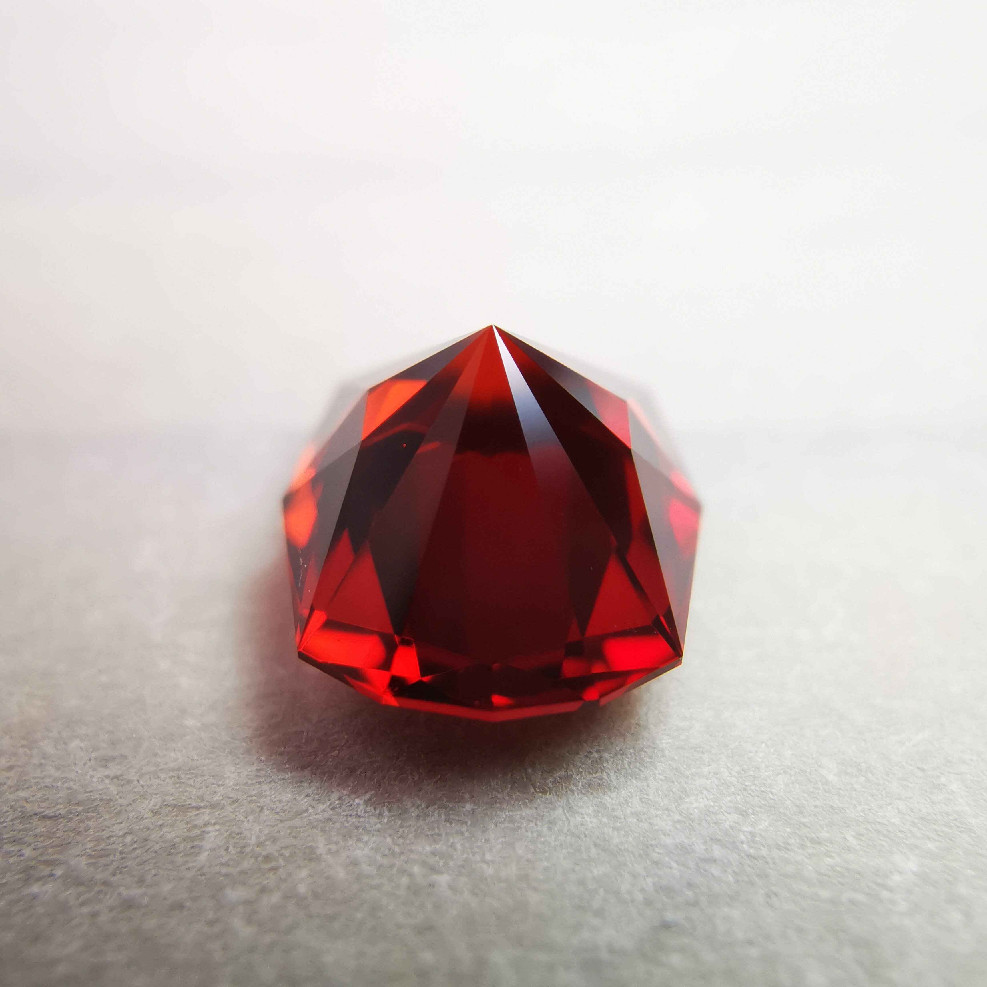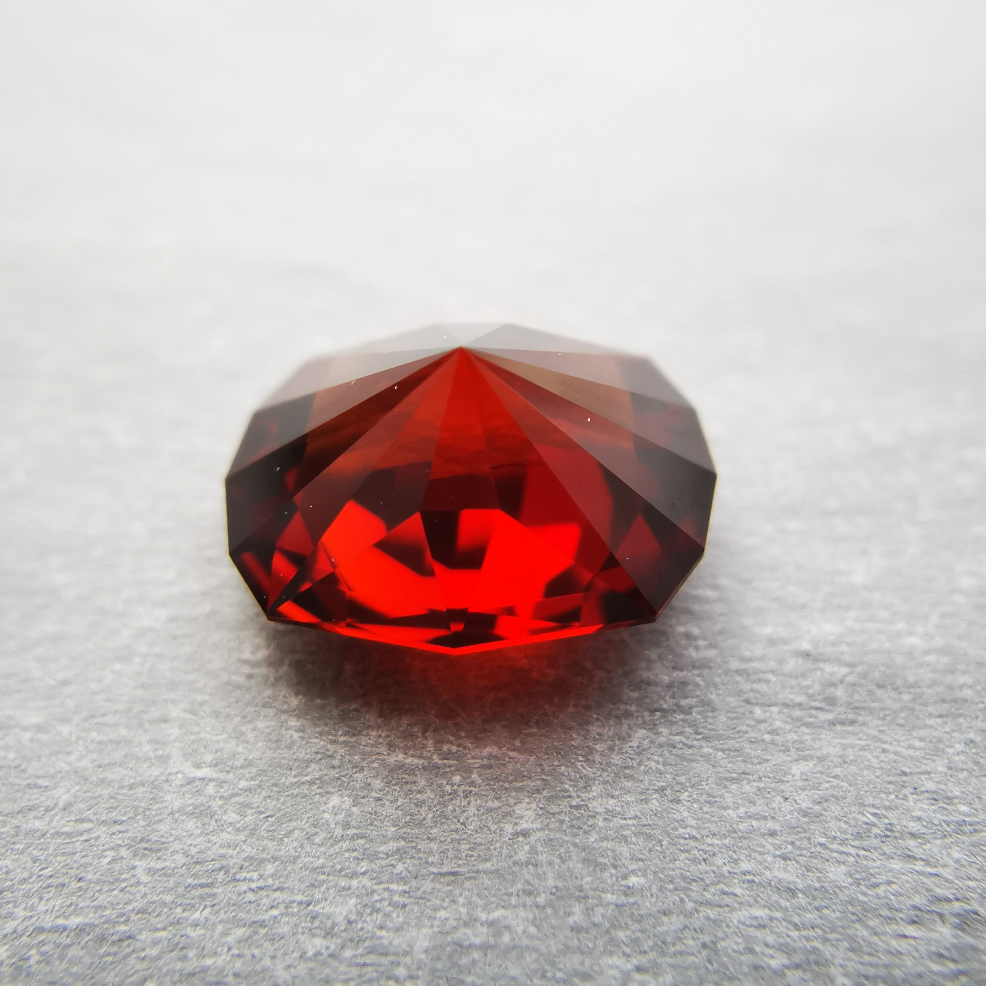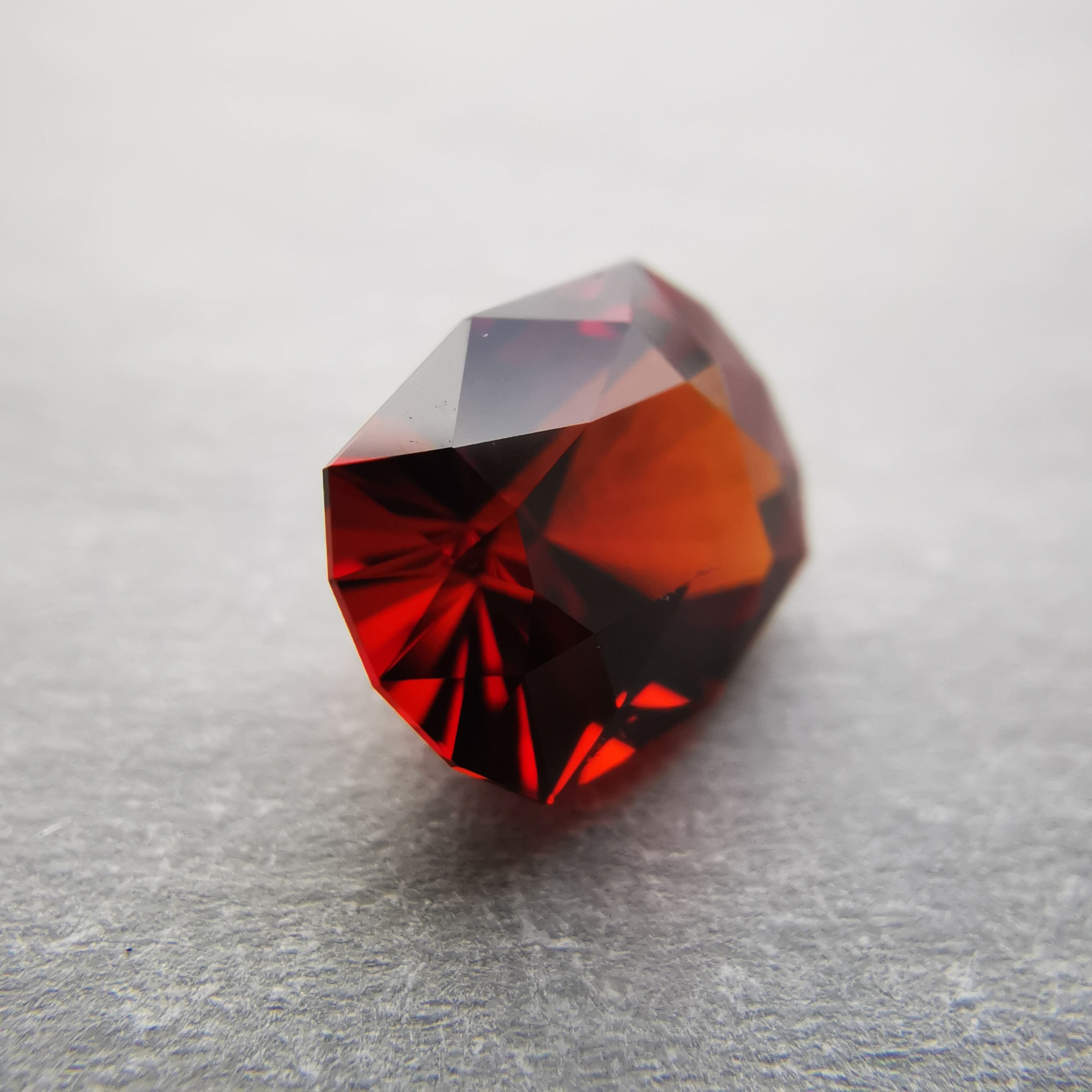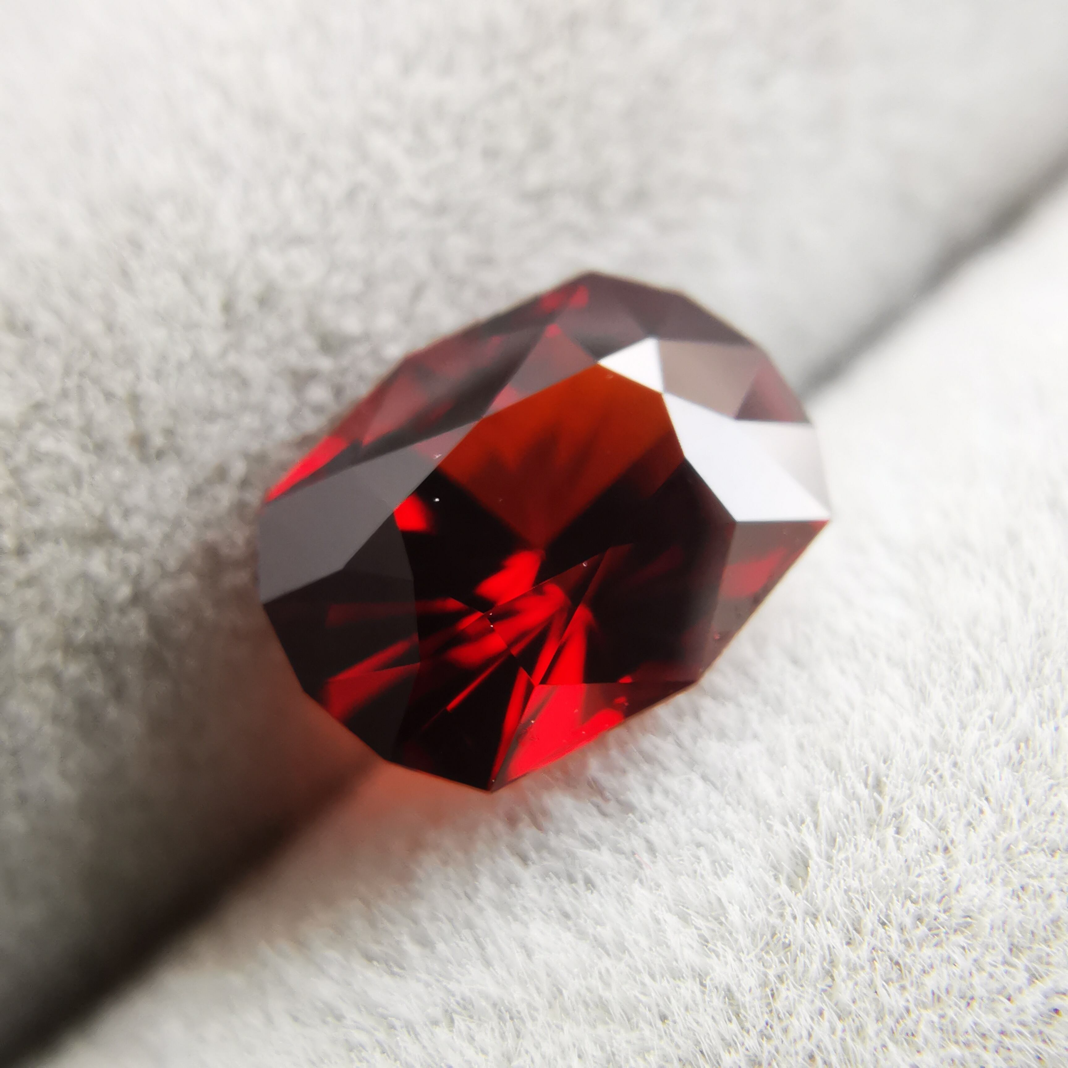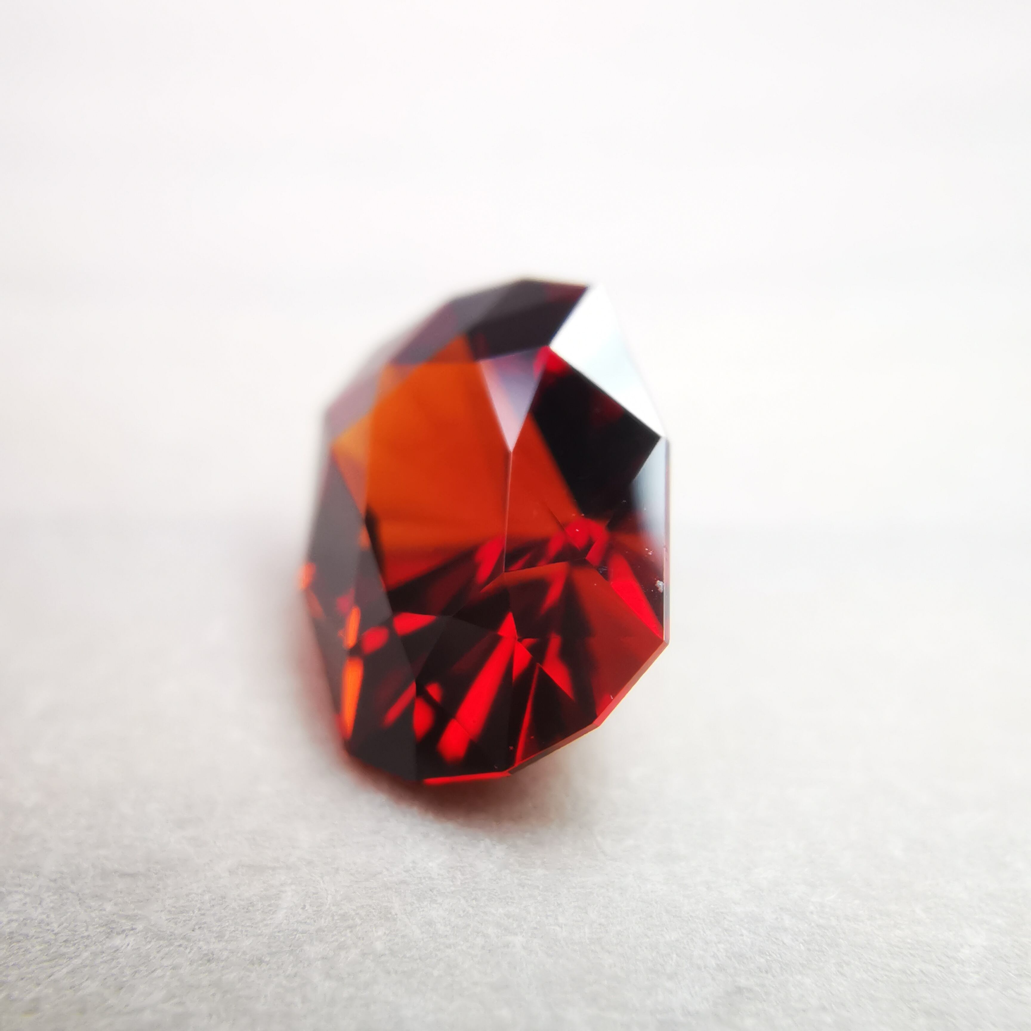 暗い石の中から、朱色寄りの鮮やかな赤が、ほとばしるようにきらめくガーネットです。
