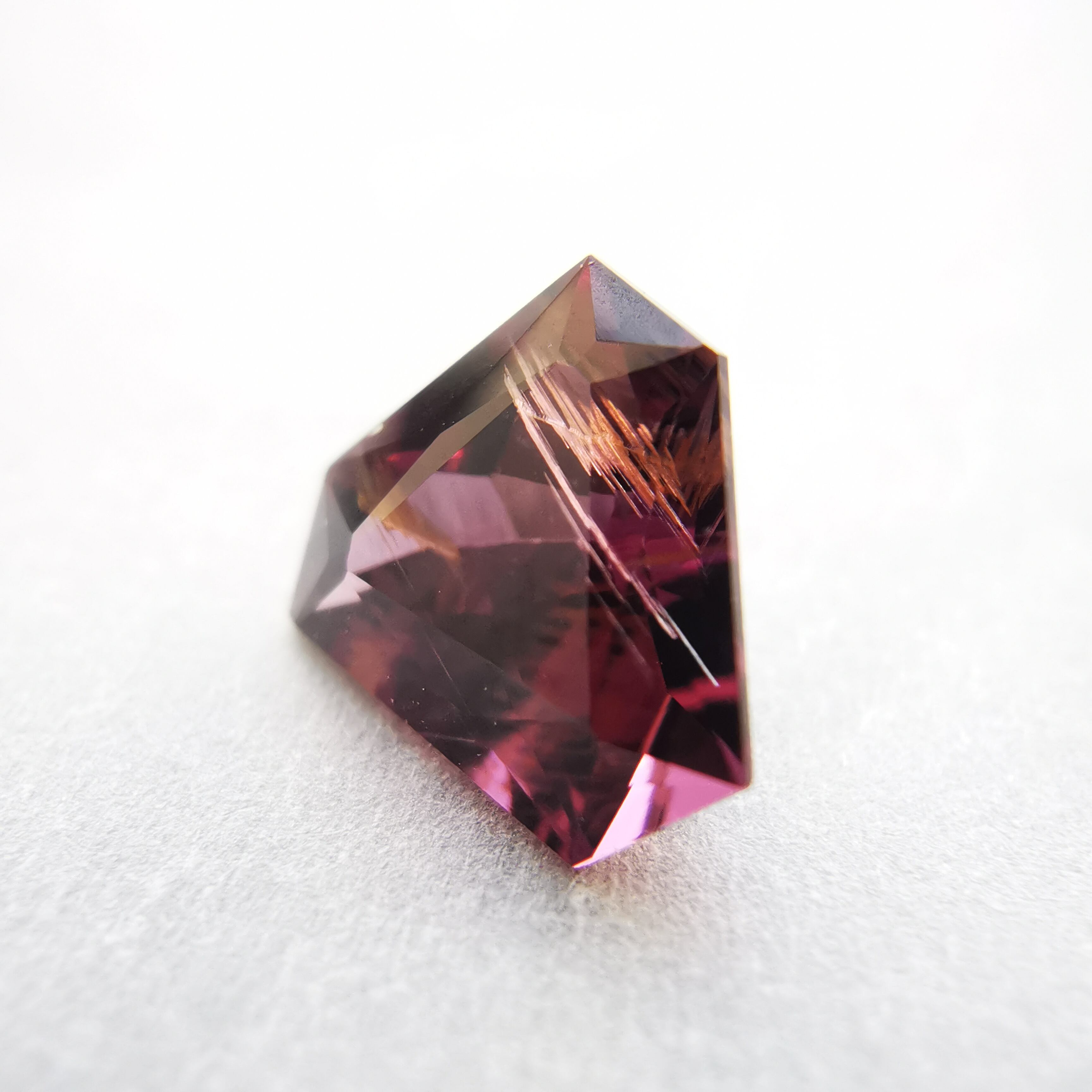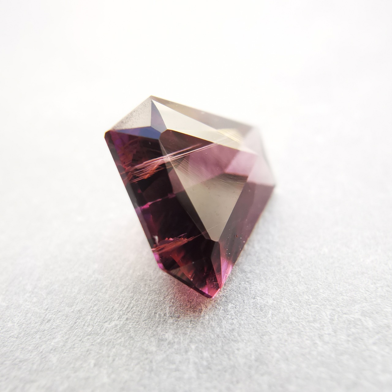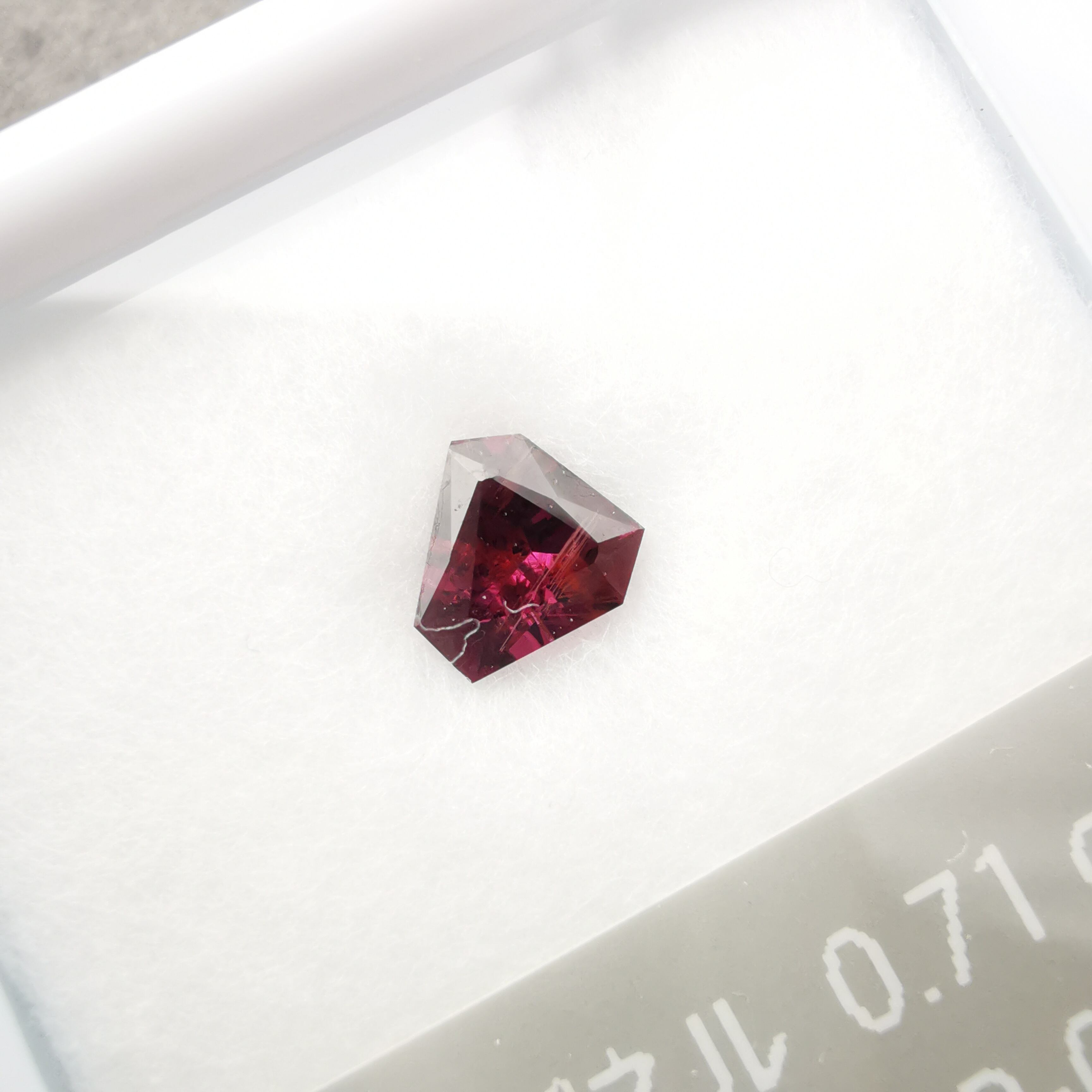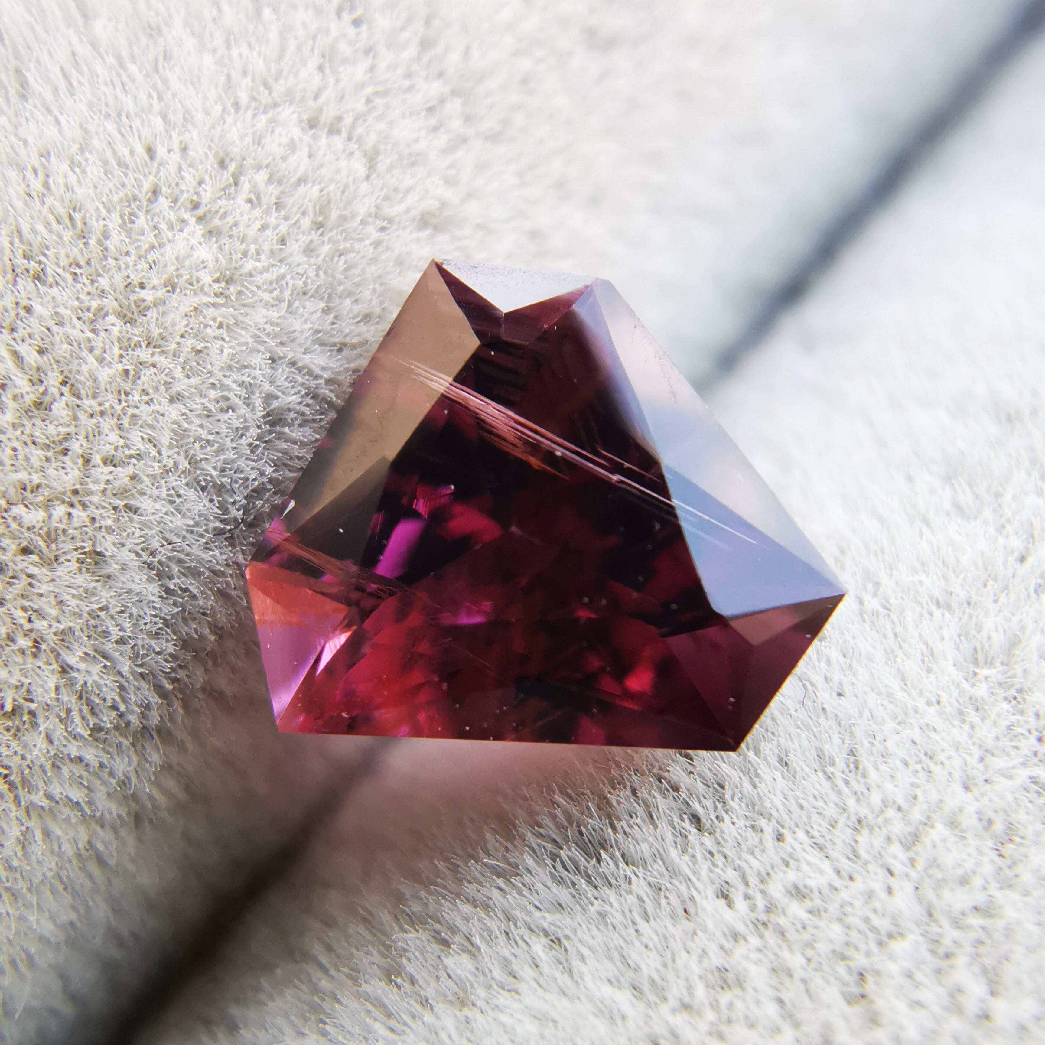 深いワインレッドからチラチラとピンクがきらめくスピネルに、特徴的なインクルージョンが入っています。
