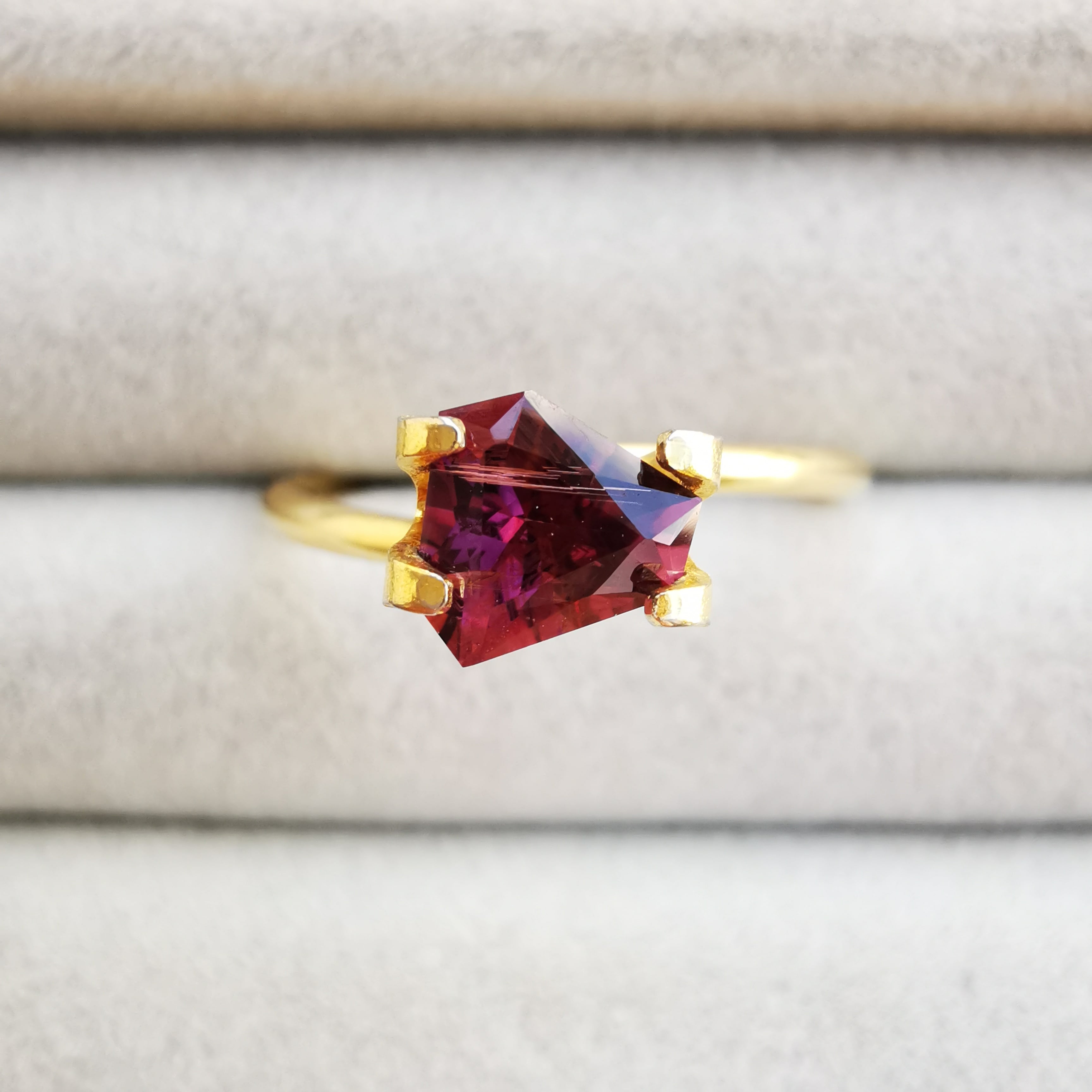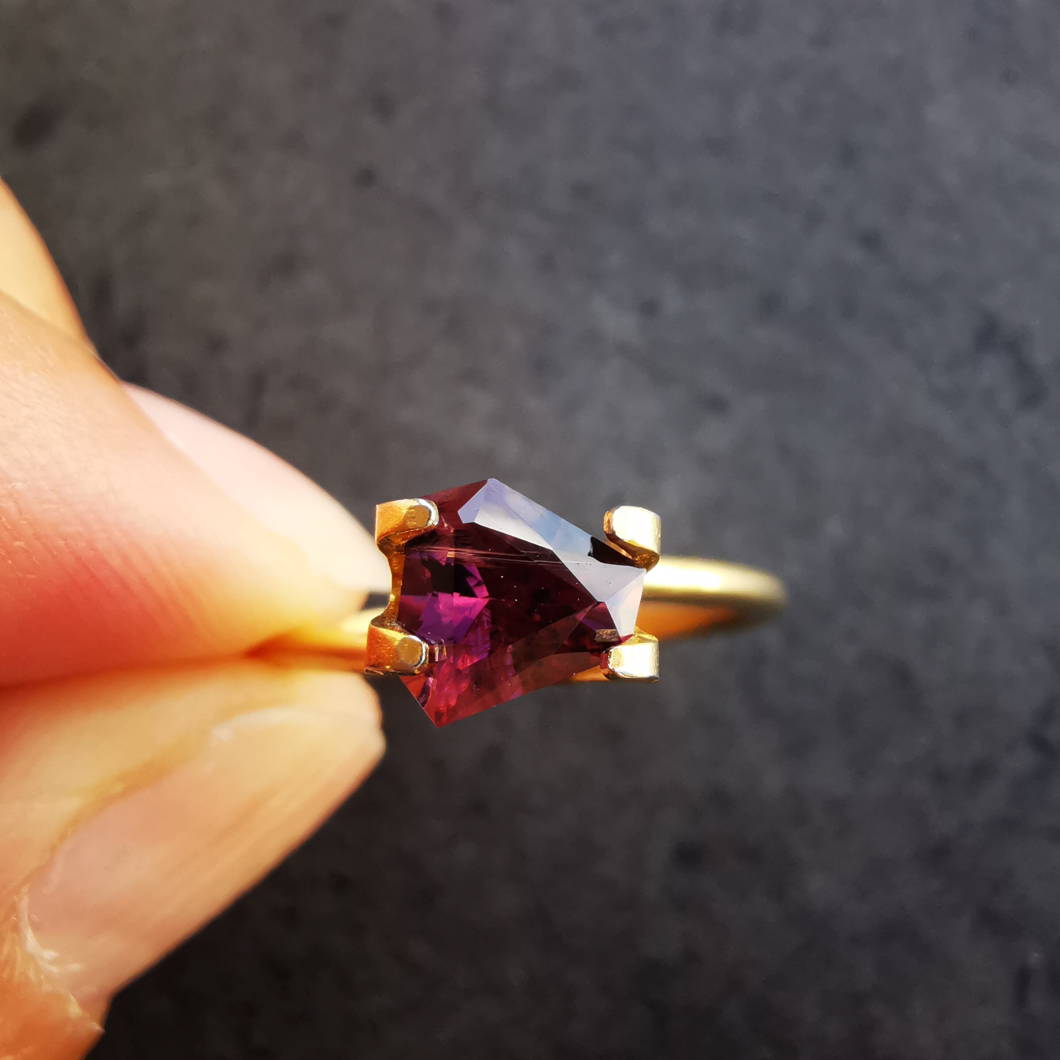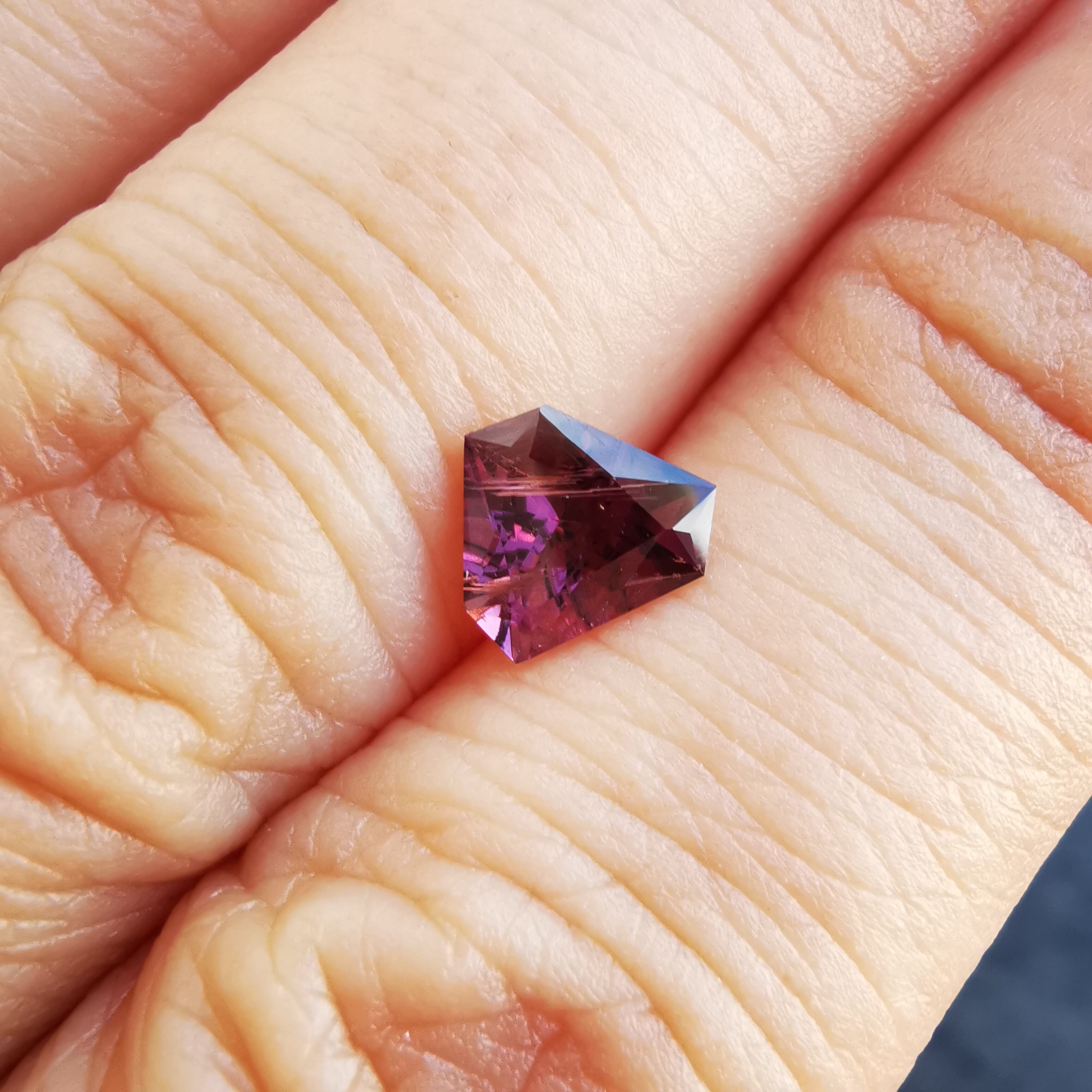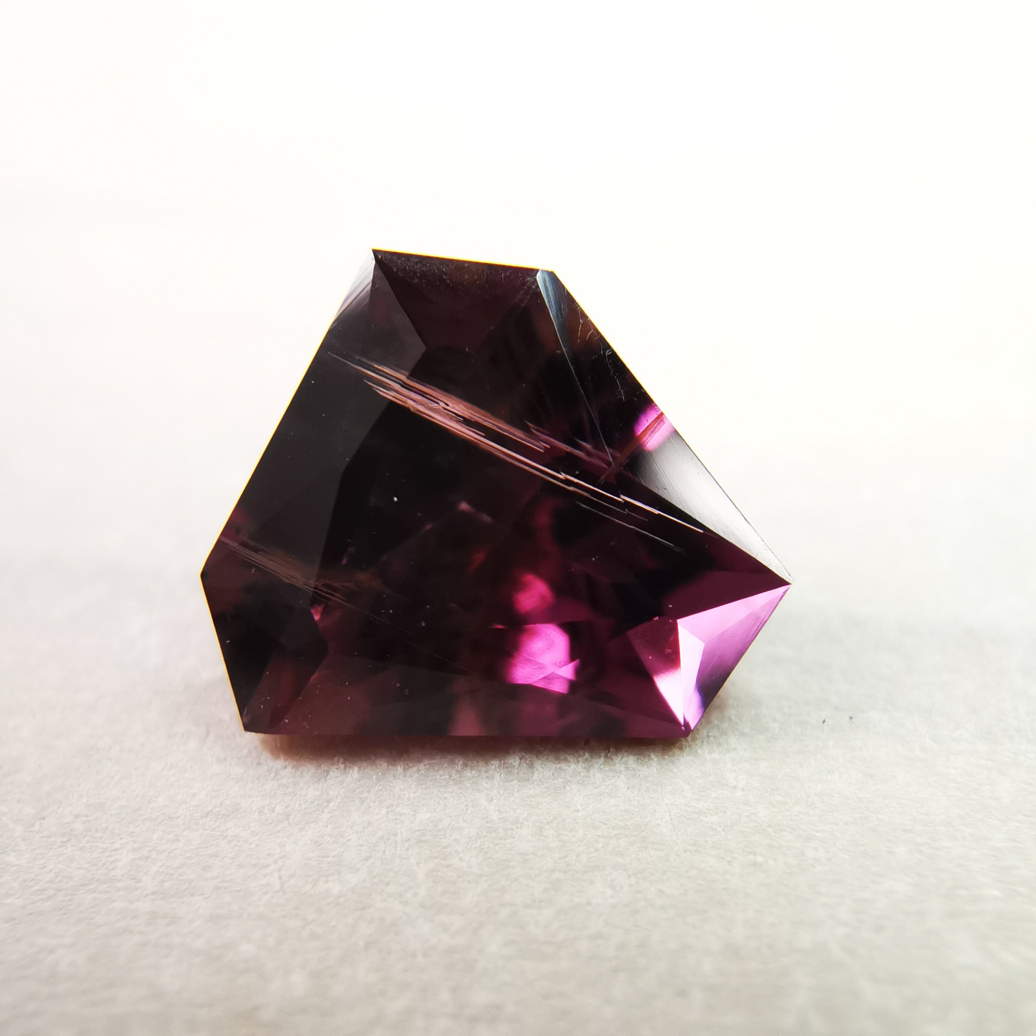 深いワインレッドからチラチラとピンクがきらめくスピネルに、特徴的なインクルージョンが入っています。