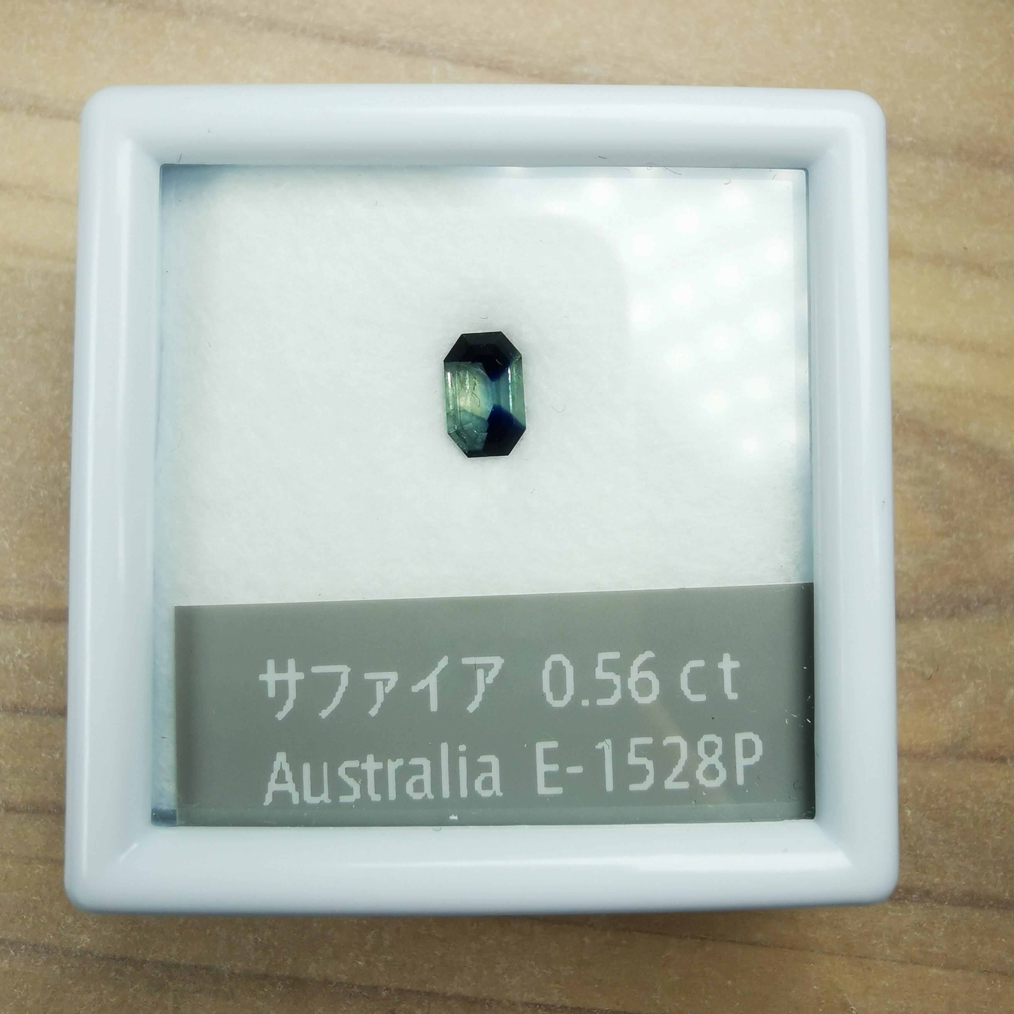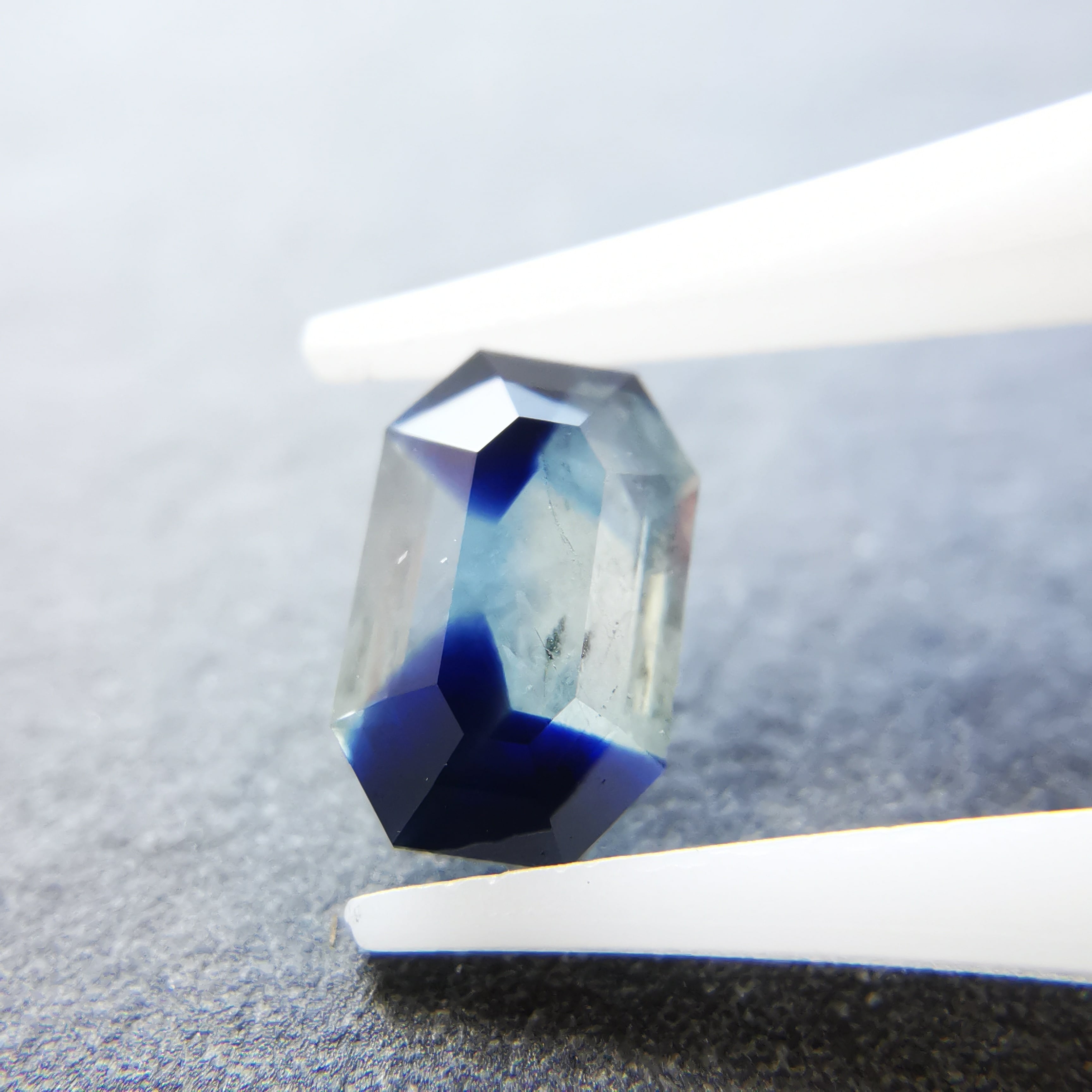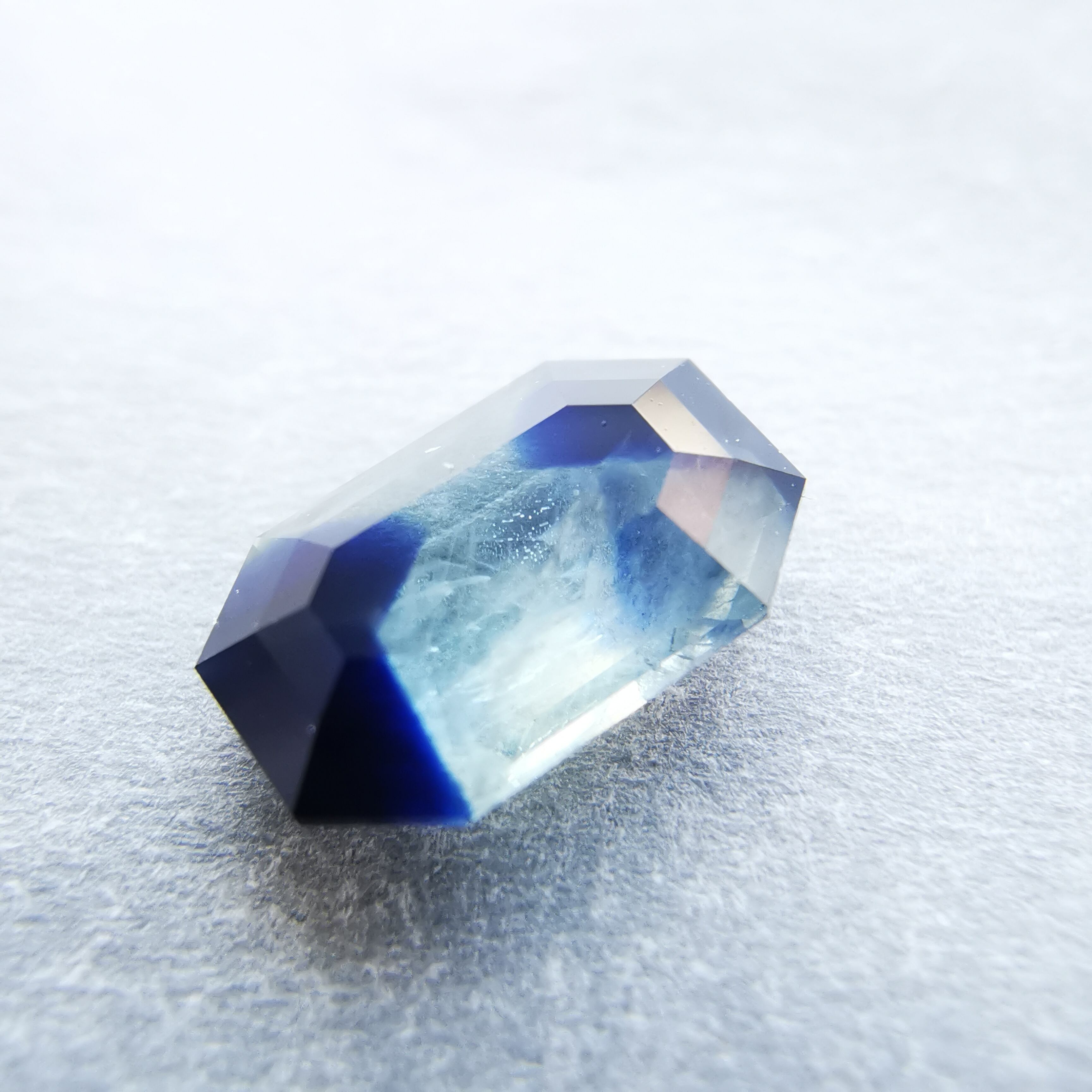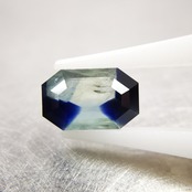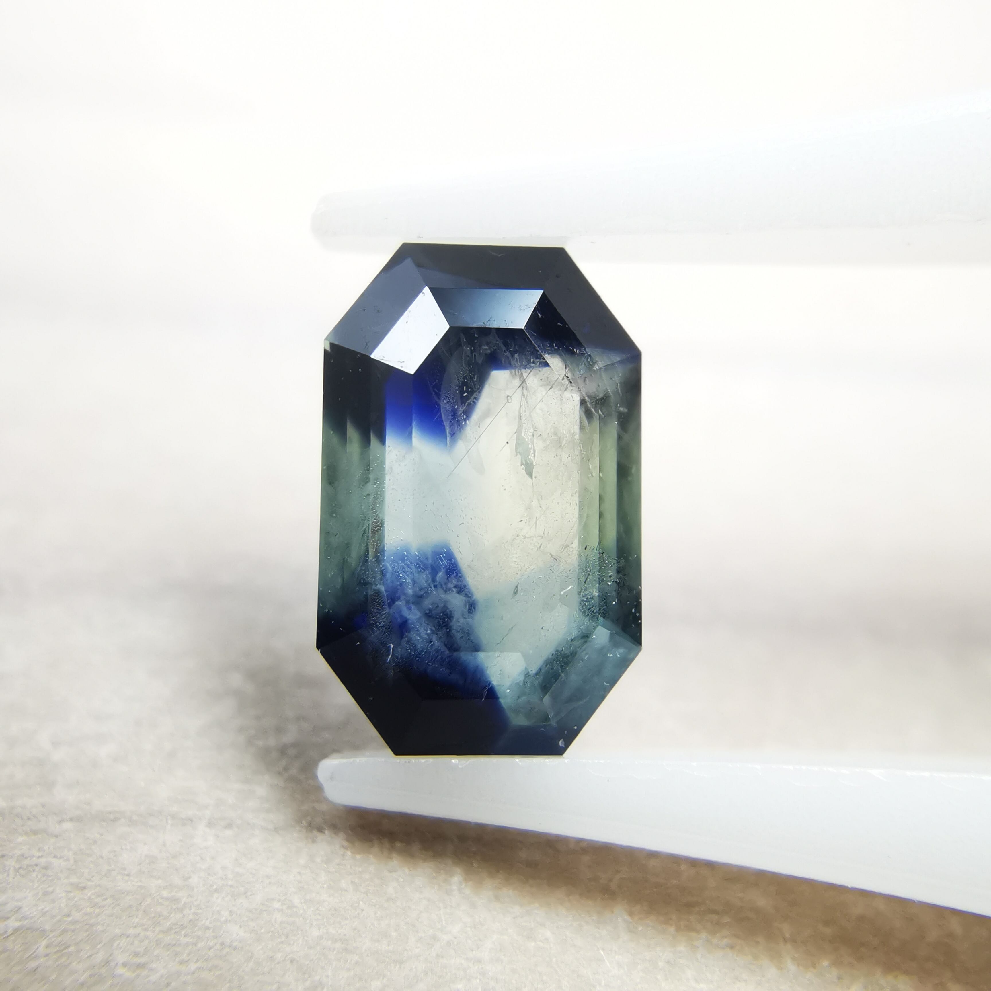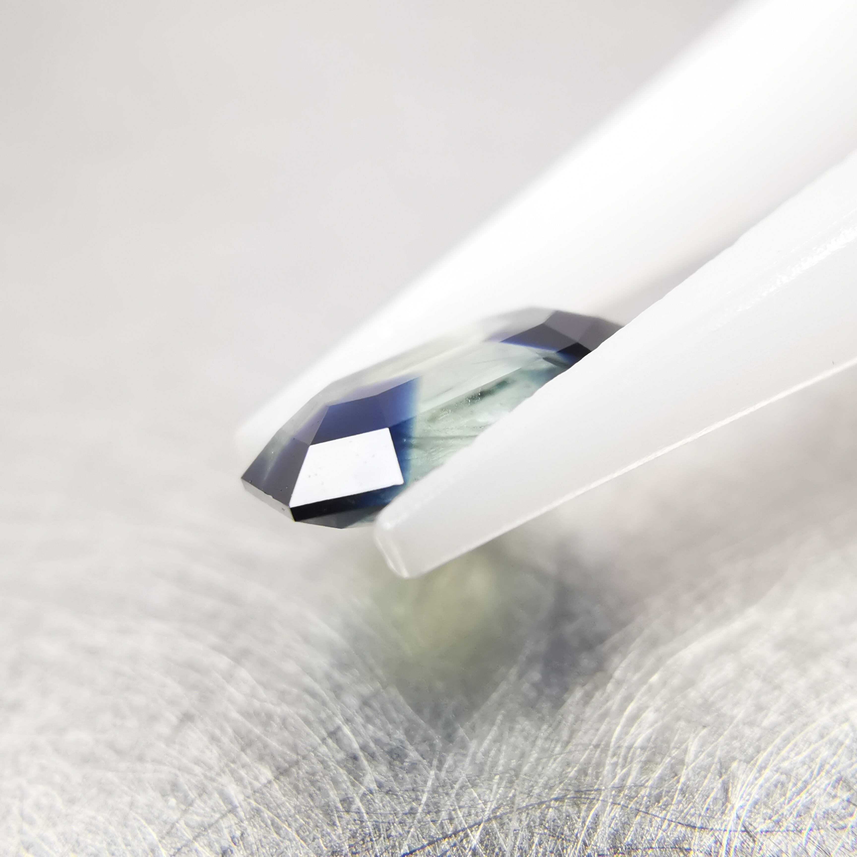 ごくごく薄いアイスグリーンに、濃紺が侵食するように入ったバイカラーのサファイアです。