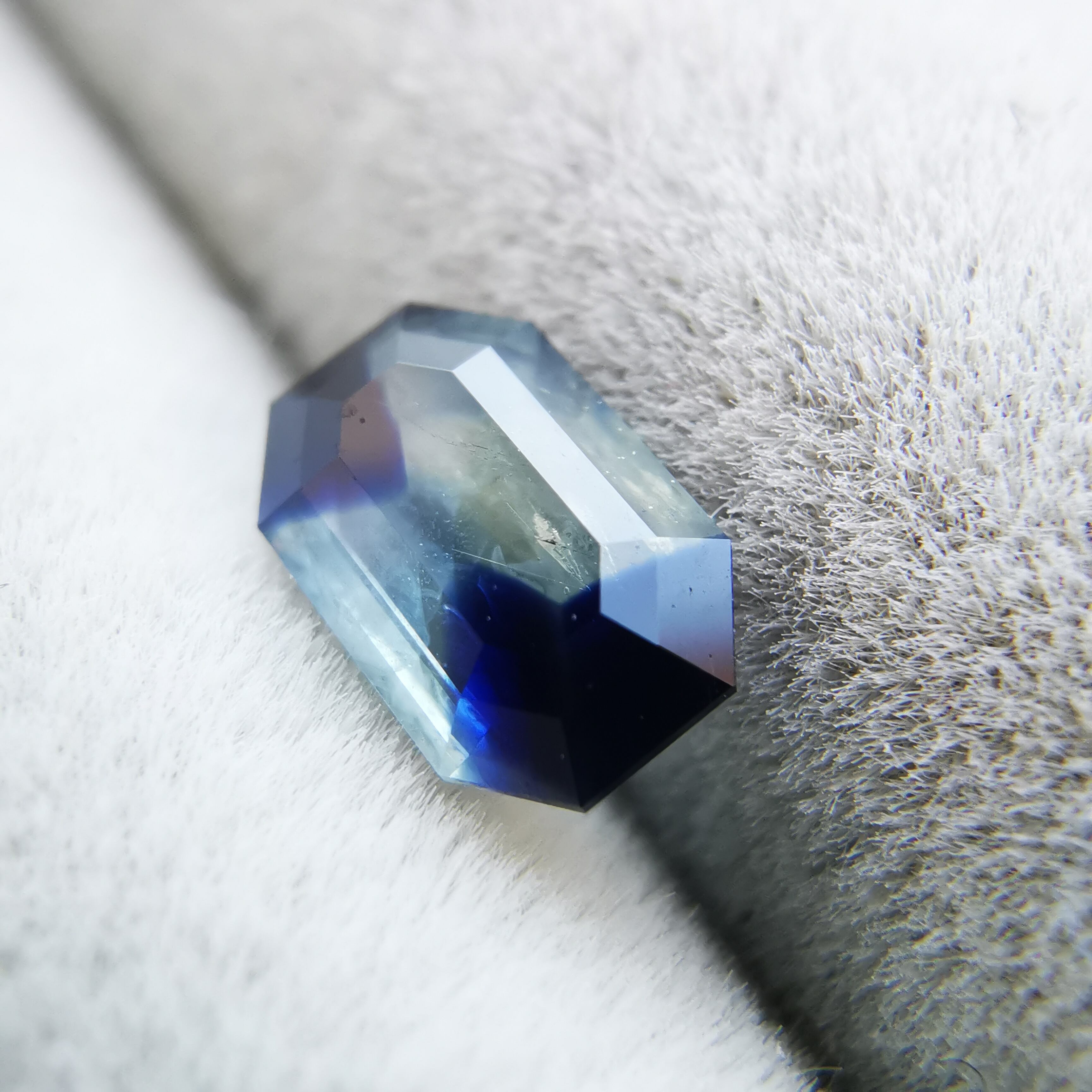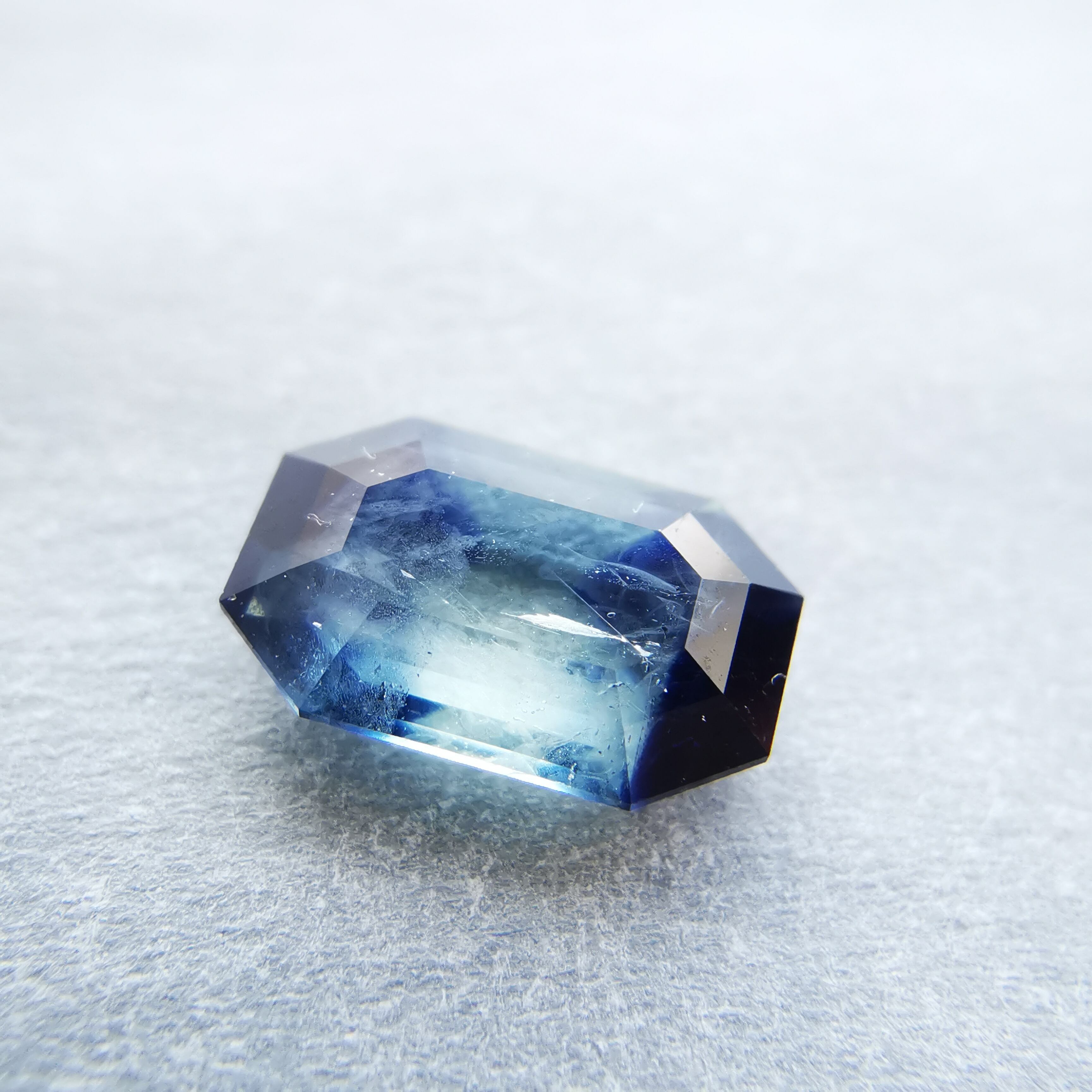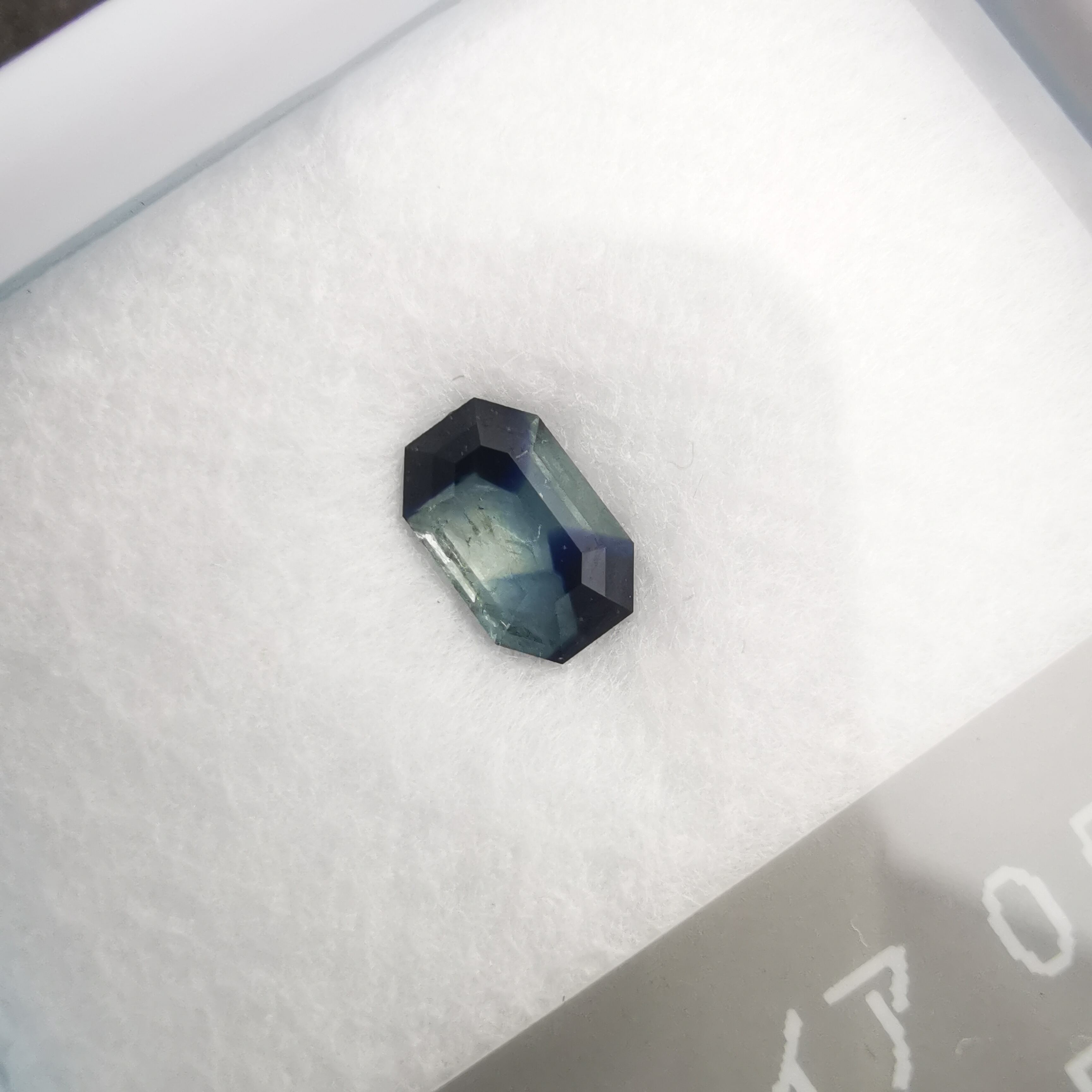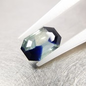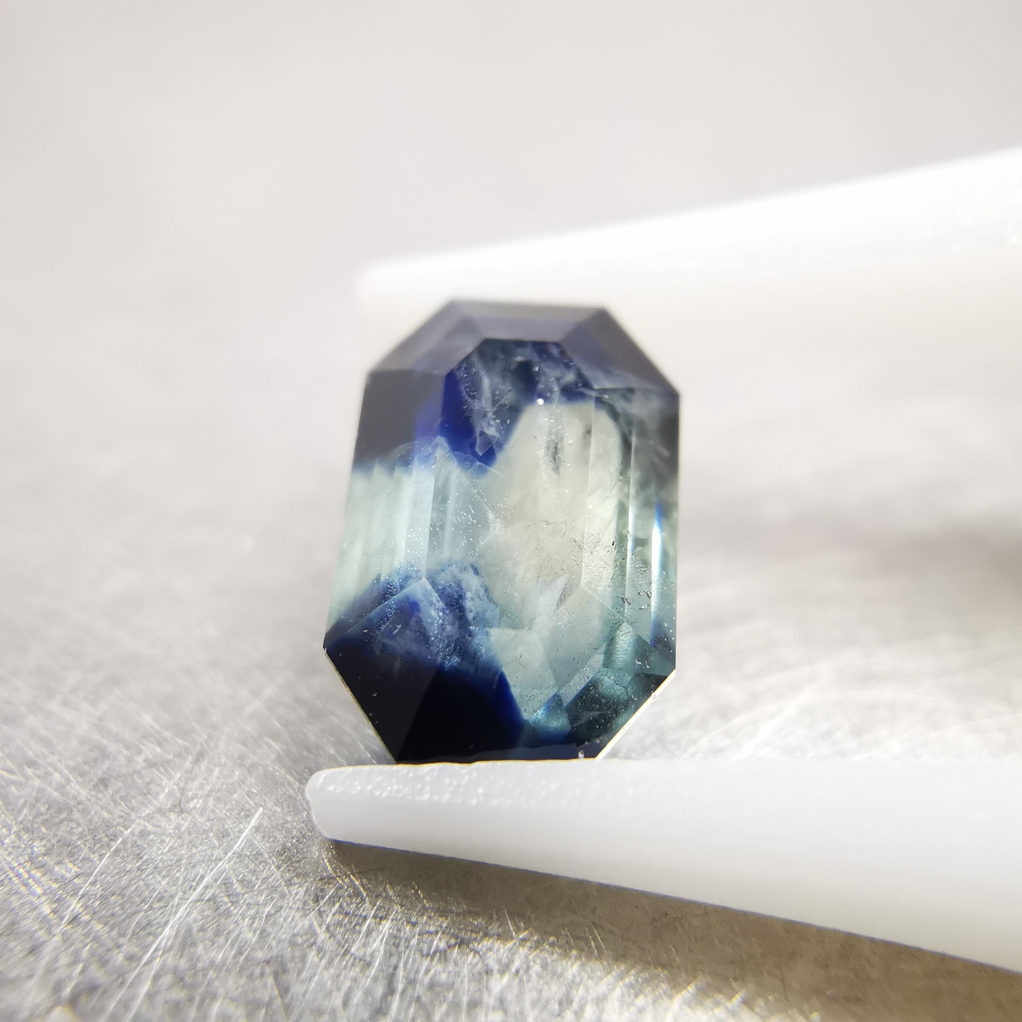 ごくごく薄いアイスグリーンに、濃紺が侵食するように入ったバイカラーのサファイアです。