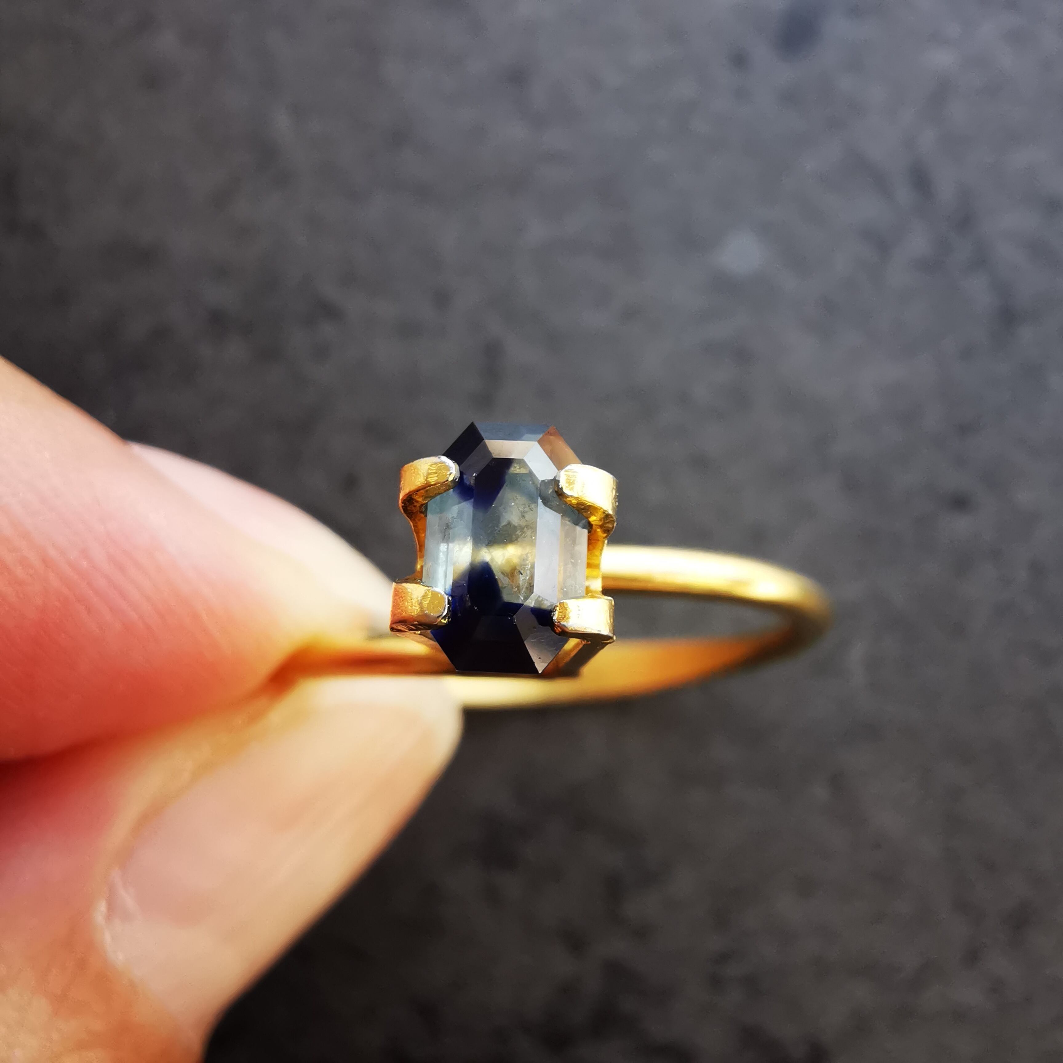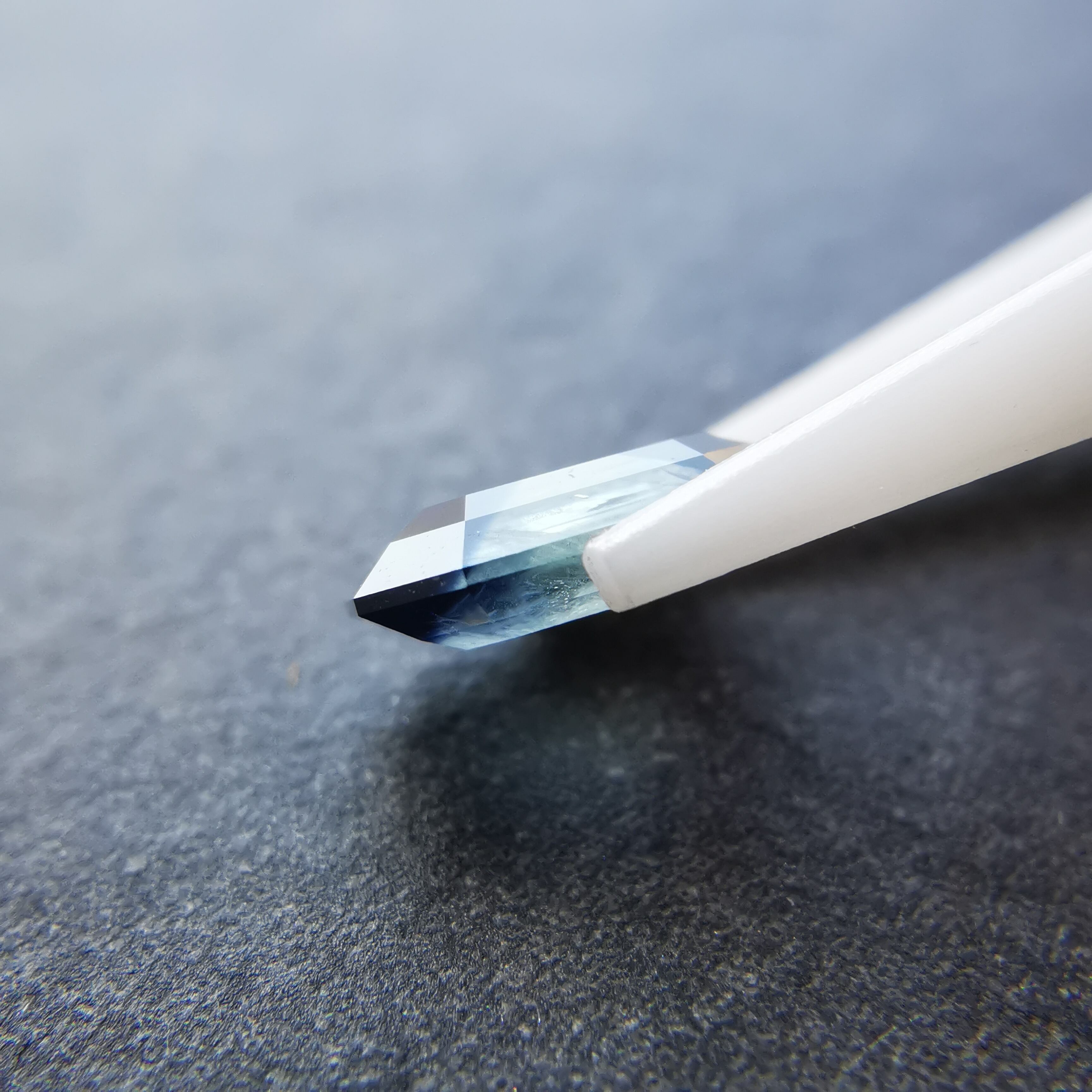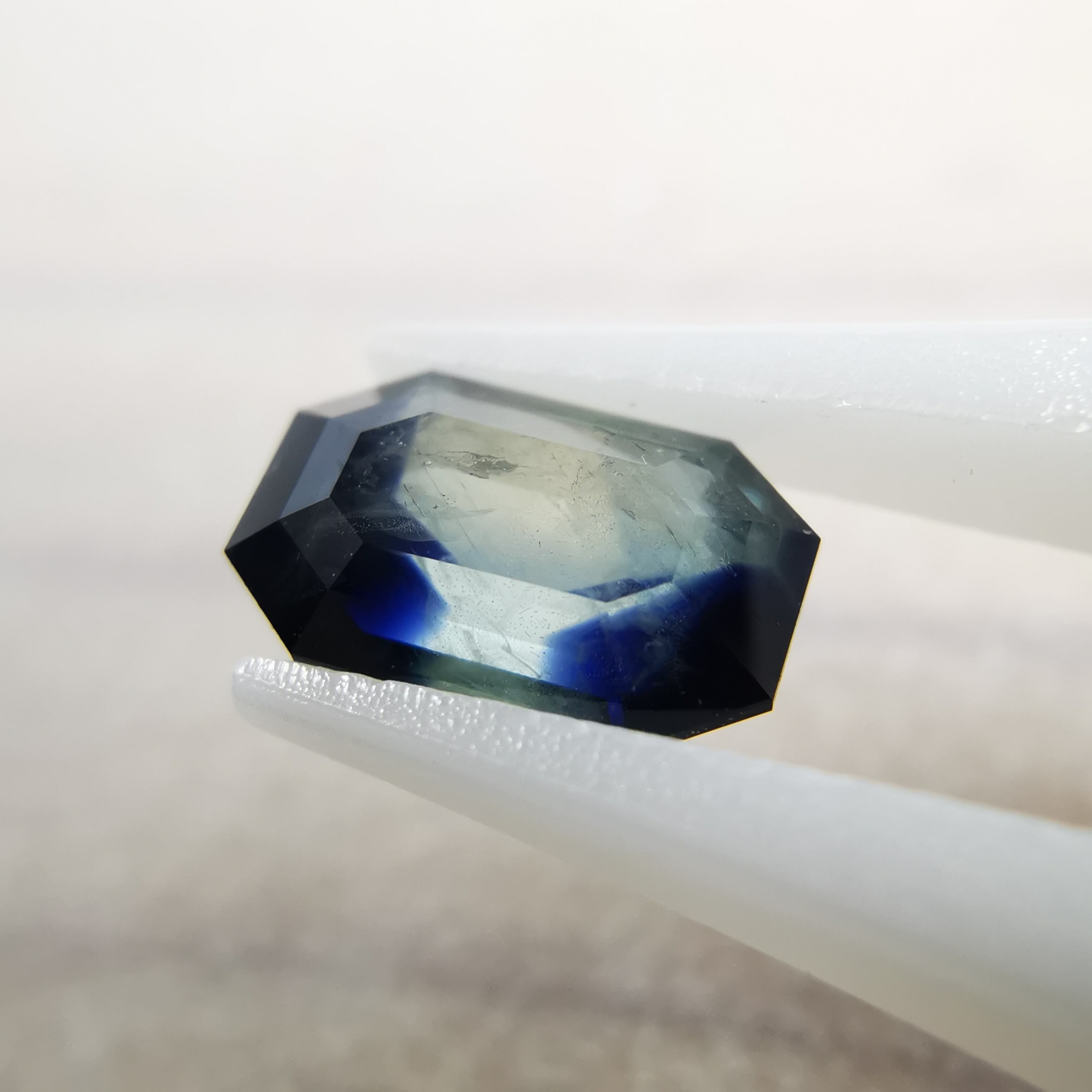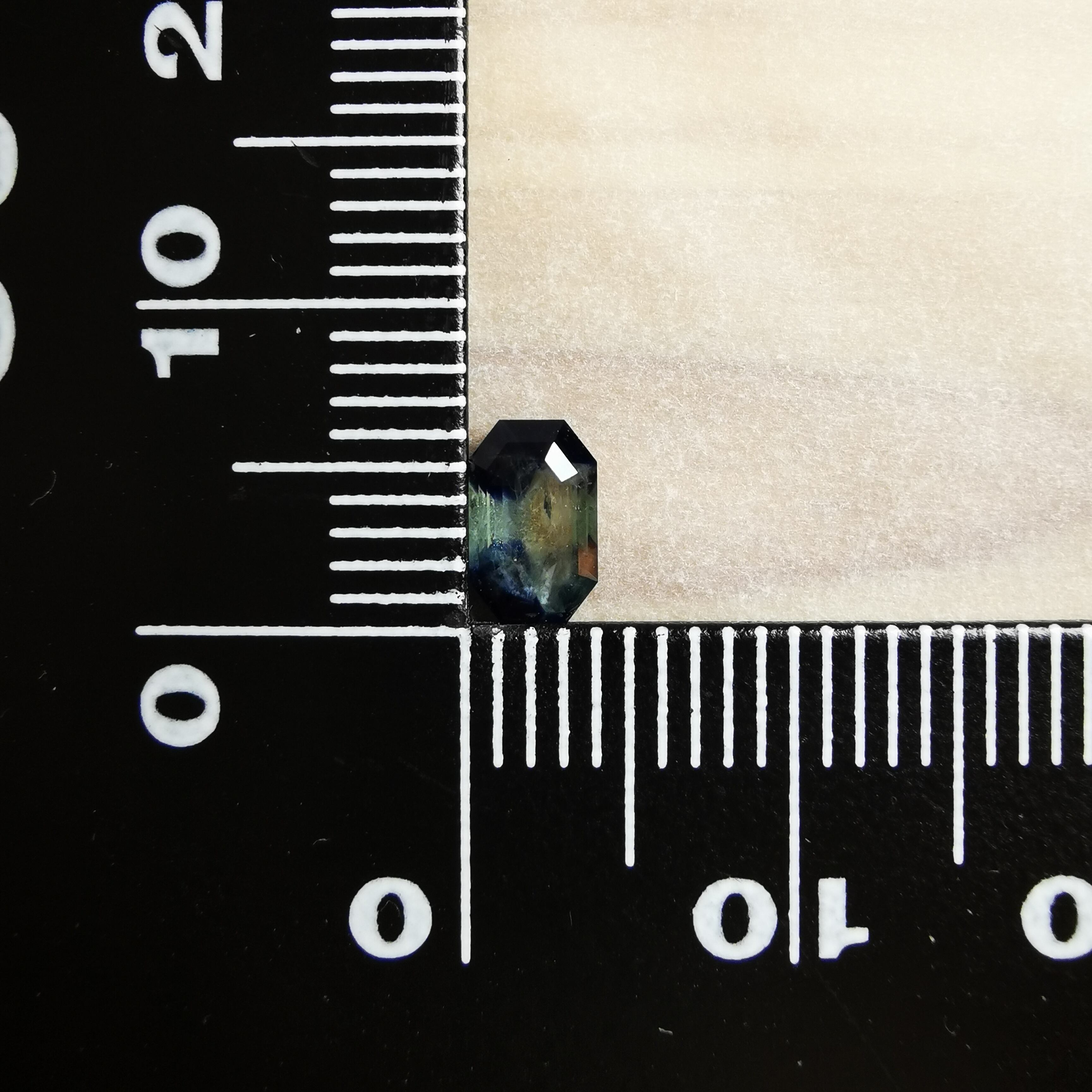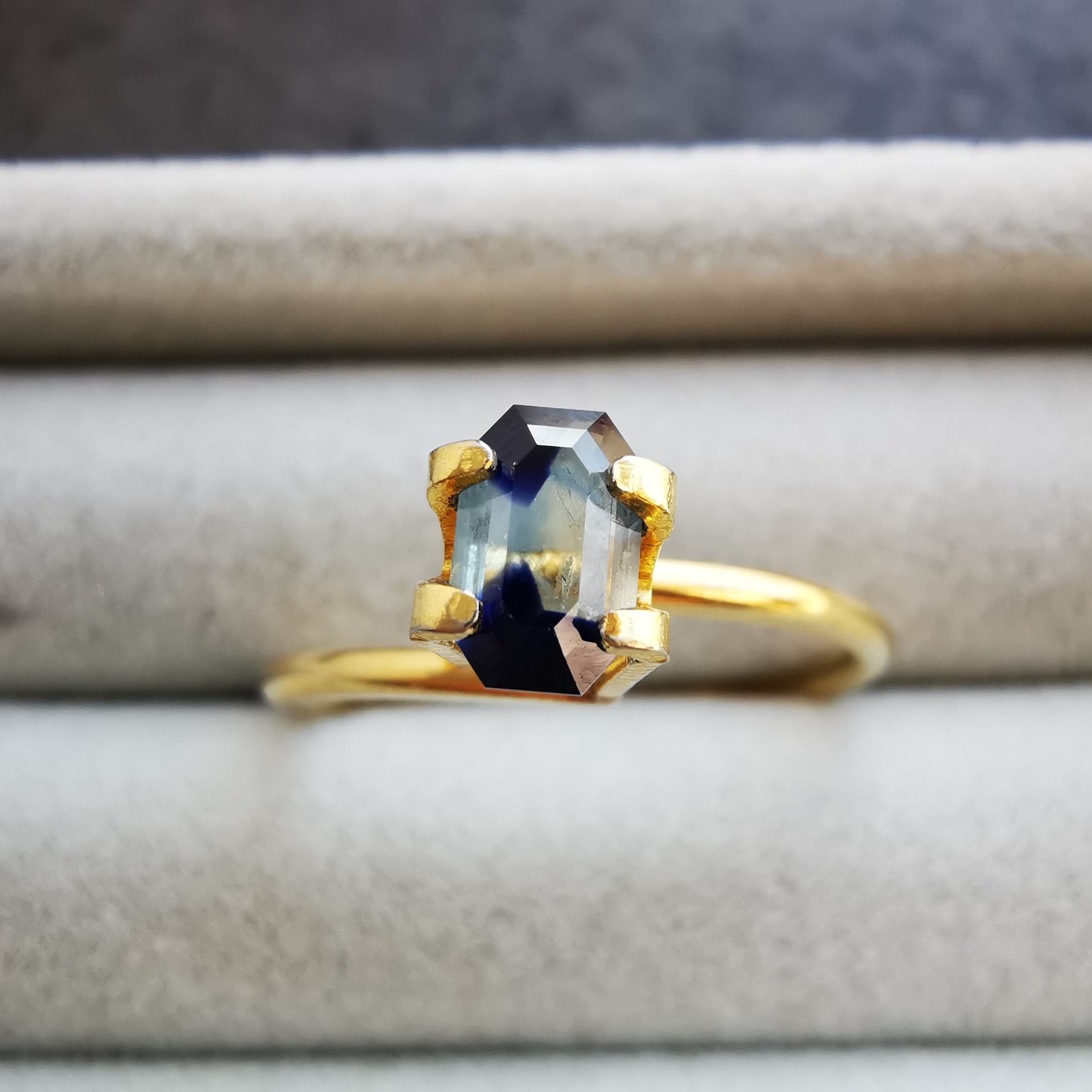 ごくごく薄いアイスグリーンに、濃紺が侵食するように入ったバイカラーのサファイアです。