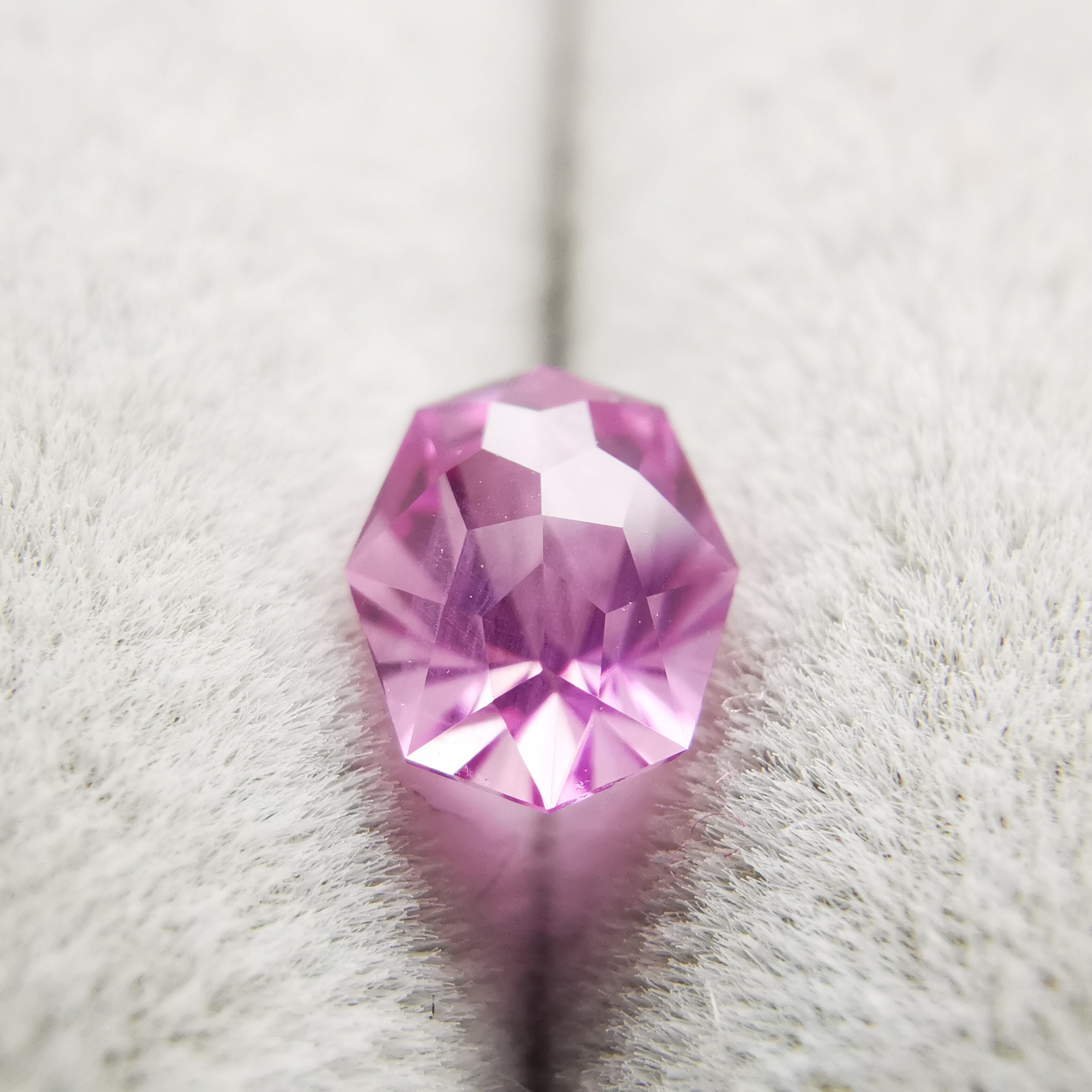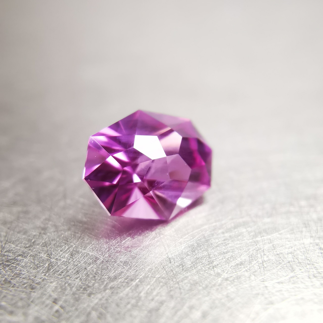 通常、キュレットの一点からきらめきが広がりますが、テーブル面のカットの影響で、まるでキュレットがふたつあるような複雑なきらめきになります。