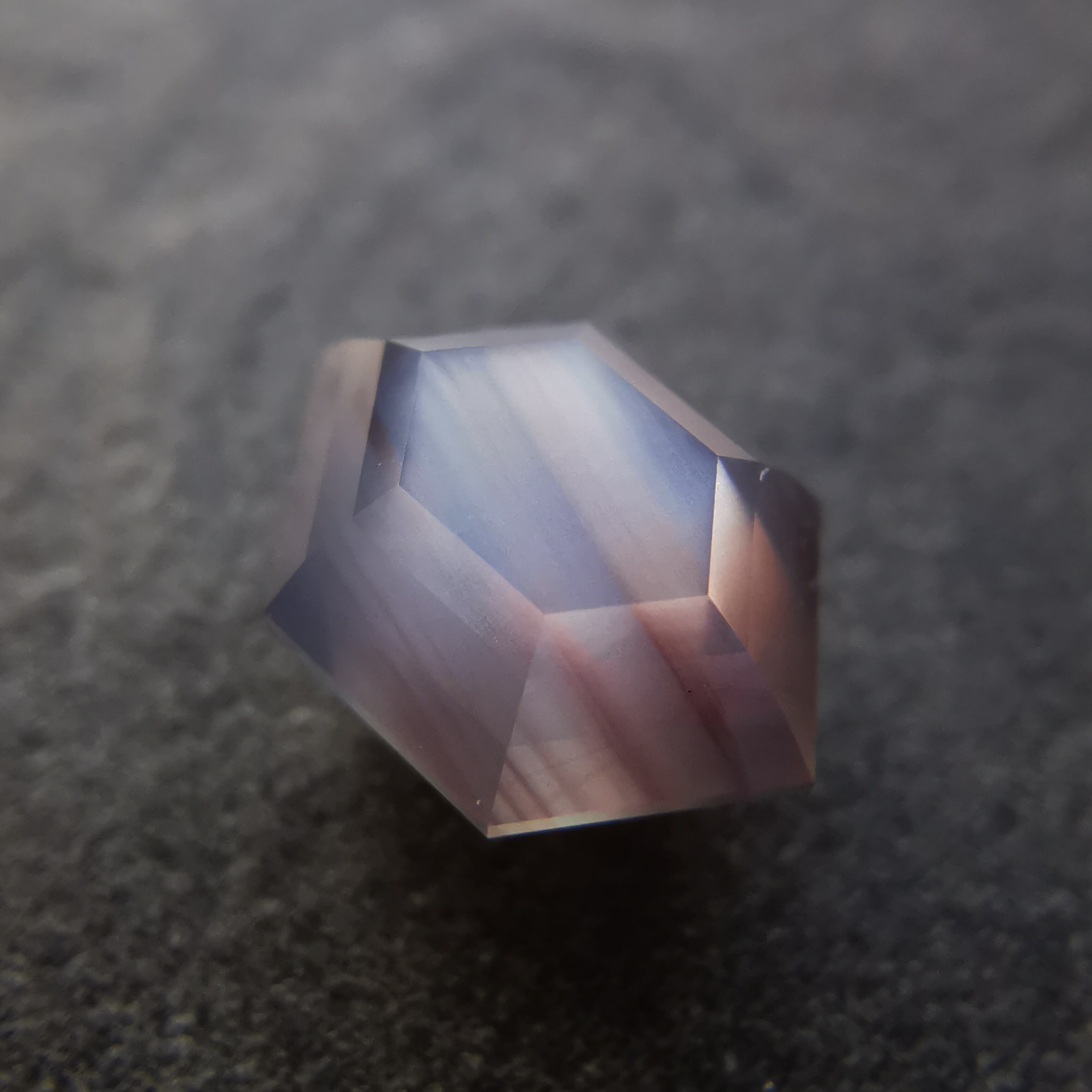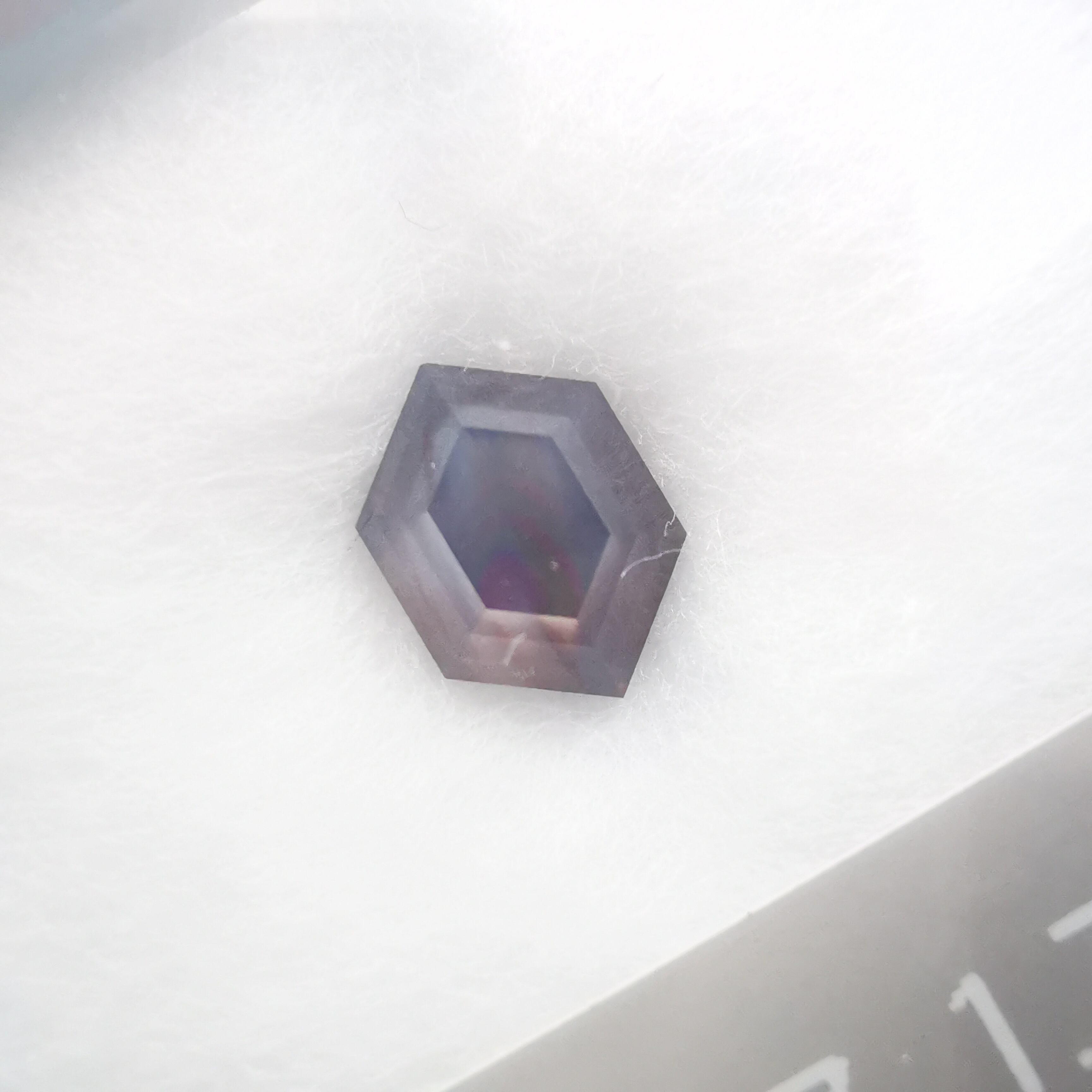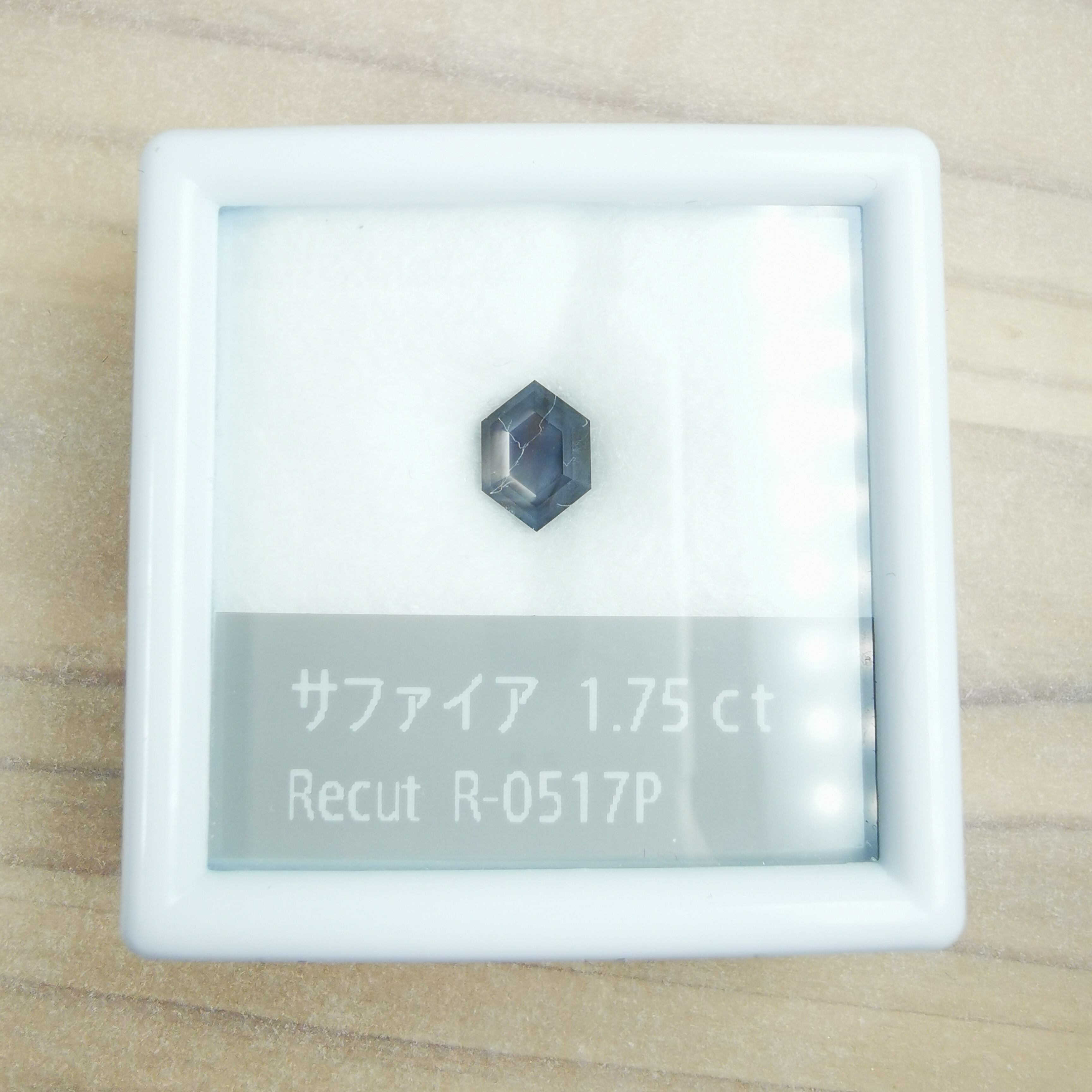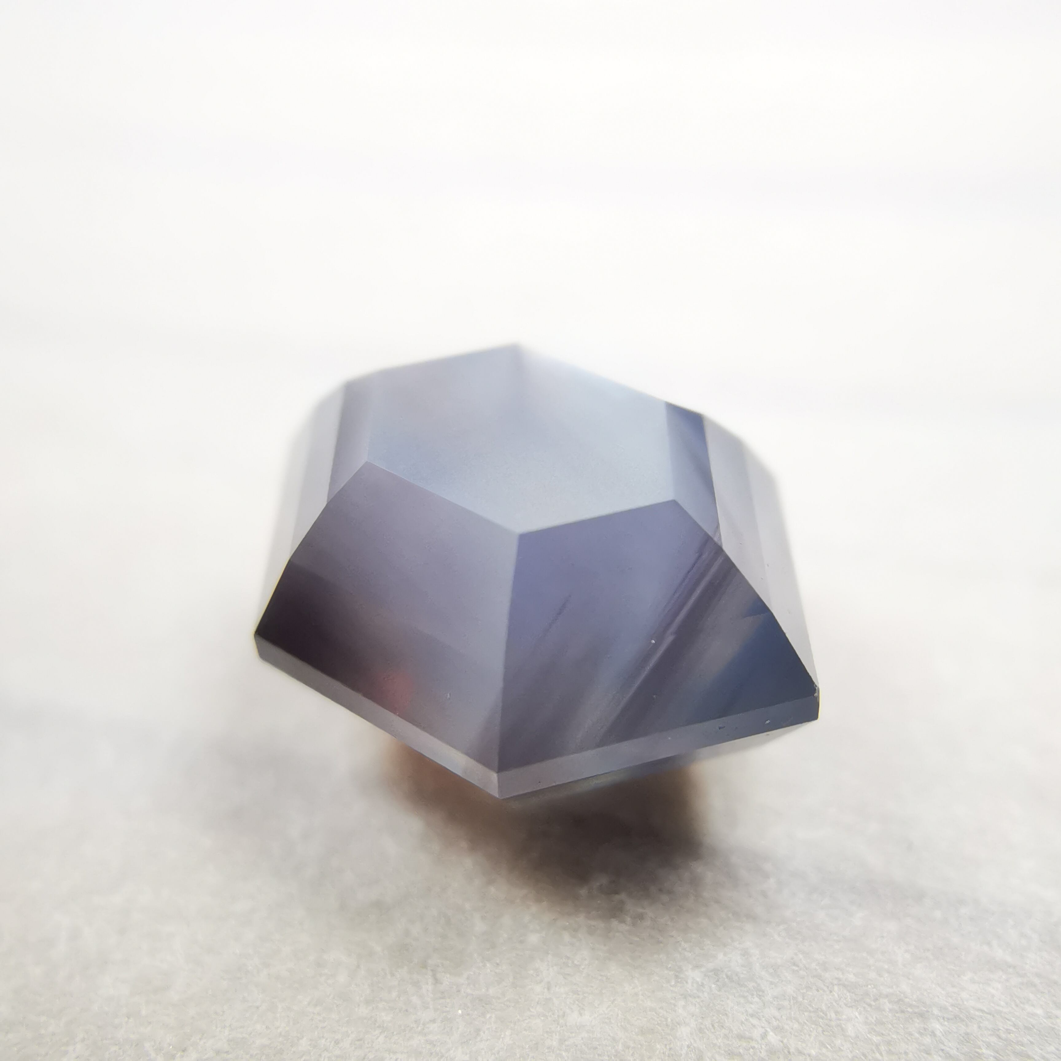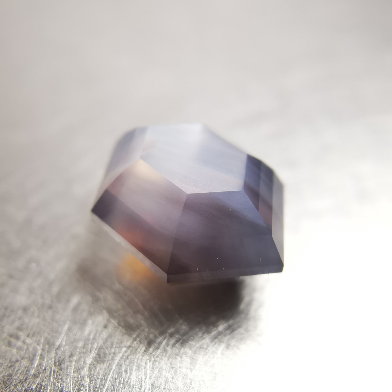スターサファイアをポリゴナルフラットバックにリカットしてというのオーダーに、気を利かせた(?)カッターさんが、裏面も同様にカット。