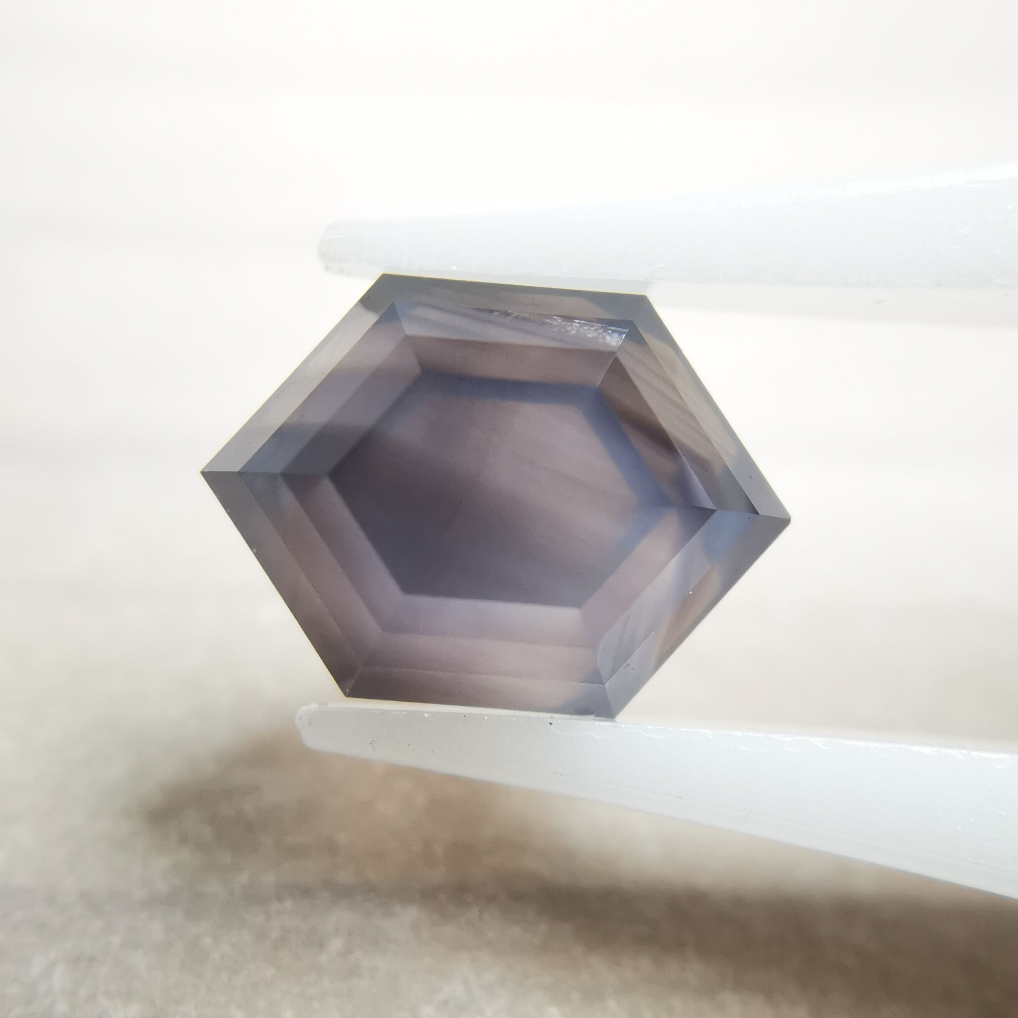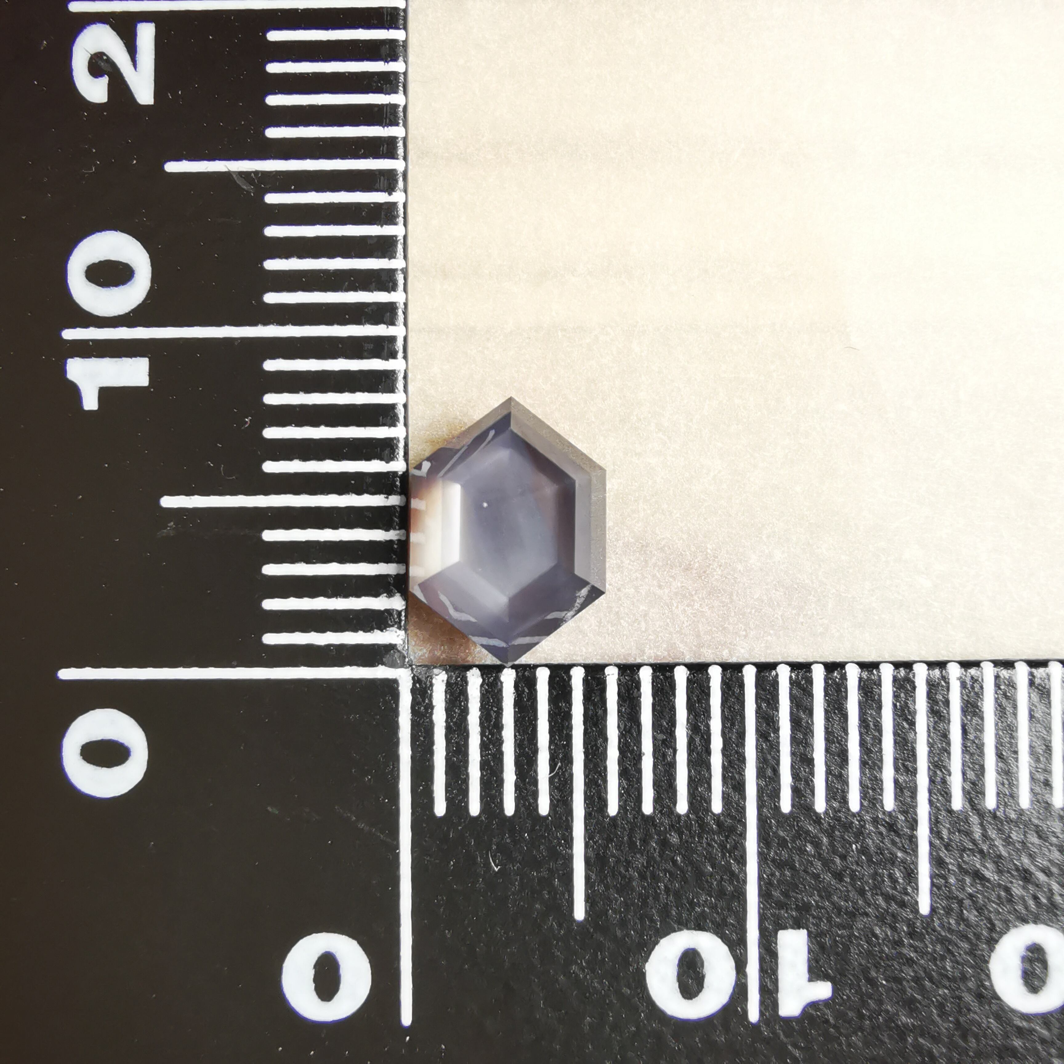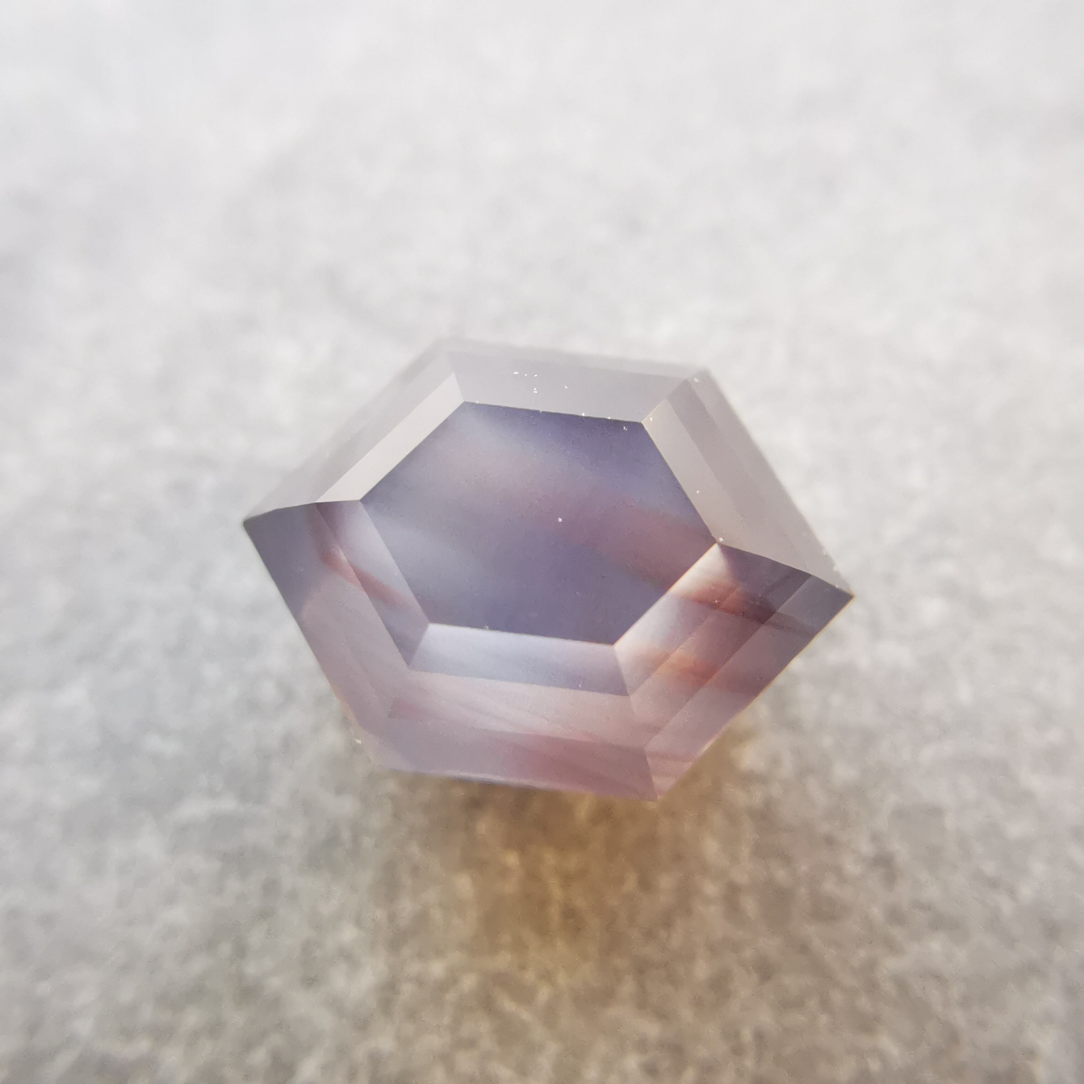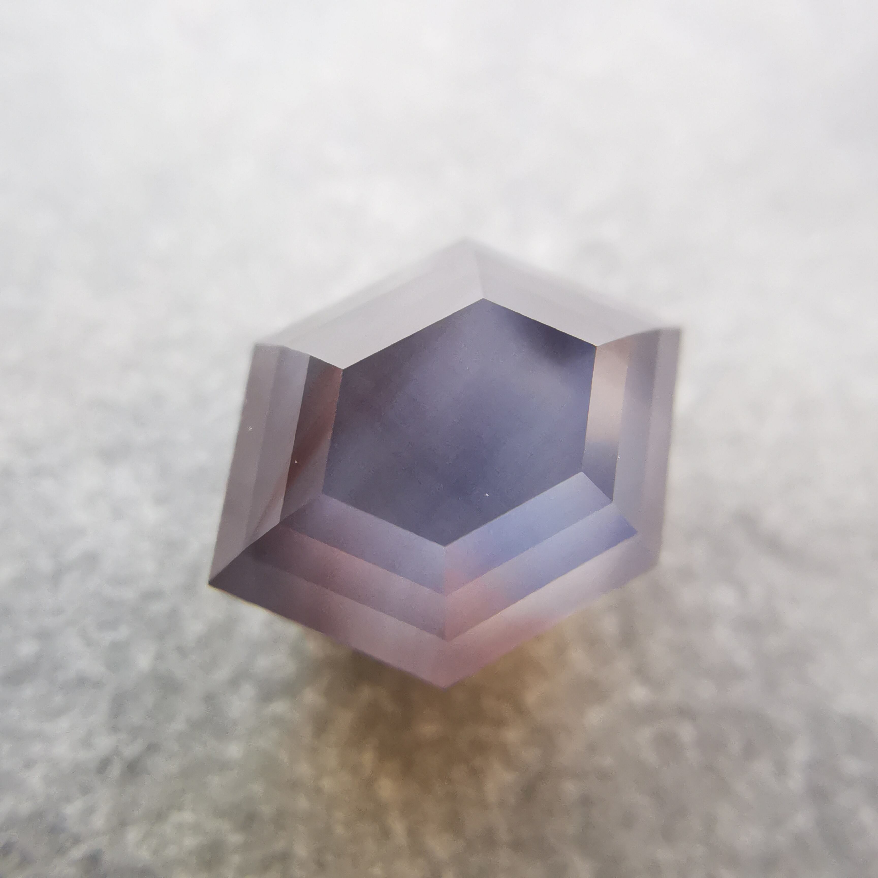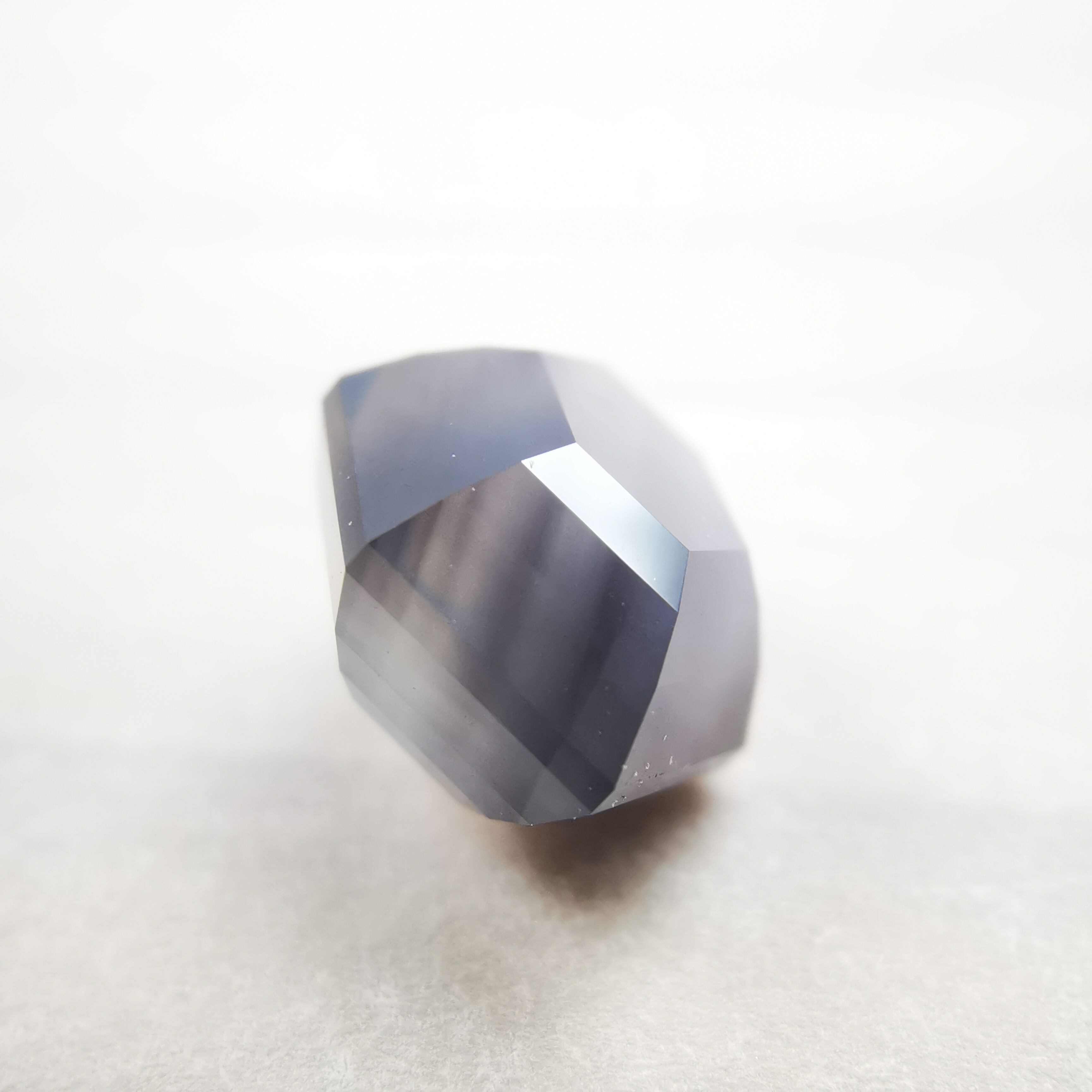 スターサファイアをポリゴナルフラットバックにリカットしてというのオーダーに、気を利かせた(?)カッターさんが、裏面も同様にカット。