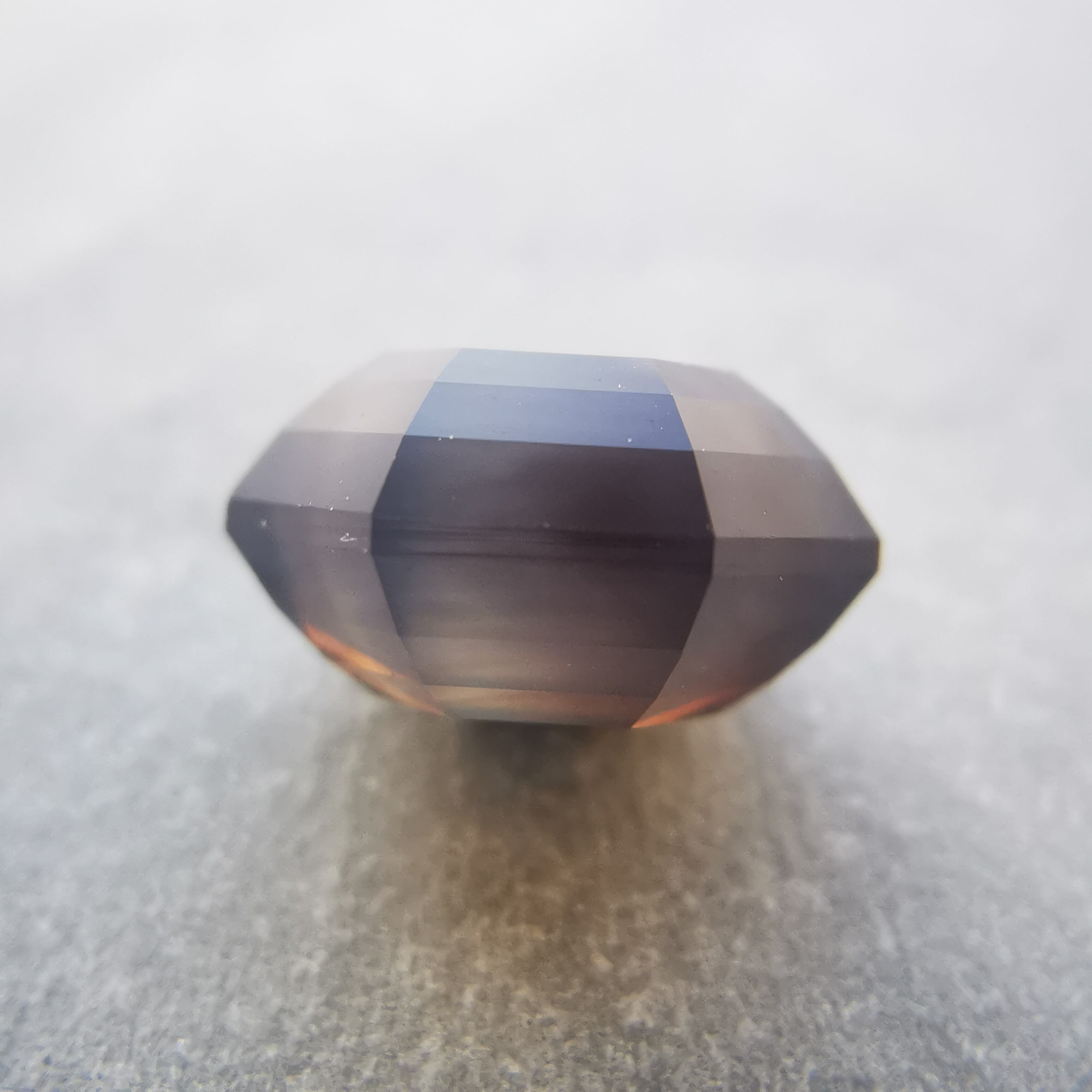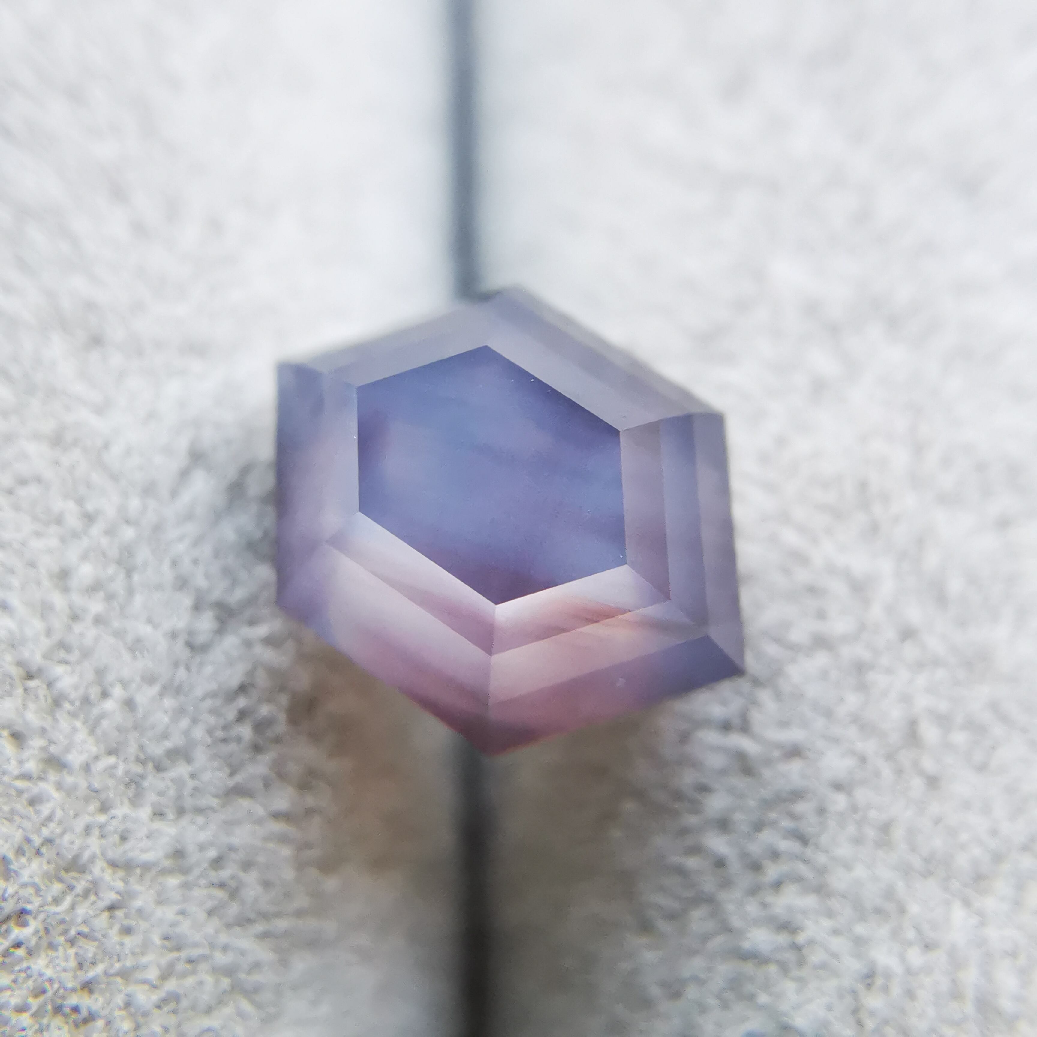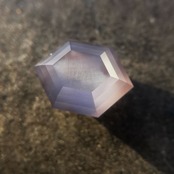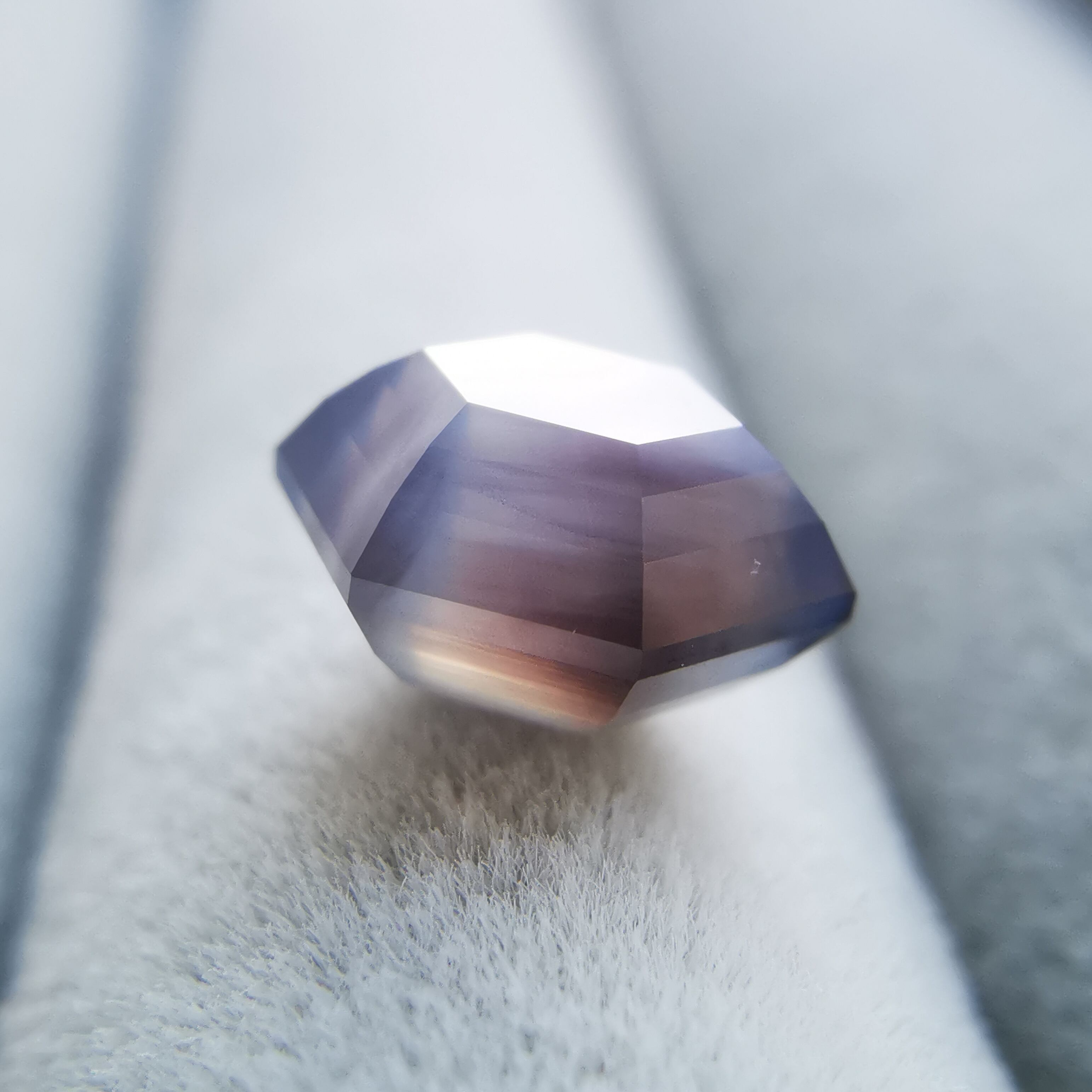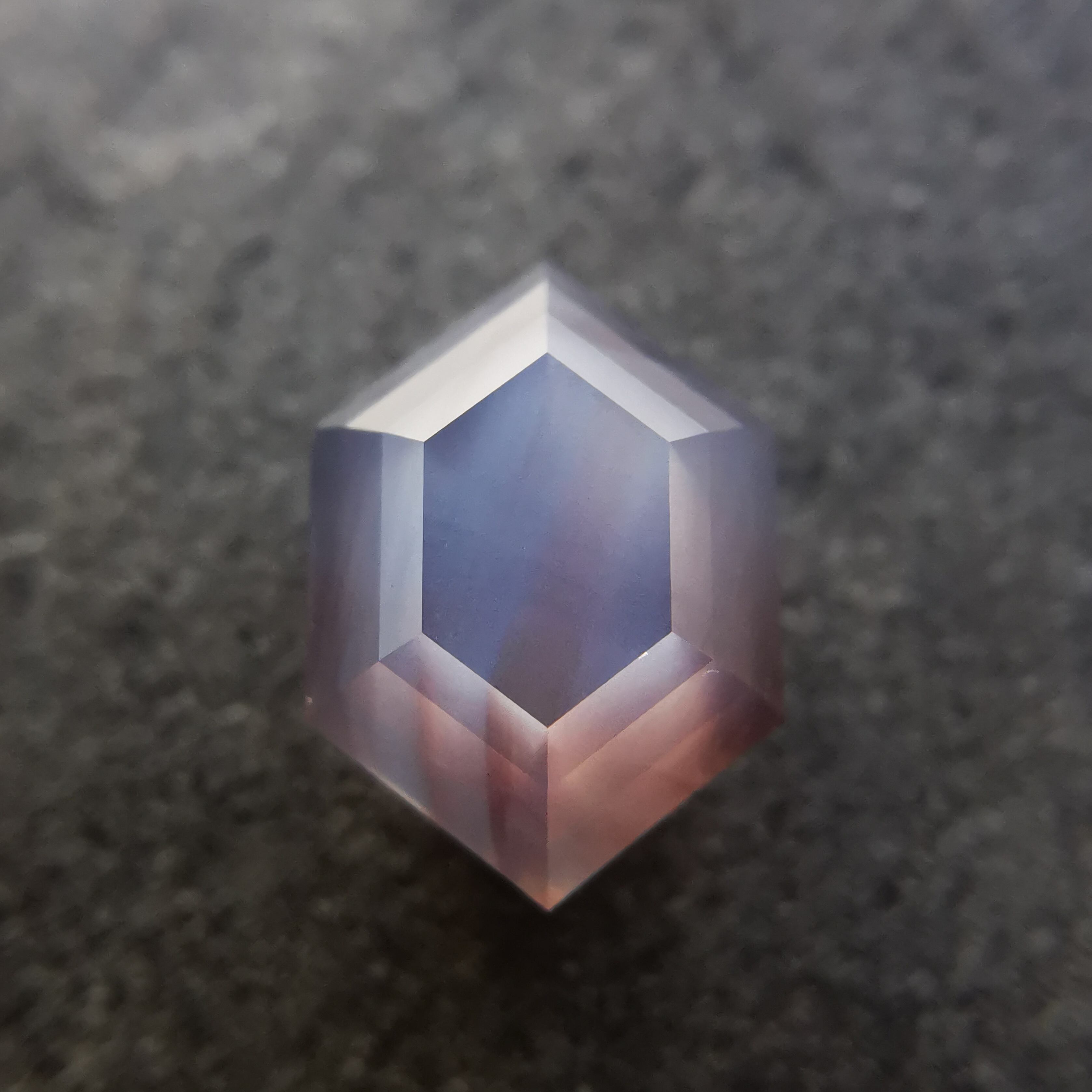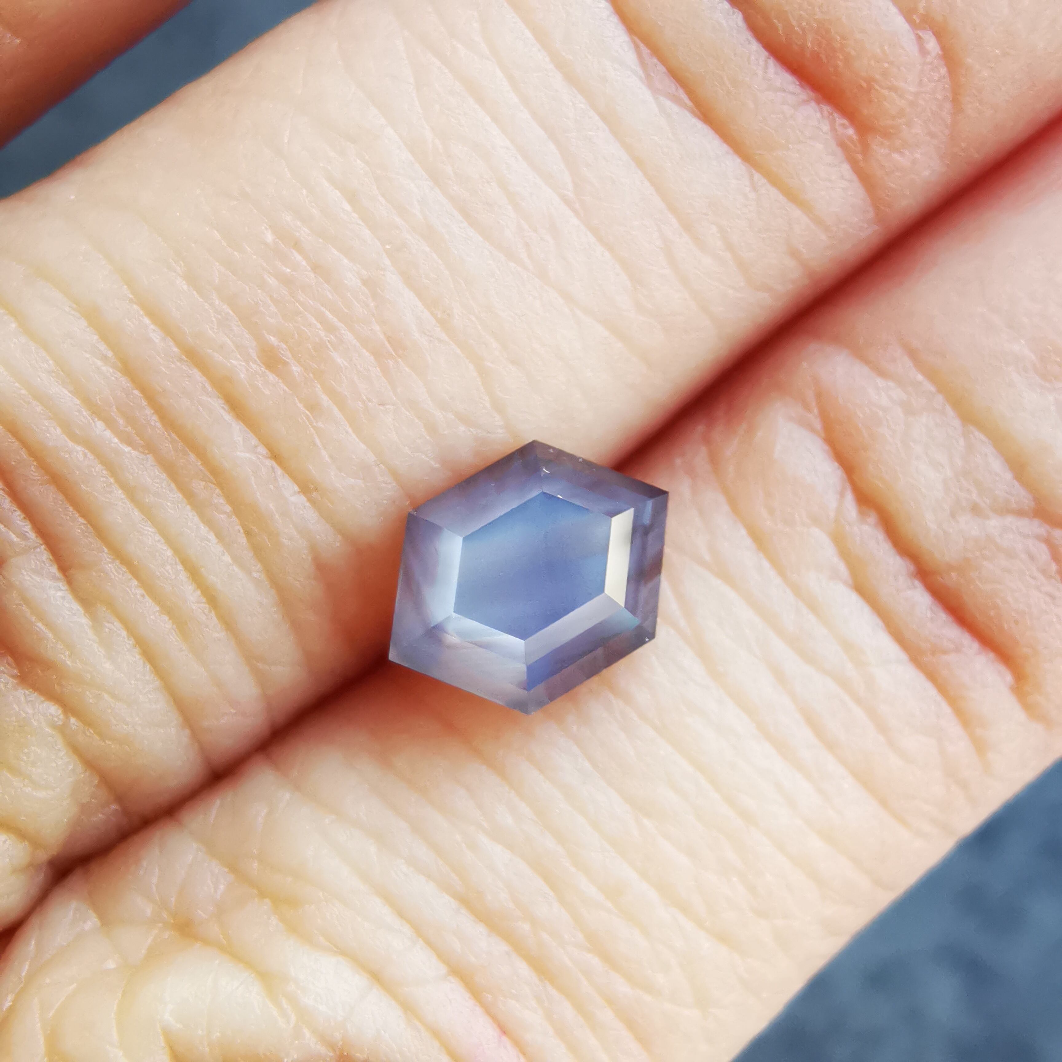 スターサファイアをポリゴナルフラットバックにリカットしてというのオーダーに、気を利かせた(?)カッターさんが、裏面も同様にカット。