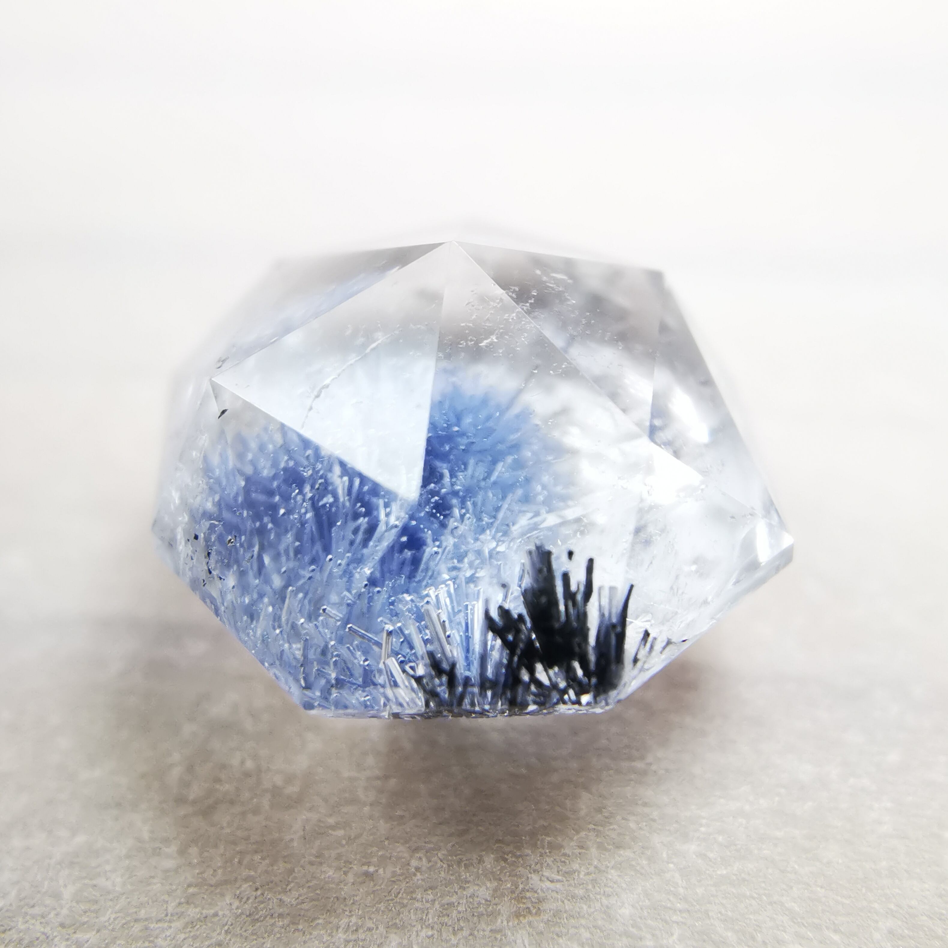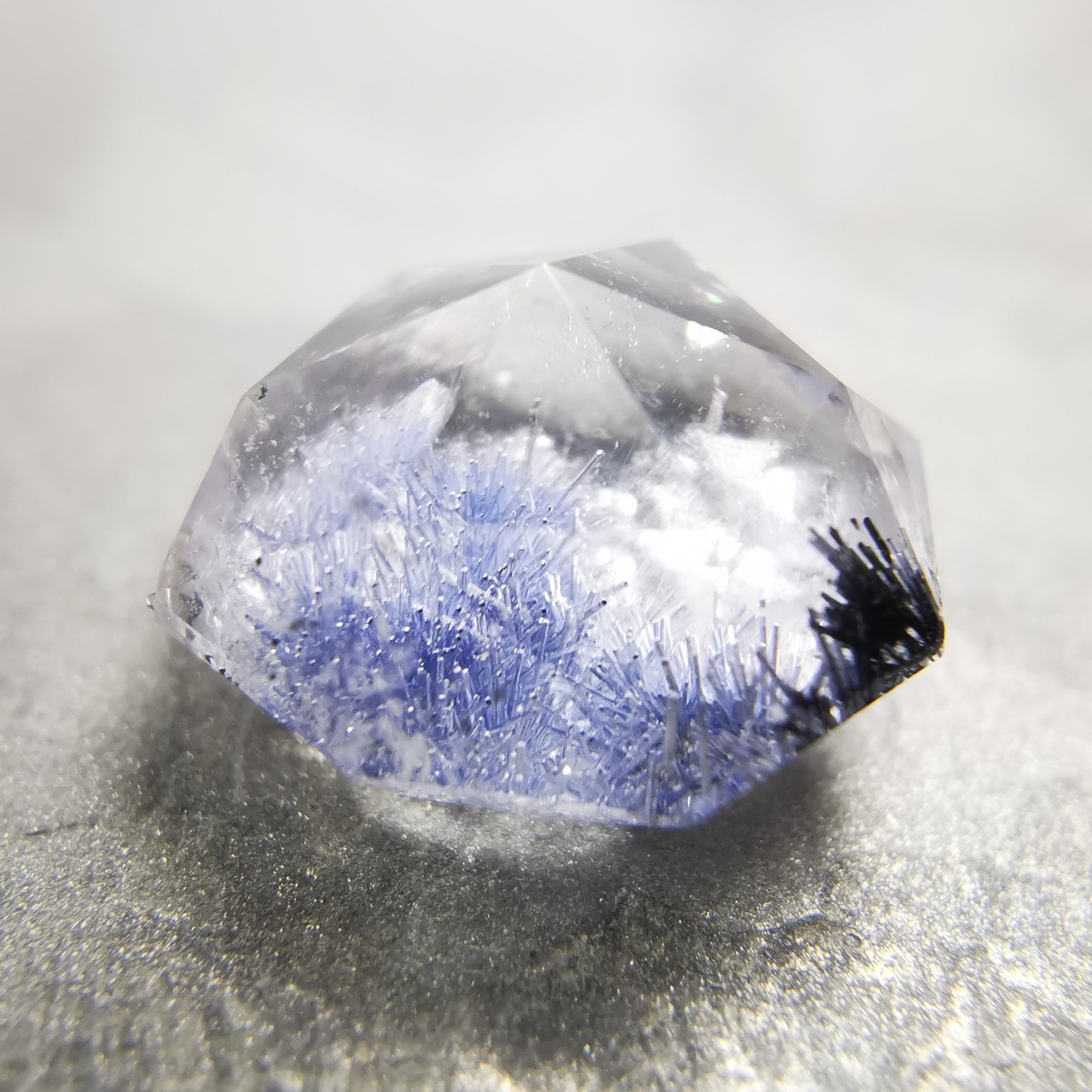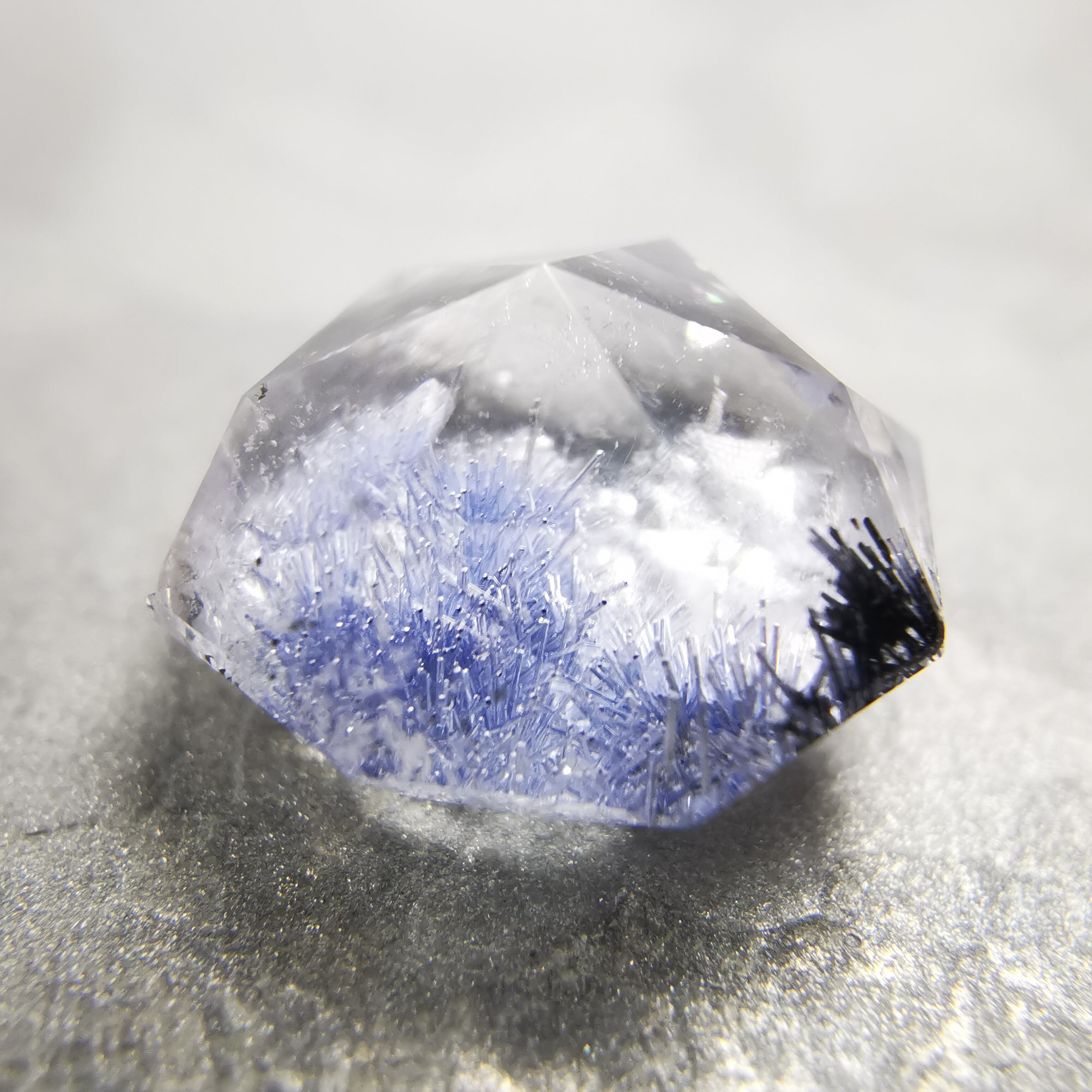 青い結晶と、わずかに黒っぽい結晶が入ったデュモルチェライトインクォーツです。