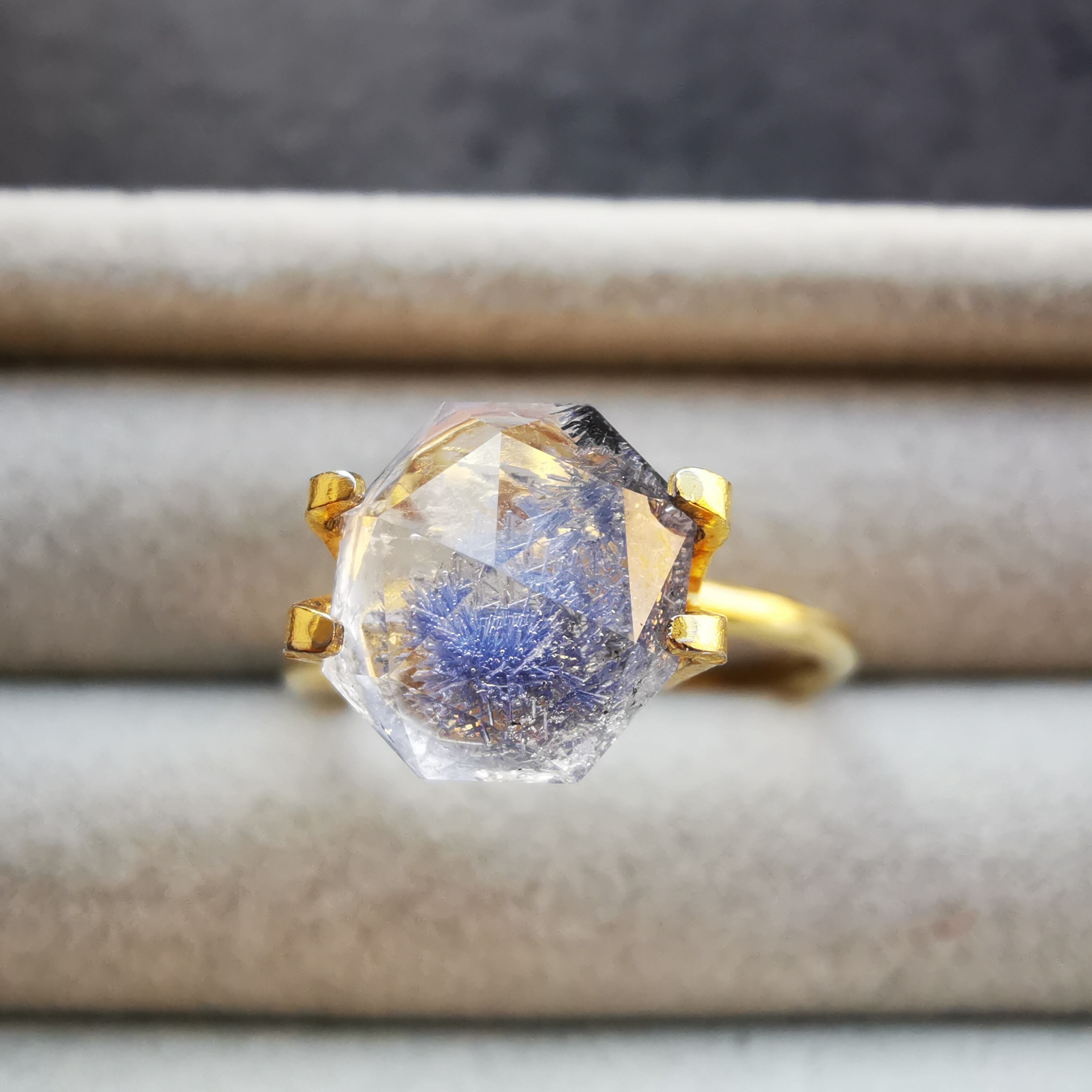 水晶でできたローズカットのドームの中の、青い花の咲く世界をじっくり愛でることが出来ます。