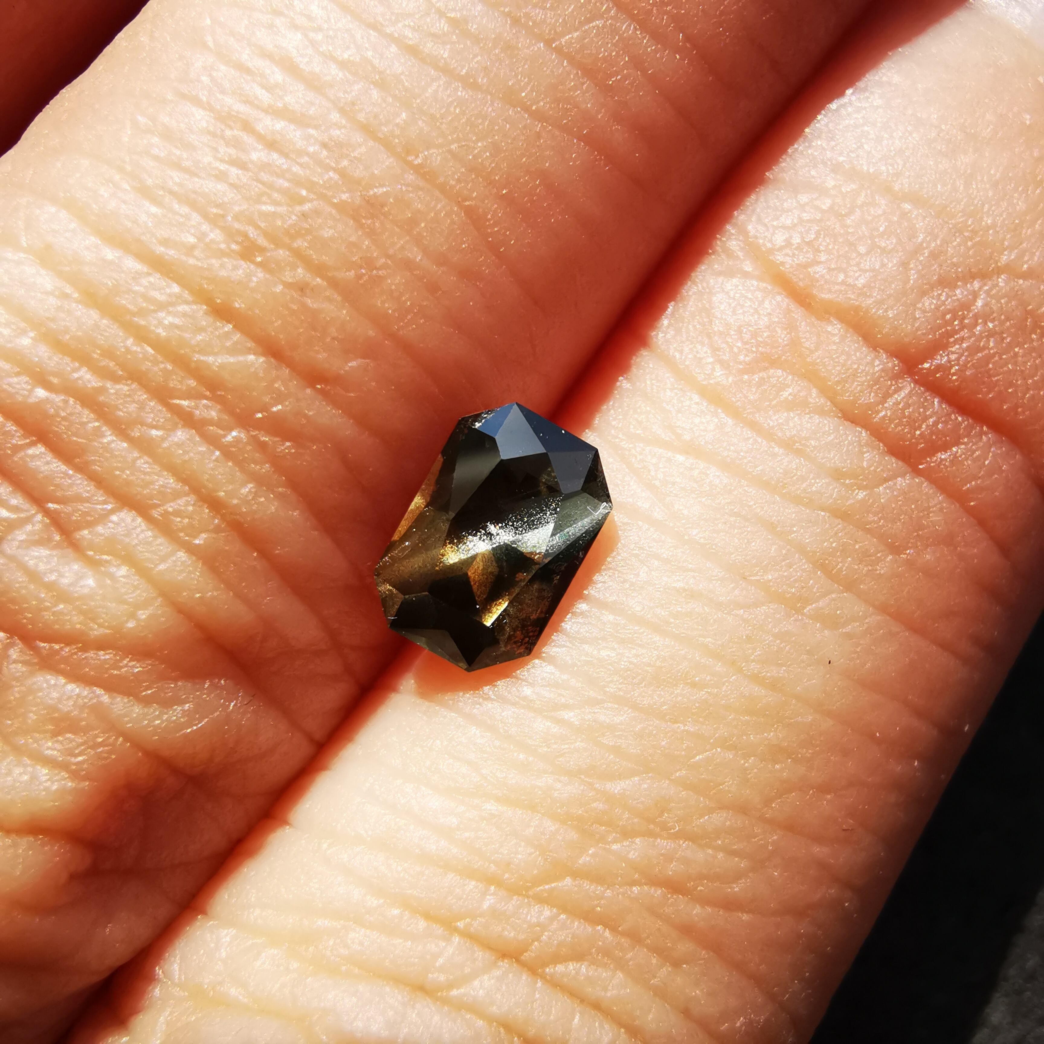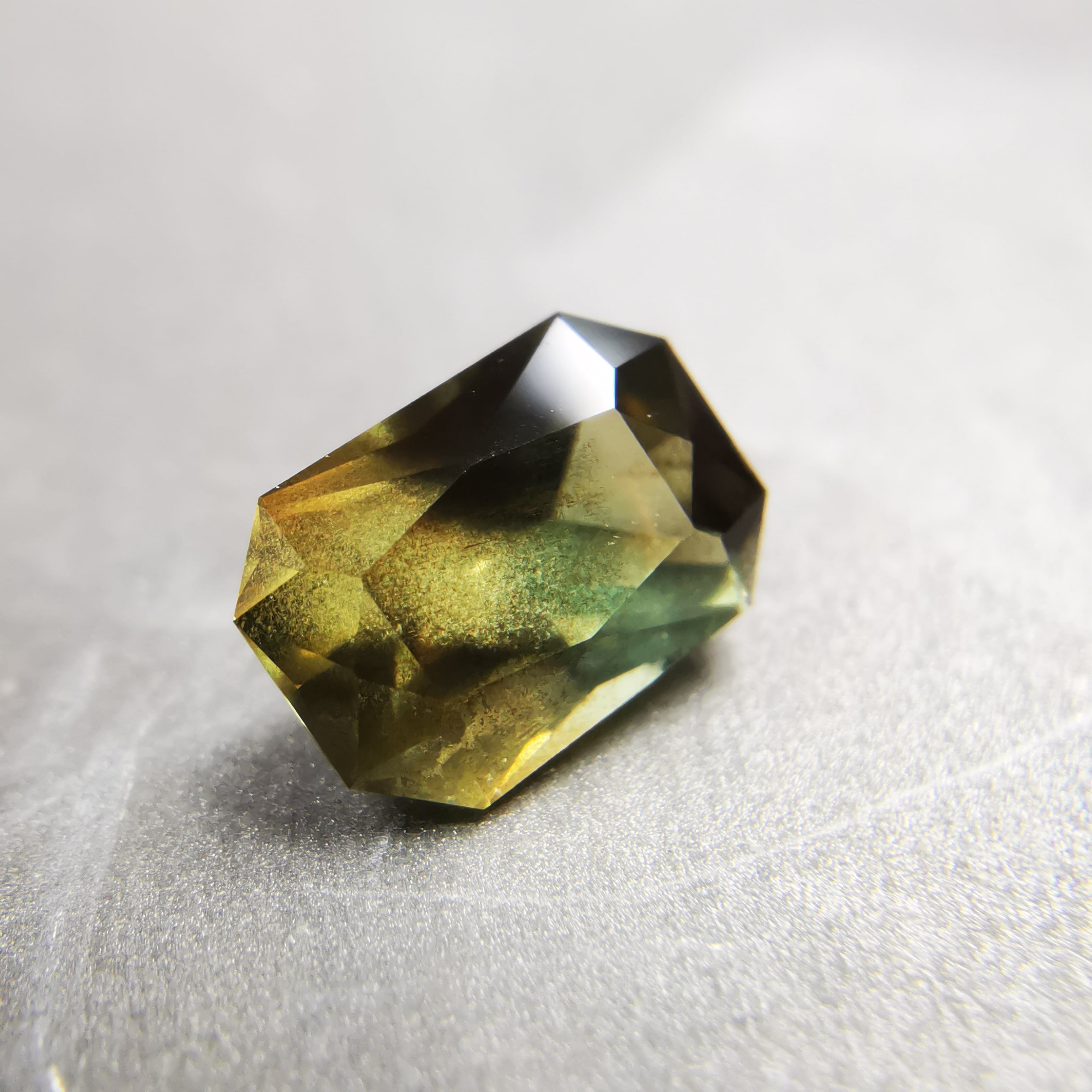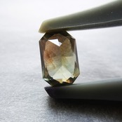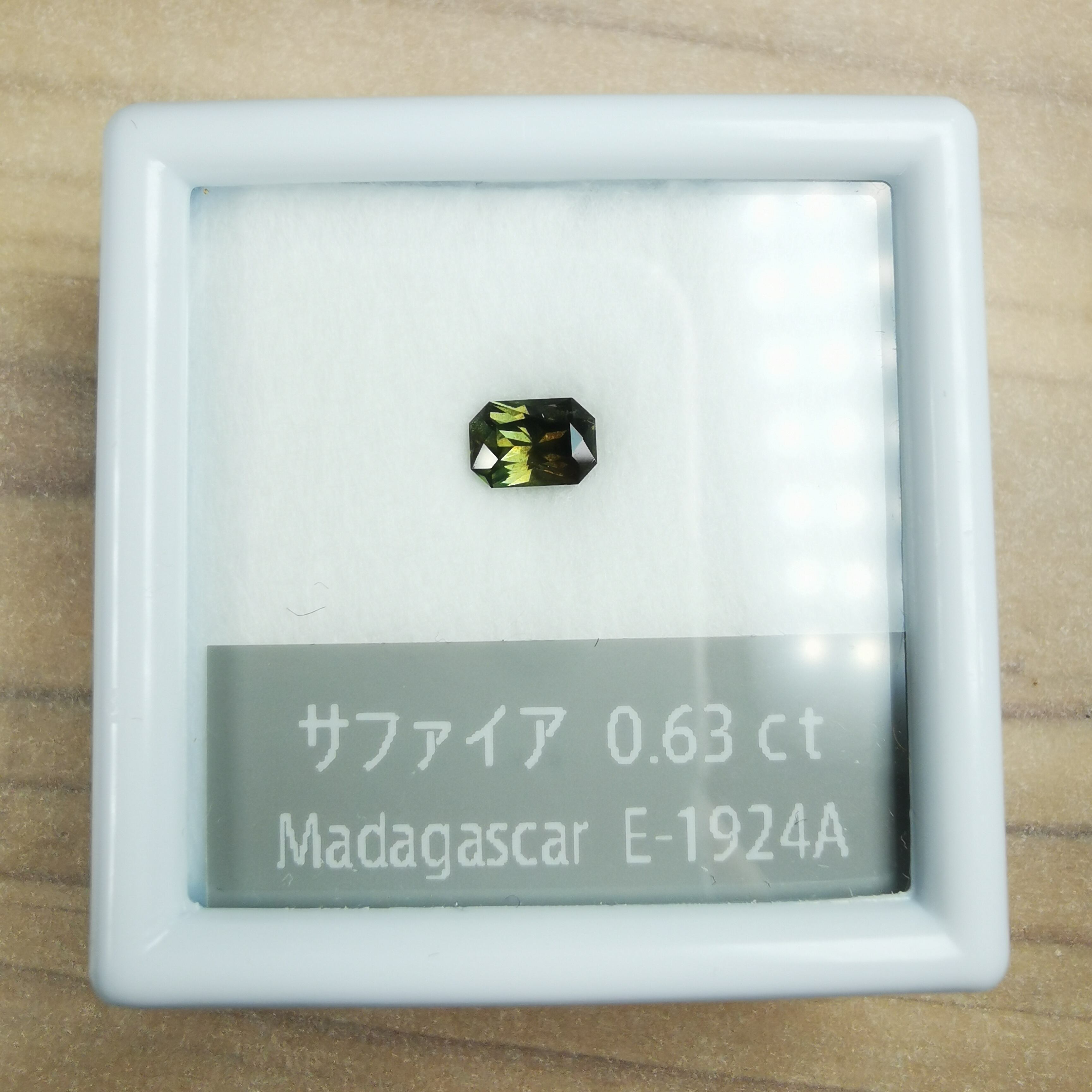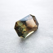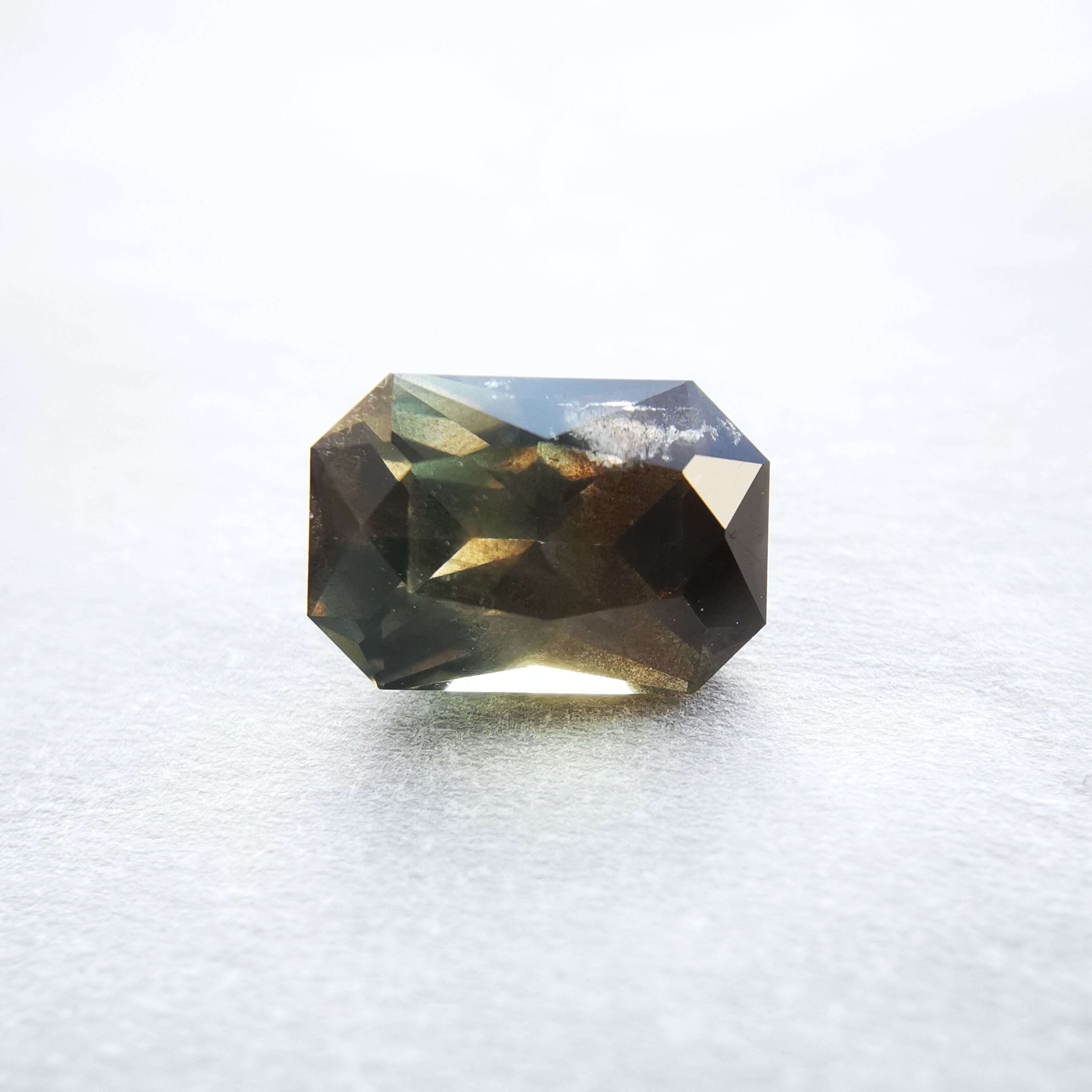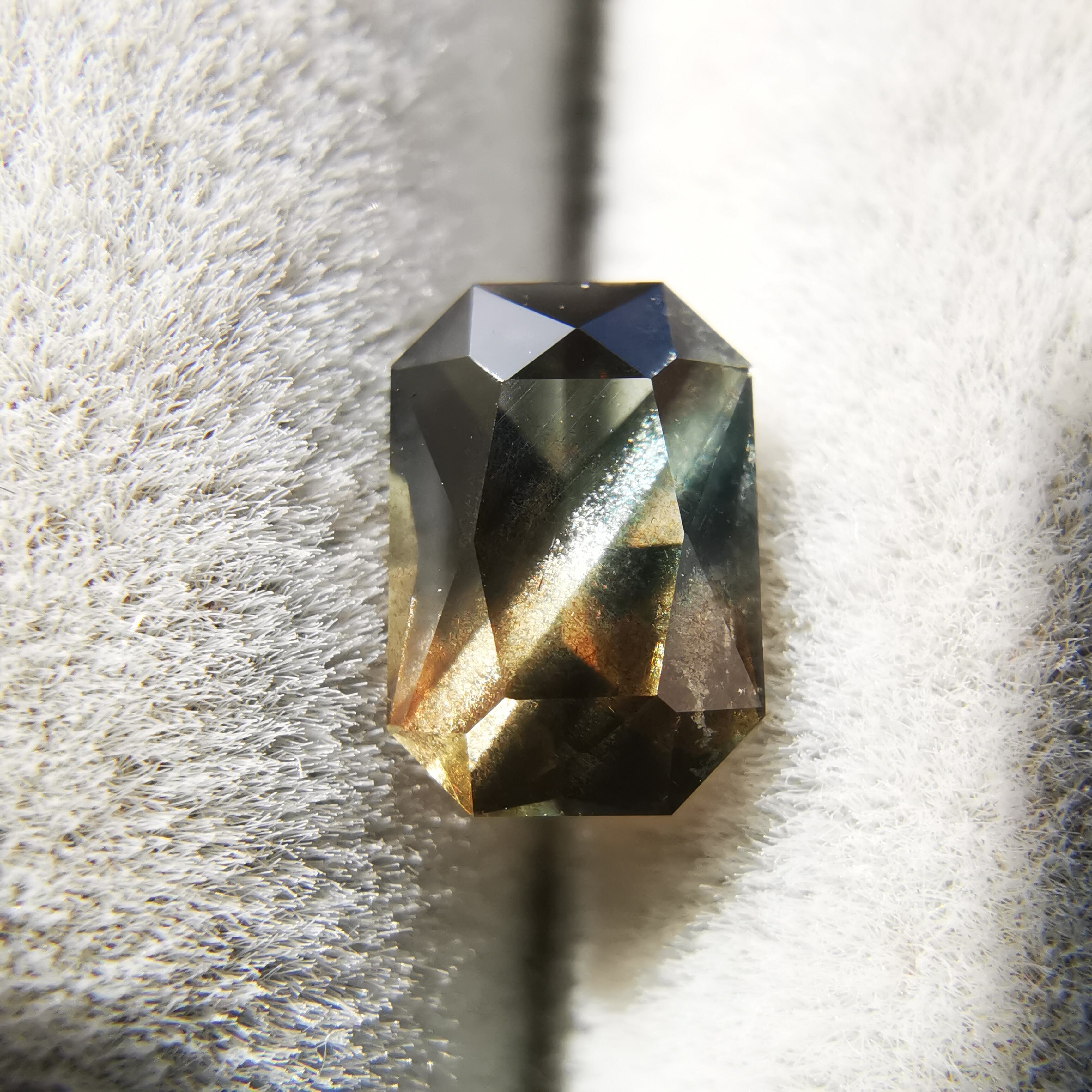 灰緑色のサファイアに、赤さび色のゴールドシラーが斜めに石を横切るように入っています。