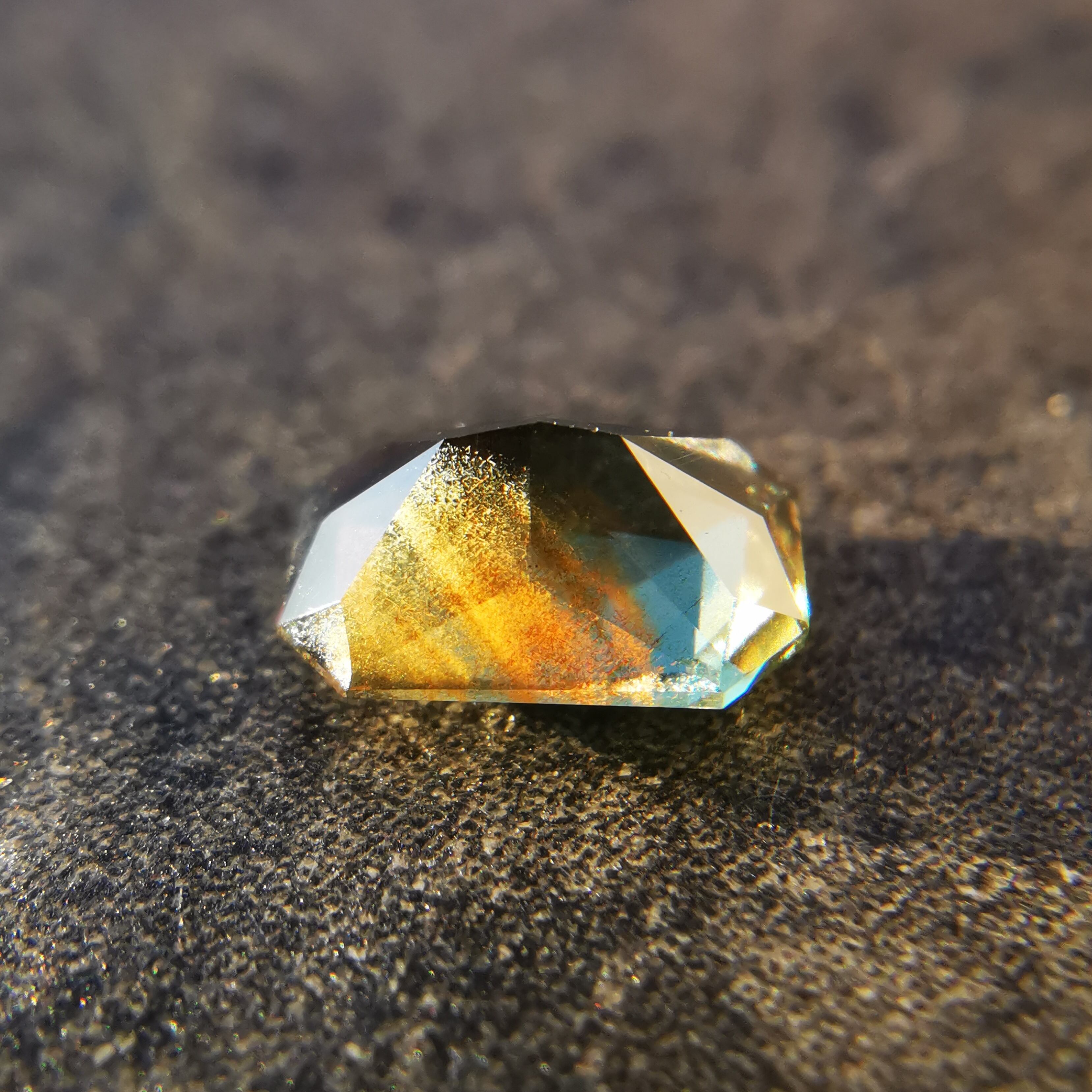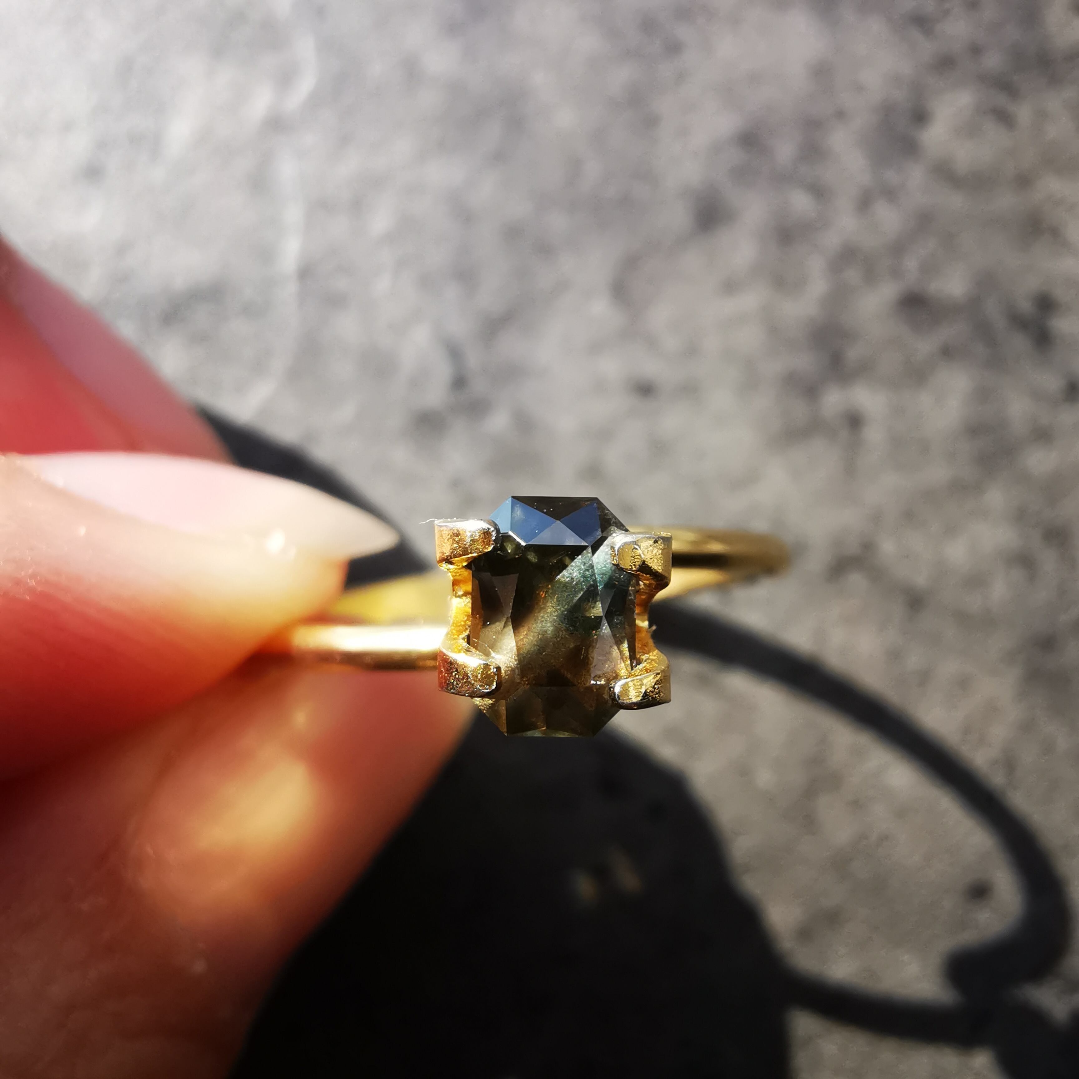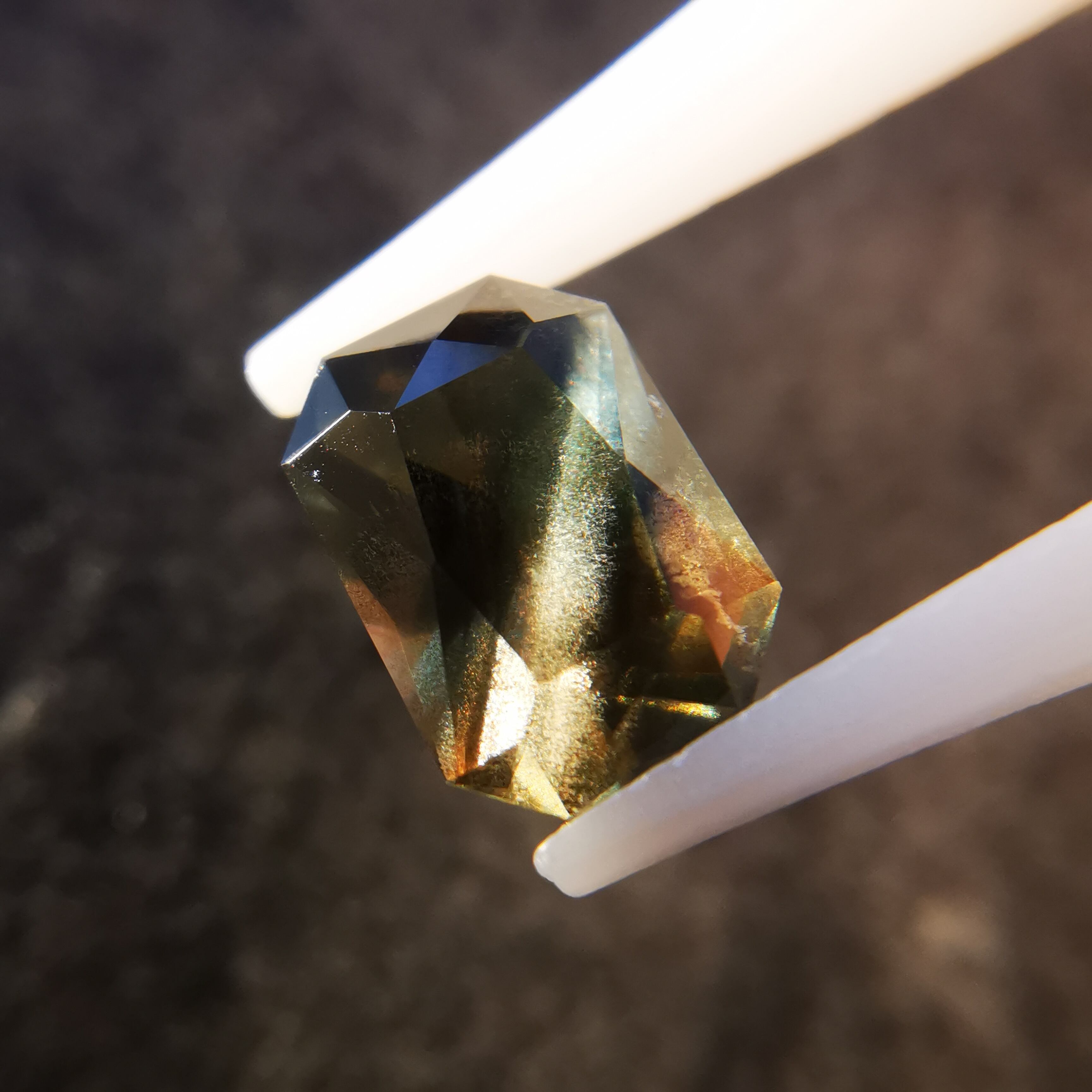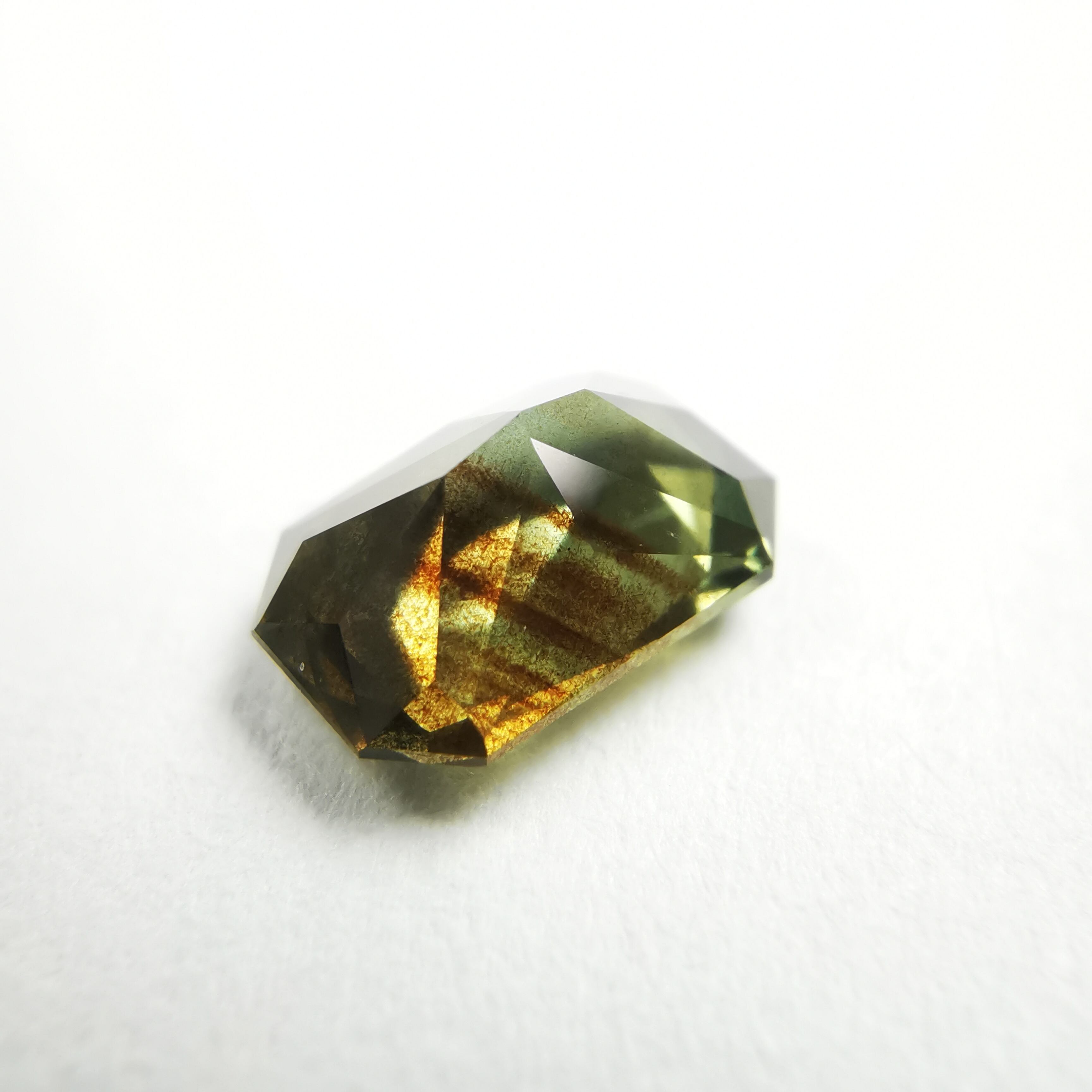 灰緑色のサファイアに、赤さび色のゴールドシラーが斜めに石を横切るように入っています。