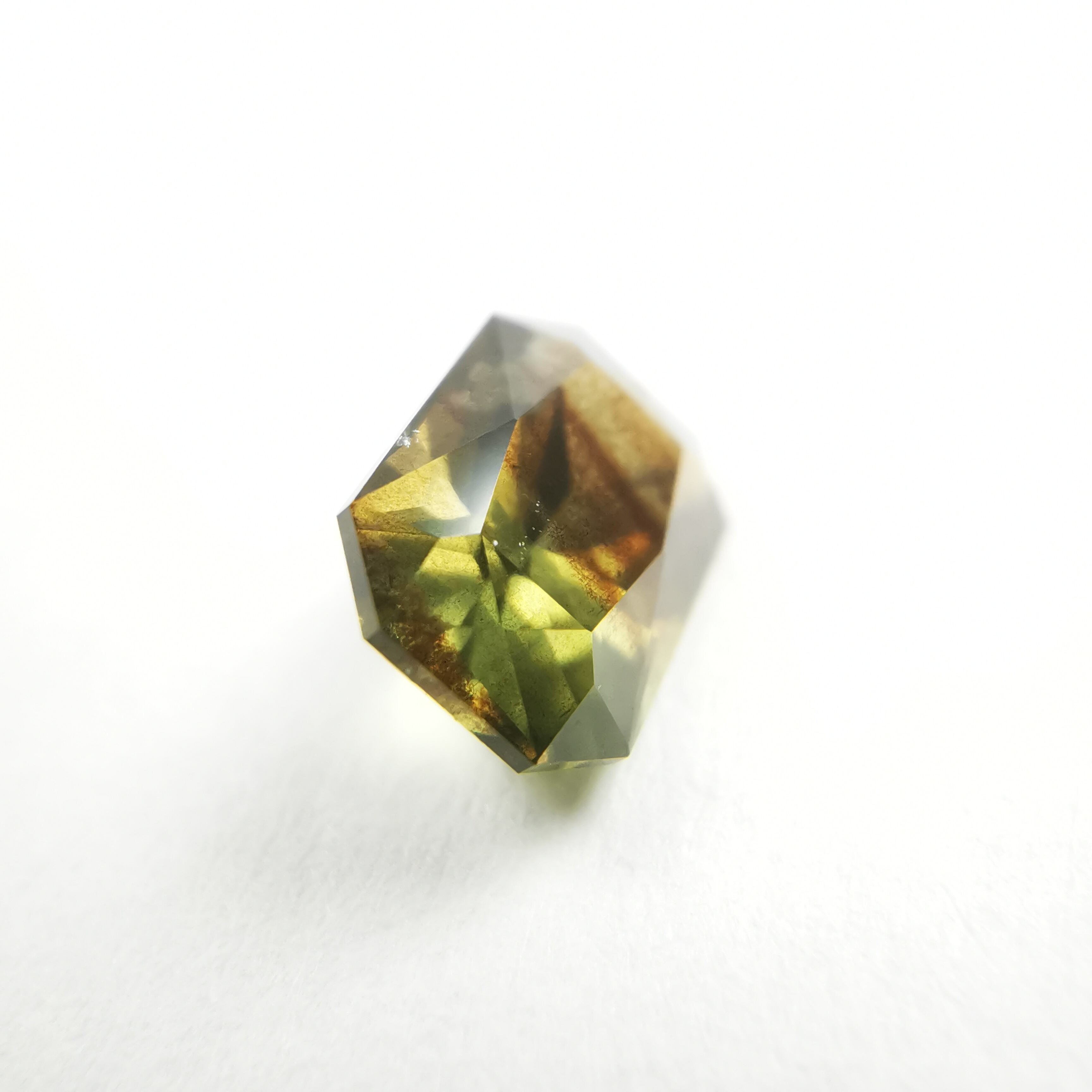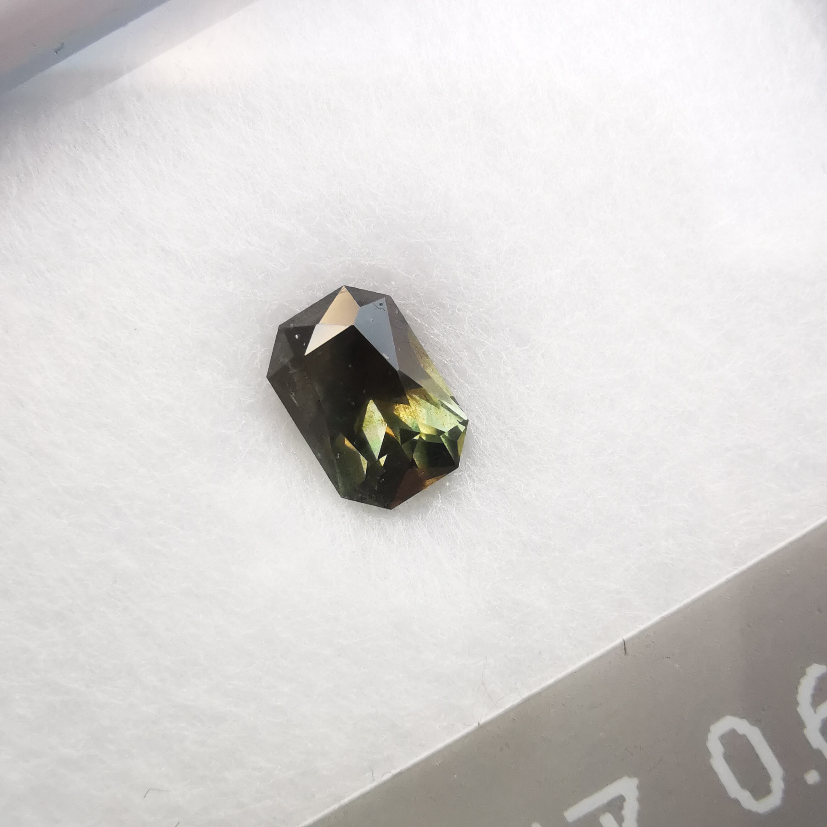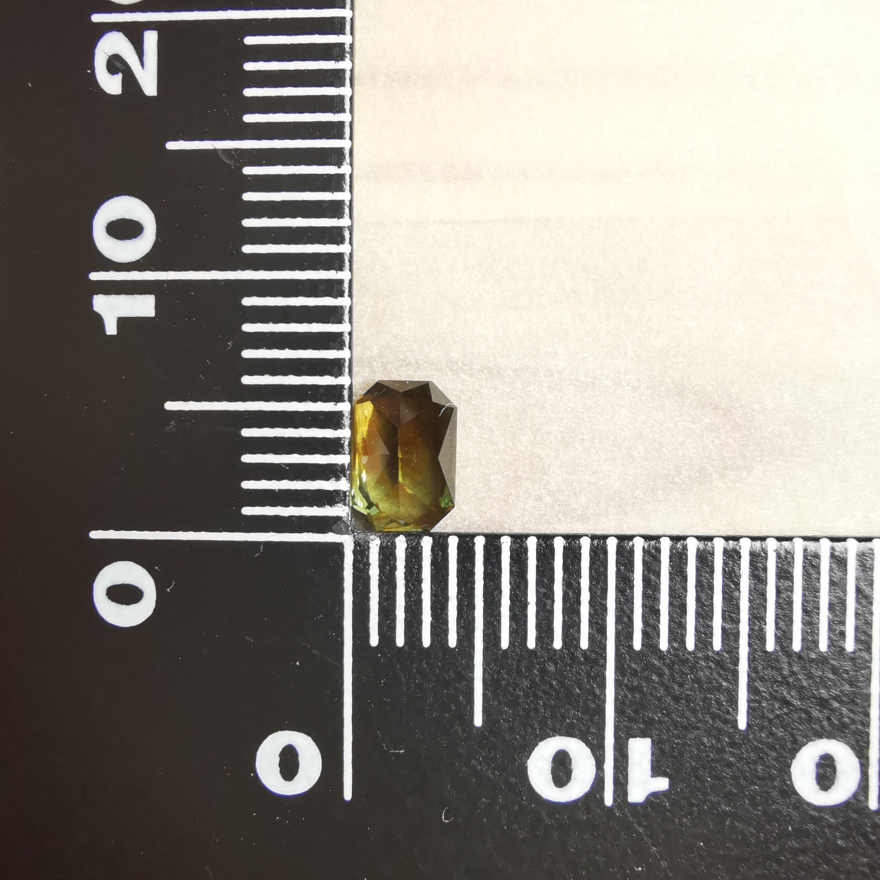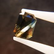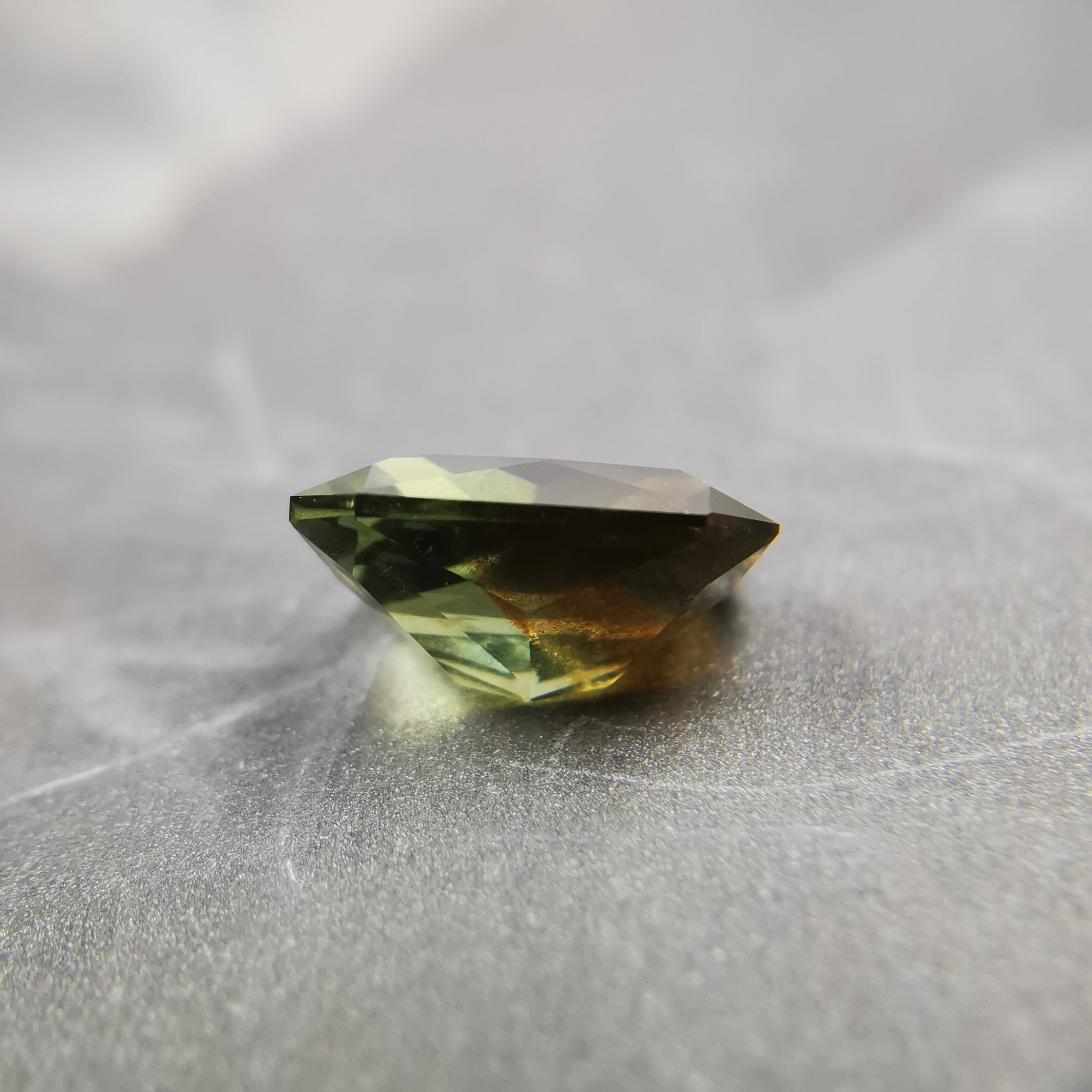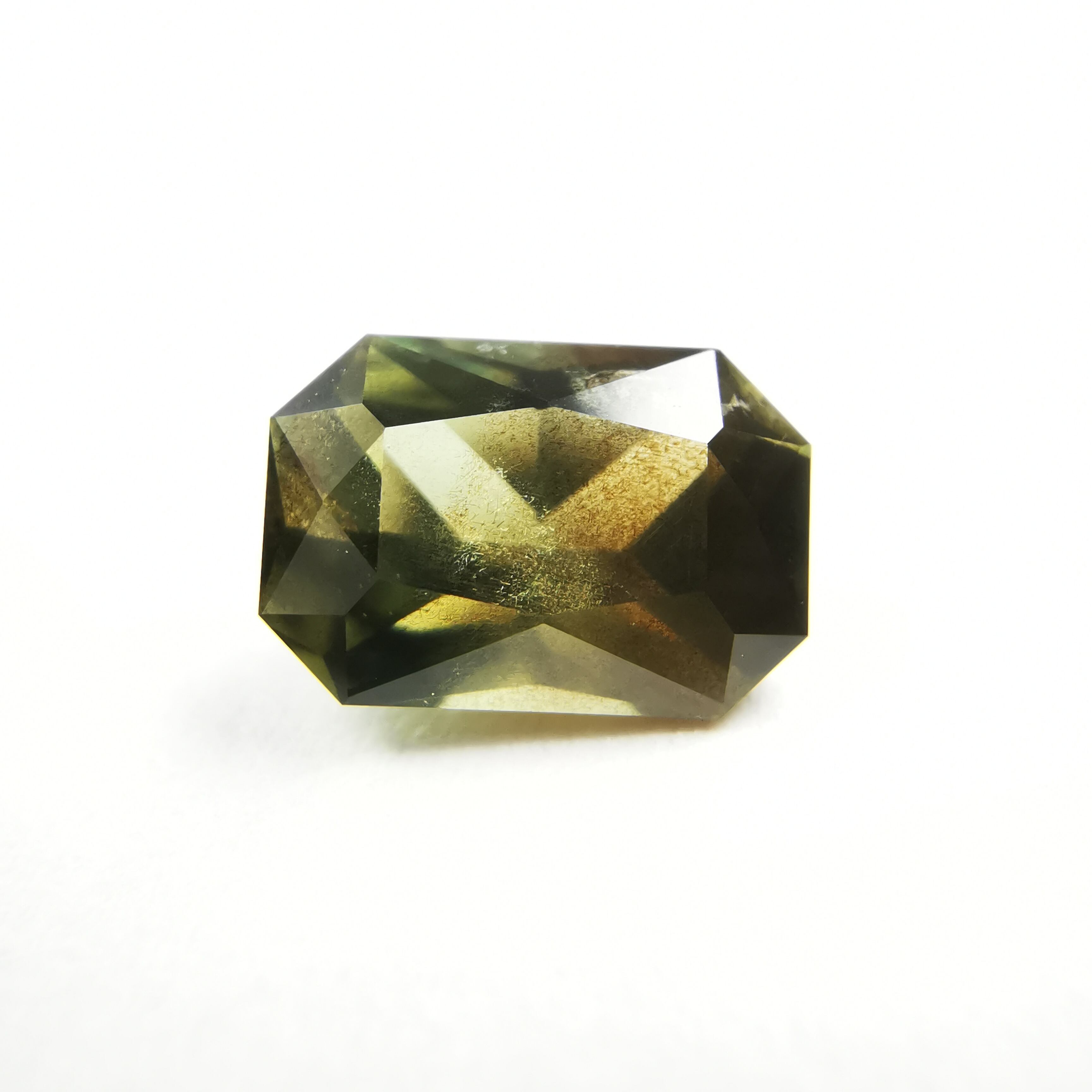 灰緑色のサファイアに、赤さび色のゴールドシラーが斜めに石を横切るように入っています。